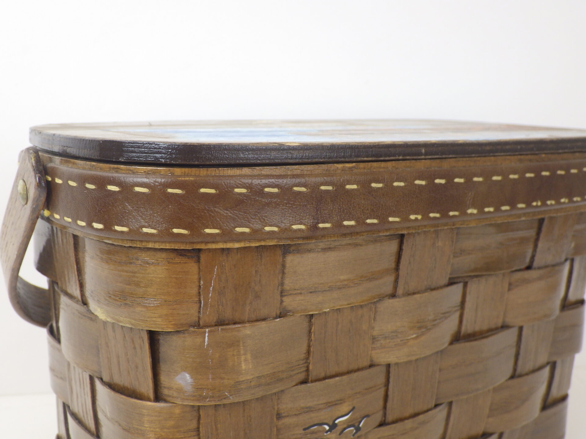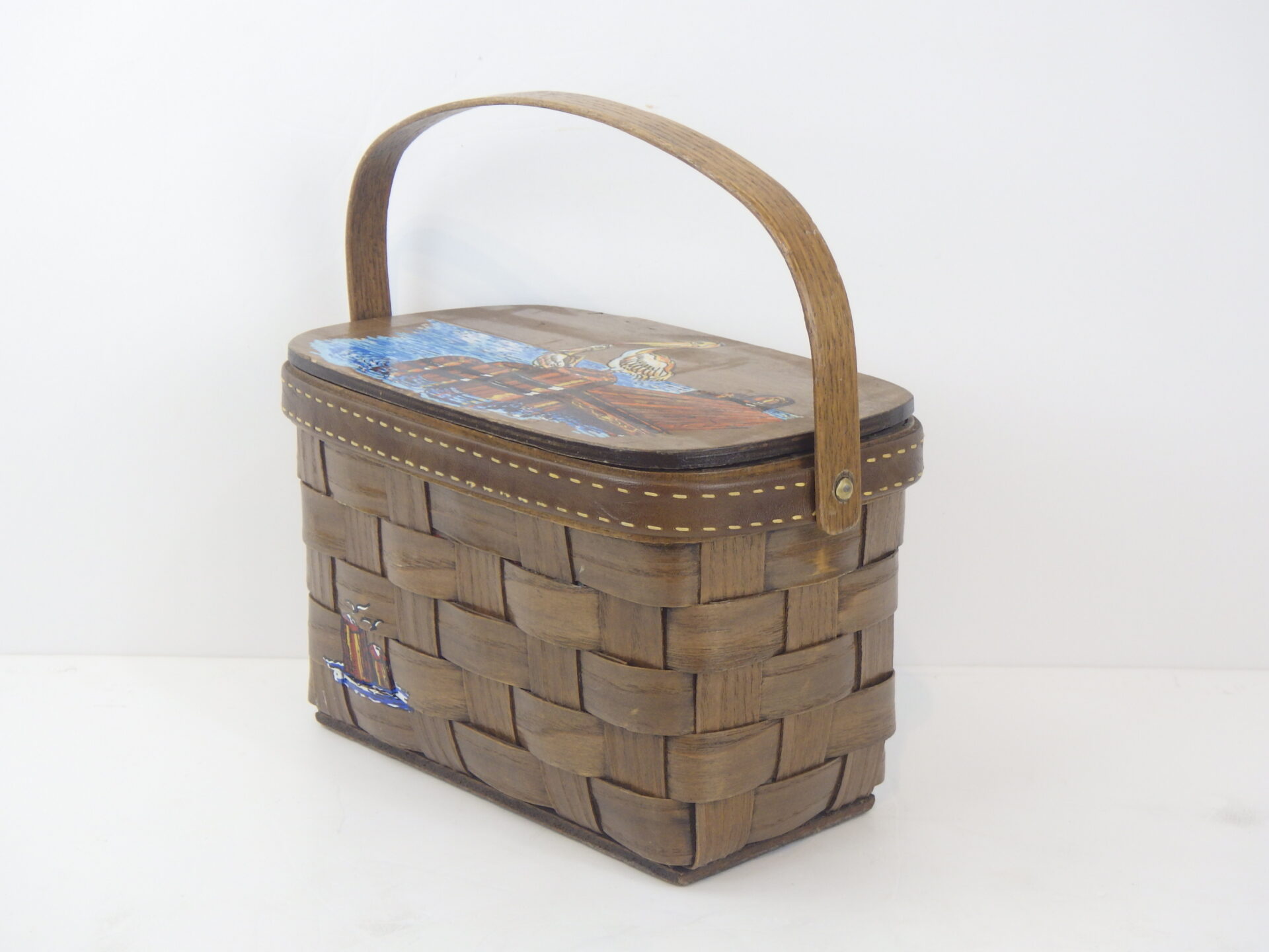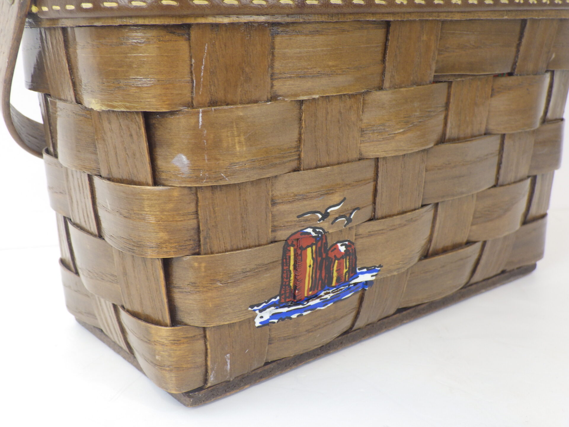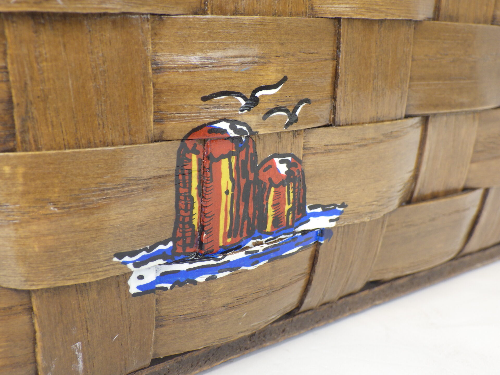 | アメリカで買い付けました。 1950年代後半から、アメリカのミシシッピでカロ・ナンというアーティストがハンドメイドで製作していたバスケットです。 カロ・ナンは、カロリン・マクダニエルズとナンシー・スティールという二人の女性の愛称です。 ハンドメイド故に大量生産は難しく、当時は主にブティックなどでの受注生産で販売されていたとか。 こちらは海の桟橋に佇む二羽の鳥のペイントです。 側面にはワンポイントで飛び立つ二羽の姿も描かれています。 お出かけの時にはもちろんのこと、コーヒーセットなどを入れてキャンプなどに持ち出してもオシャレです。 裁縫、手芸道具などをまとめて収納しておくのにも良いサイズ感ですね。 |