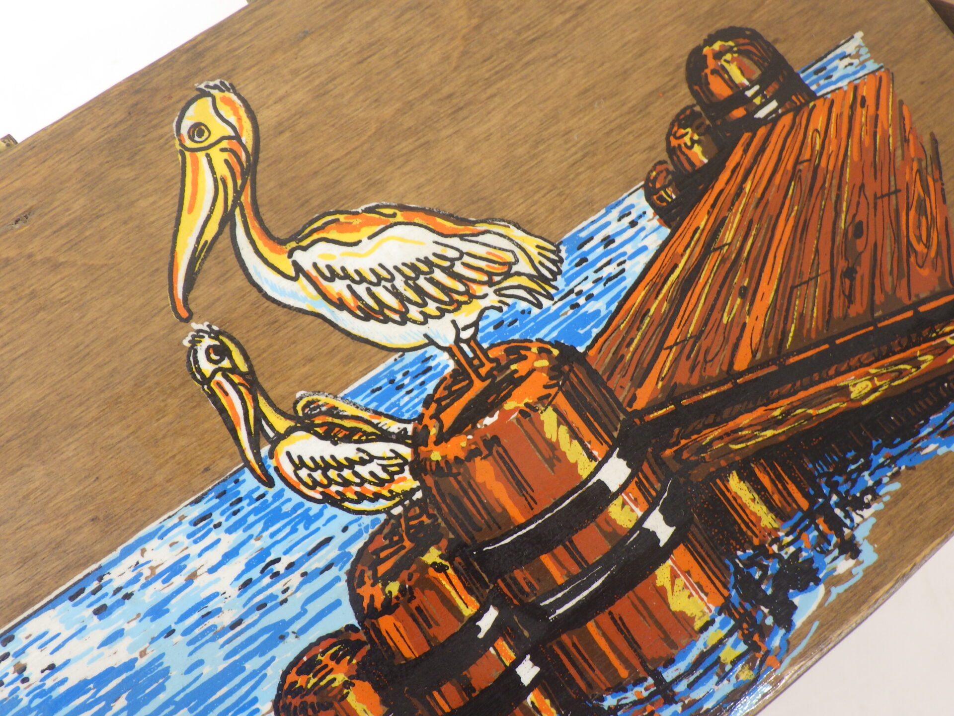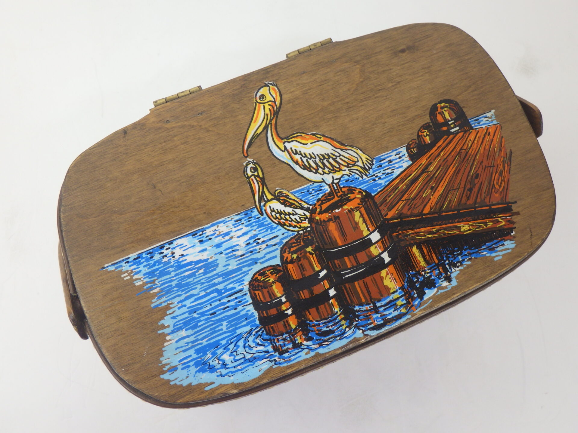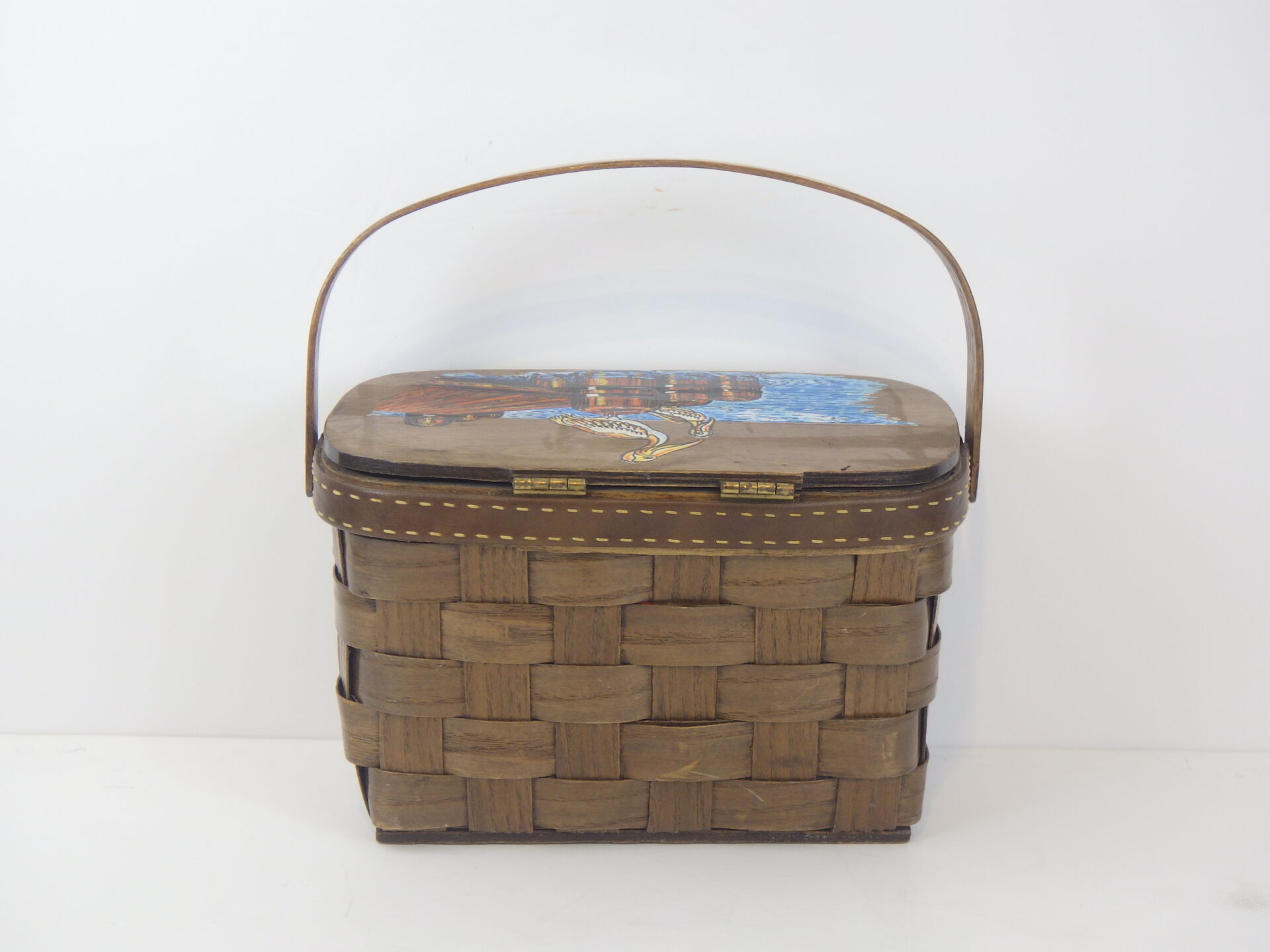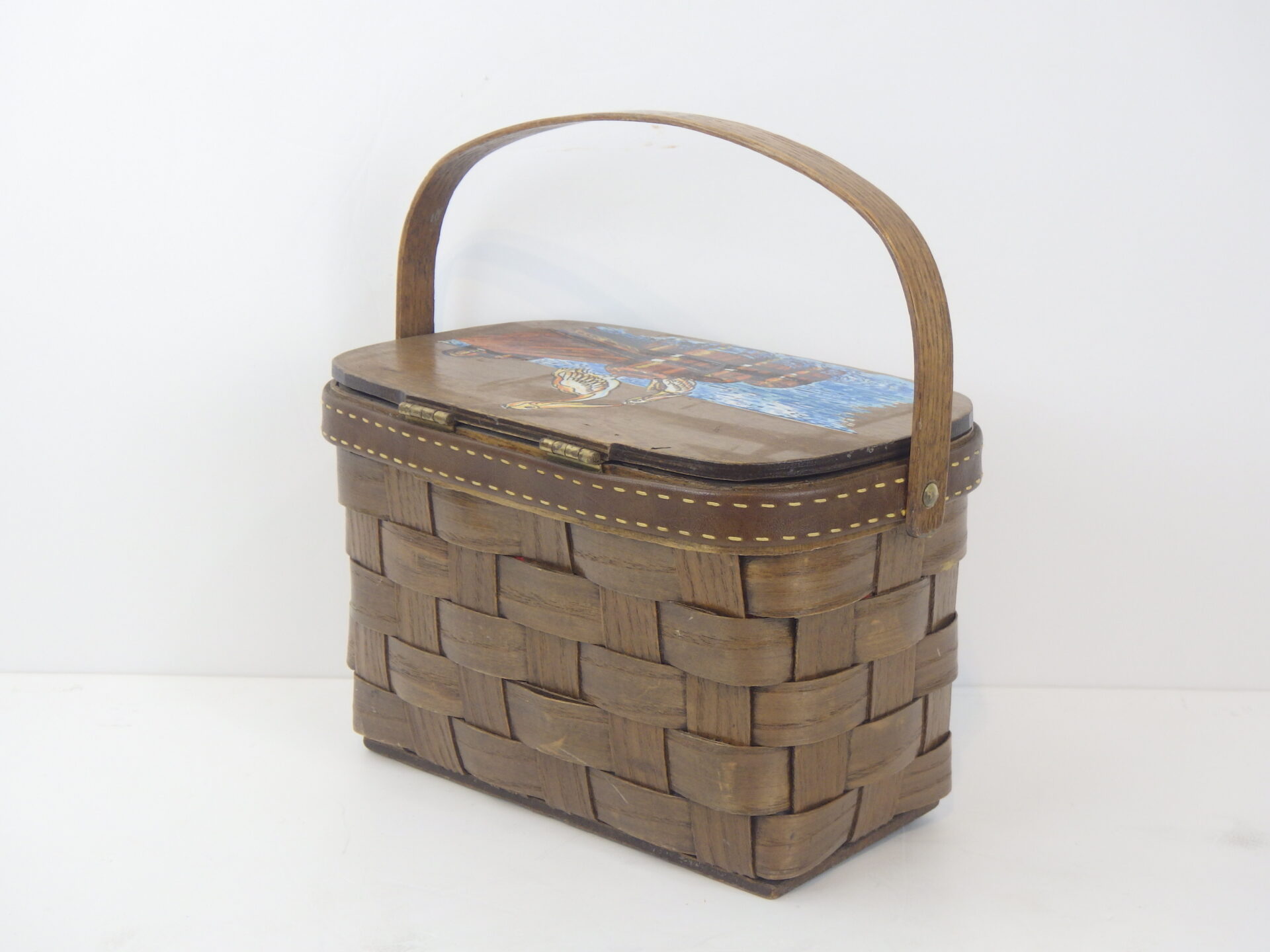 | アメリカで買い付けました。 1950年代後半から、アメリカのミシシッピでカロ・ナンというアーティストがハンドメイドで製作していたバスケットです。 カロ・ナンは、カロリン・マクダニエルズとナンシー・スティールという二人の女性の愛称です。 ハンドメイド故に大量生産は難しく、当時は主にブティックなどでの受注生産で販売されていたとか。 こちらは海の桟橋に佇む二羽の鳥のペイントです。 側面にはワンポイントで飛び立つ二羽の姿も描かれています。 お出かけの時にはもちろんのこと、コーヒーセットなどを入れてキャンプなどに持ち出してもオシャレです。 裁縫、手芸道具などをまとめて収納しておくのにも良いサイズ感ですね。 |