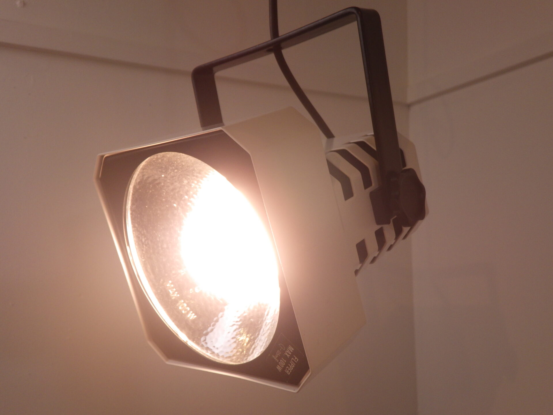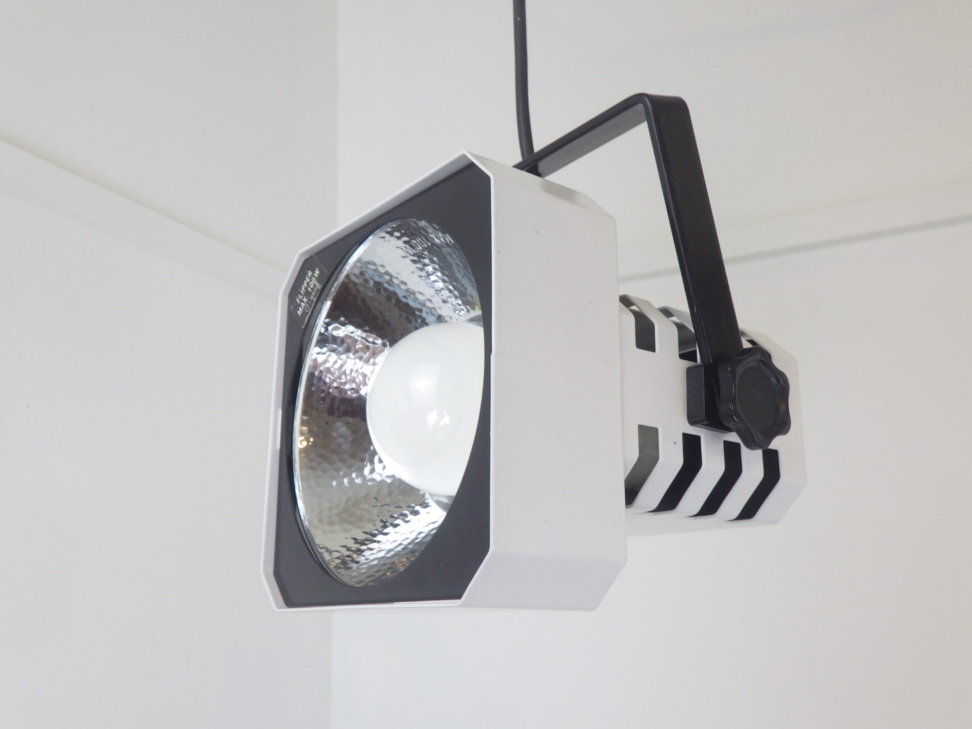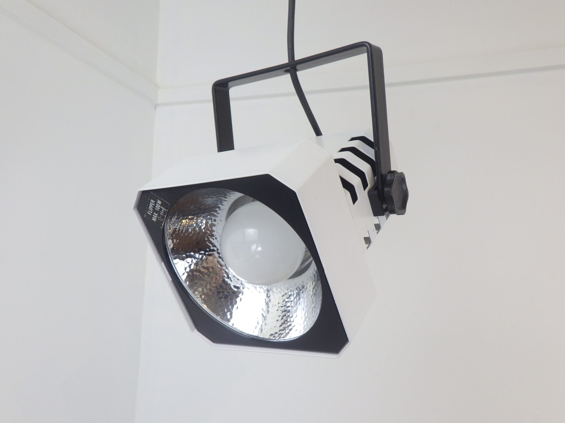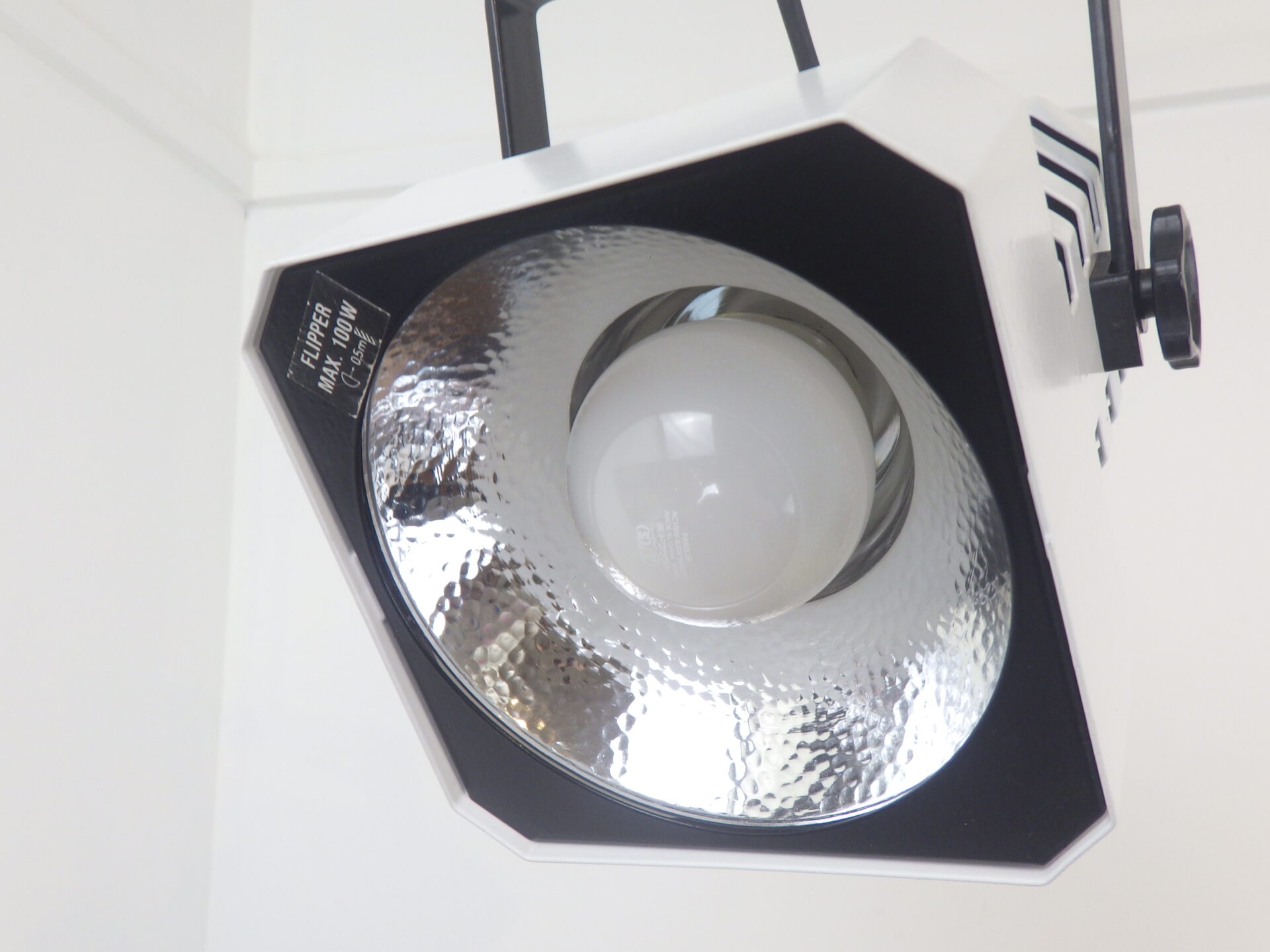 | ヨーロッパで買い付けました。 Mogens Davidsenデザイン、SC Sorensen社製のFlipperです。 同シリーズはフロアランプやウォールランプも製造されており、こちらのランプも元々は壁(天井)付け出来る設計だったようです。 左右のネジを緩めることで、角度が調節出来ます。 スタジオランプのようなデザインで、内側には反射シェードが組み込まれているため、電球の灯りが広い範囲に拡散されます。 インダストリアルのようで、ポストモダンな雰囲気も併せ持つデザインですので、空間のアクセントにおすすめしています。 |