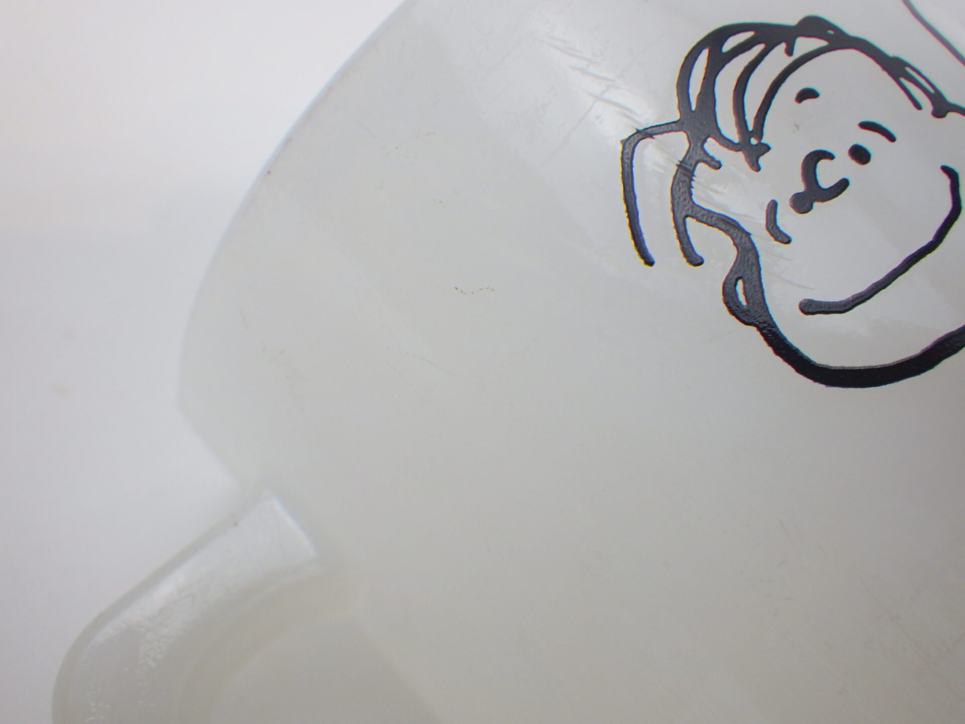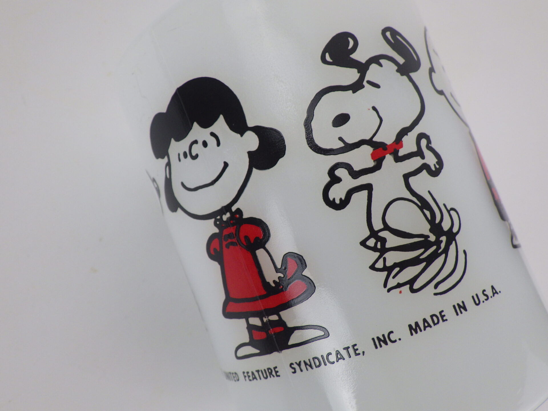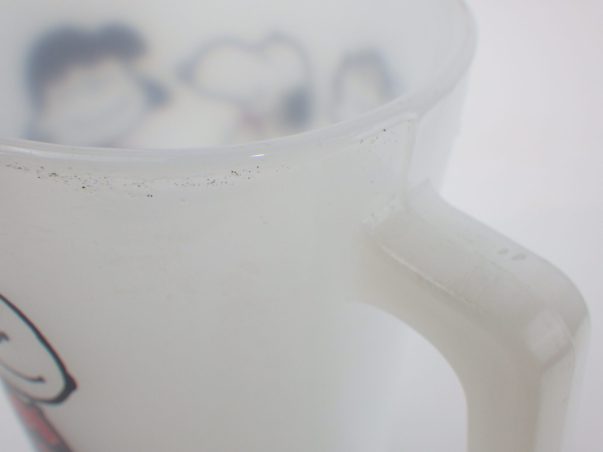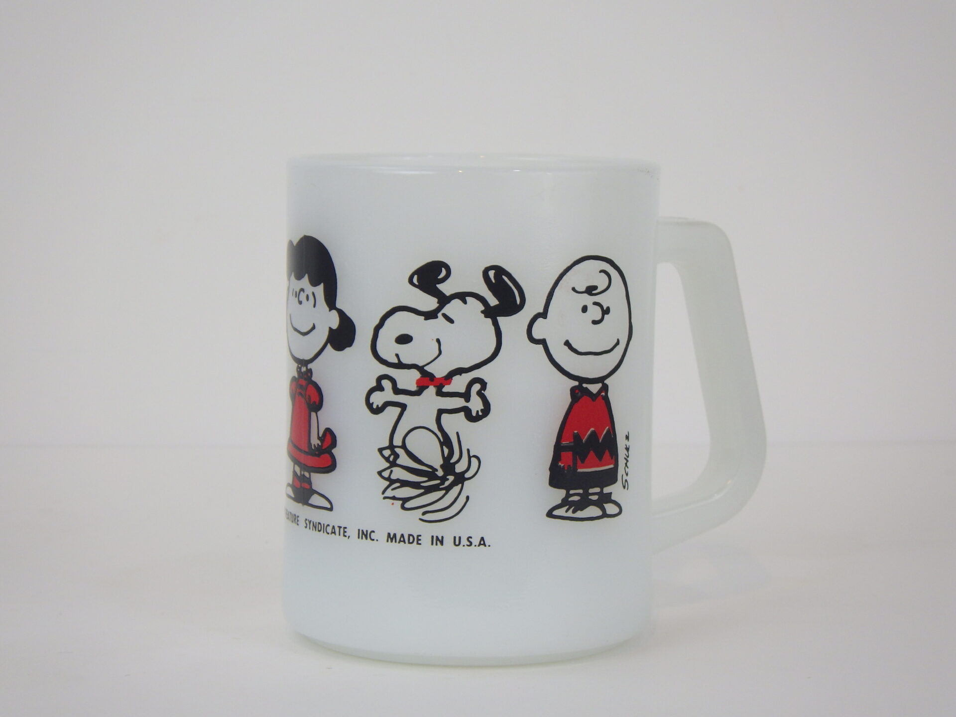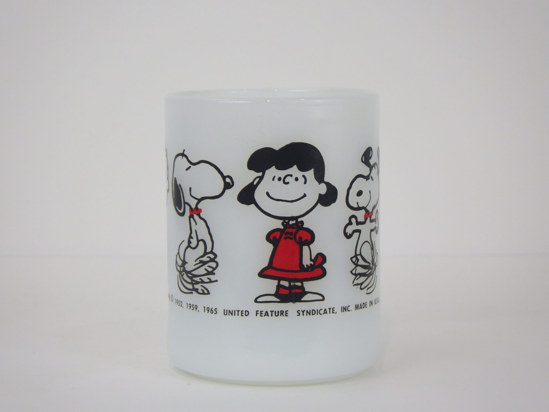 | アメリカで買い付けました。 フェデラルのスヌーピーマグです。 ピーナッツの主要キャラクターのチャーリー、ルーシー、ライナスに囲まれるスヌーピーがとても嬉しそうな表情をしていて可愛いですね。 キャラクターが勢ぞろいしているプリントのミルクガラスマグは珍しいので、キャラクター好きな方必見です。 |