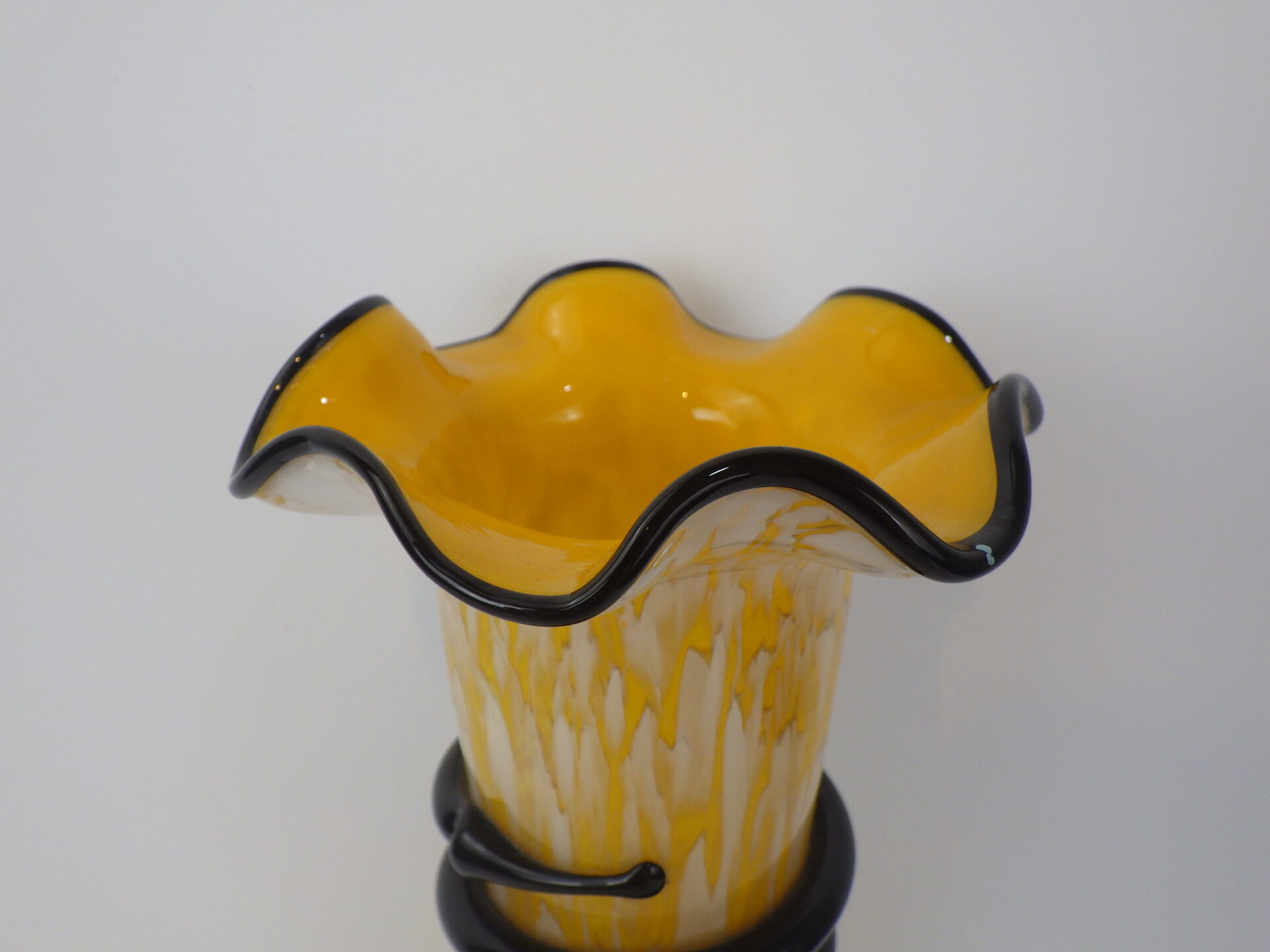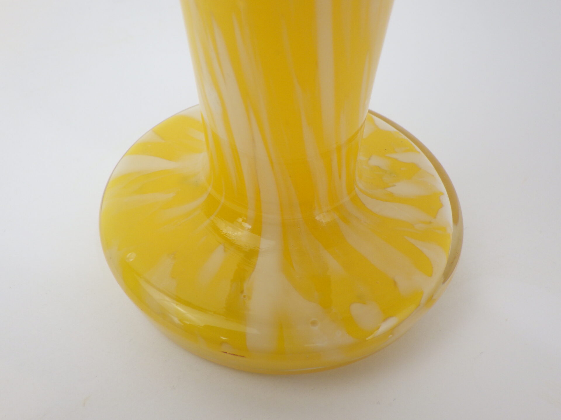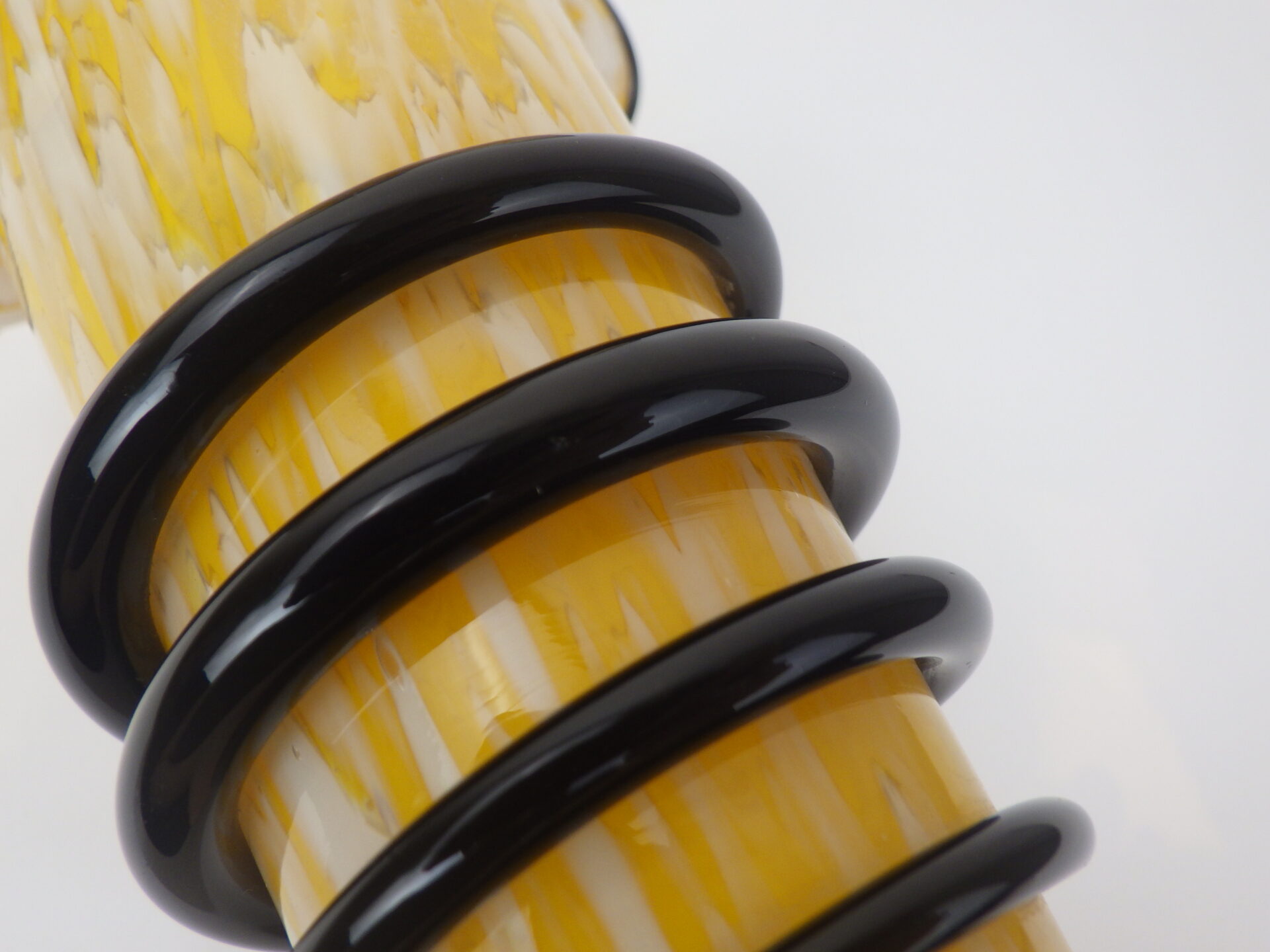 | アメリカで買い付けました。 ガラスのフラワーベースです。 イエロー地にホワイトのマーブル模様が入ったベースと、ブラックのぐるぐるのコントラストがとても良い雰囲気。 お花を飾らなくても、これだけで空間の良いアクセントになってくれそうです。 |