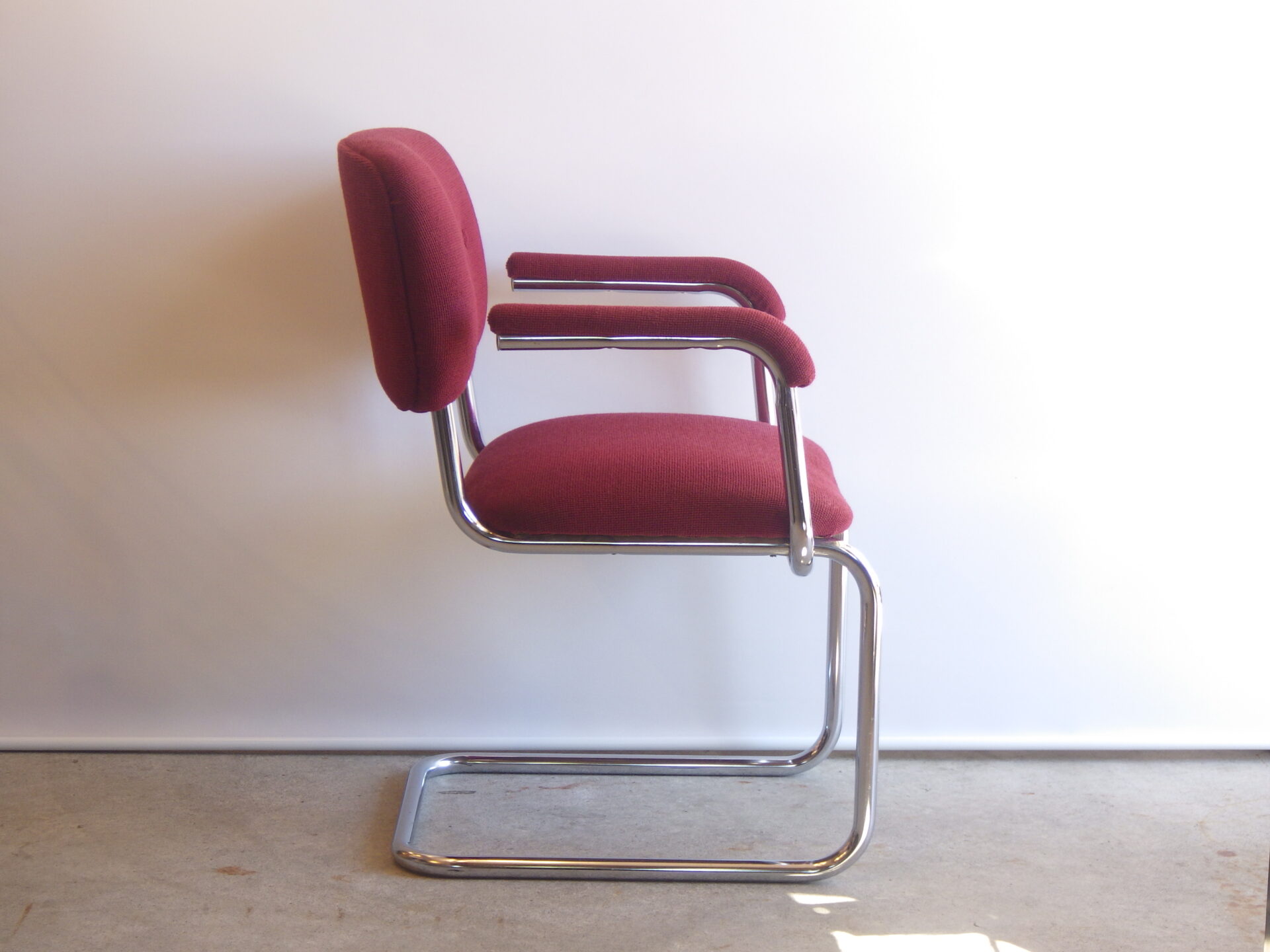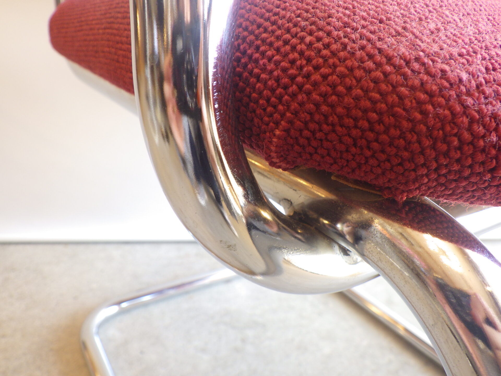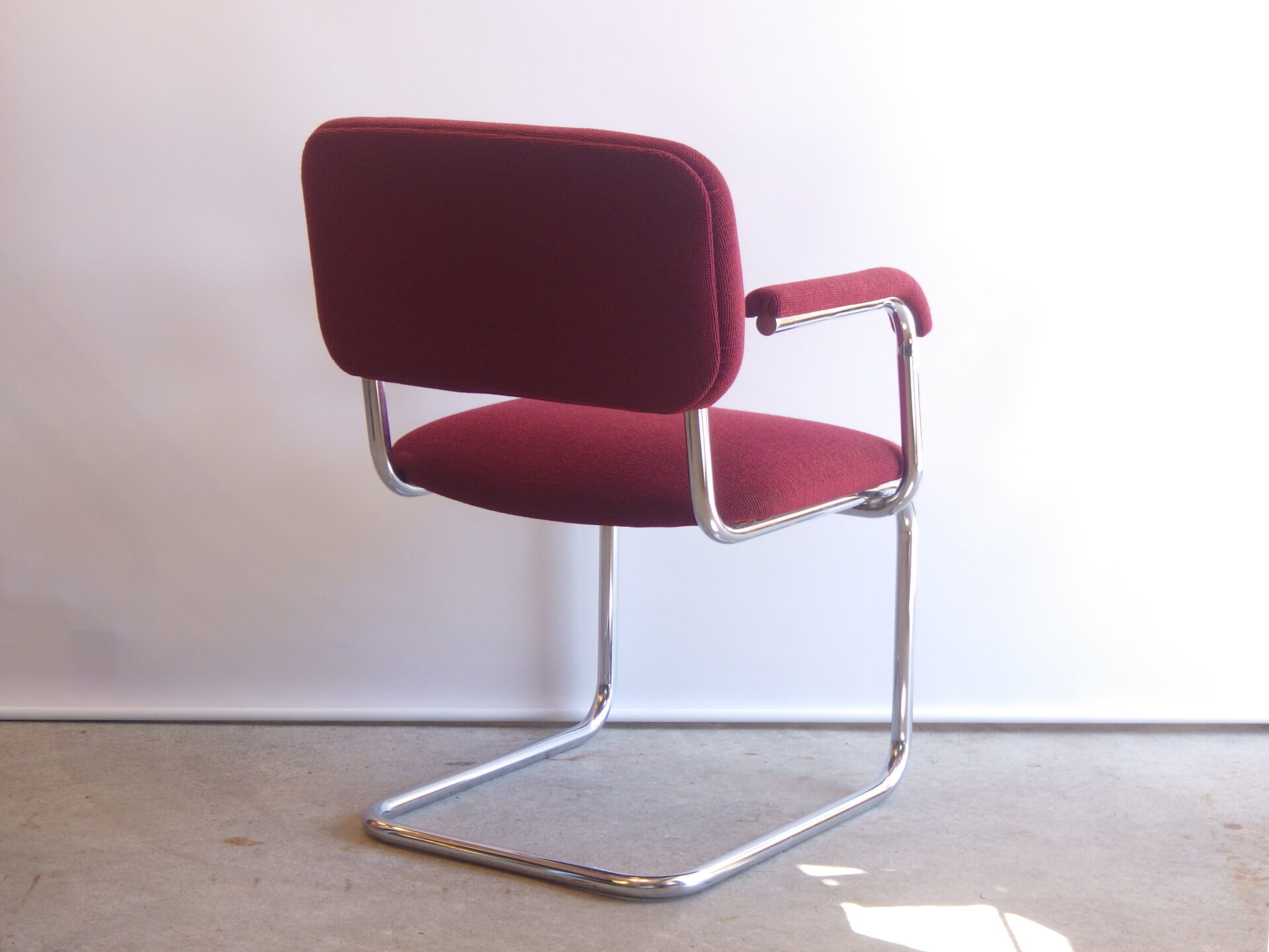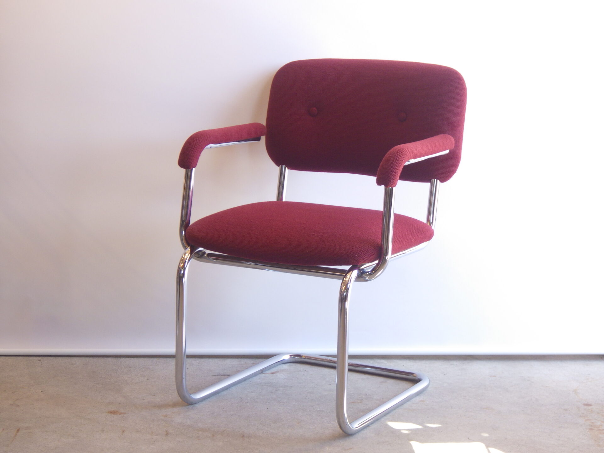 | アメリカで買い付けました。 ドイツを代表する老舗の家具ブランド「Thonet社」のカンチレバーチェアです。 四本脚の椅子と比べ、カンチレバー構造は背中側の脚がないため、座る人の体重に合わせて座面が適度にしなります。 姿勢を変えるごとに程よくしなり、身体を受け止めてくれるため、長時間座っても疲れにくいというメリットがあります。 高級感漂うワインレッドのファブリックに、背もたれのくるみぼたんがアクセントとして良い存在感を示しています。 座面と背もたれはしっかりとした厚みがあり、コロンとしたフォルムが柔らかな印象を与えてくれますね。 ご自宅、オフィス、カフェやレストランなど、様々な空間でご使用いただけますよ。 |