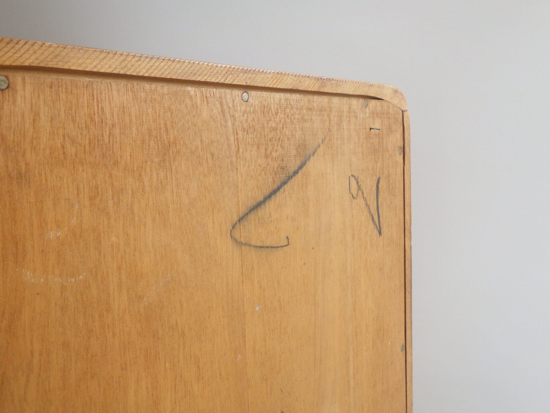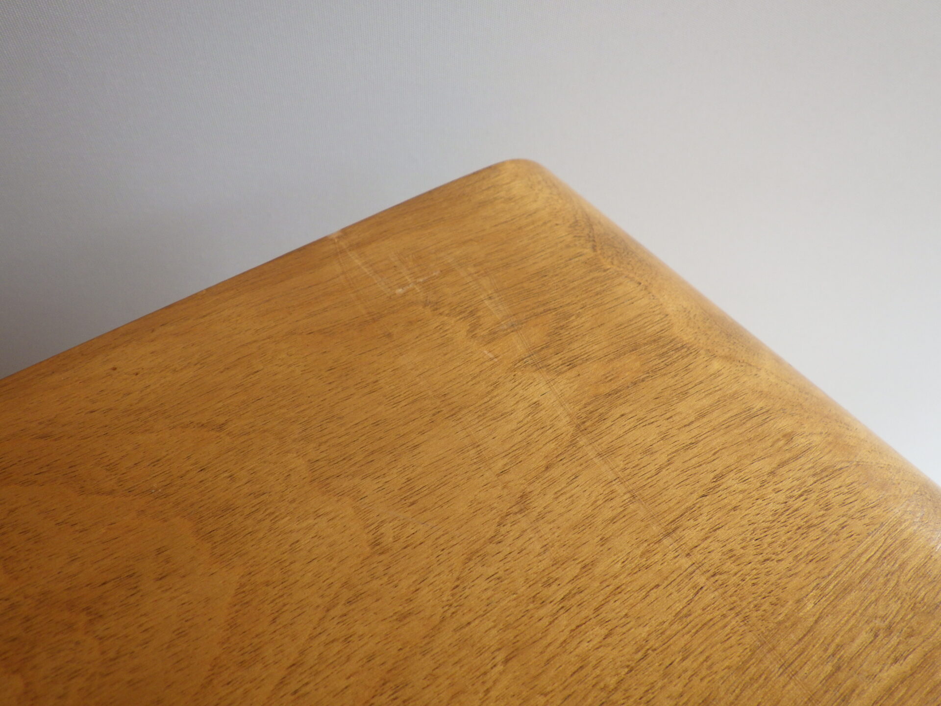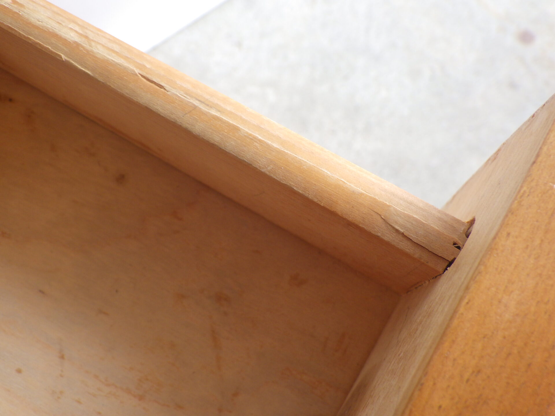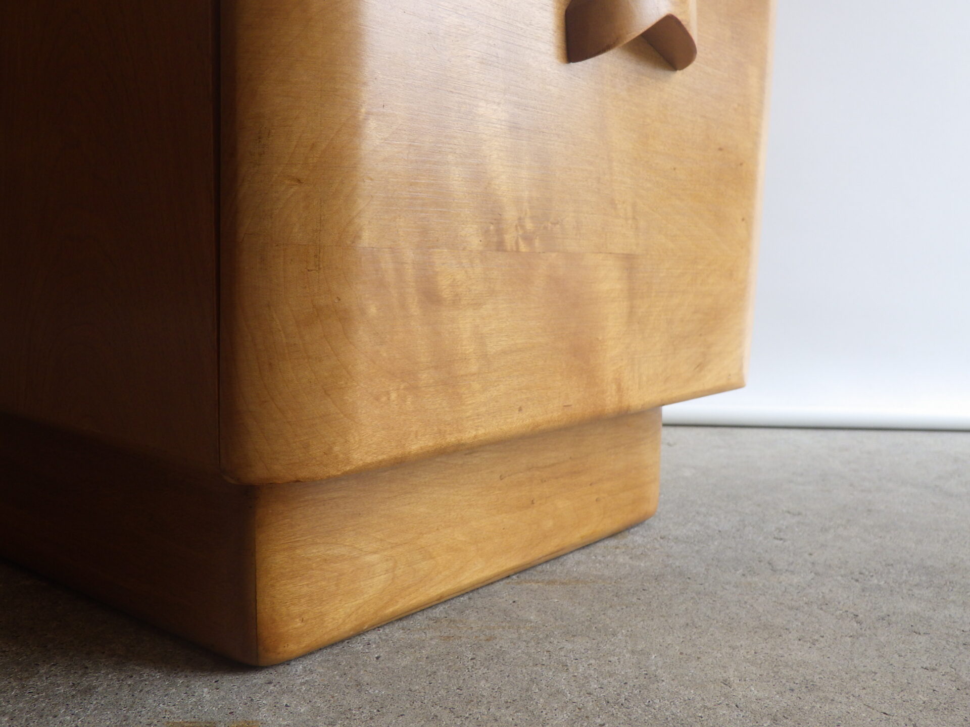 | アメリカで買い付けました。 HEYWOOD-WAKEFIELD社製、ビンテージナイトスタンドです。 デザイナーはLeo Jiranek。 ヘイウッドウェイクフィールドは、アメリカンミッドセンチュリーを代表する家具メーカーです。 その中でも高級木材のバーチ無垢材を使用した家具は、1936年から30年間しか製造されておらず、希少なアイテムとして現在でも高い人気を誇ります。 頑丈で重厚感たっぷりなバーチ材ですが、明るめのトーンなので、お部屋に置いた時に重々しくなり過ぎないのも良いところ。 こちらのナイトスタンドは、小ぶりですがオープンシェルフの上に引き出しがあり、下にはドロップフロントキャビネットがついているため収納力もあります。 寝室のベッドサイドに置くのはもちろんのこと、リビングなどのちょっとしたスペースに置いて、照明やオブジェなどを飾ってお楽しみいただくのにも良さそうです。 |
