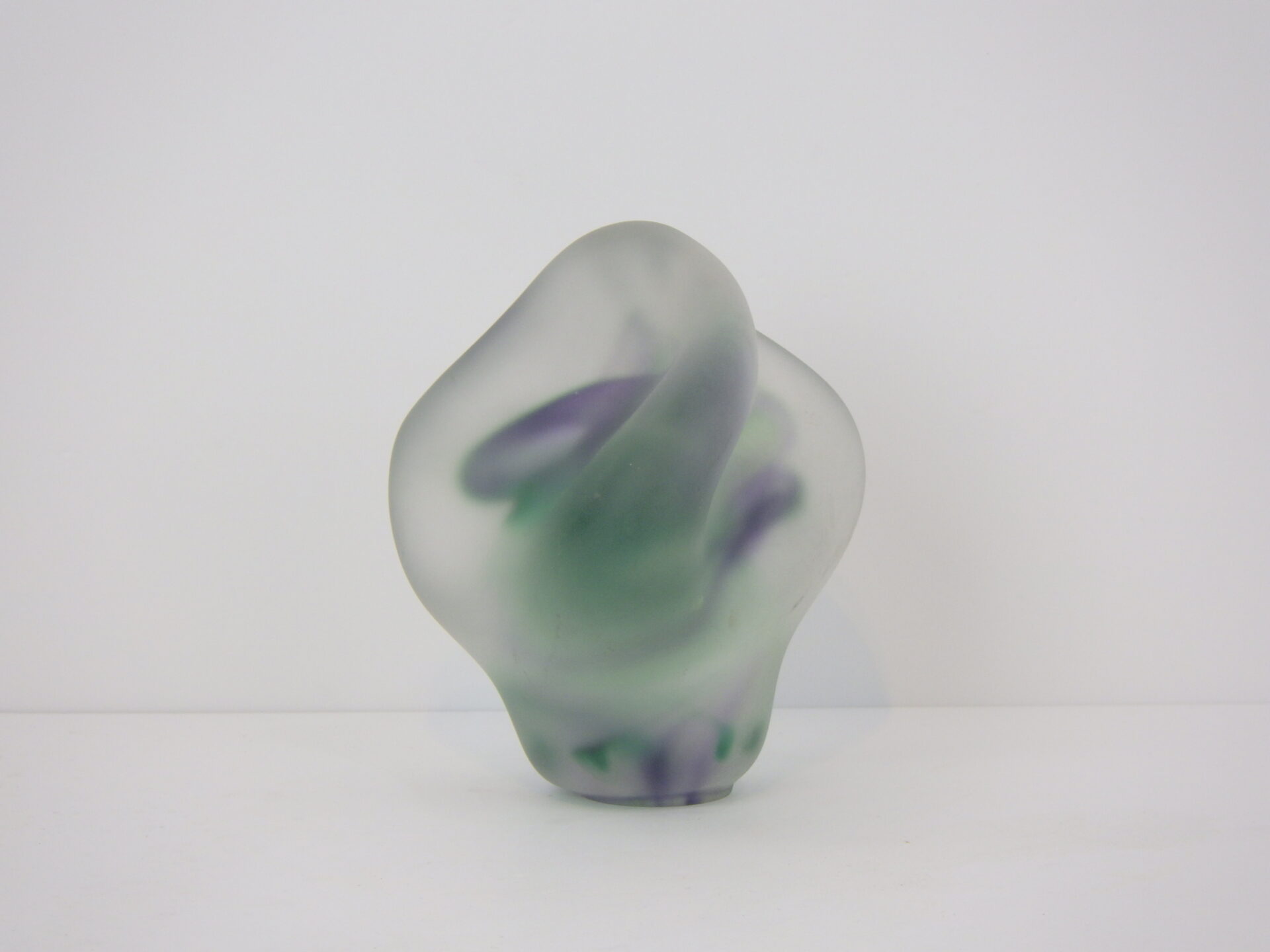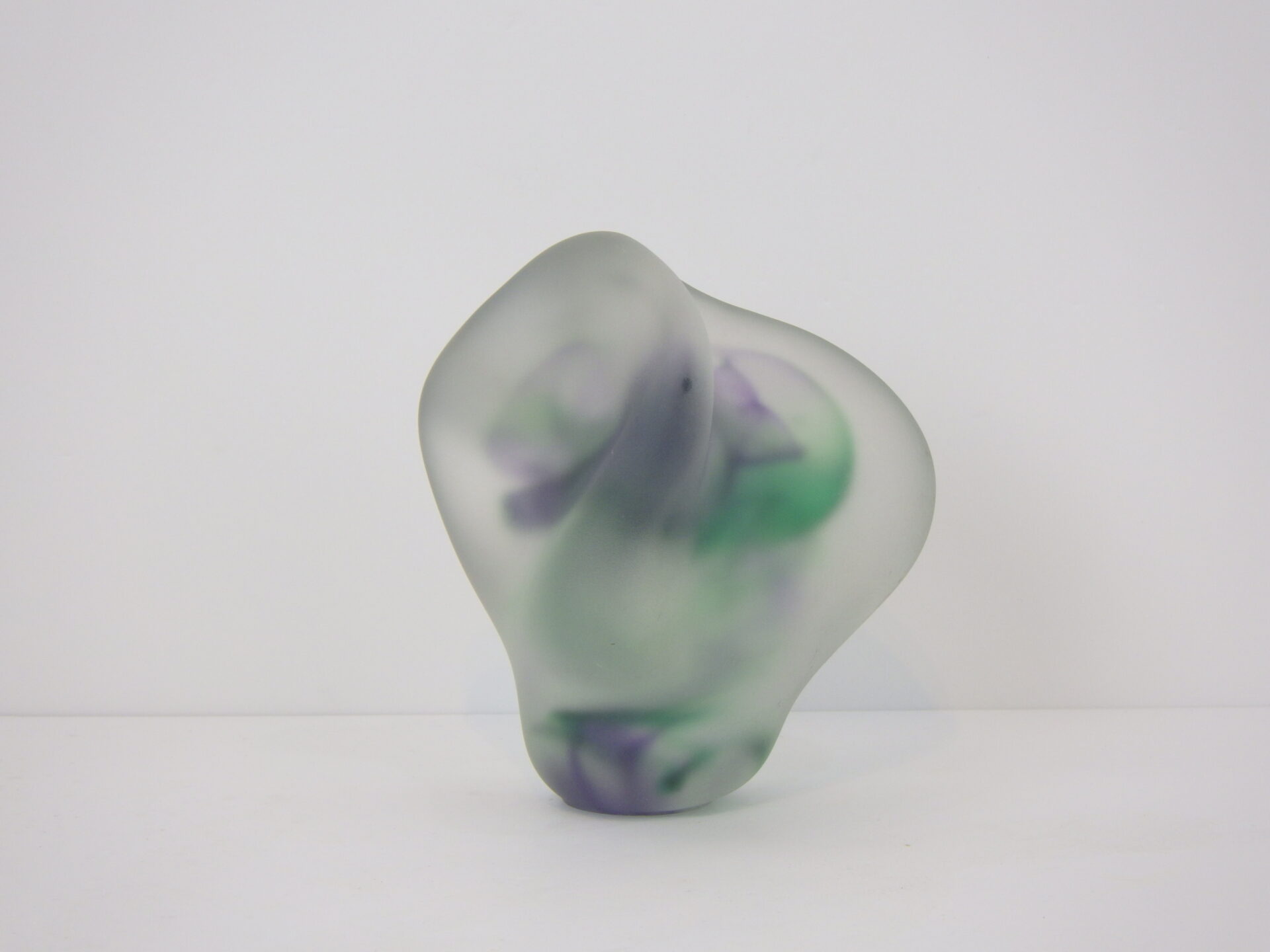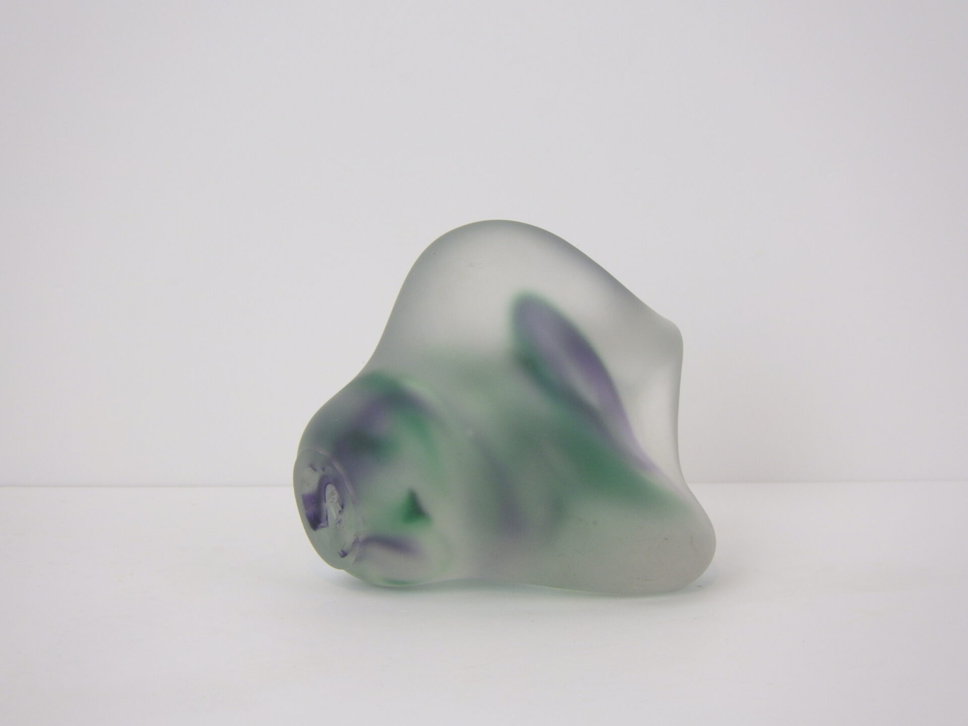 | アメリカで買い付けました。 フロストガラスのスカルプチャーです。 アーティストサインのようなものと、裏面に「R」の刻印が見られますが詳細は不明。 見る角度や光の当たり方によって、形状や色の出かたが異なって見え、不思議な気持ちにさせられるオブジェです。 ずっしりと重量があるので、ペーパーウェイトとしてご使用いただいても良さそうです。 |