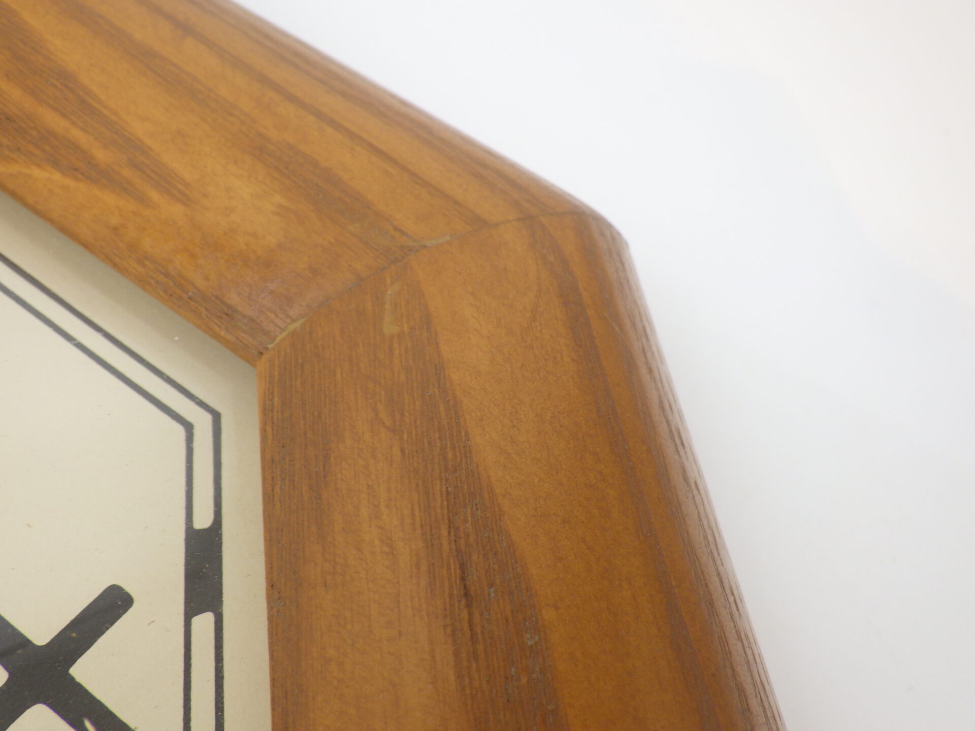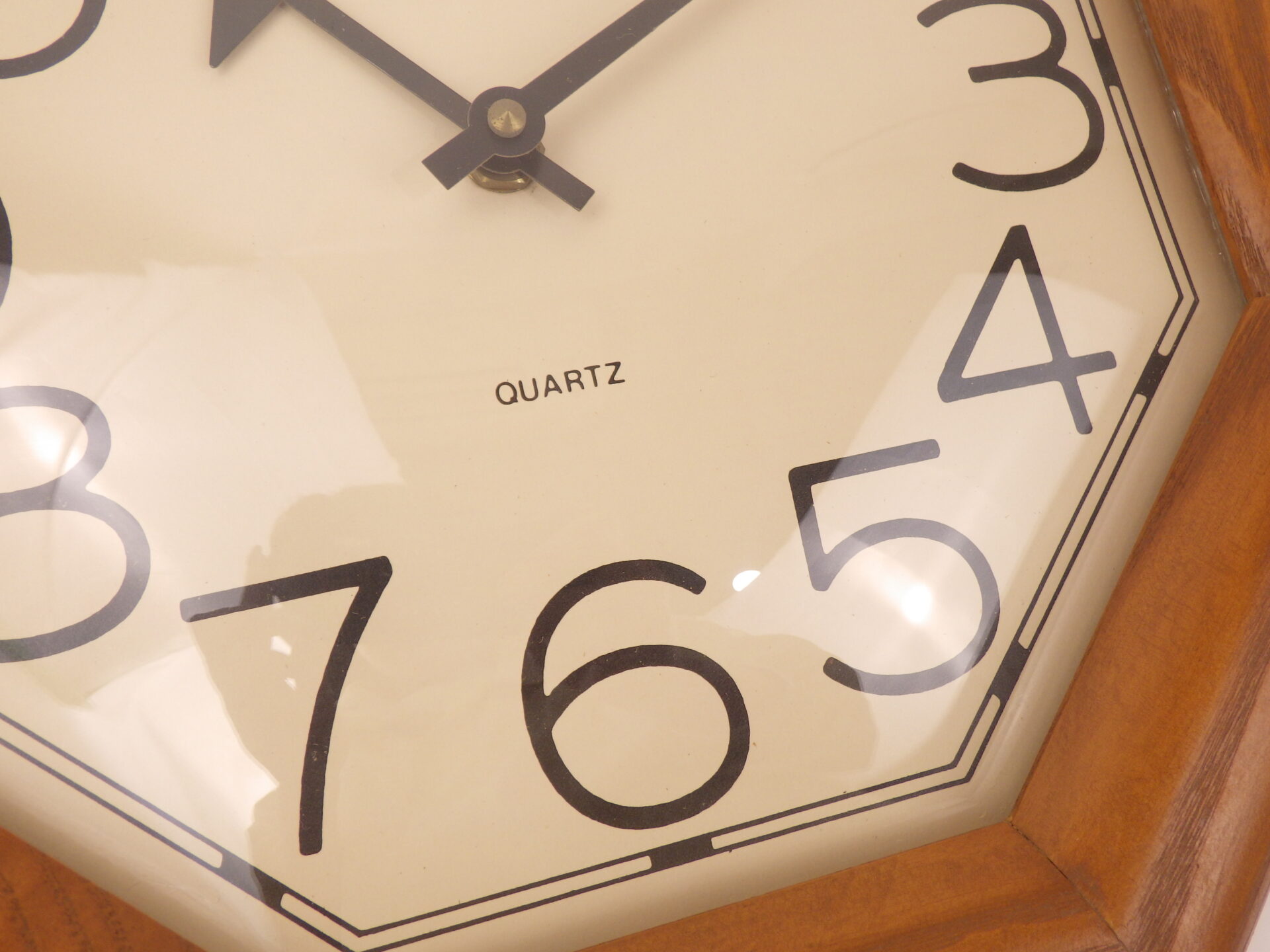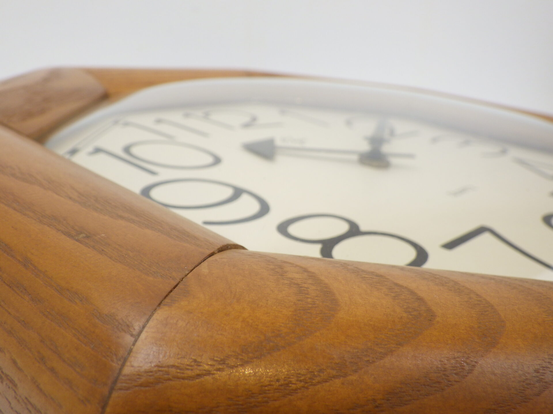 | アメリカで買い付けました。 Elgin社製、ビンテージウォールクロックです。 Elgin社は1950年代以前の最盛期には、アメリカを代表する懐中時計・腕時計メーカーの一つであり、高級腕時計のブランドに数えられる存在でした。 こちらのウォールクロックは、コロンとした大ぶりな文字と、大きな矢印を模した短針がアクセントになっています。 くっきりとした木目の六角形のウッドベースも、あたたかみがあって良い雰囲気ですね。 ボリューム感のあるサイズなので、リビングなどの広い空間でもご使用いただけます。 |