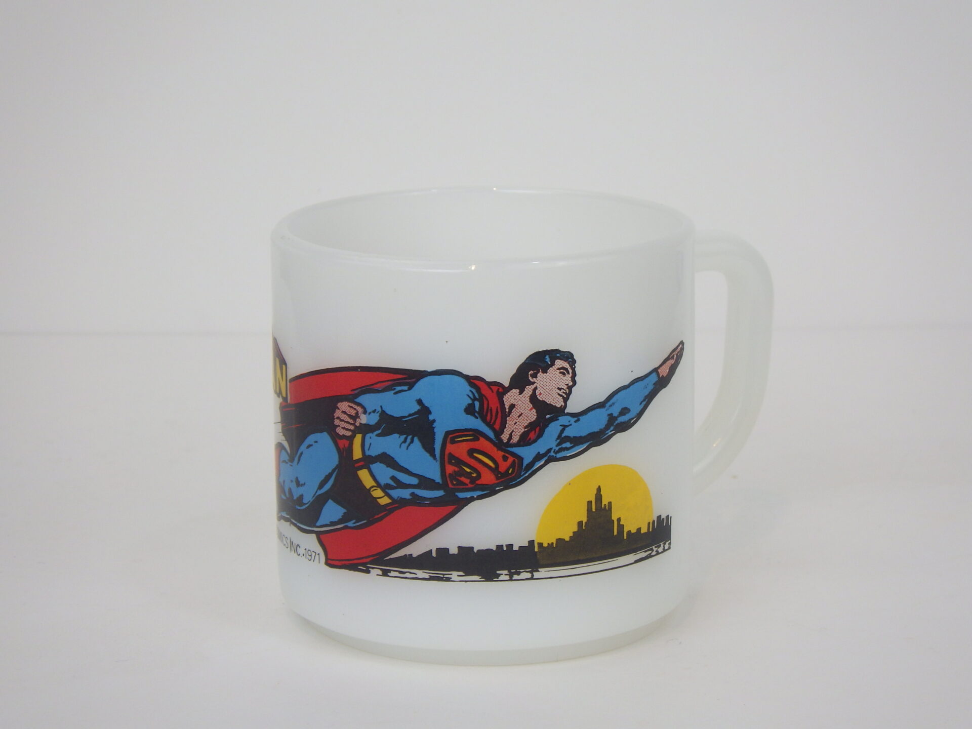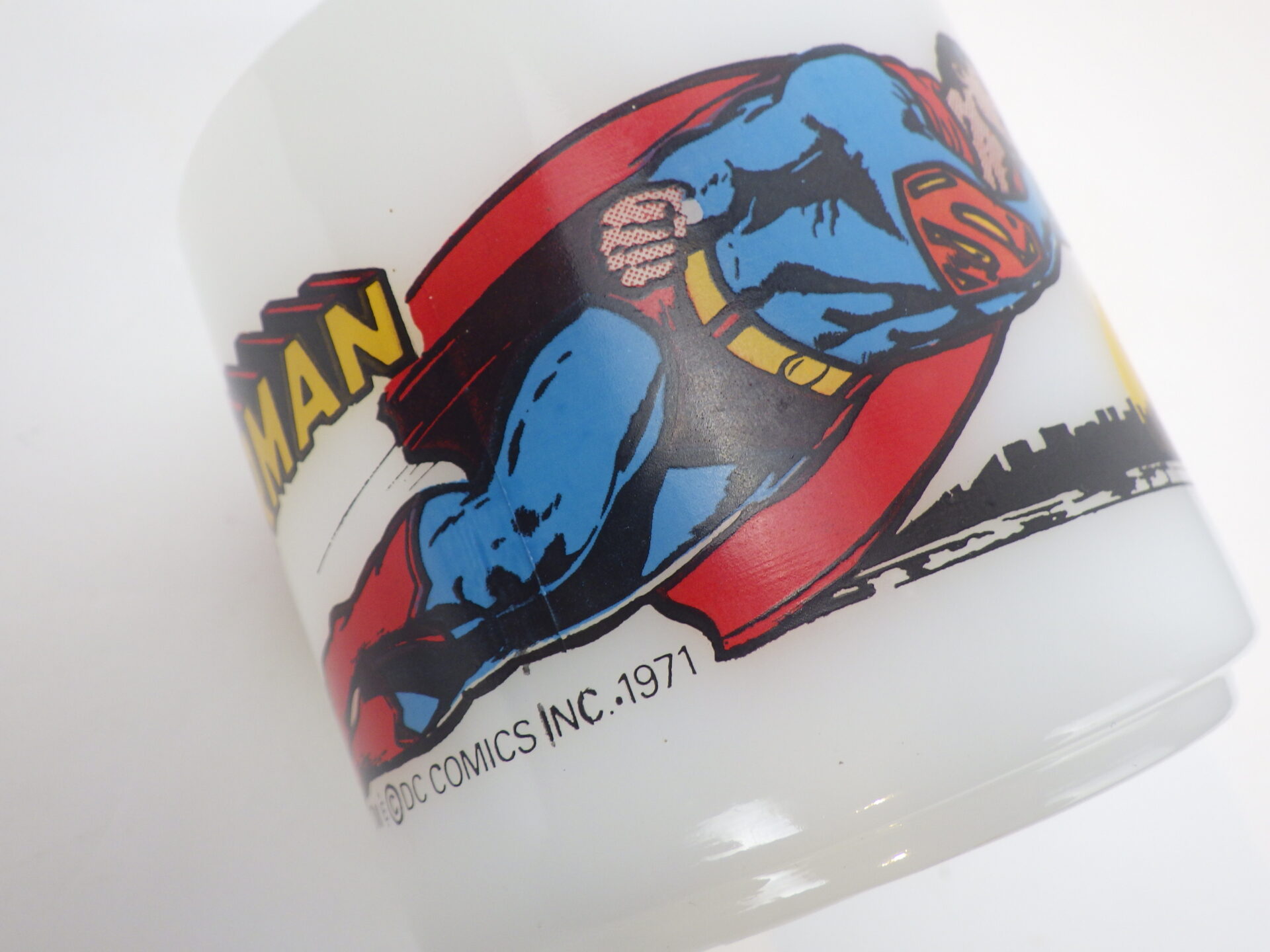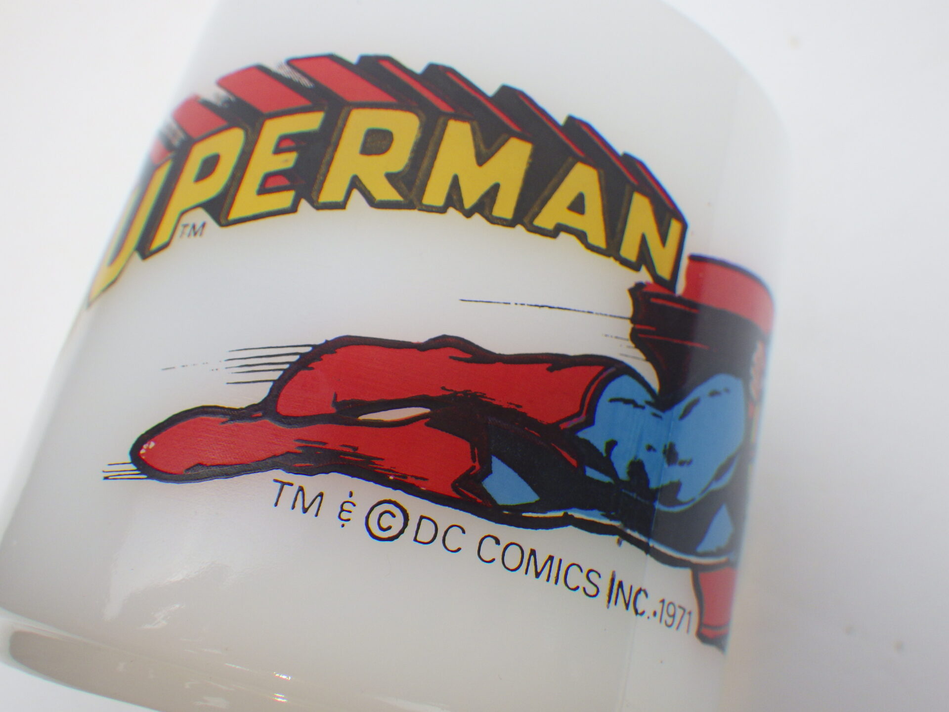 | アメリカで買い付けました。 日本でもお馴染み、アメコミのスーパーヒーロー「スーパーマン」のマグです。 1971年にプロモーションで製造されたものです。 スーパーマンが空飛ぶ姿がぐるりと一周ダイナミックにプリントされていて、迫力のある構図が目を惹きますね。 |