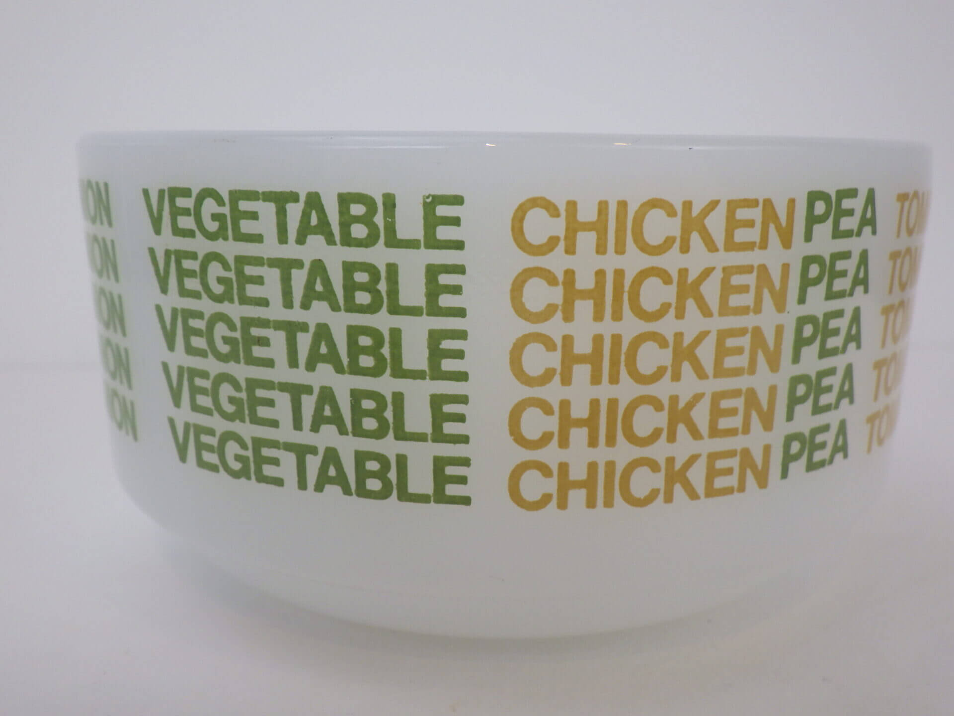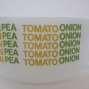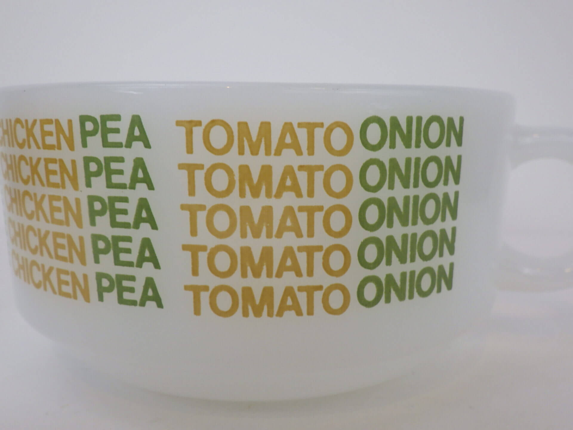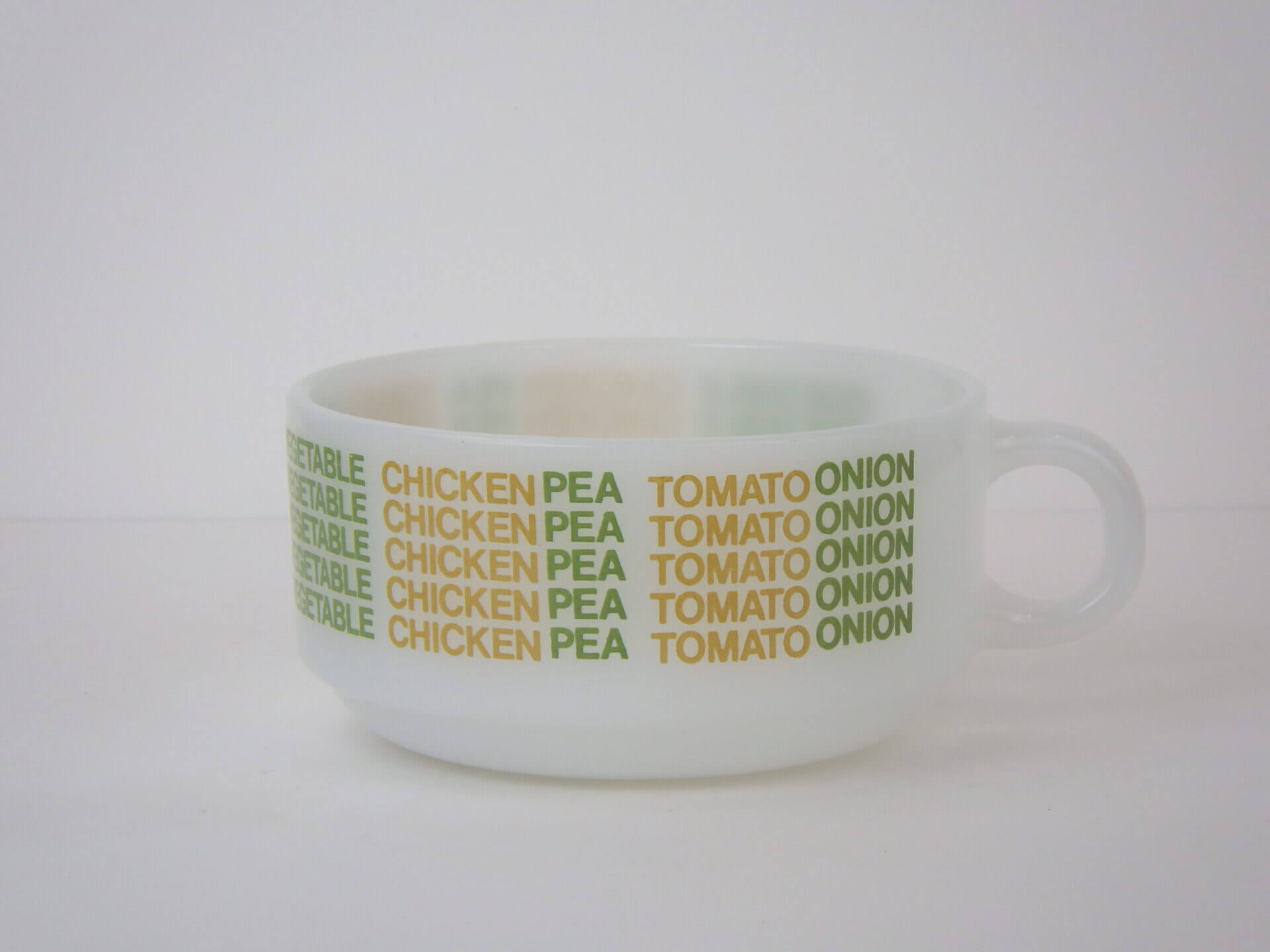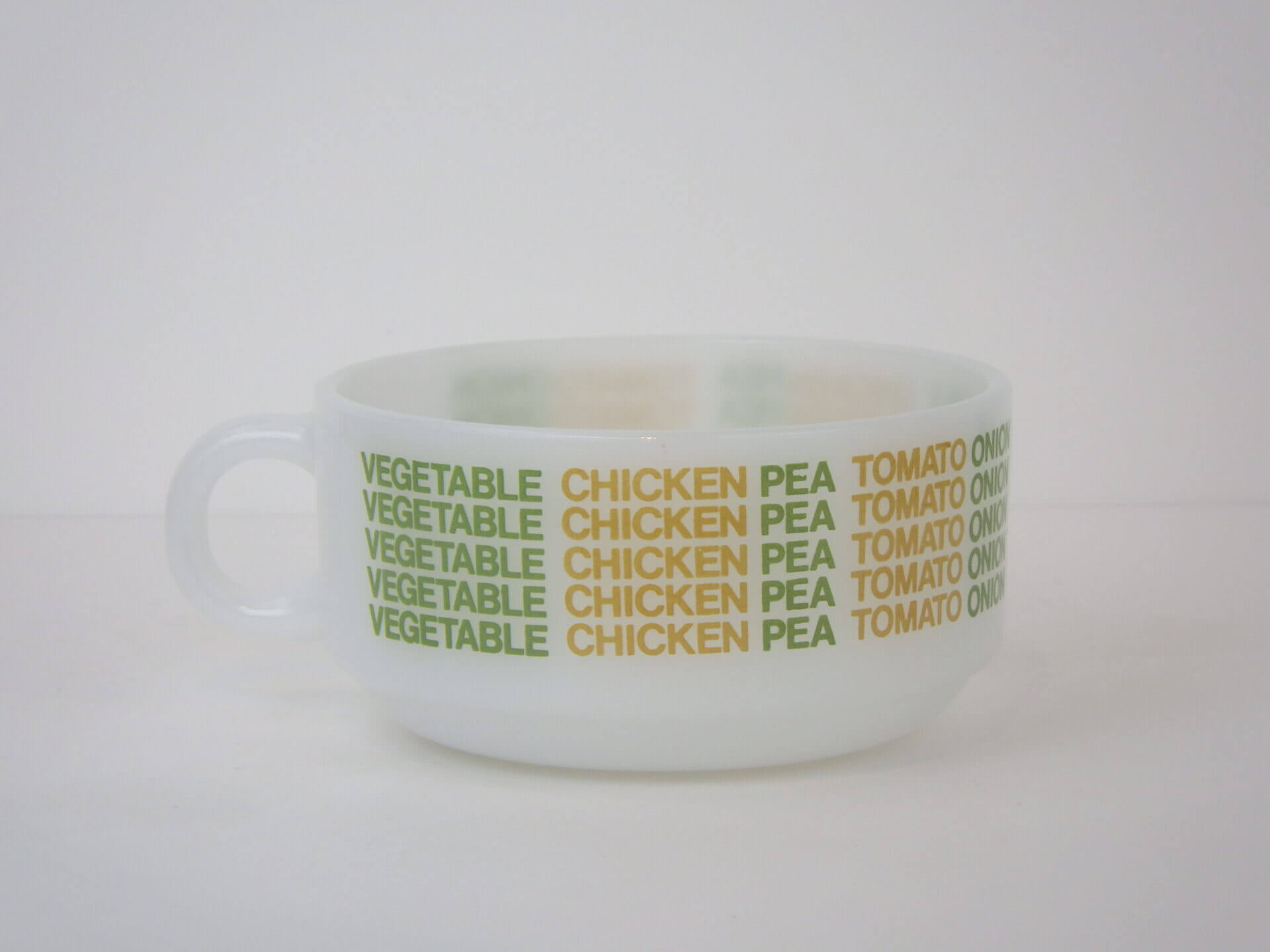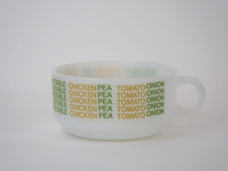 | アメリカで買い付けました。 グラスベイクのスープカップです。 「ベジタブル」「チキン」「エンドウ豆」「トマト」「オニオン」と、スープのバリエーションがプリントされた定番のスープカップ。 ハンドル付きでたっぷり容量なので、ポトフやシチューなど具材の大きな料理も盛り付けられます。 サラダや惣菜などを盛り付けても使いやすいサイズなので、おすすめしています。 |