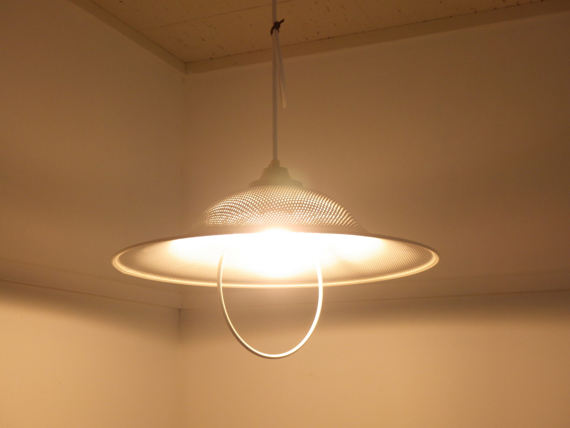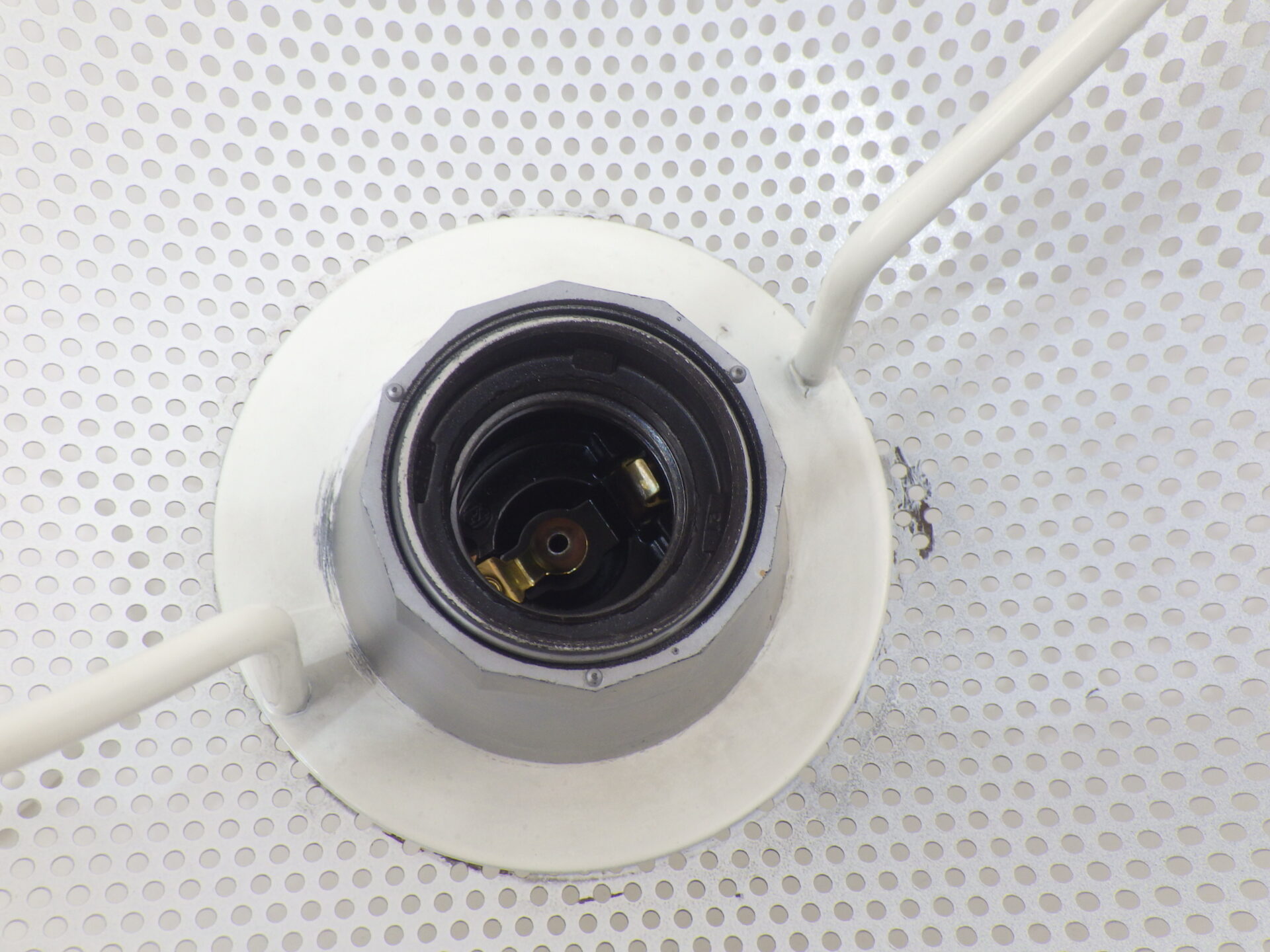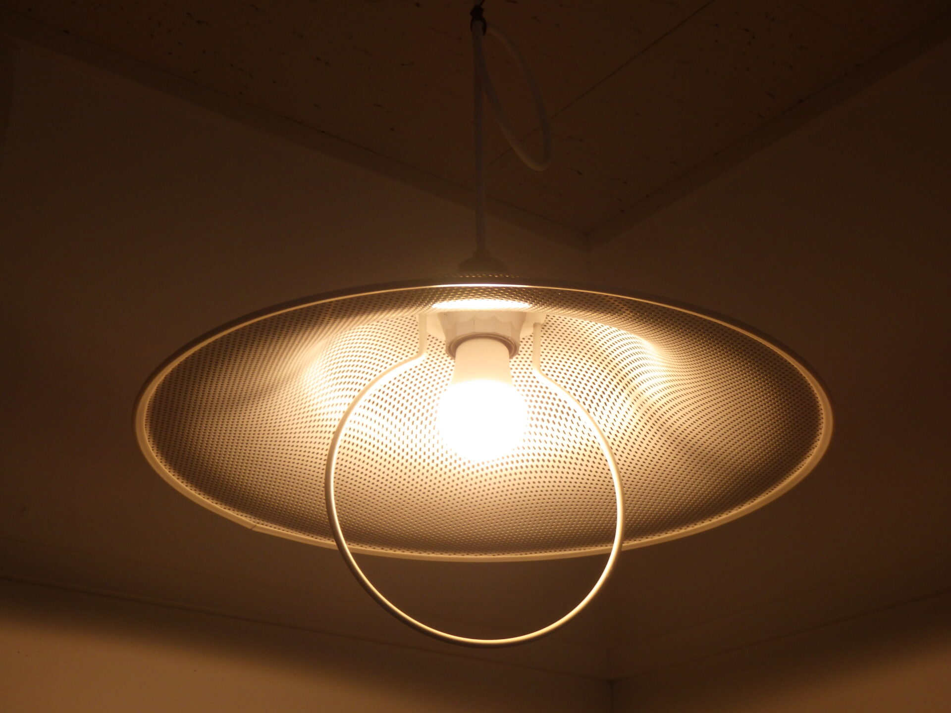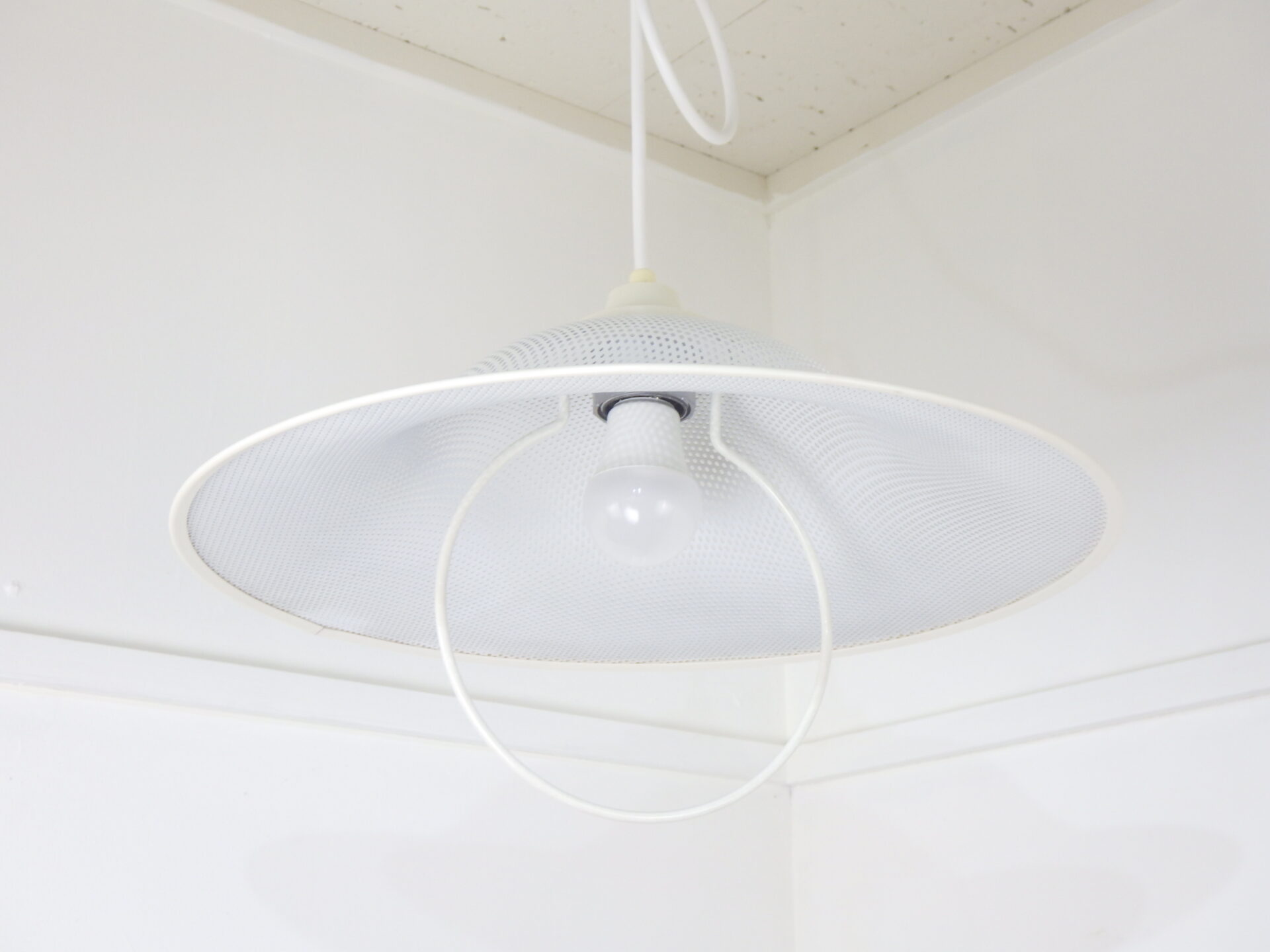 | メッシュ(パンチング)シェードと丸いハンドルが印象的な、ビンテージペンダントランプです。 元々は昇降式のため、ハンドルが付いたデザインとなっています。(コードのメンテナンスに伴い、通常のコードで作り変えています) ホワイトのシェードは灯りが綺麗に反射して広がるので、ダイニングテーブルや作業スペースなどに合わせてご使用いただくのに良さそう。 また、パンチングの穴から天井方向へも光が広がるため、この手のランプの中では明るさがしっかり保てるタイプです。 面白味のあるデザインのランプをお探しの方にもおすすめです。 |
