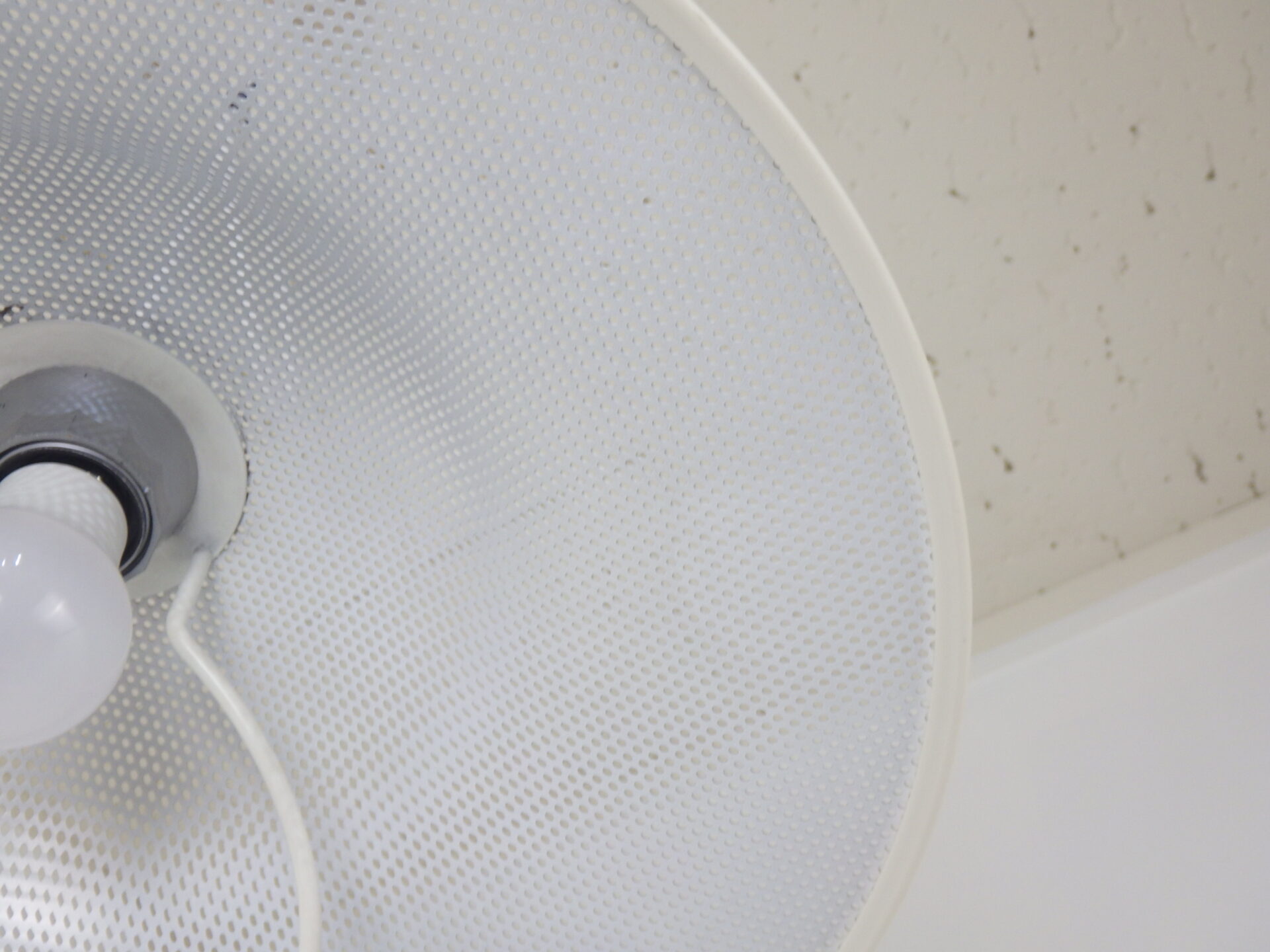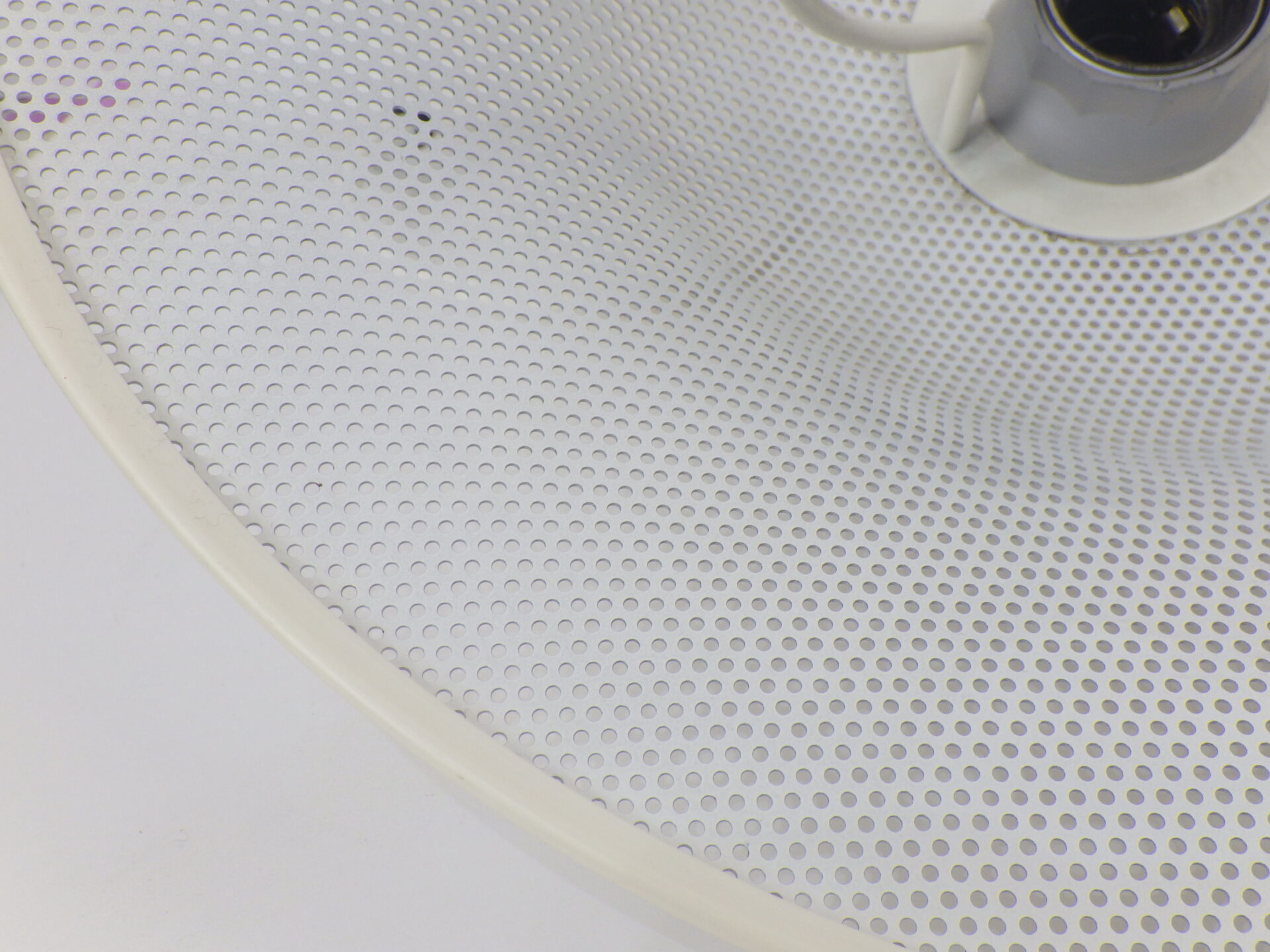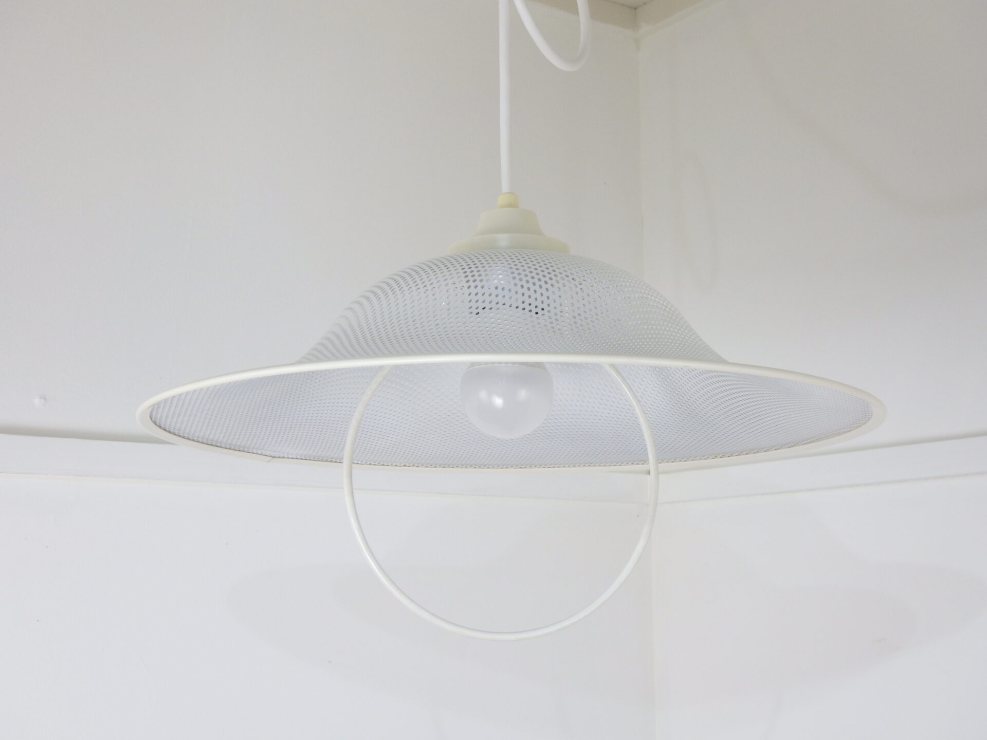 | メッシュ(パンチング)シェードと丸いハンドルが印象的な、ビンテージペンダントランプです。 元々は昇降式のため、ハンドルが付いたデザインとなっています。(コードのメンテナンスに伴い、通常のコードで作り変えています) ホワイトのシェードは灯りが綺麗に反射して広がるので、ダイニングテーブルや作業スペースなどに合わせてご使用いただくのに良さそう。 また、パンチングの穴から天井方向へも光が広がるため、この手のランプの中では明るさがしっかり保てるタイプです。 面白味のあるデザインのランプをお探しの方にもおすすめです。 |