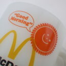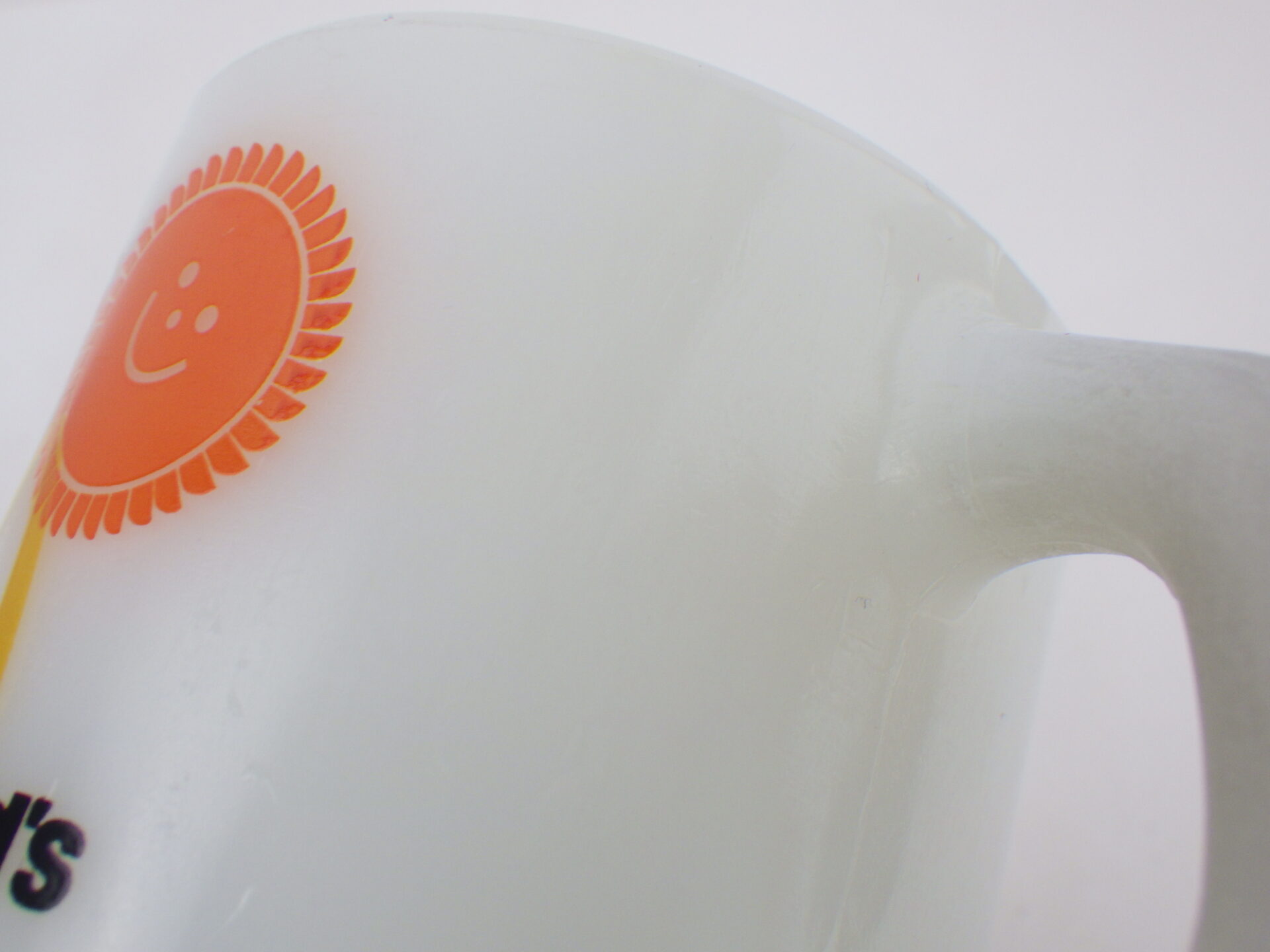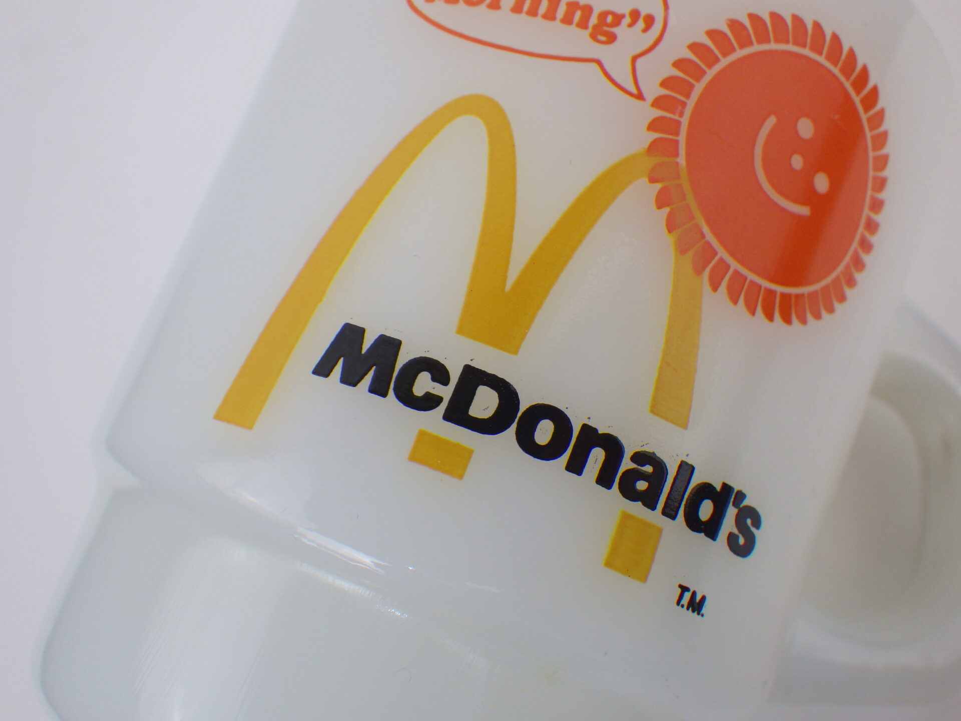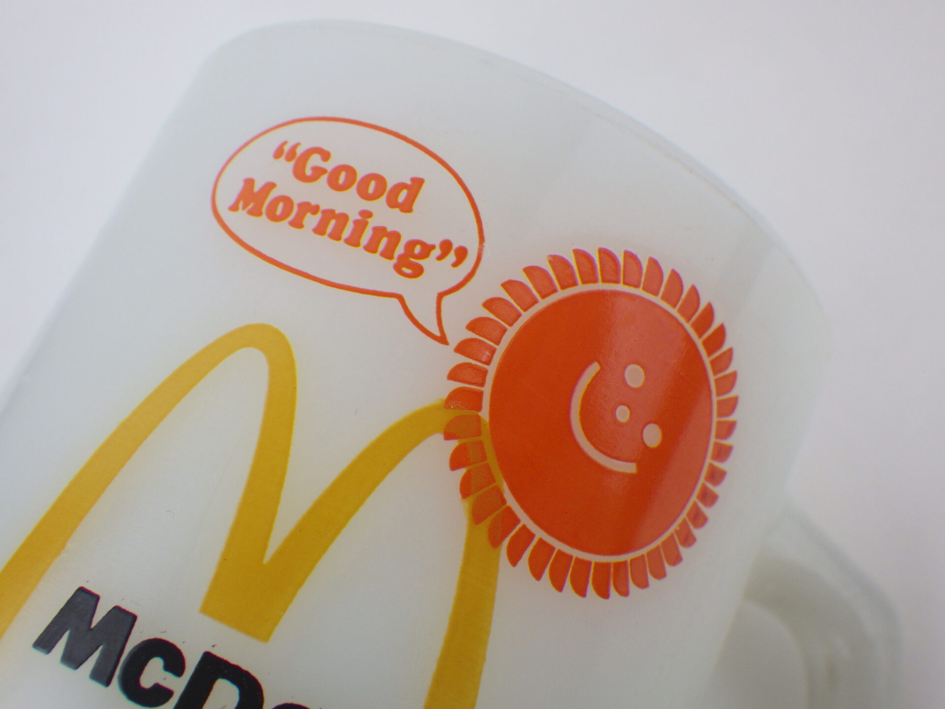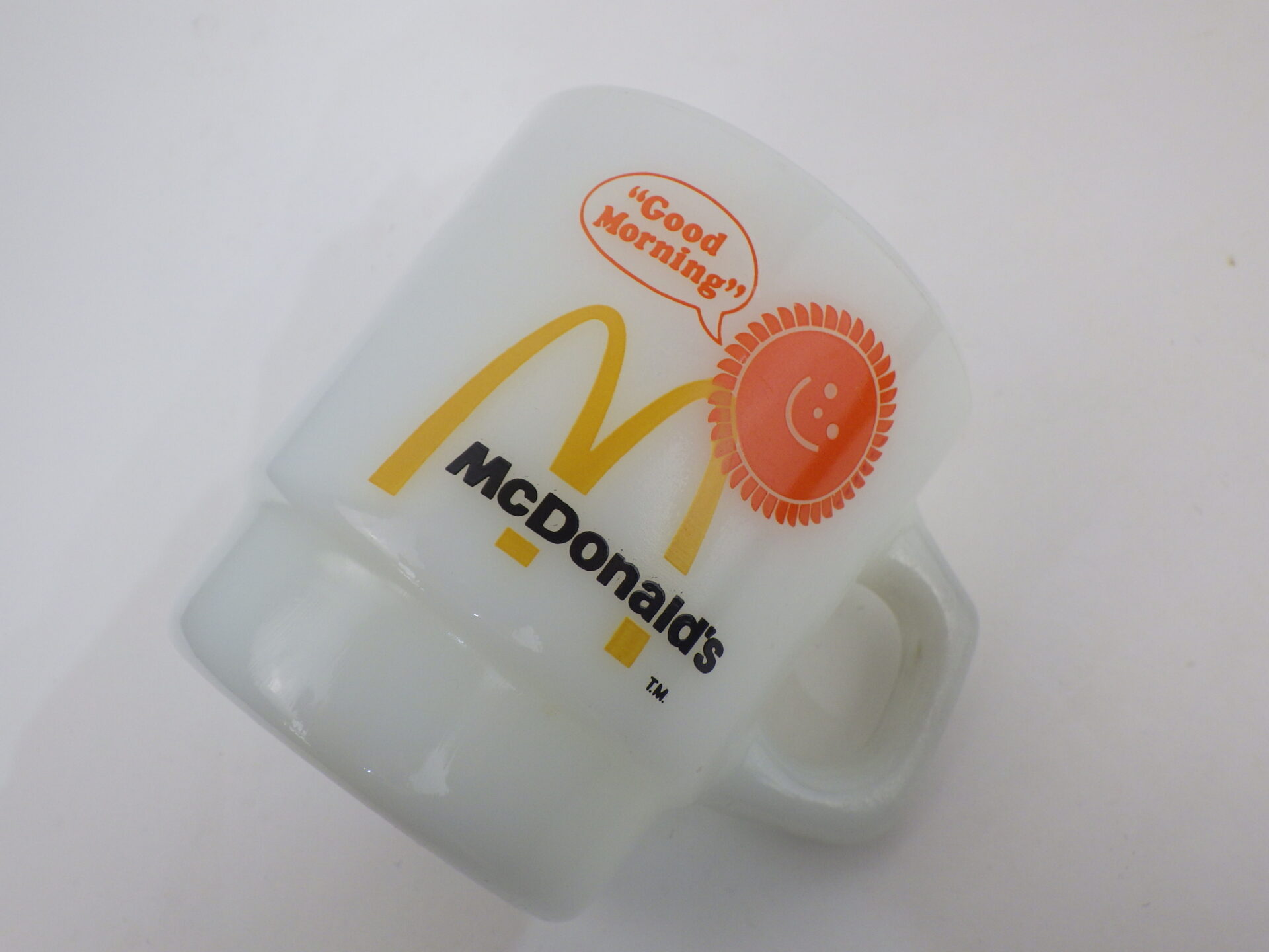| アメリカで買い付けました。 ファイヤーキングのアドバタイジングマグの中でも大人気の、マクドナルドマグです。 当時ブレックファーストセット等を注文した時にノベルティとしてもらえたマグです。 にっこり笑顔の太陽のモチーフと、お馴染みのロゴのデザインがとても可愛いアイテムですね。 |