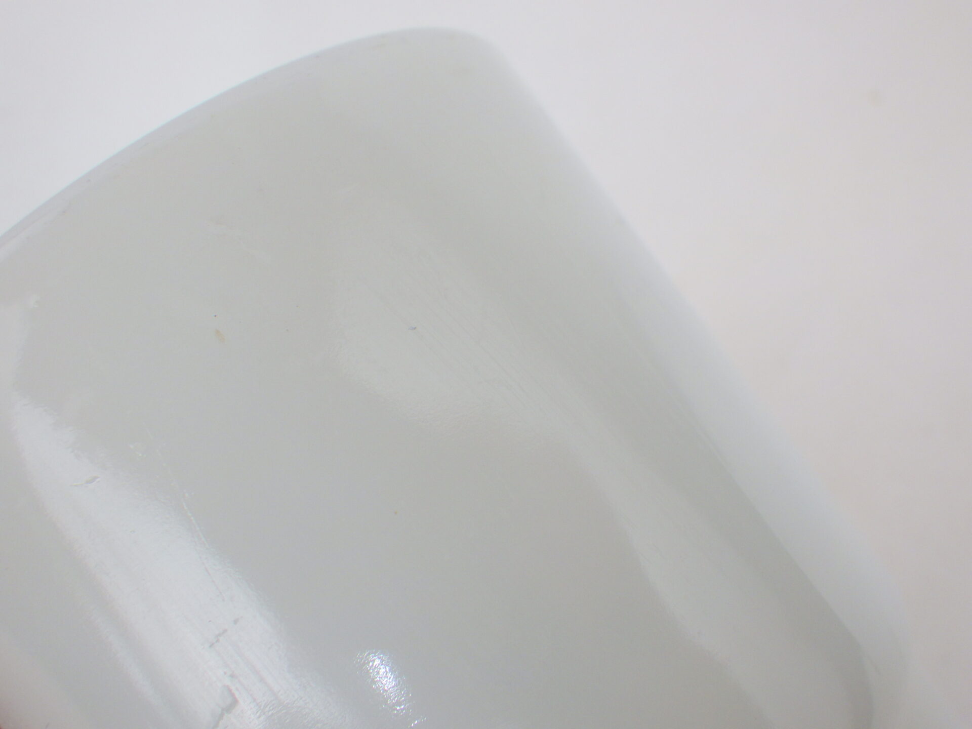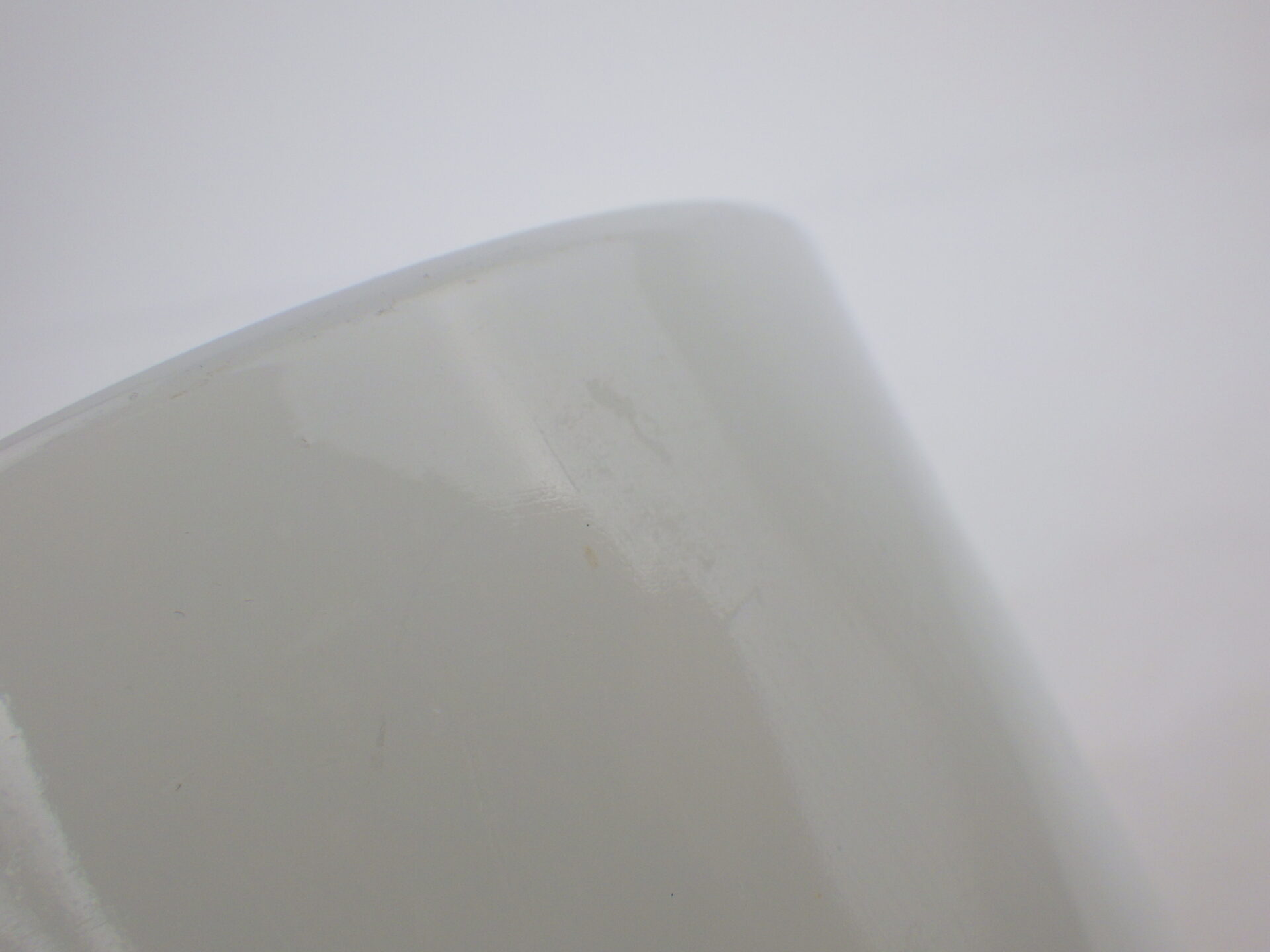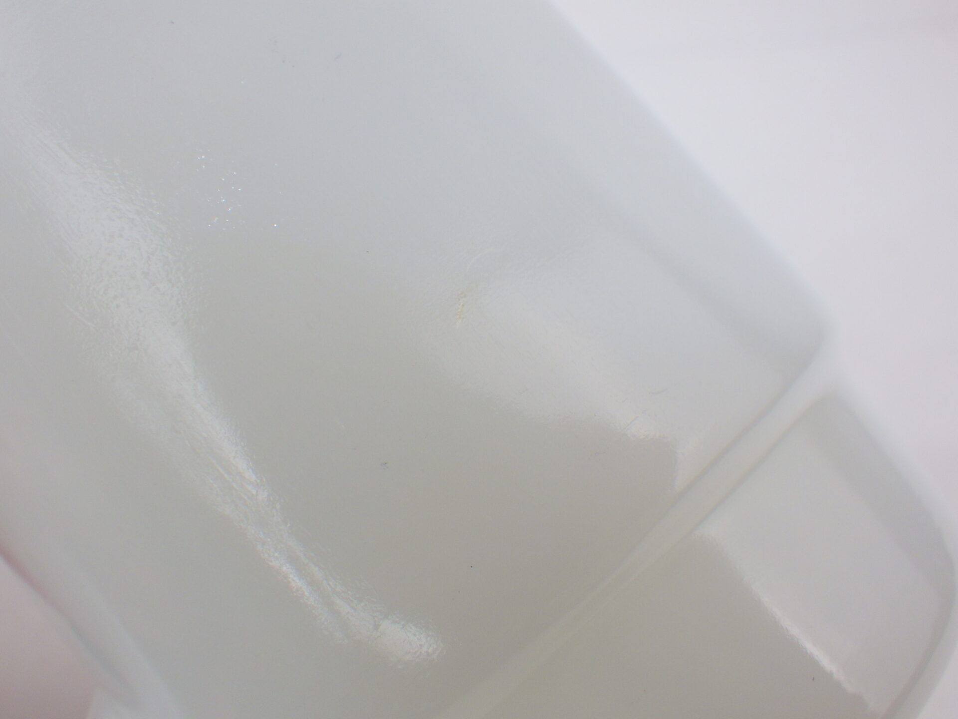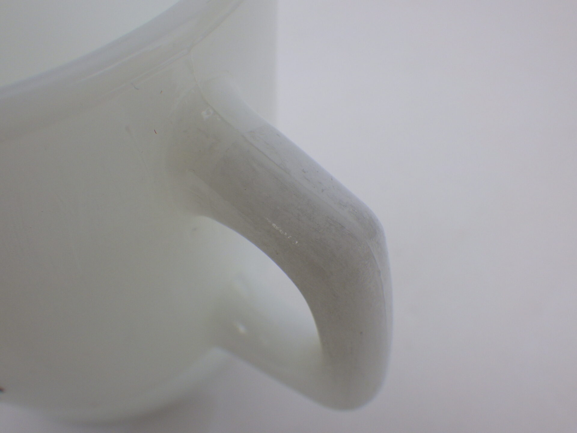 | condition | リム付近、ボトム、ハンドル、側面に薄い着色、金属痕があります。 側面に製造時よりのヘアライン、劣化線、凹凸がありますが、ミルクガラス特有のもので、ご使用に影響はありません。 その他ワレ、カケなどはなく、ビンテージらしい良い雰囲気です。 |