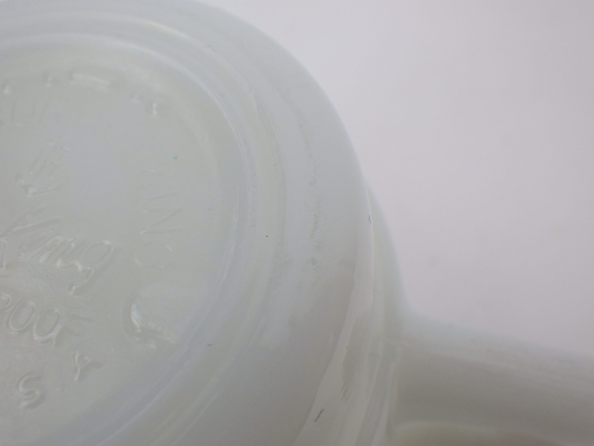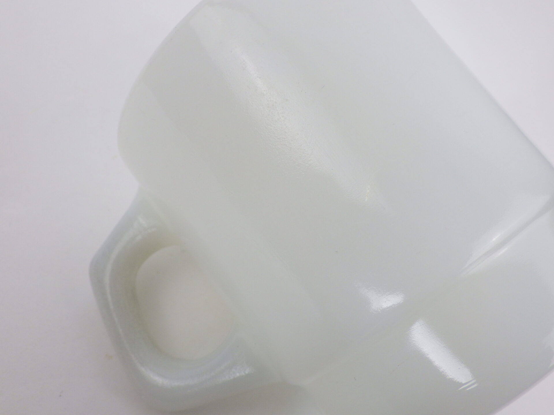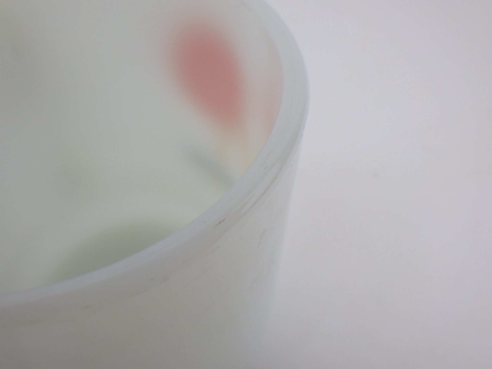 | condition | リム付近、ボトム、ハンドル、側面に薄い着色、金属痕があります。 側面に製造時よりのヘアライン、劣化線、凹凸がありますが、ミルクガラス特有のもので、ご使用に影響はありません。 その他ワレ、カケなどはなく、ビンテージらしい良い雰囲気です。 |