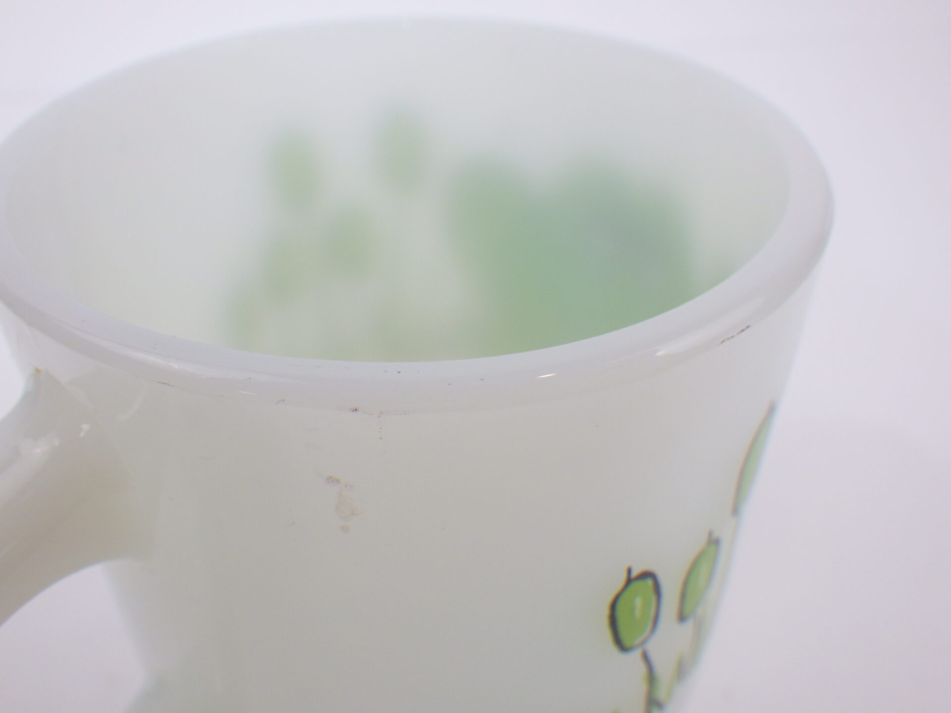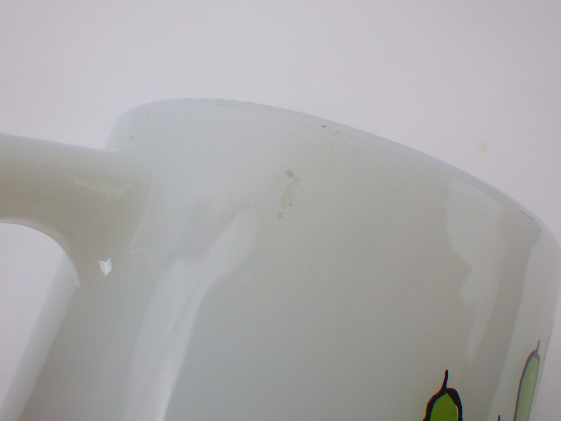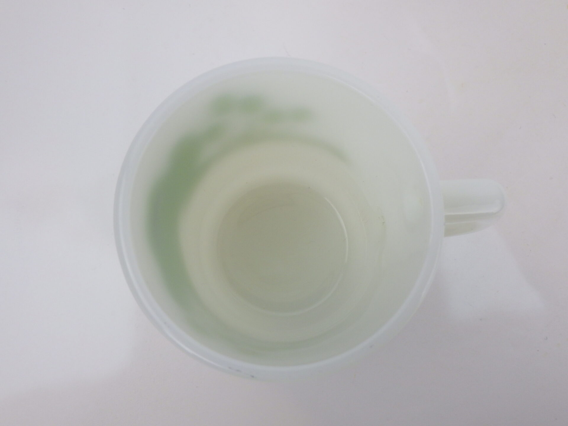 | condition | リム、ボトム、側面にわずかな着色、金属痕があります。 ハンドル付近、側面下部に劣化線があります。 側面に製造時よりのホワイトスポットがあります。 リムに製造時よりのフリーバイト(がたつき)があります。 その他、製造時よりのヘアライン、劣化線、凹凸などありますが、ミルクガラス特有のものです。 |