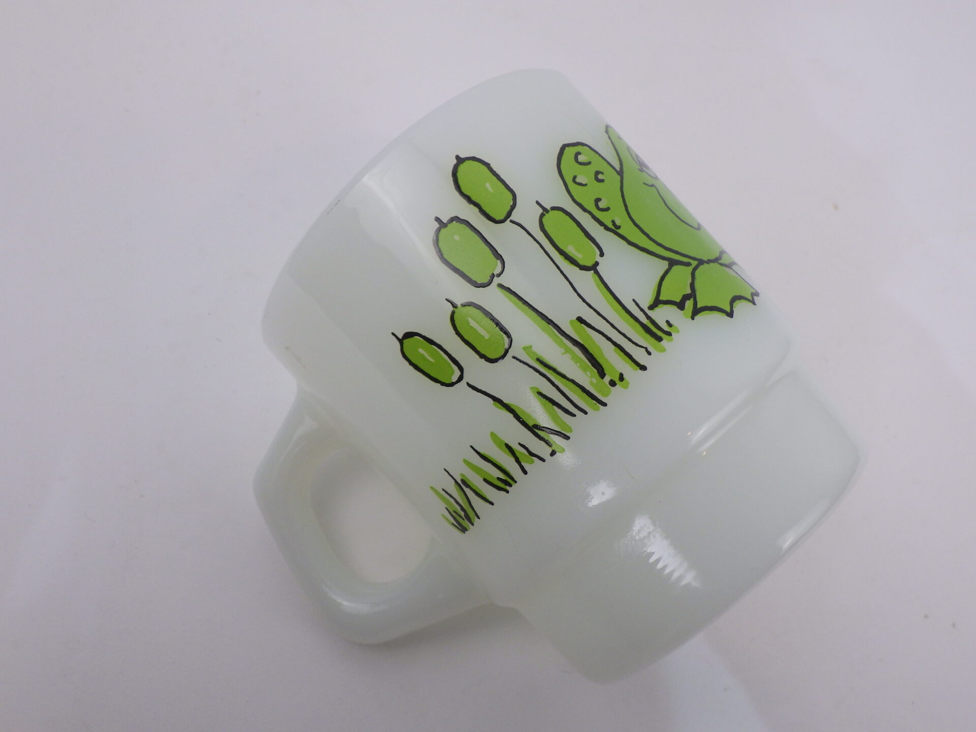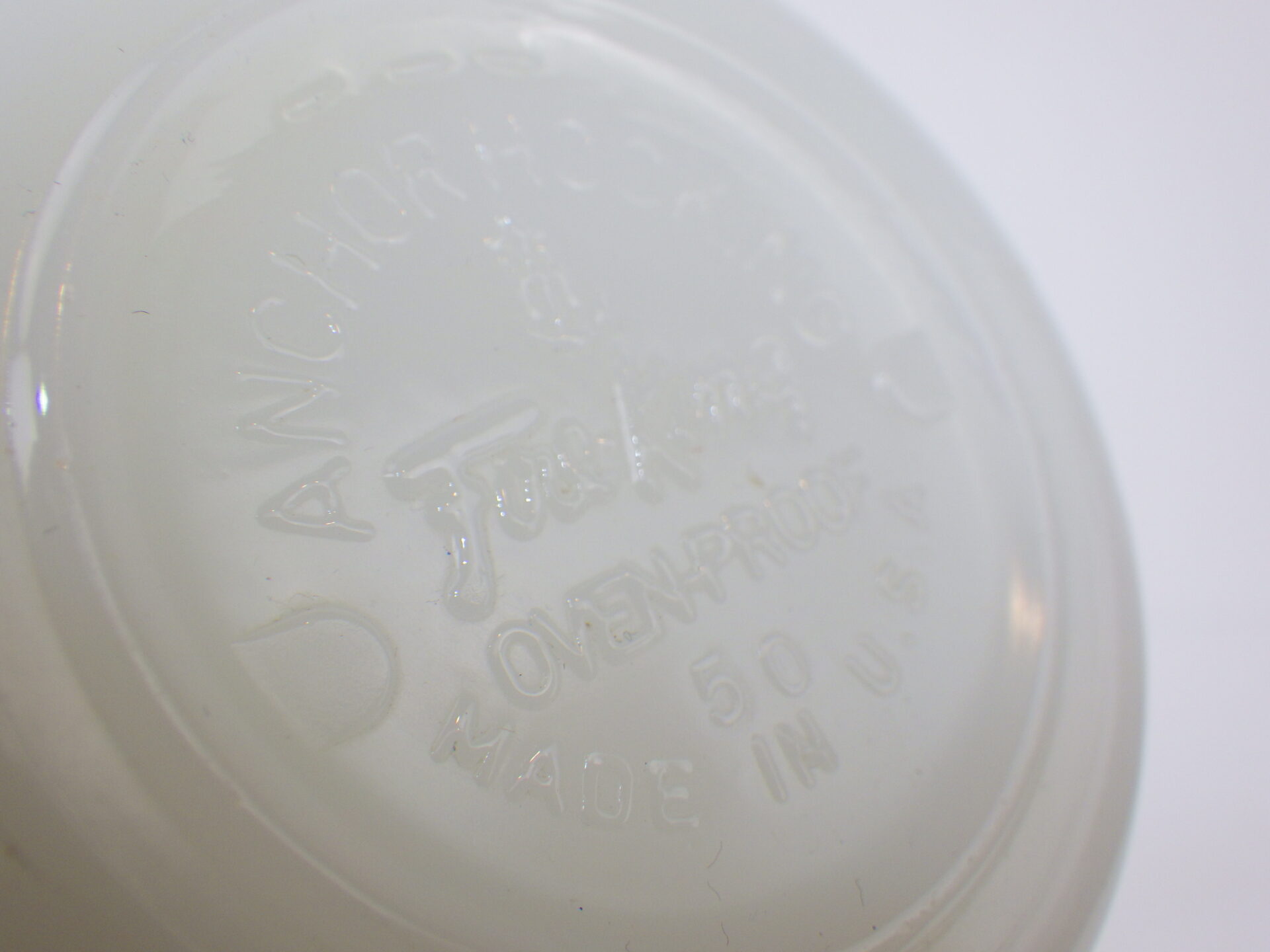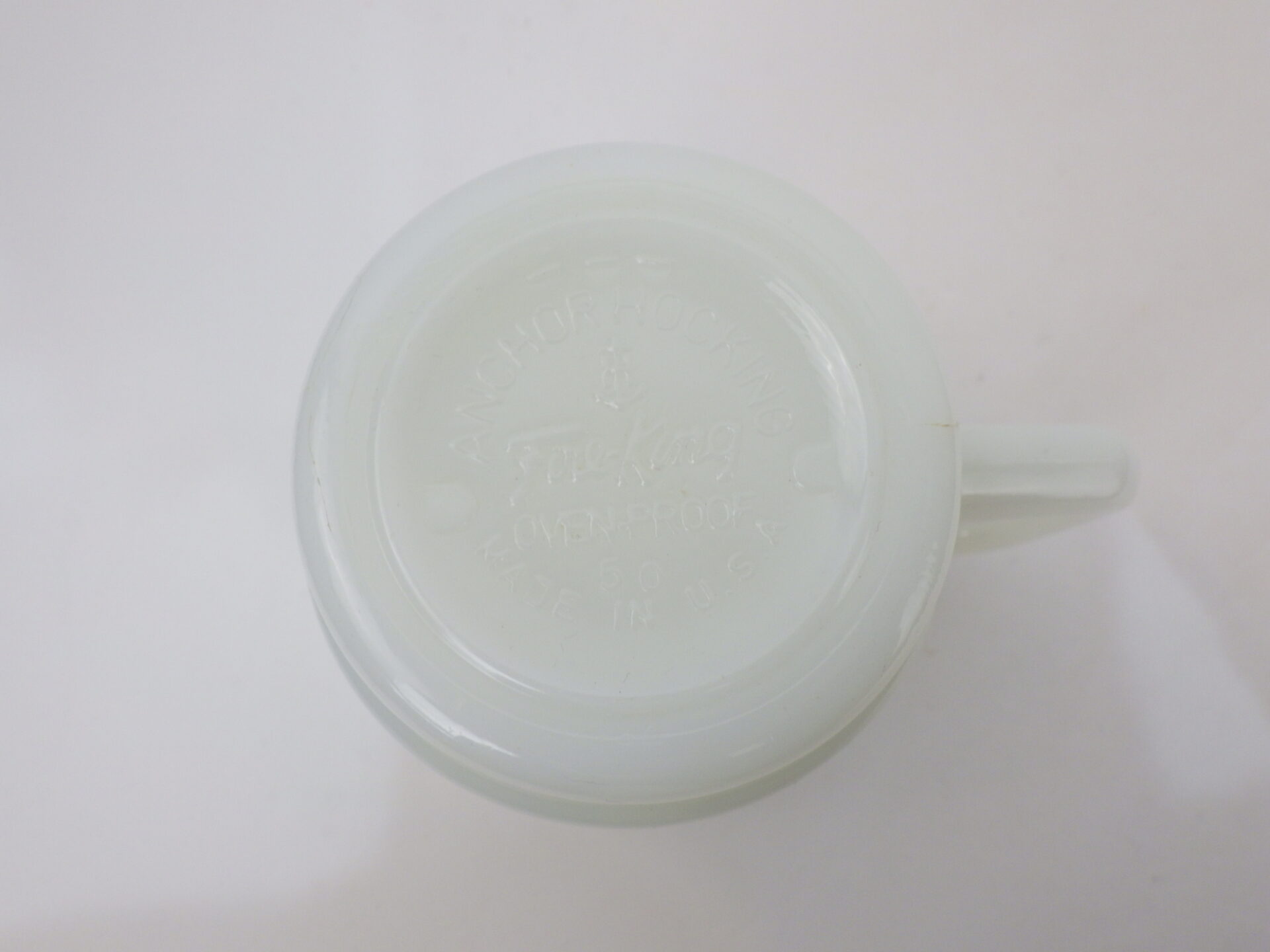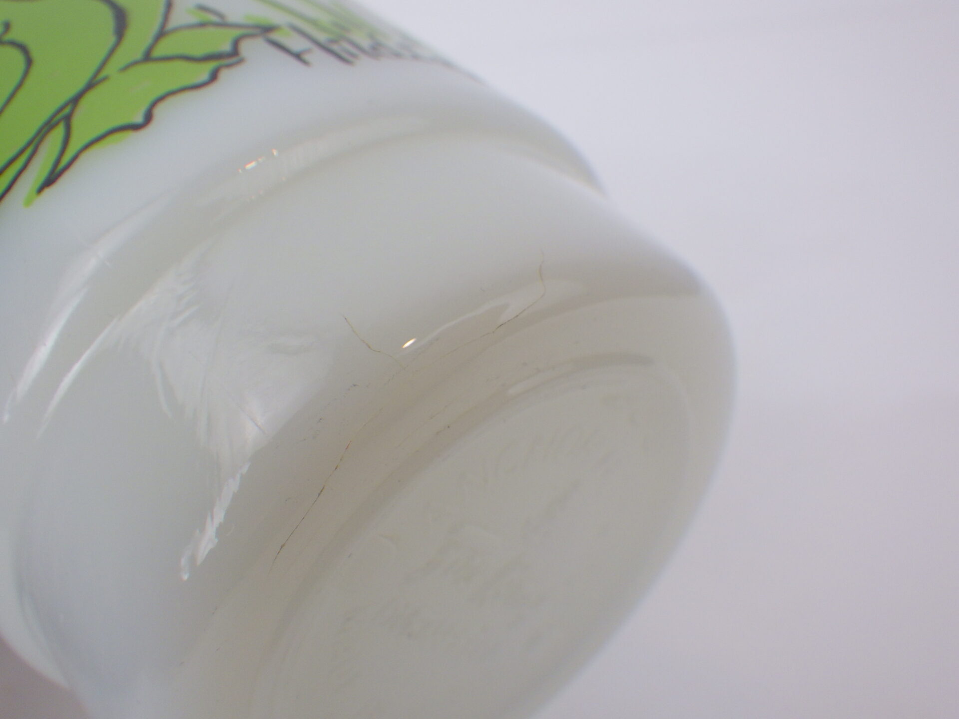 | condition | リム、ボトム、側面にわずかな着色、金属痕があります。 ハンドル付近、側面下部に劣化線があります。 側面に製造時よりのホワイトスポットがあります。 リムに製造時よりのフリーバイト(がたつき)があります。 その他、製造時よりのヘアライン、劣化線、凹凸などありますが、ミルクガラス特有のものです。 |