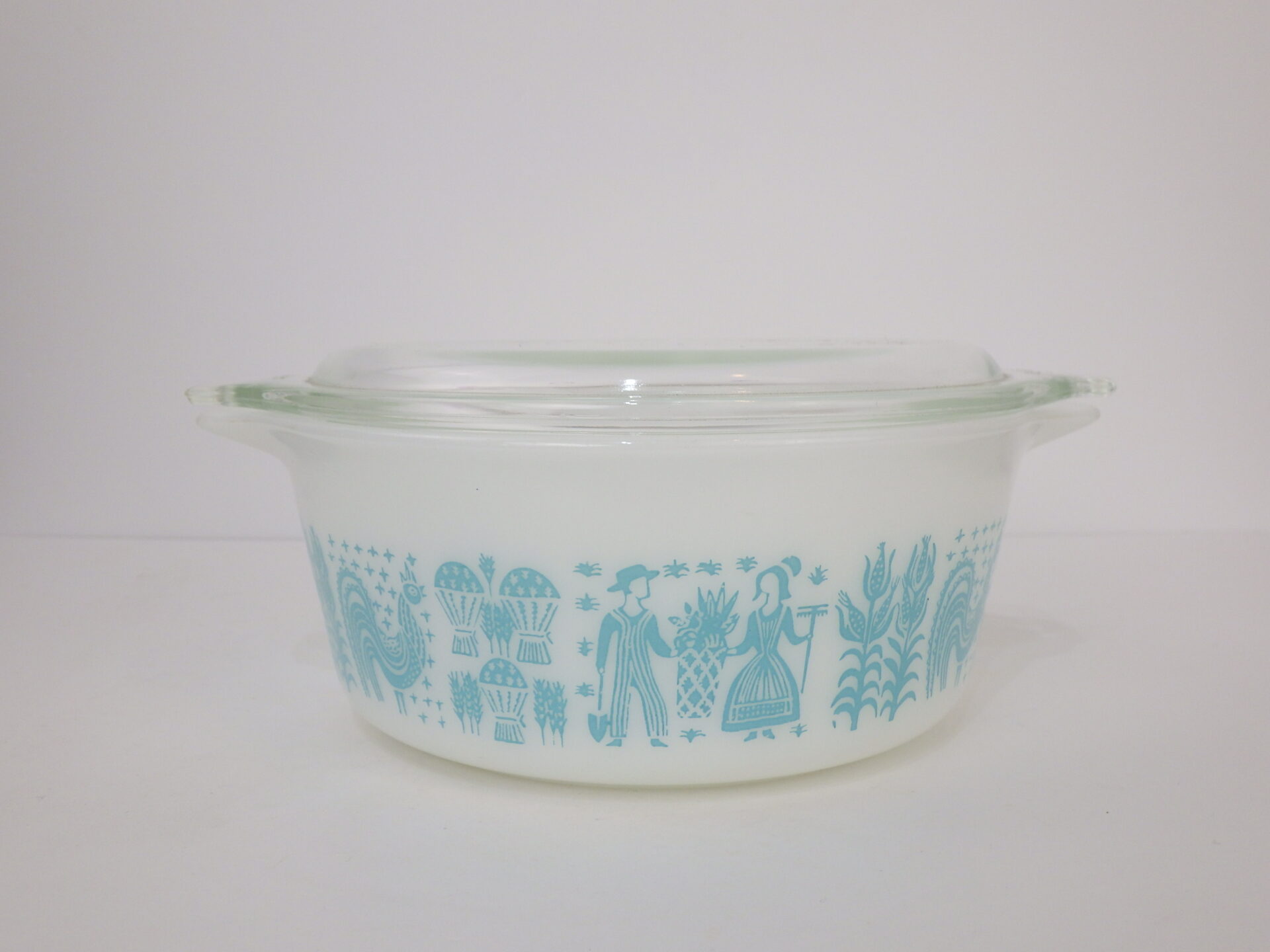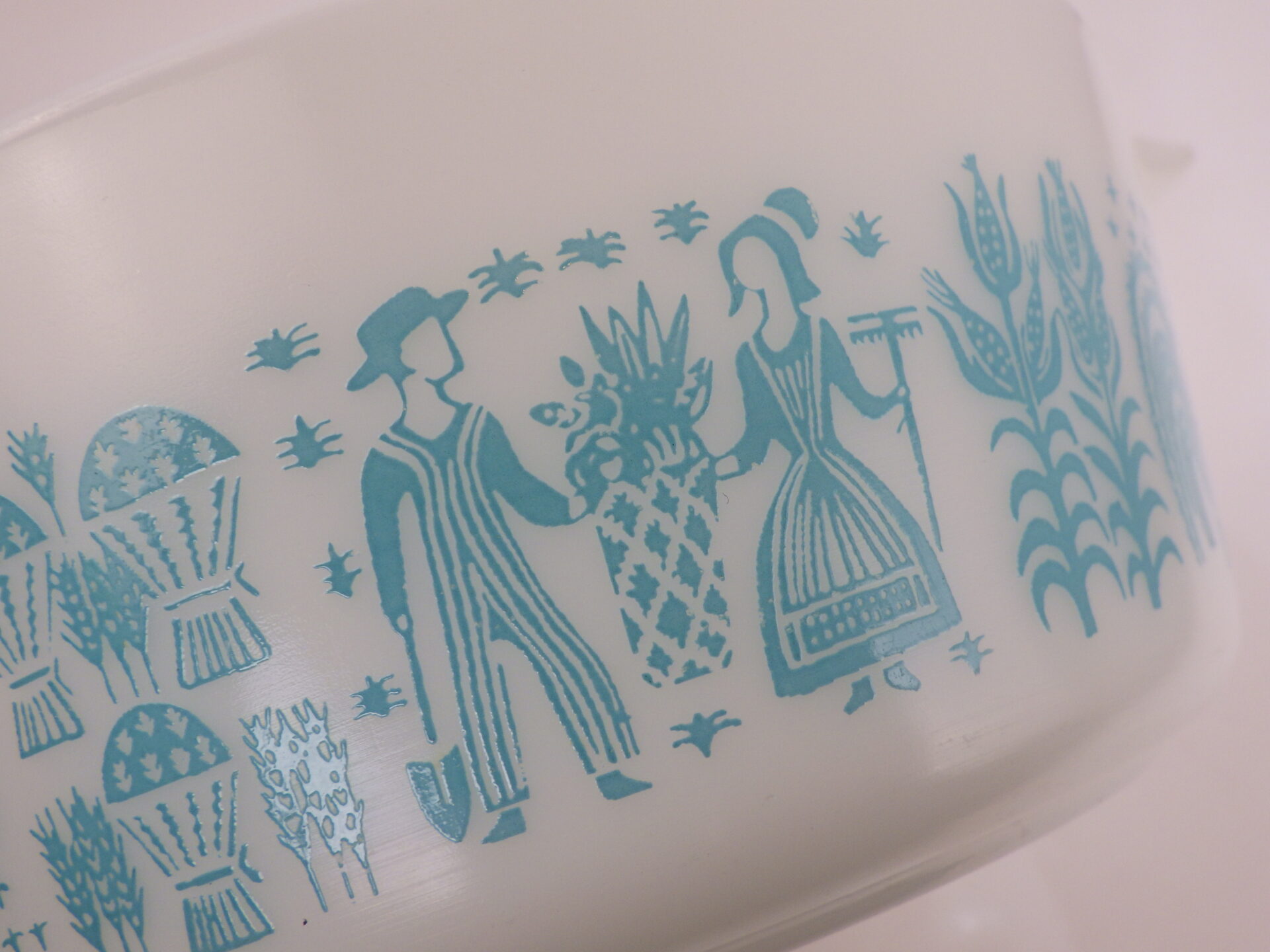 | アメリカで買い付けました。 オールドパイレックスのバタープリント、キャセロールです。 正式名称「シンデレラベイクサーブ&ストア」と言い、オーブン料理をそのまま食卓へ並べられる、便利でおしゃれなアイテムです。 こちらの「バタープリント」は、「アーミッシュ」とも呼ばれ、農夫、にわとり、トウモロコシ等の農作風景がプリントされており、「グーズベリー」と共に50年代を代表するシリーズです。 |