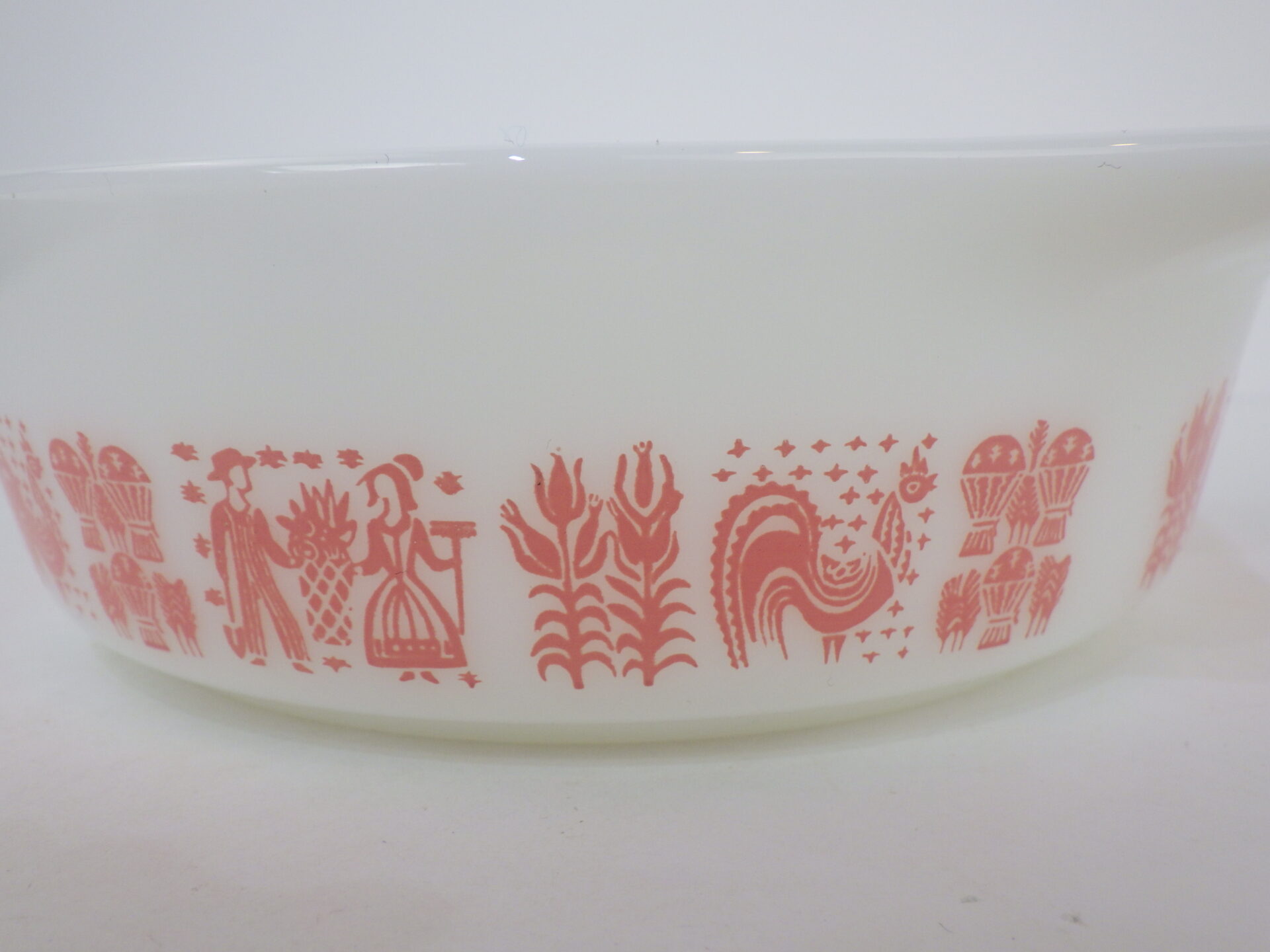 | アメリカで買い付けました。 オールドパイレックスのバタープリント、キャセロールです。 正式名称「シンデレラベイクサーブ&ストア」と言い、オーブン料理をそのまま食卓へ並べられる、便利でおしゃれなアイテムです。 こちらの「バタープリント」は、「アーミッシュ」とも呼ばれ、農夫、にわとり、トウモロコシ等の農作風景がプリントされており、「グーズベリー」と共に50年代を代表するシリーズです。 ピンクのタイプは生産数が少なく、ターコイズよりも希少なアイテムです。 |