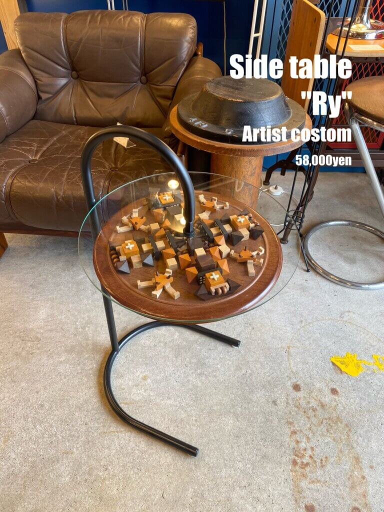 ガラス天板の下に取り付けられたウッドの飾りがアーティストによって加えられた、遊び心満載のアイテム。