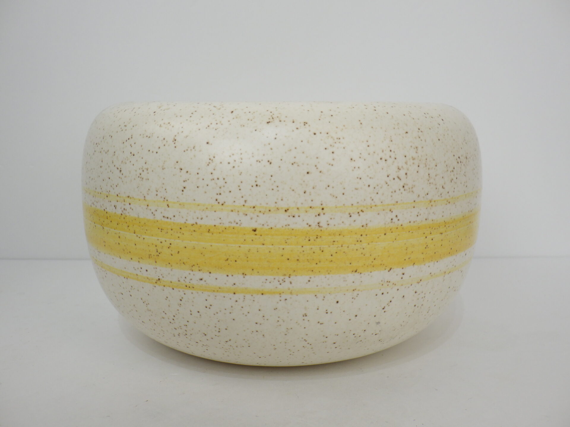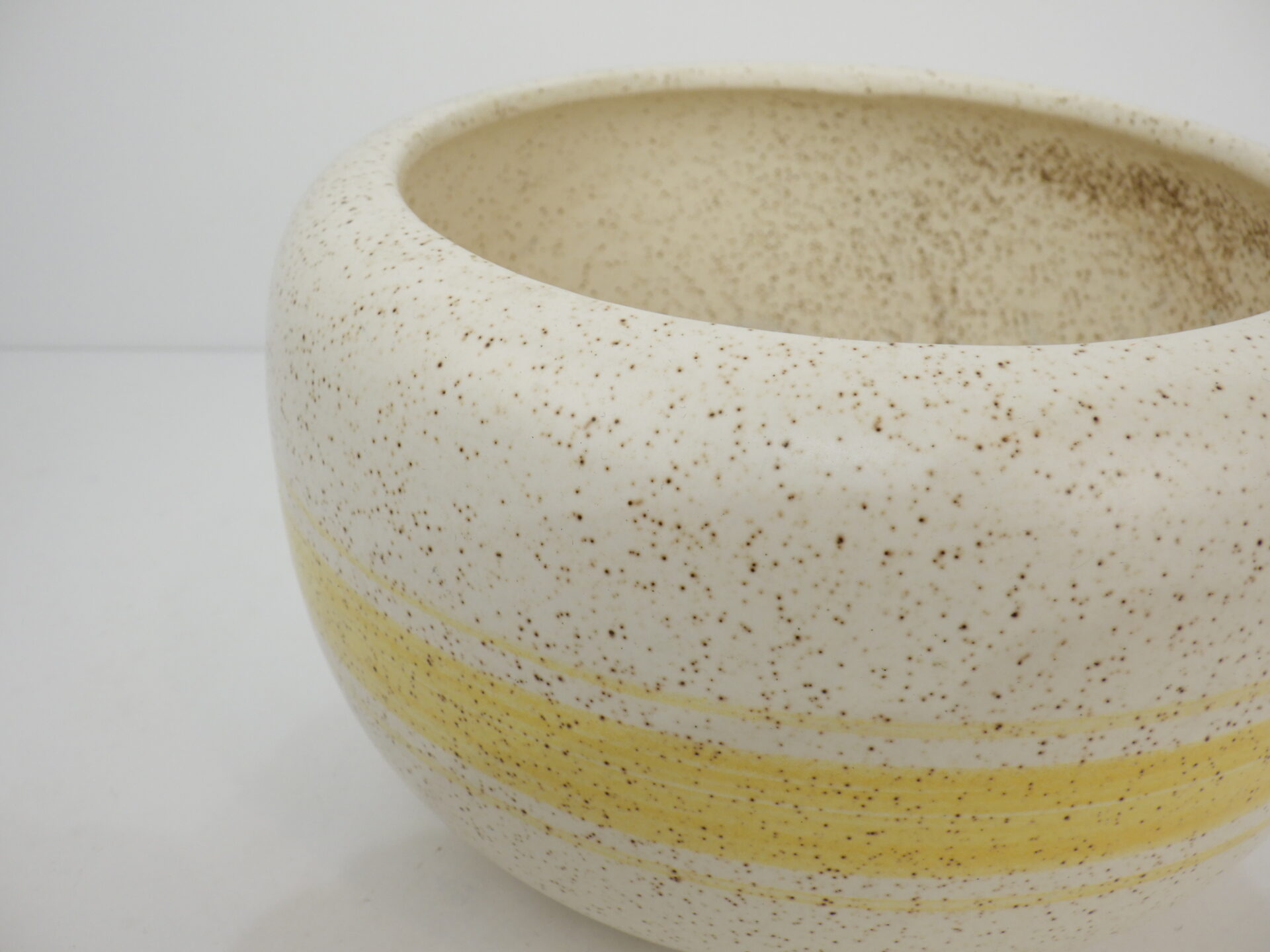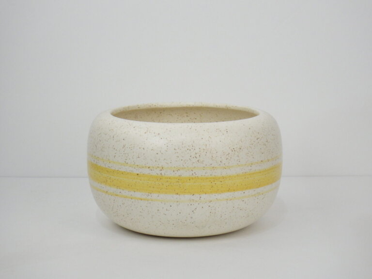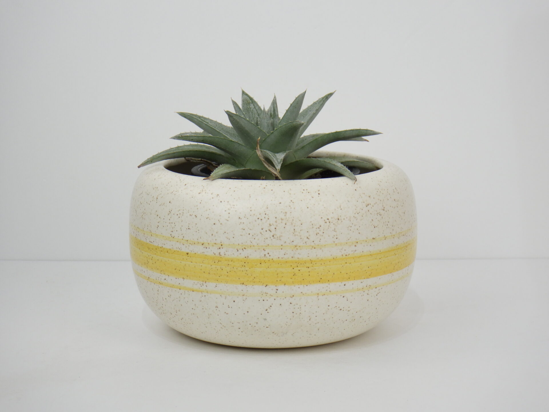 | アメリカで買い付けました。 "Haeger"社製、陶器のプランターです。 Haegerは1800年代中期にイリノイ州でレンガ工場として創業した陶磁器メーカーです。 薄いクリームホワイトのカラーの地に、ライトイエローのラインと斑点が印象的なアイテム。 底穴は空いていませんので、鉢カバーとしてご使用いただくか、フラワーフロッグを使ってお花を生けるのもおすすめです。 |
