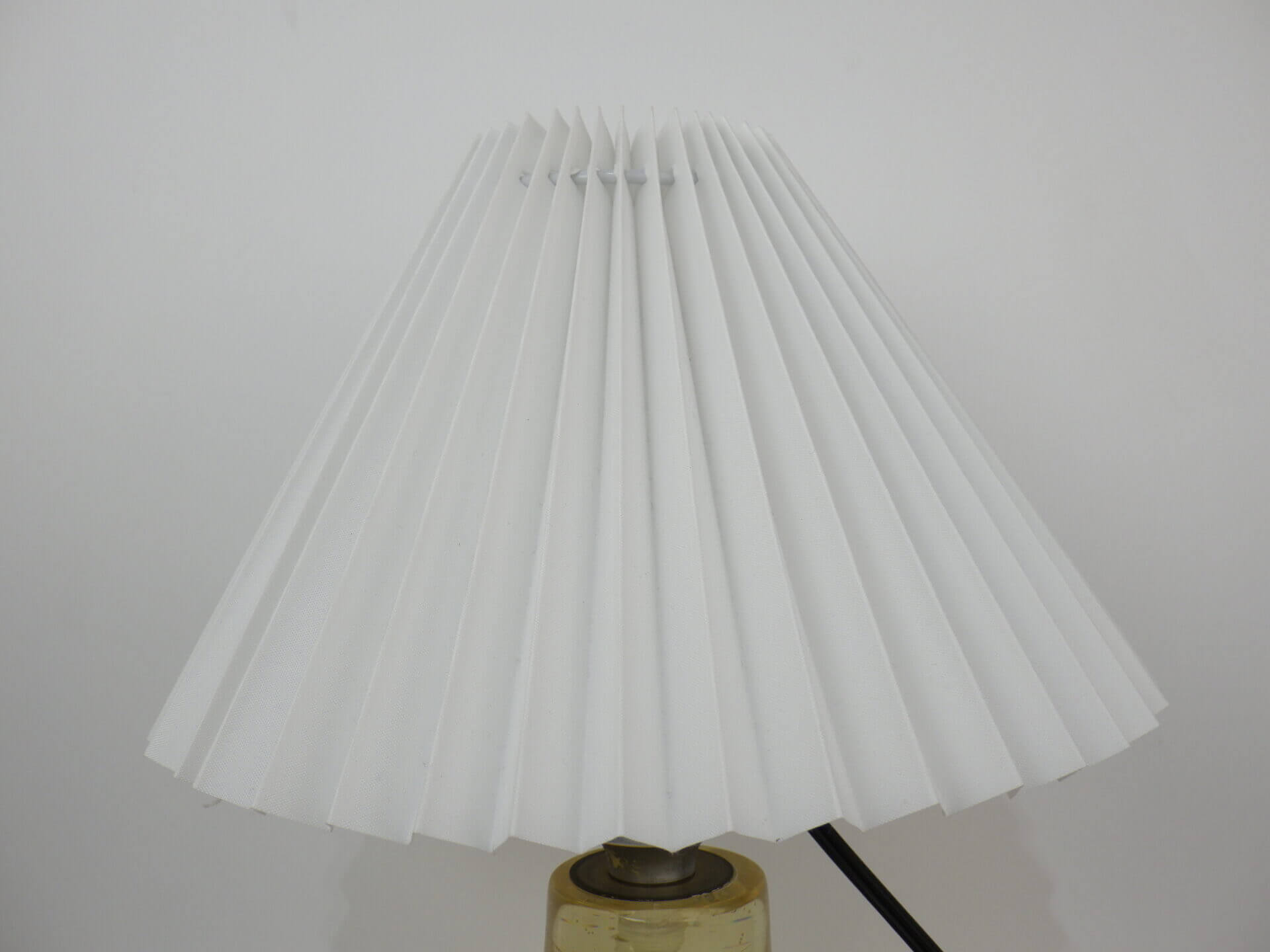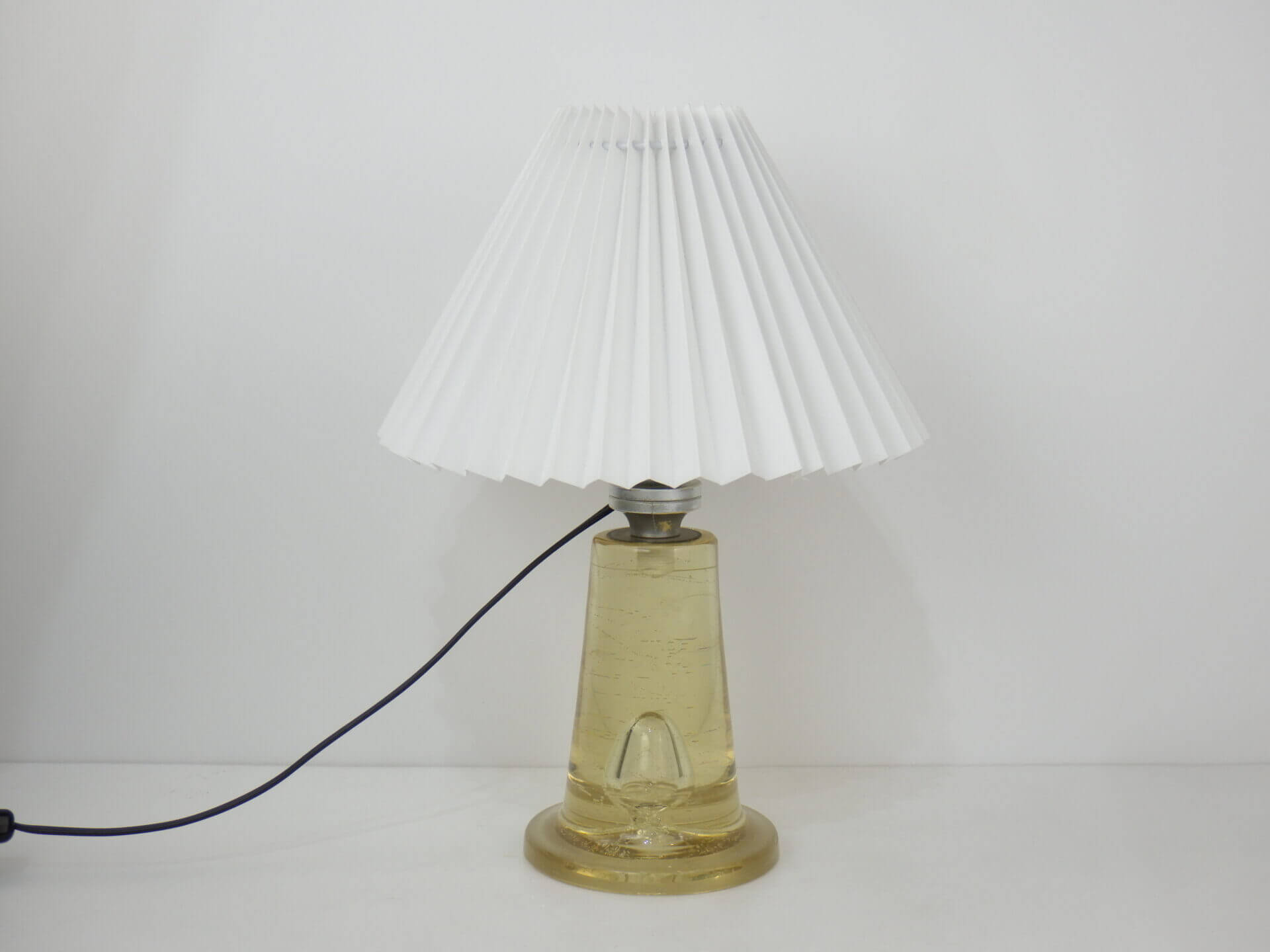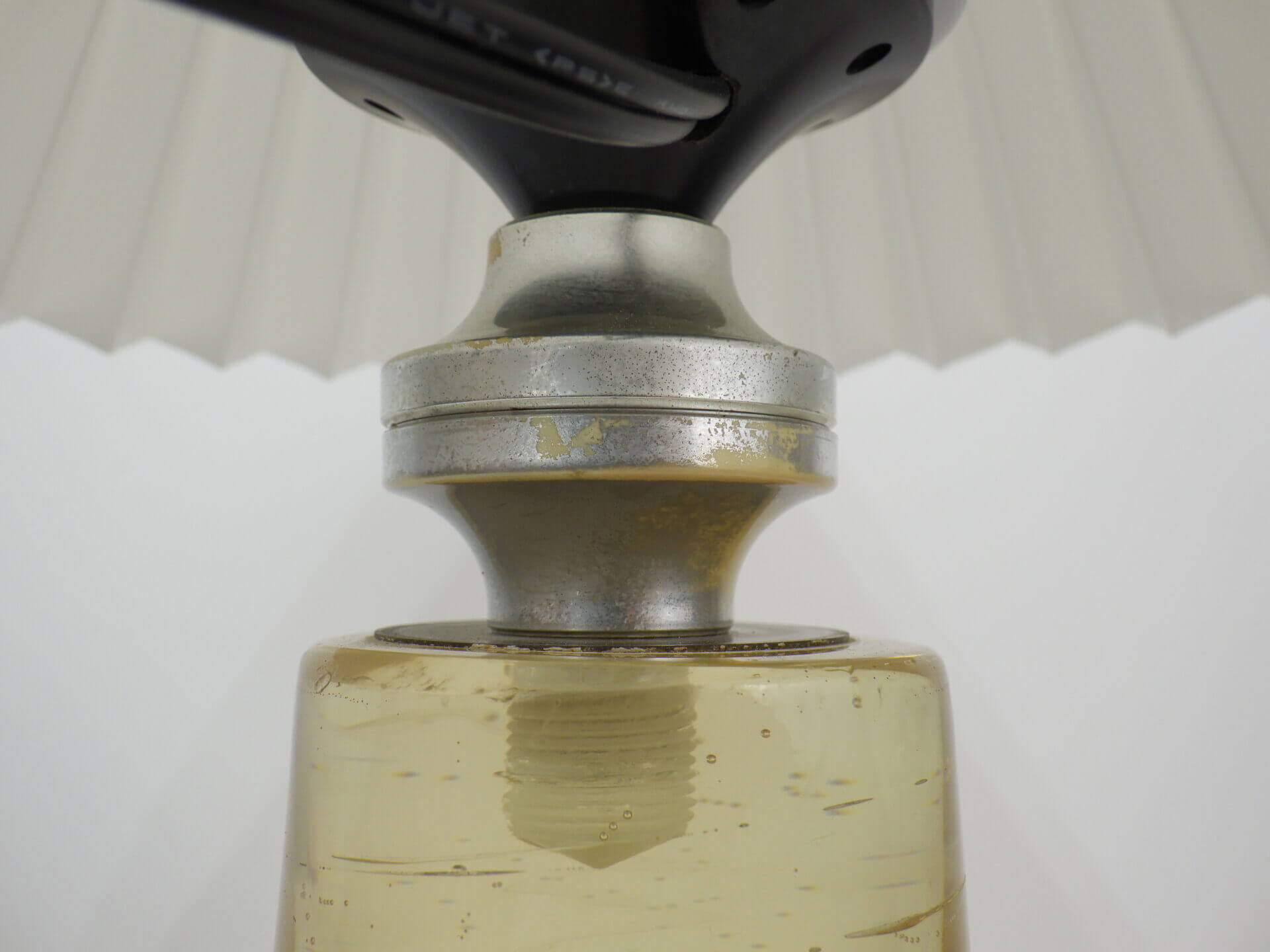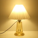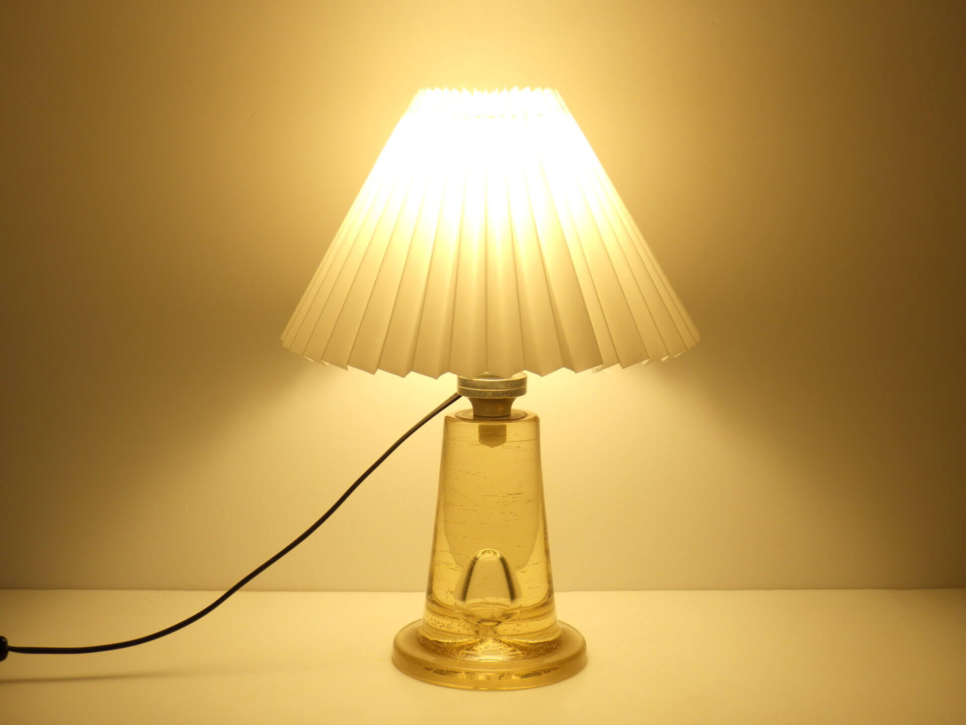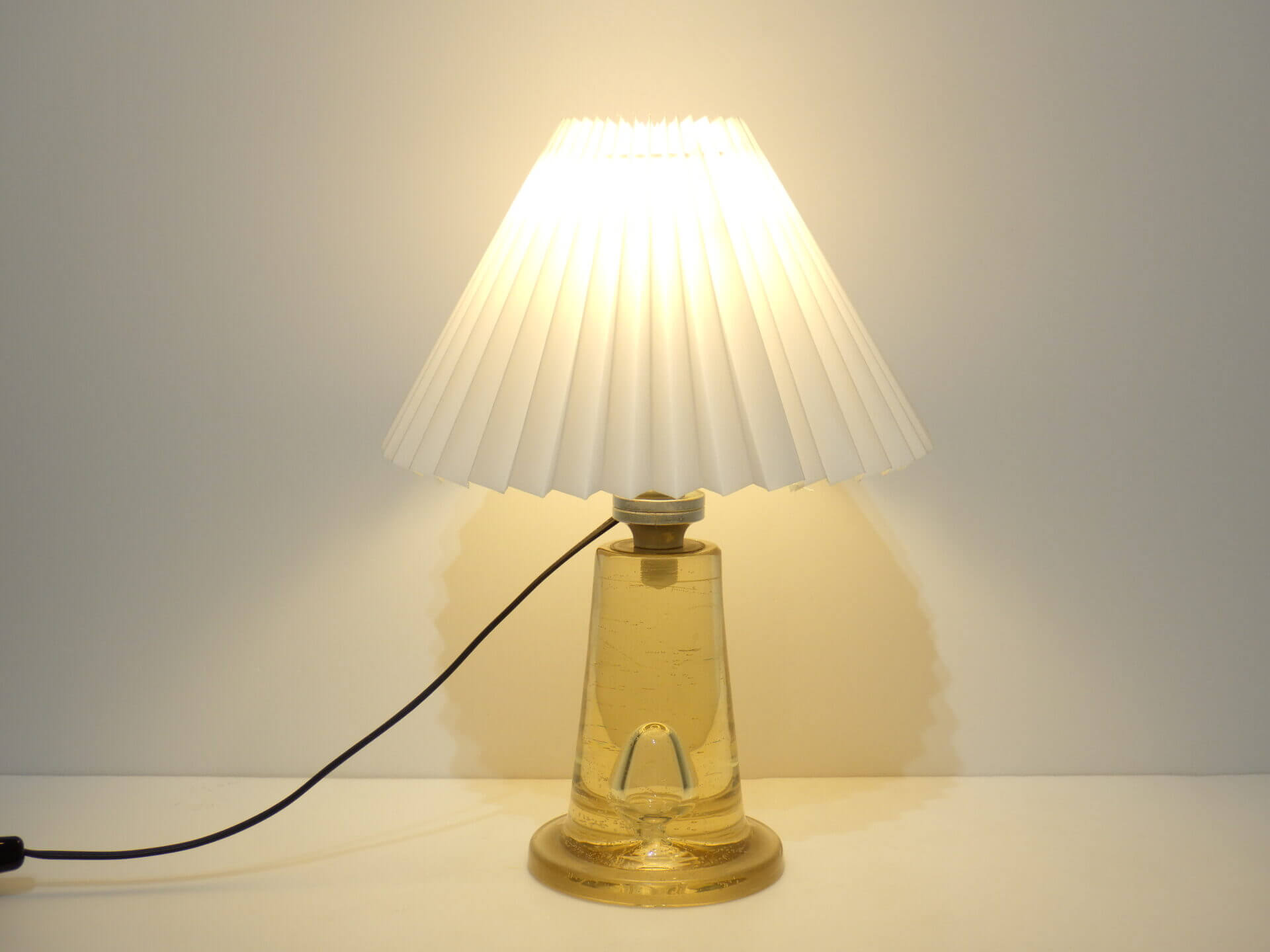 | アメリカで買い付けました。 西ドイツ、ARO Leuchte社製のテーブルランプです。 ルーサイトのベースには、所々に小さな気泡が散りばめられており、灯りをつけた時に煌めく姿が見られ、大変幻想的です。 テーブルランプとしてはもちろんのこと、アート、オブジェといった感覚でお気に入りのスペースに取り入れて頂きたいアイテムです。 また小ぶりなサイズ感なので、テーブルやサイドボード、ナイトスタンドなど様々な場所に置いてお楽しみいただけます。 コードのスイッチでON/OFFが切り替えられます。 (電球の口金サイズ:E26 LED対応) シェードは日本で新品の物を取り付けています。 電球をつける際、ソケット部の黒いプラスチックパーツをひねって取り外して下さい。 |