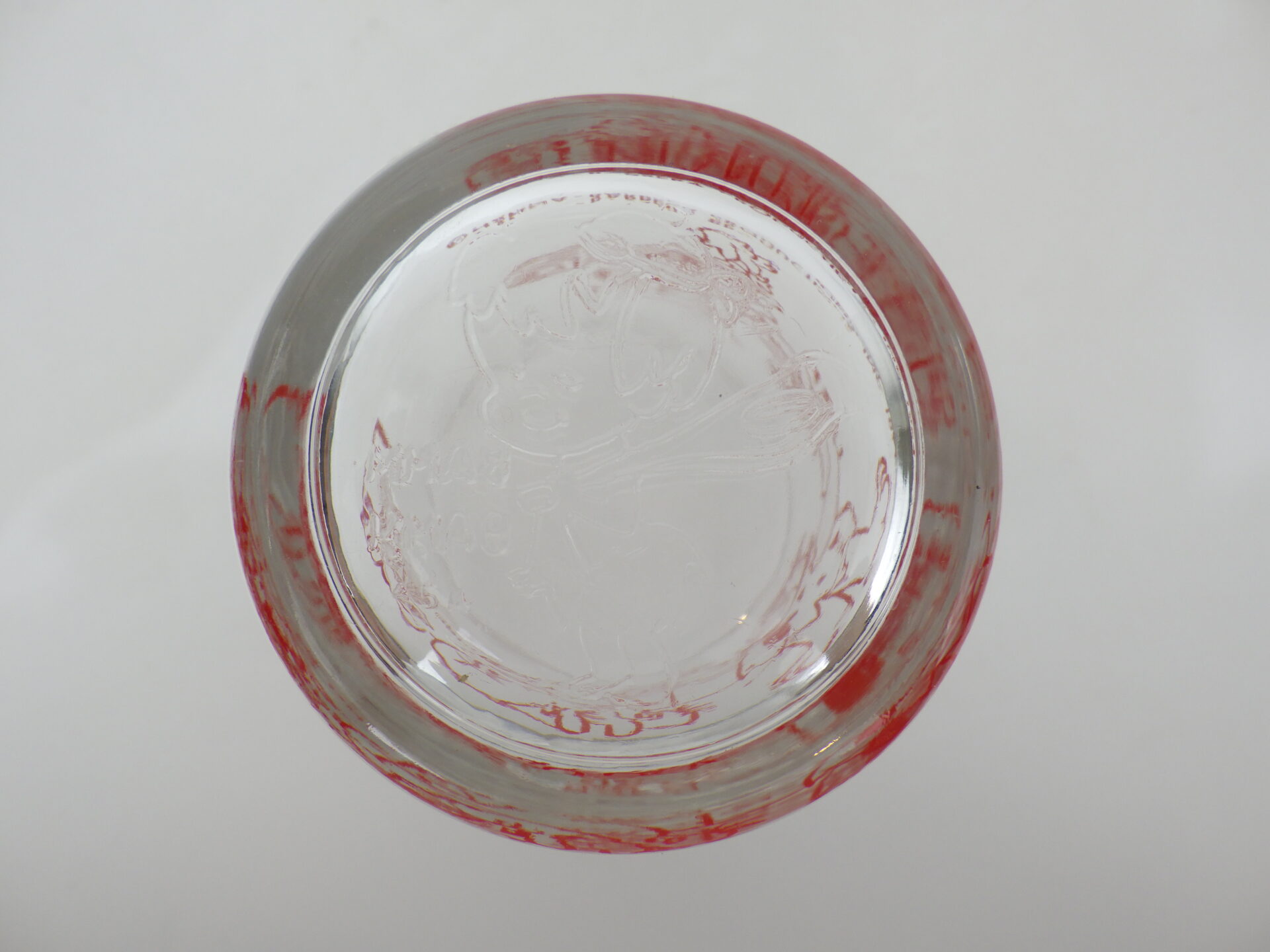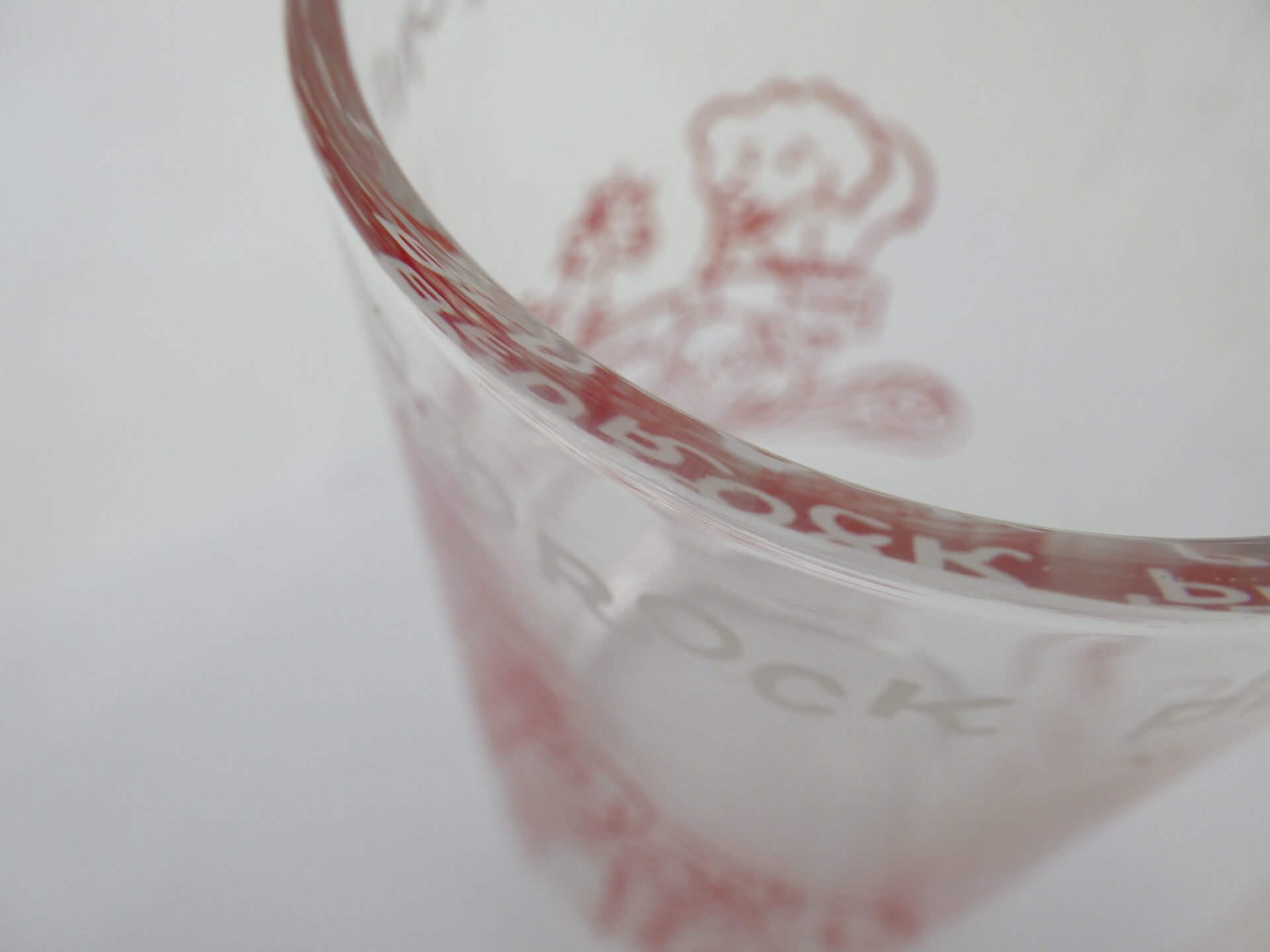 | 「トムとジェリー」でお馴染みの「ハンナ・バーベラ・プロダクション」の「フリントストーン」のビンテージグラスです。 元は、グレープジュースでお馴染みのウェルチのジャムが入っていました。 こちらは「BEDROCK PET SHOW」のタイトルで、その様子がプリントされています。 ボトム面のキャラクターエンボスは、クッキーの型押しになっています。(バーニーの息子、バンバンのエンボスです) |