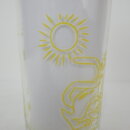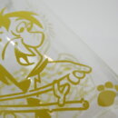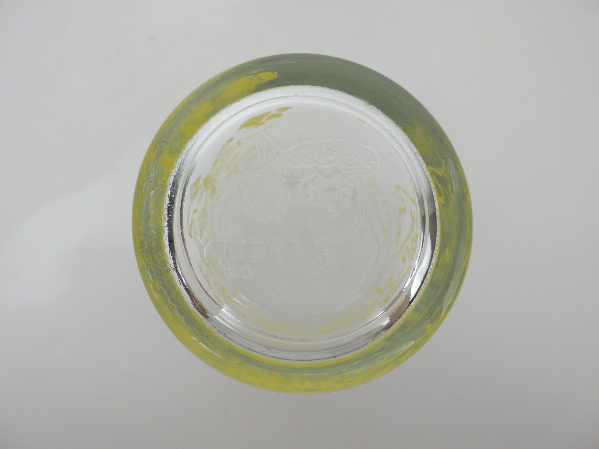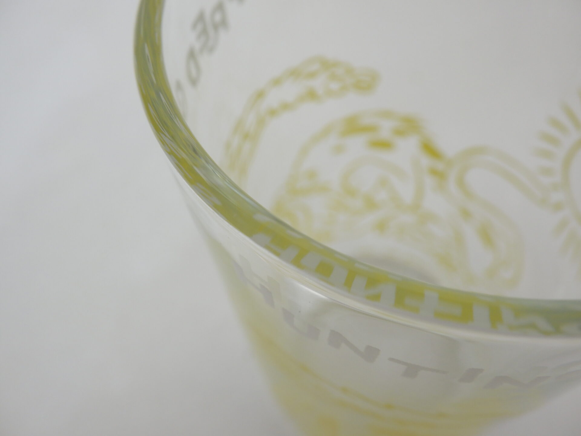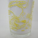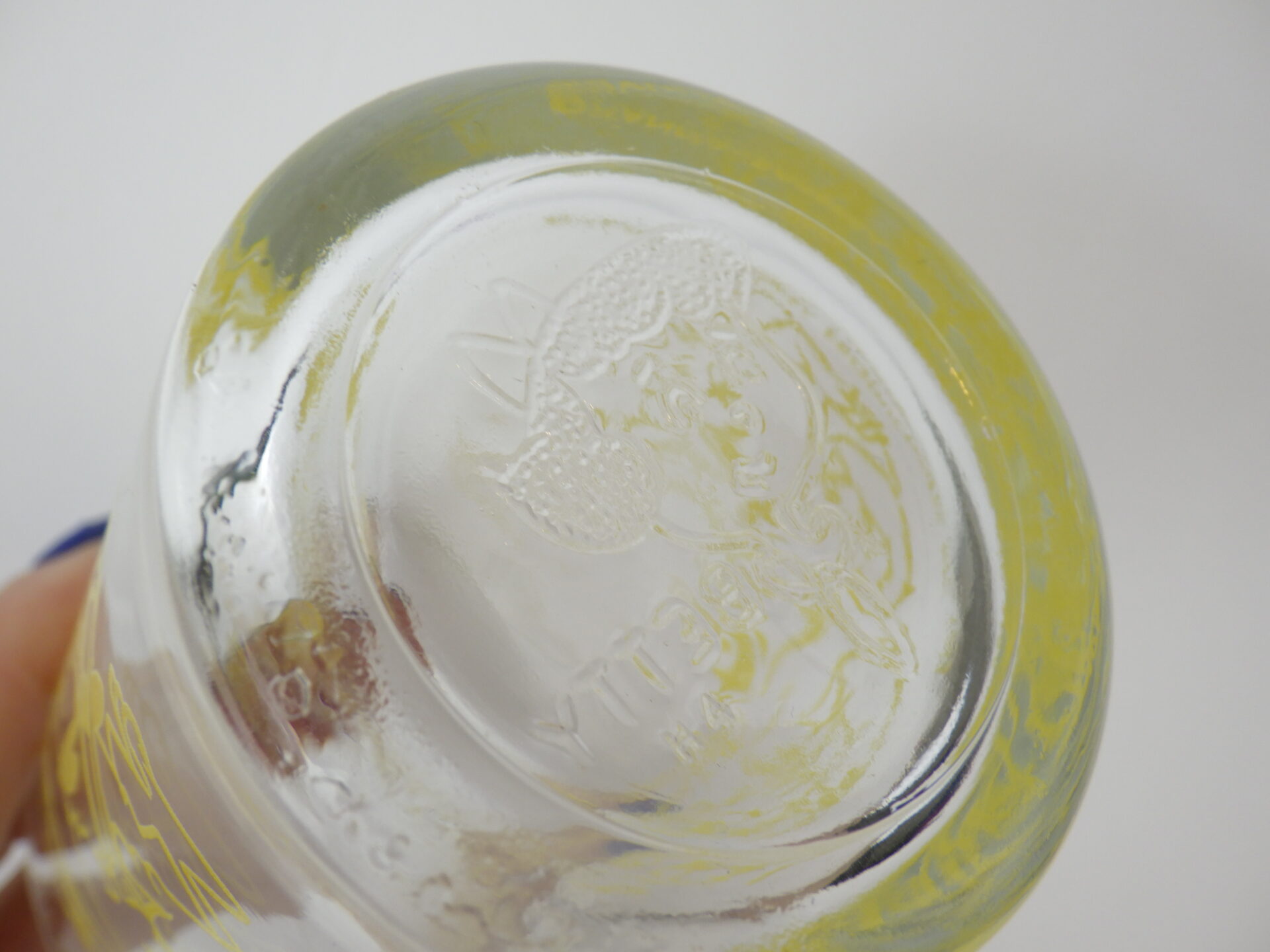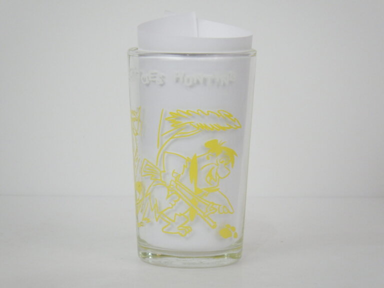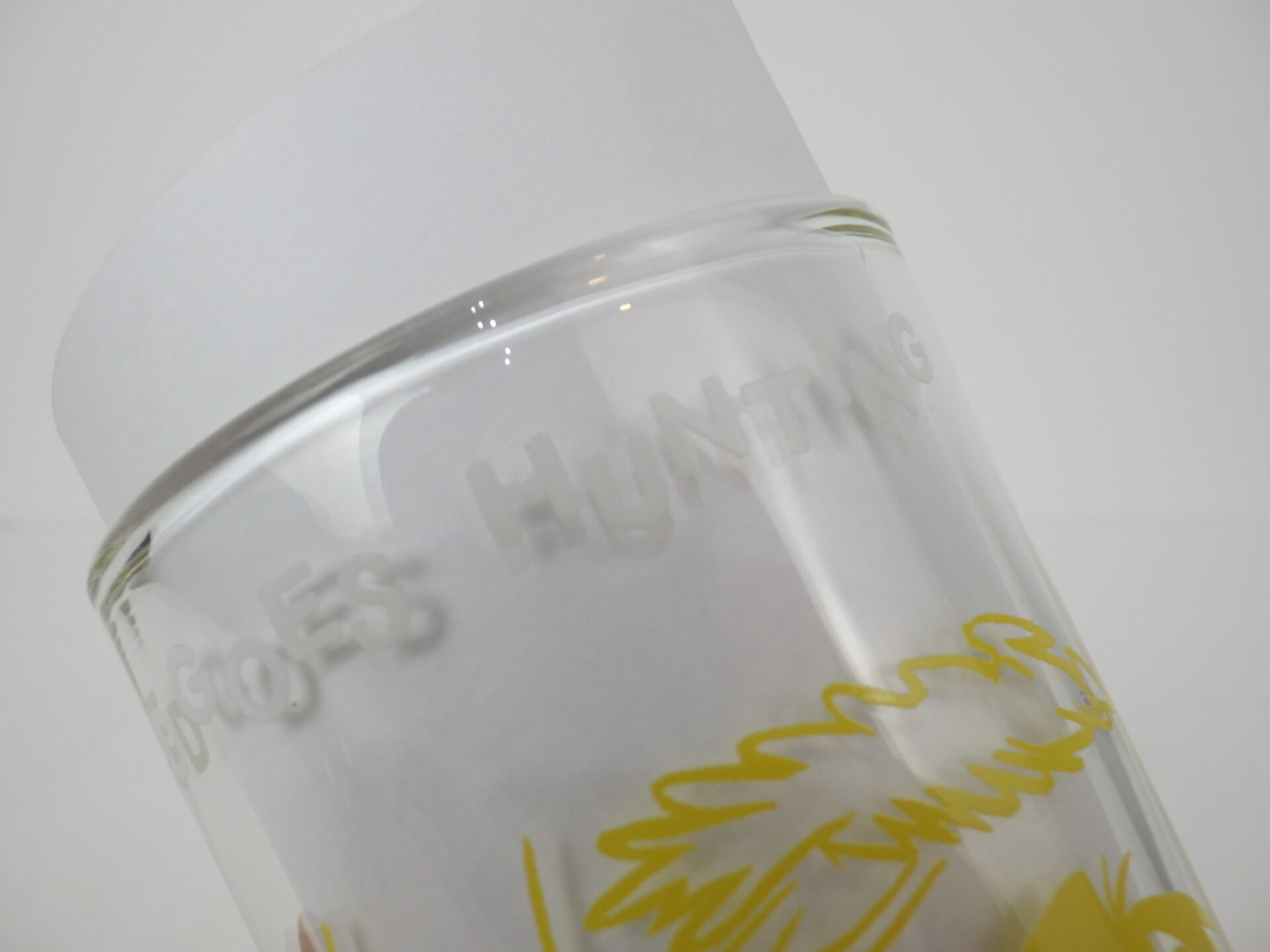 | 「トムとジェリー」でお馴染みの「ハンナ・バーベラ・プロダクション」の「フリントストーン」のビンテージグラスです。 元は、グレープジュースでお馴染みのウェルチのジャムが入っていました。 こちらは「FRED GOES HUNTING」のタイトルで、その様子がプリントされています。 ボトム面のキャラクターエンボスは、クッキーの型押しになっています。(隣人バーニーの妻ベティのエンボスです) |