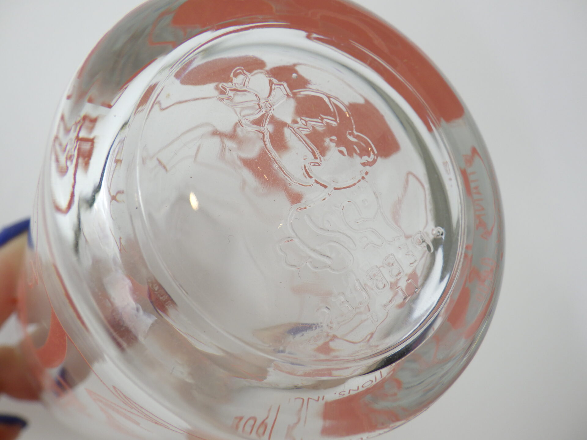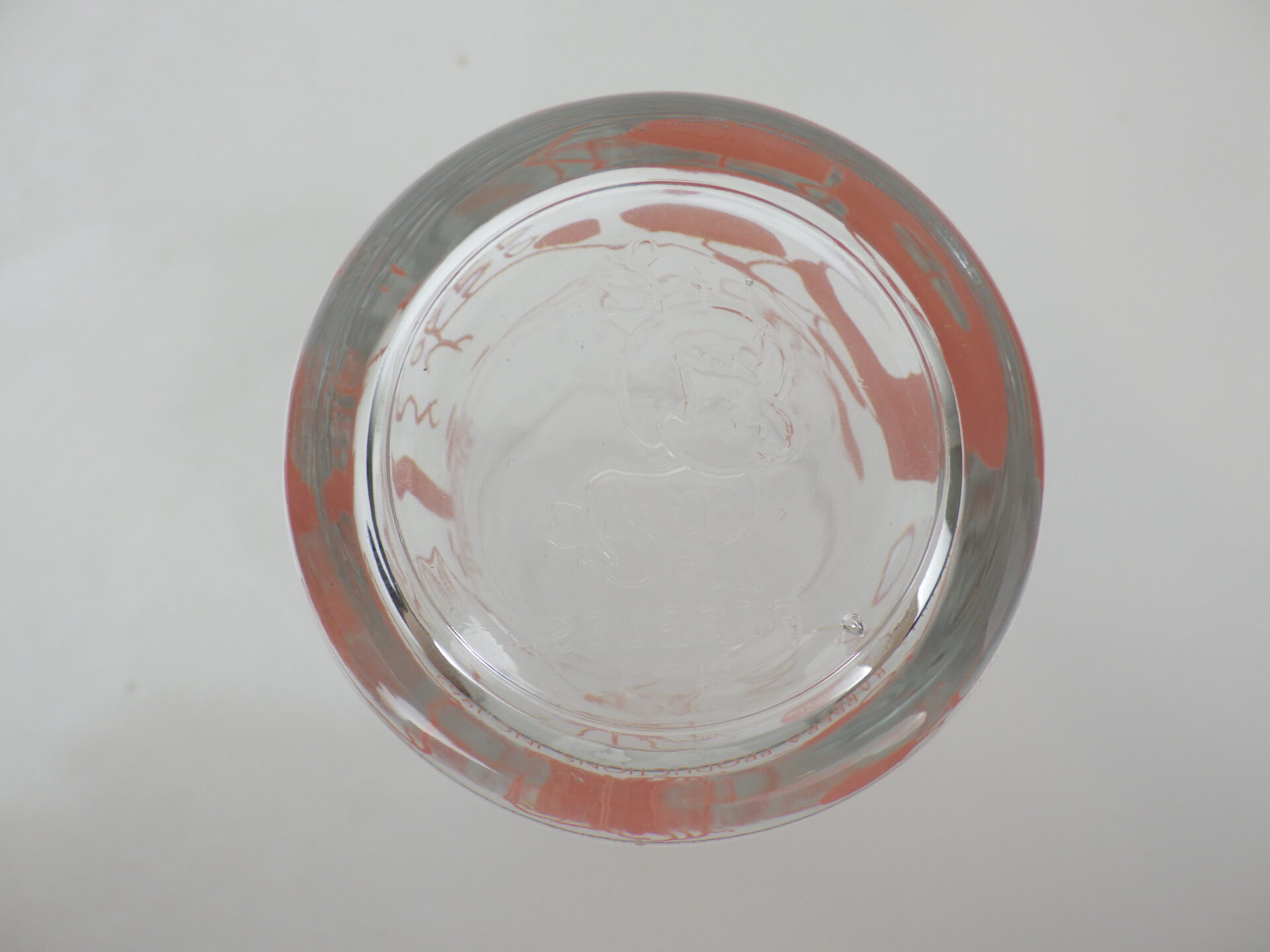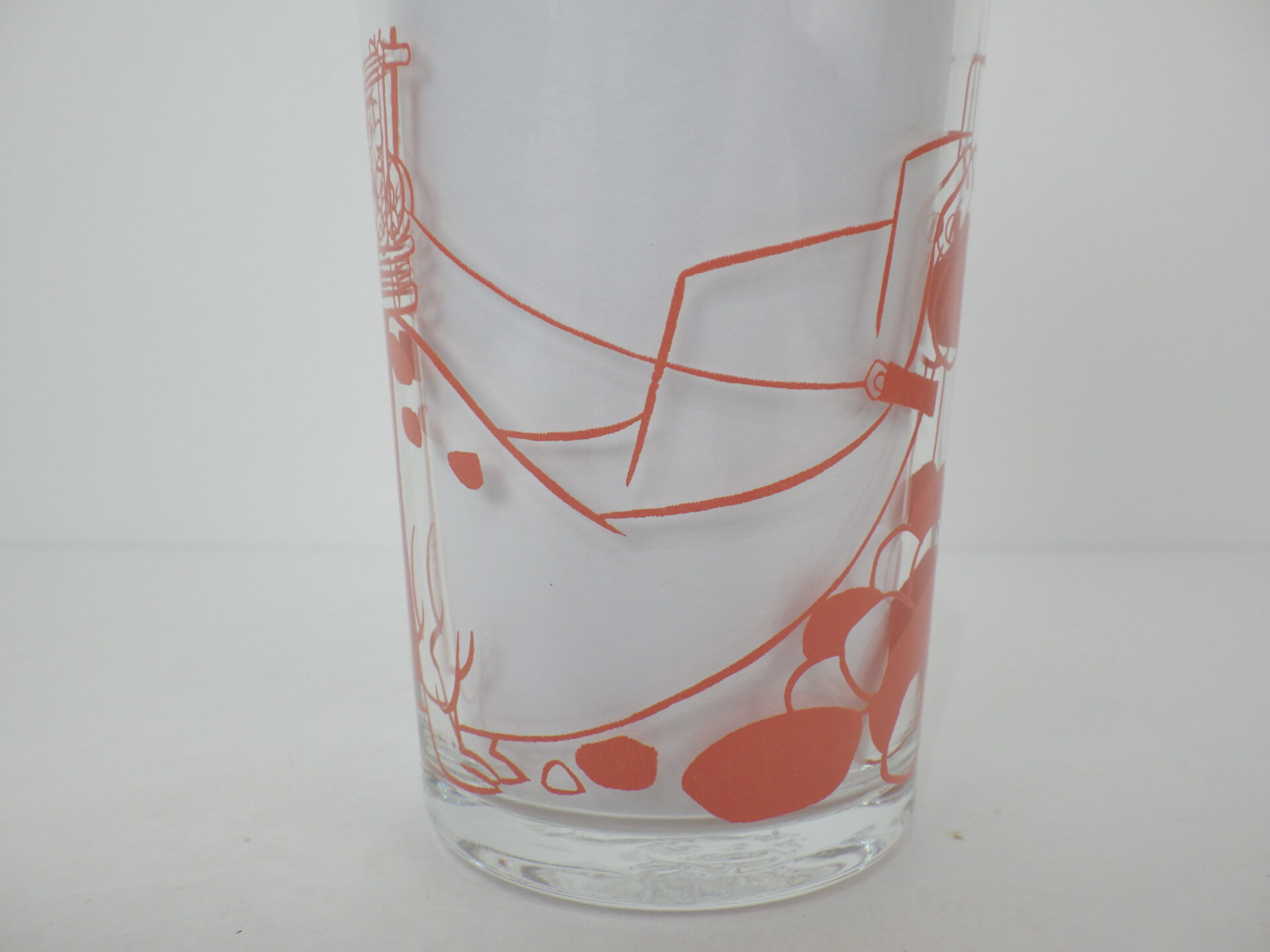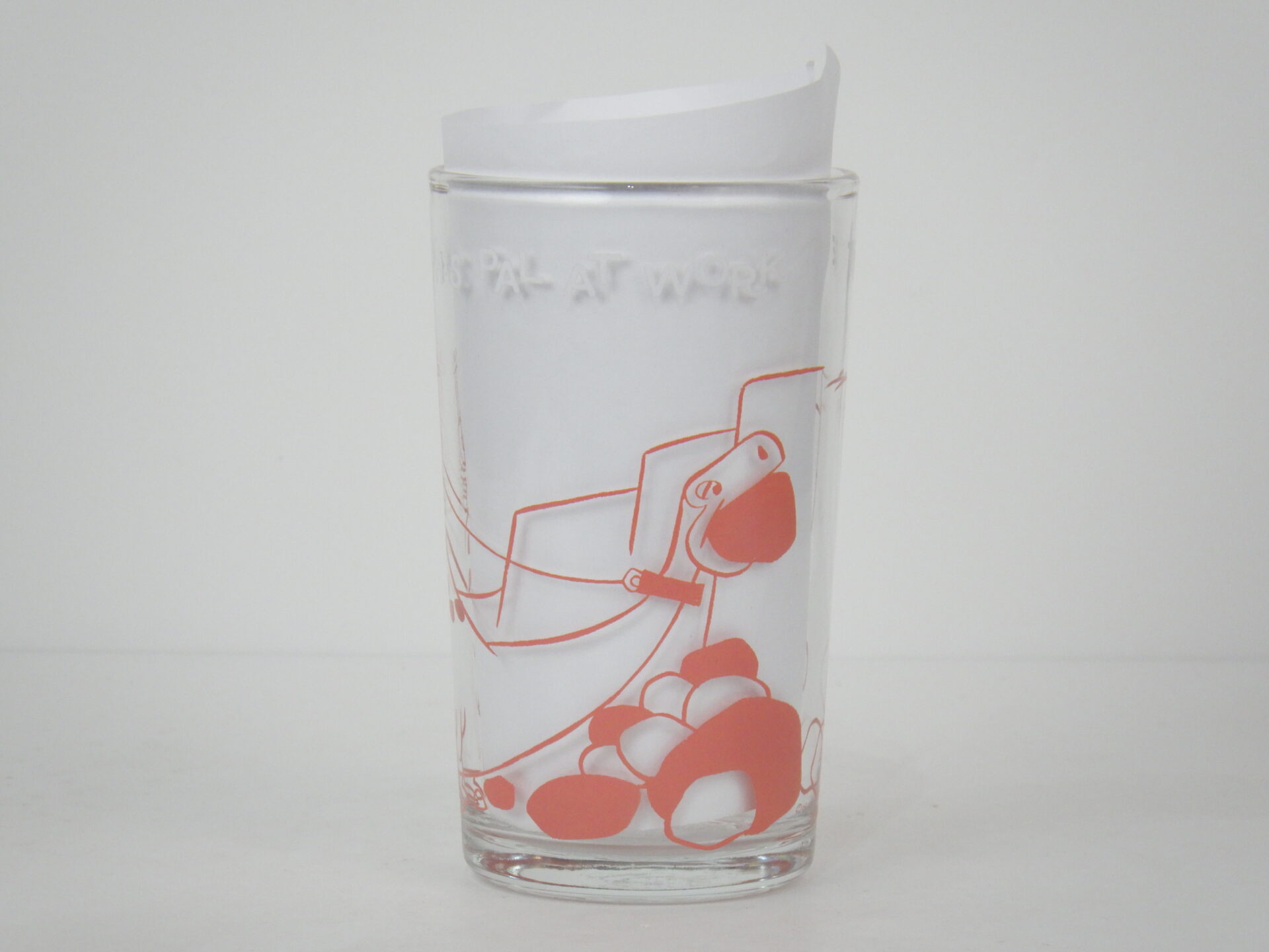 | 「トムとジェリー」でお馴染みの「ハンナ・バーベラ・プロダクション」の「フリントストーン」のビンテージグラスです。 元は、グレープジュースでお馴染みのウェルチのジャムが入っていました。 こちらは「FRED AND HIS PAL AT WORK」のタイトルで、その様子がプリントされています。 ボトム面のキャラクターエンボスは、クッキーの型押しになっています。(フレッドの娘ペブルスのエンボスです) |