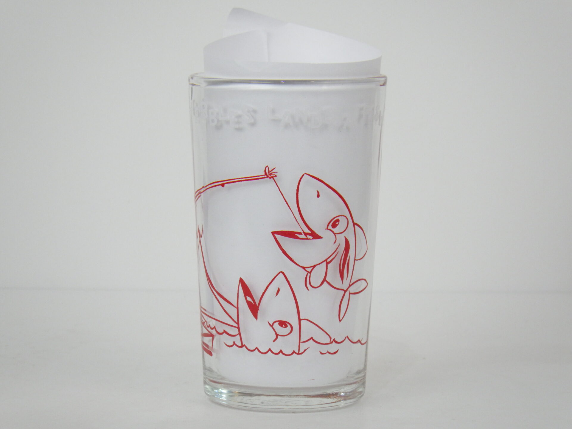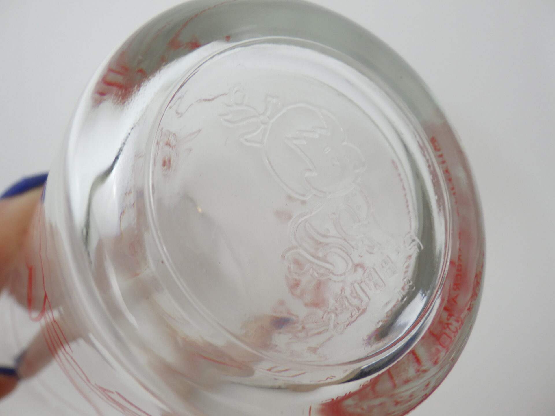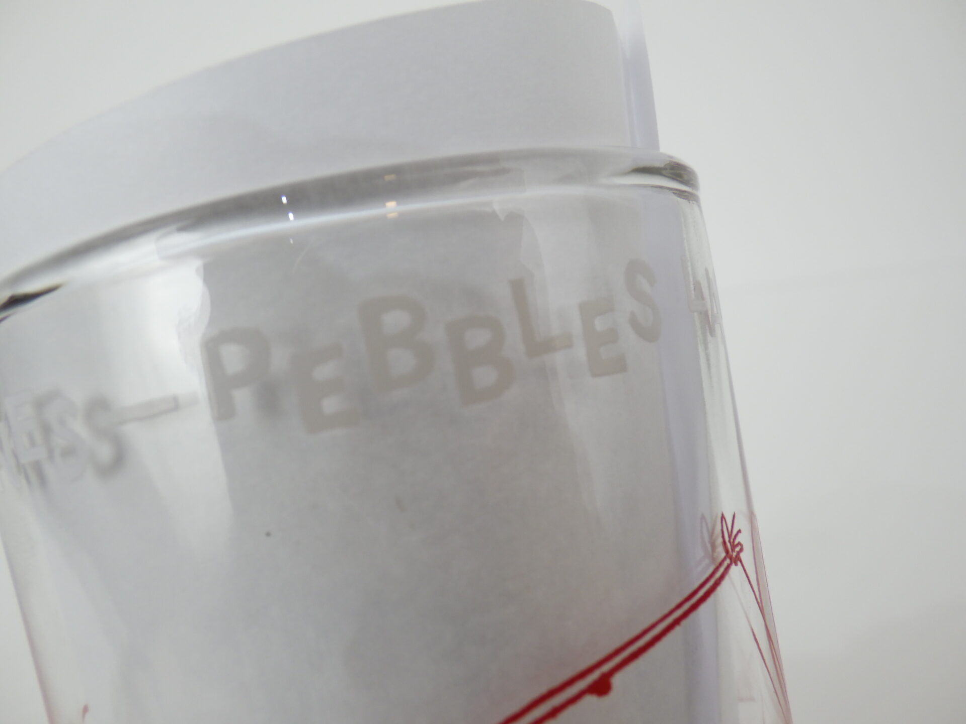 | 「トムとジェリー」でお馴染みの「ハンナ・バーベラ・プロダクション」の「フリントストーン」のビンテージグラスです。 元は、グレープジュースでお馴染みのウェルチのジャムが入っていました。 こちらは「PEBBLES LANDS A FISH」のタイトルで、その様子がプリントされています。 ボトム面のキャラクターエンボスは、クッキーの型押しになっています。(フレッドの娘ペブルスのエンボスです) |
