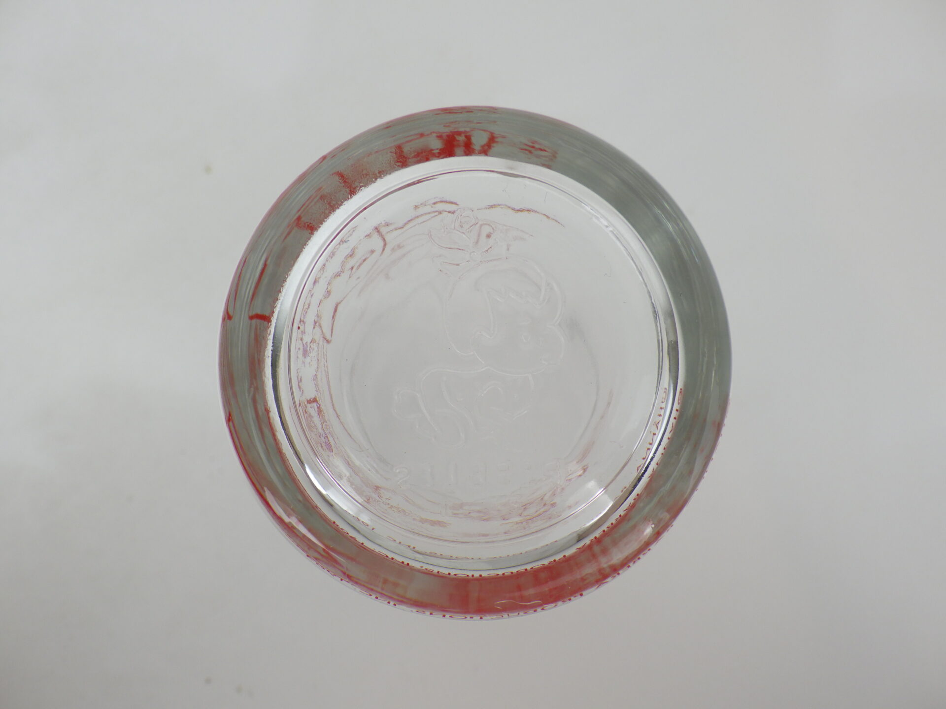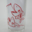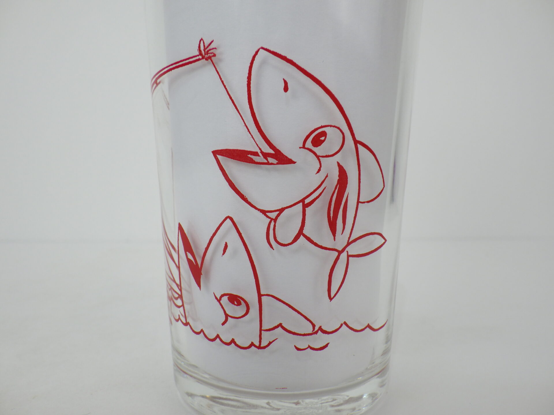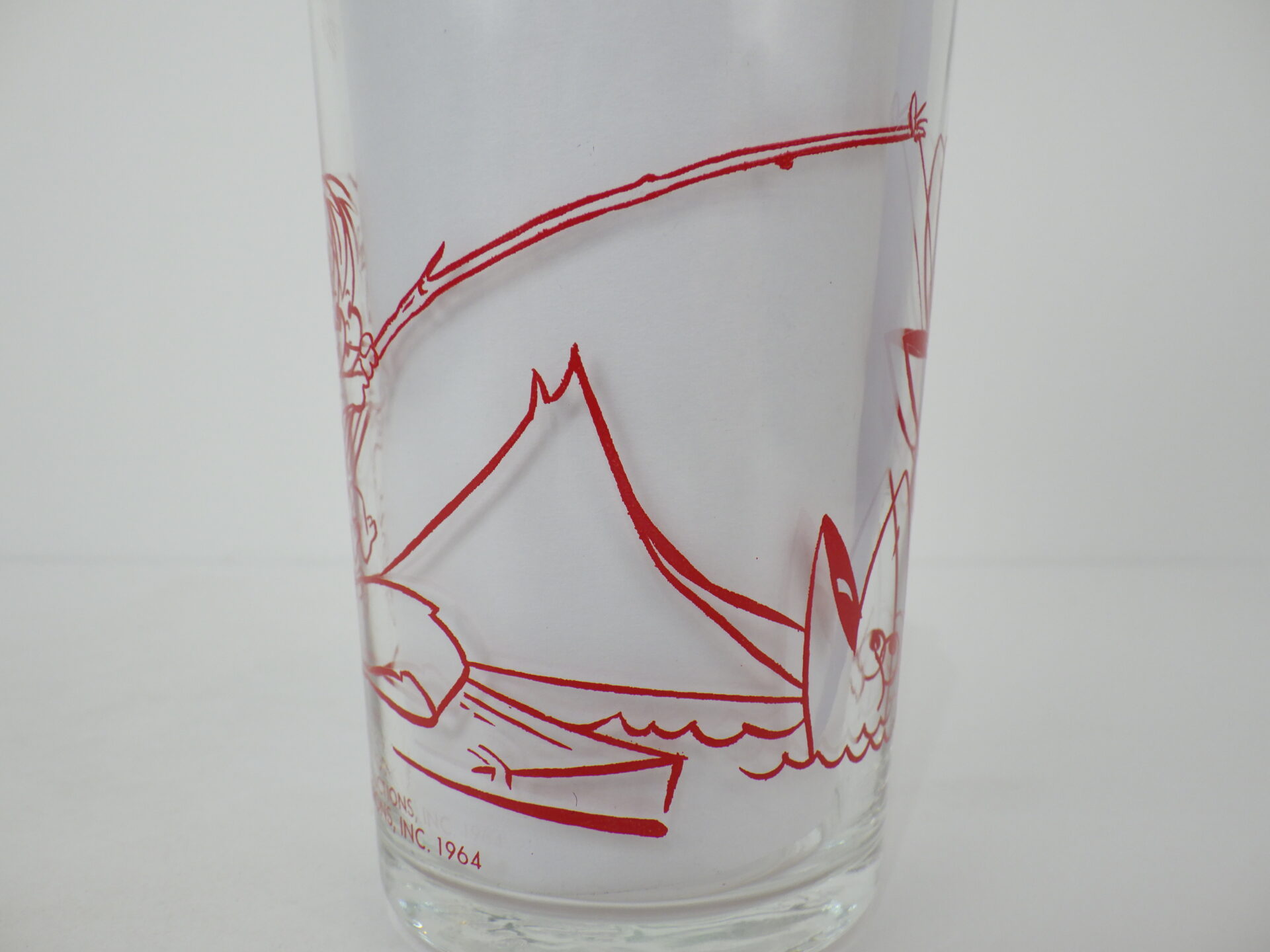 | 「トムとジェリー」でお馴染みの「ハンナ・バーベラ・プロダクション」の「フリントストーン」のビンテージグラスです。 元は、グレープジュースでお馴染みのウェルチのジャムが入っていました。 こちらは「PEBBLES LANDS A FISH」のタイトルで、その様子がプリントされています。 ボトム面のキャラクターエンボスは、クッキーの型押しになっています。(フレッドの娘ペブルスのエンボスです) |