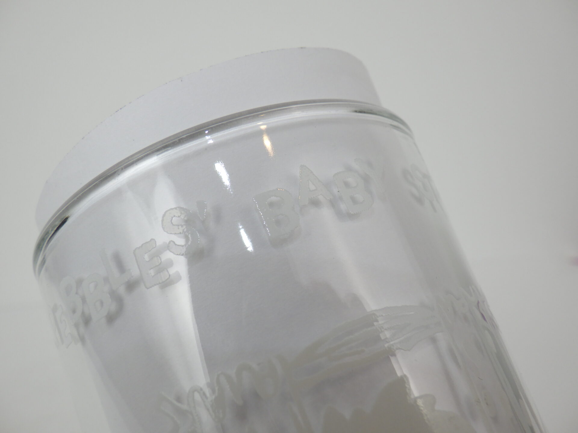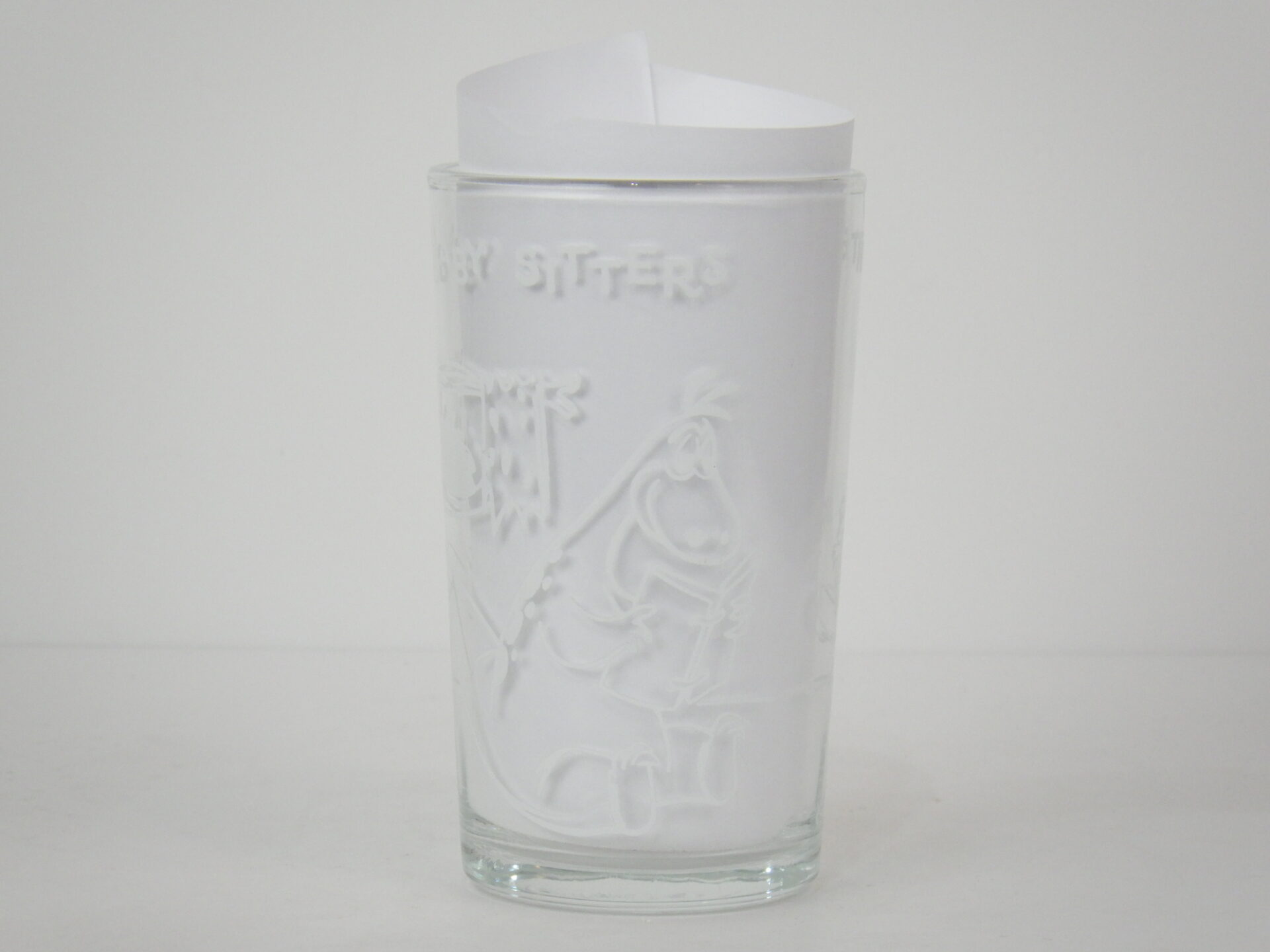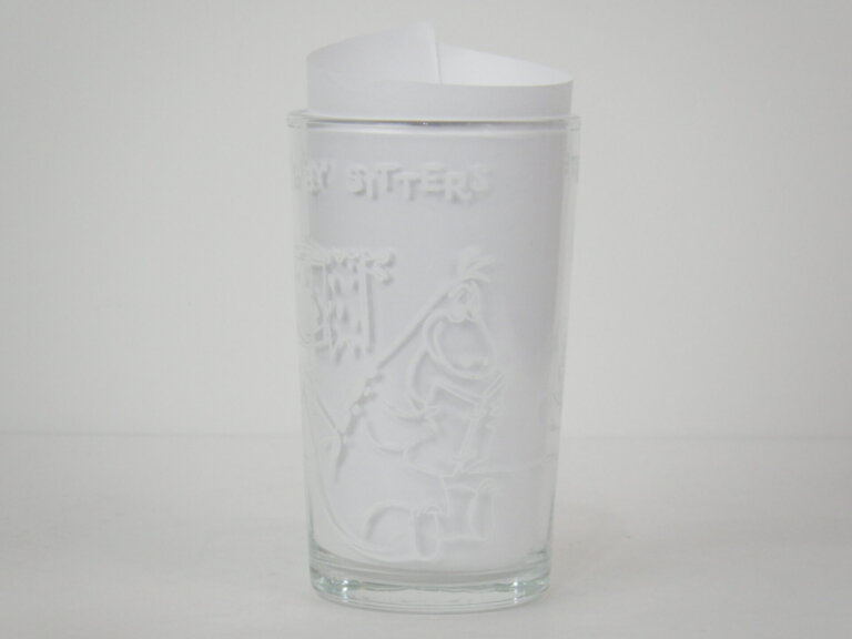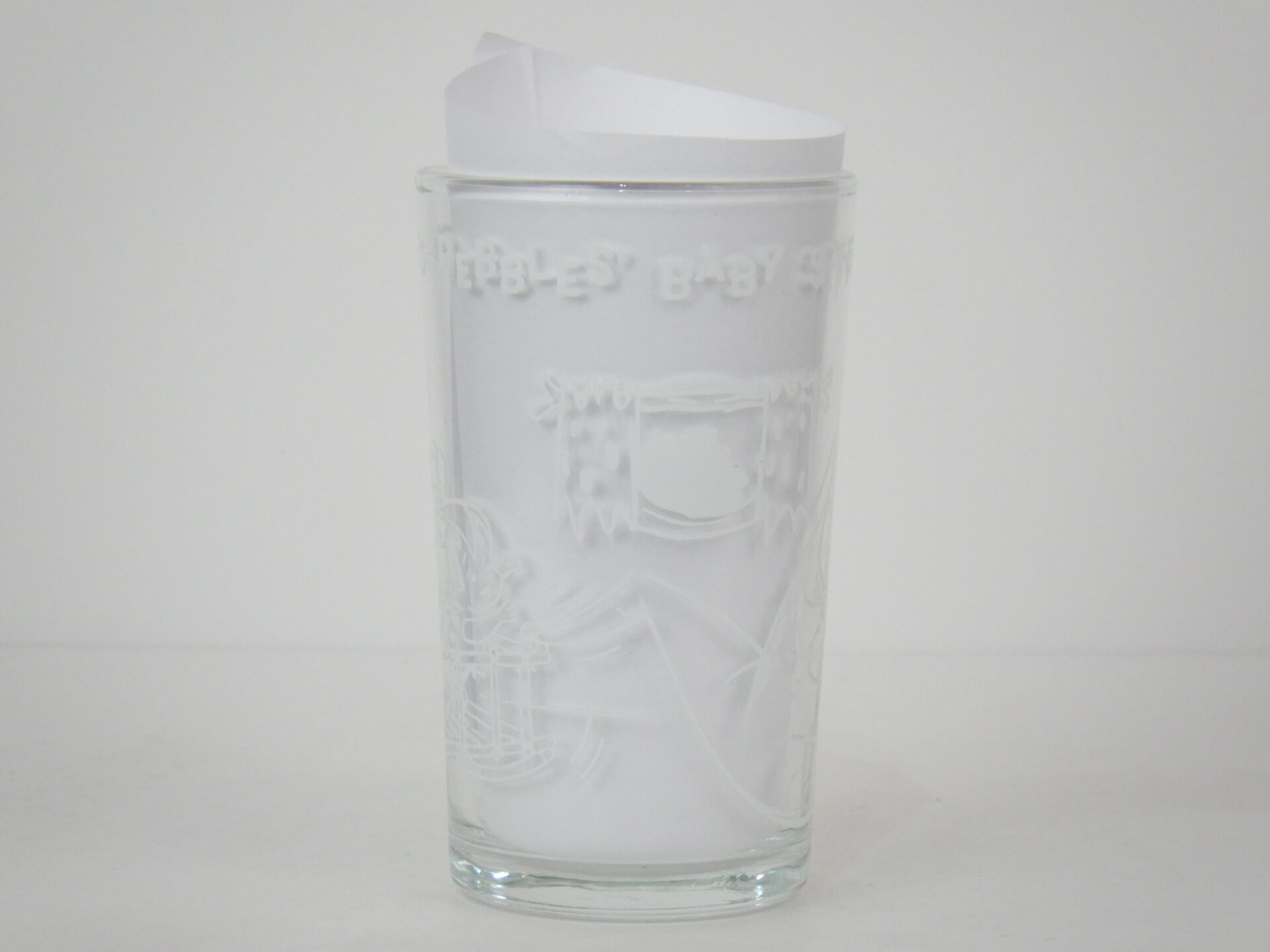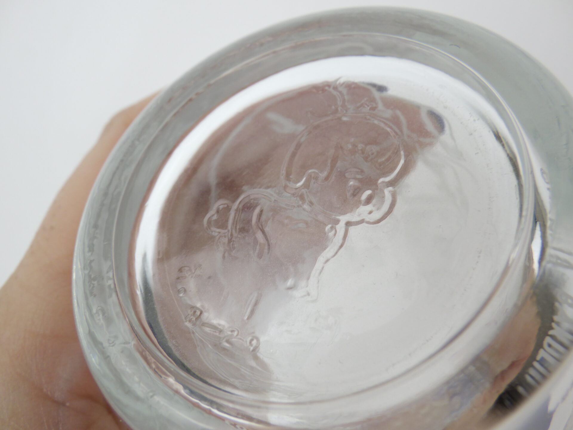 | 「トムとジェリー」でお馴染みの「ハンナ・バーベラ・プロダクション」の「フリントストーン」のビンテージグラスです。 元は、グレープジュースでお馴染みのウェルチのジャムが入っていました。 こちらは「PEBBLES’ BABY SITTERS」のタイトルで、その様子がプリントされています。 ボトム面のキャラクターエンボスは、クッキーの型押しになっています。(フレッドの娘ペブルスのエンボスです) |