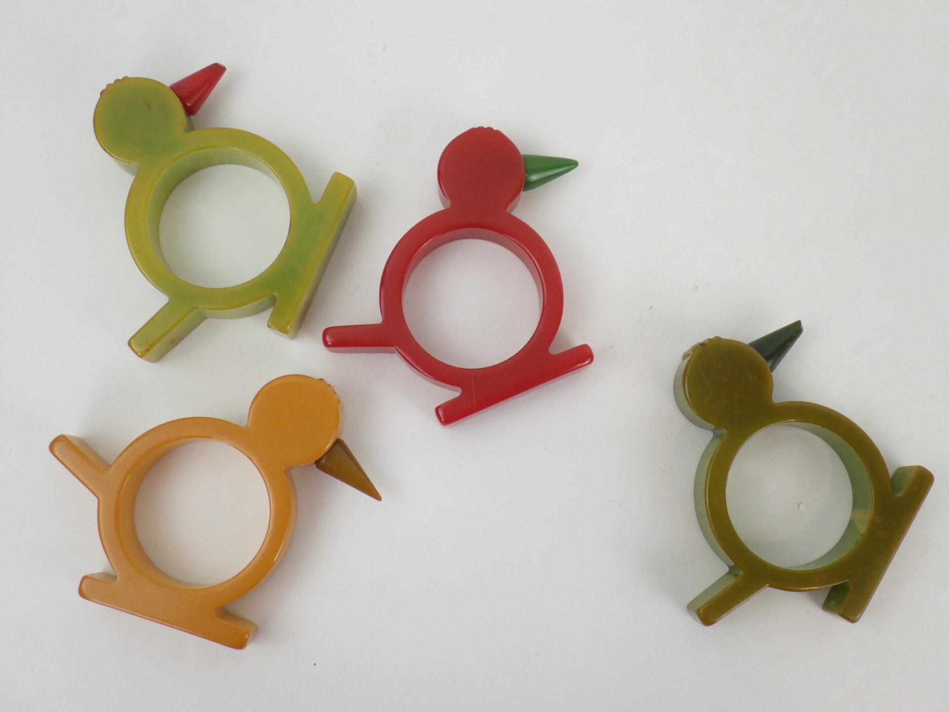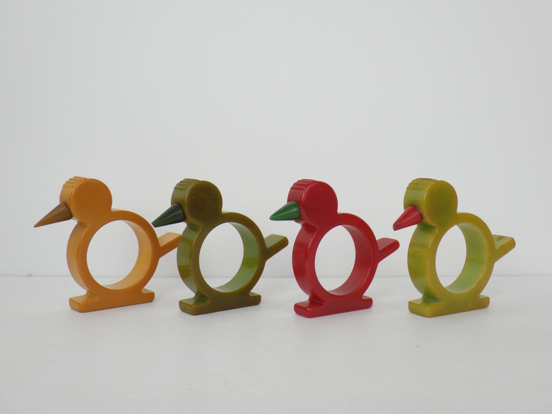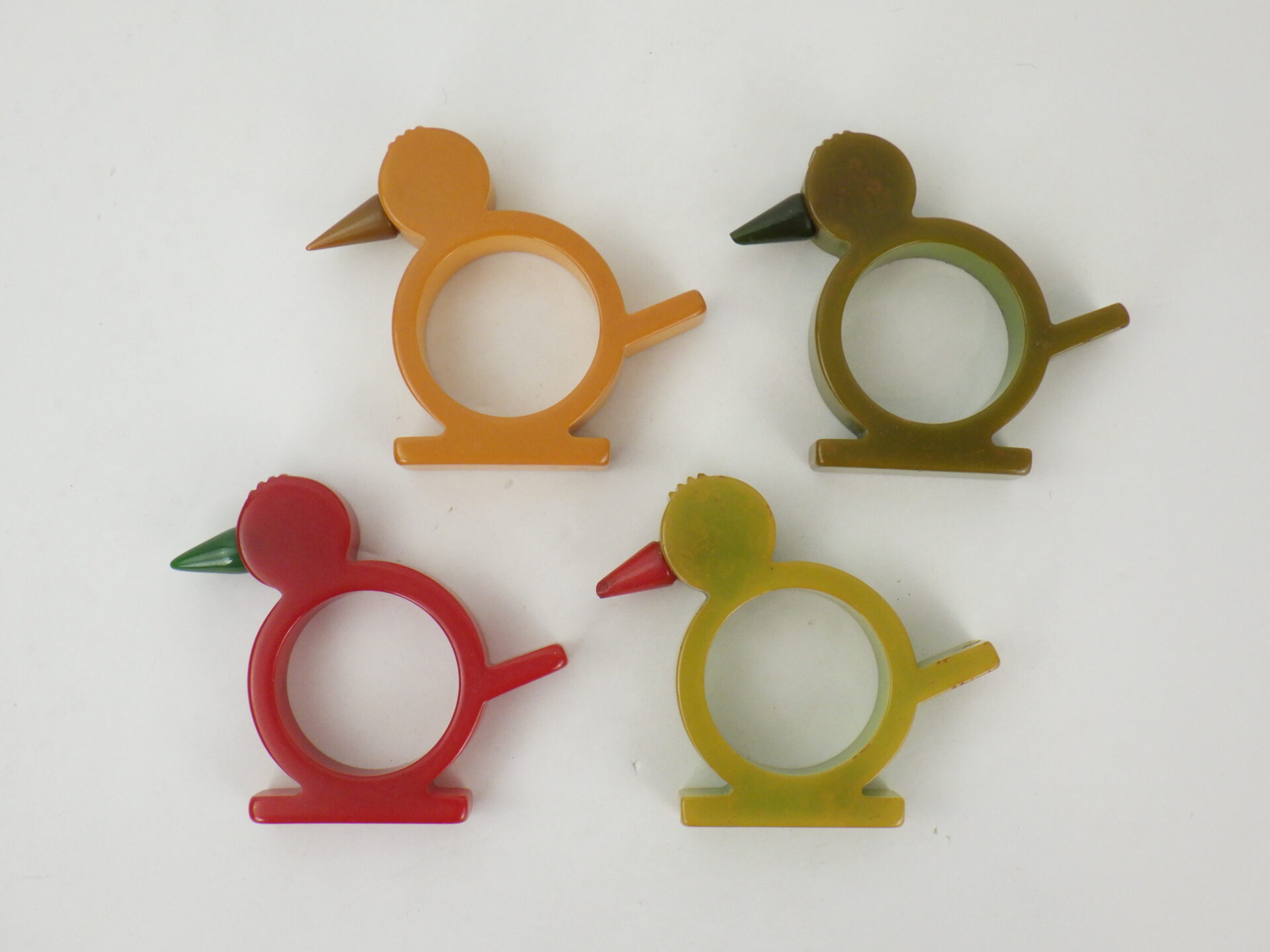 | アメリカで買い付けました。 ベークライトのナプキンリングです。 (こちらは深緑のみの販売ページです) ベークライトは1900年代初頭に開発された、最初期のプラスチックの一種です。 現在のプラスチックとは質感が異なり、また経年によって風合いが変わっていく姿が何とも言えず魅力的で、近年ではコレクターズアイテムとして高額で取引されるようになっています。 こちらは鳥モチーフのナプキンリングです。 自立するのでオブジェとして飾っても可愛いかと。 色違いやモチーフ違いもあるので、是非集めてみて下さい。 |