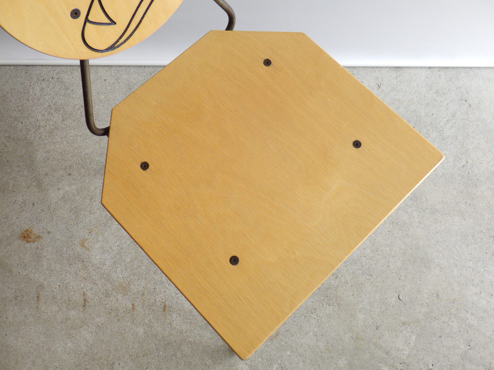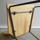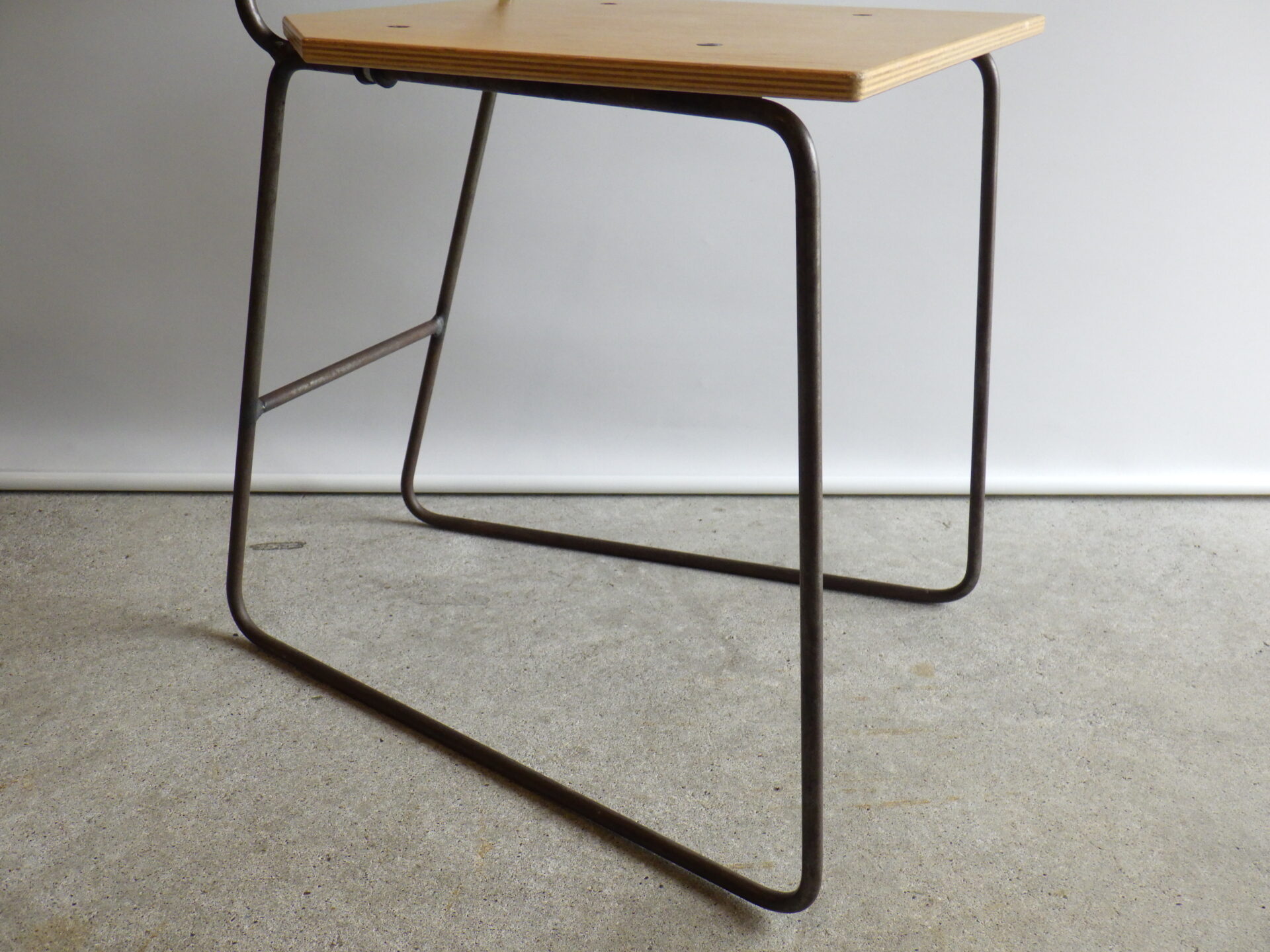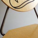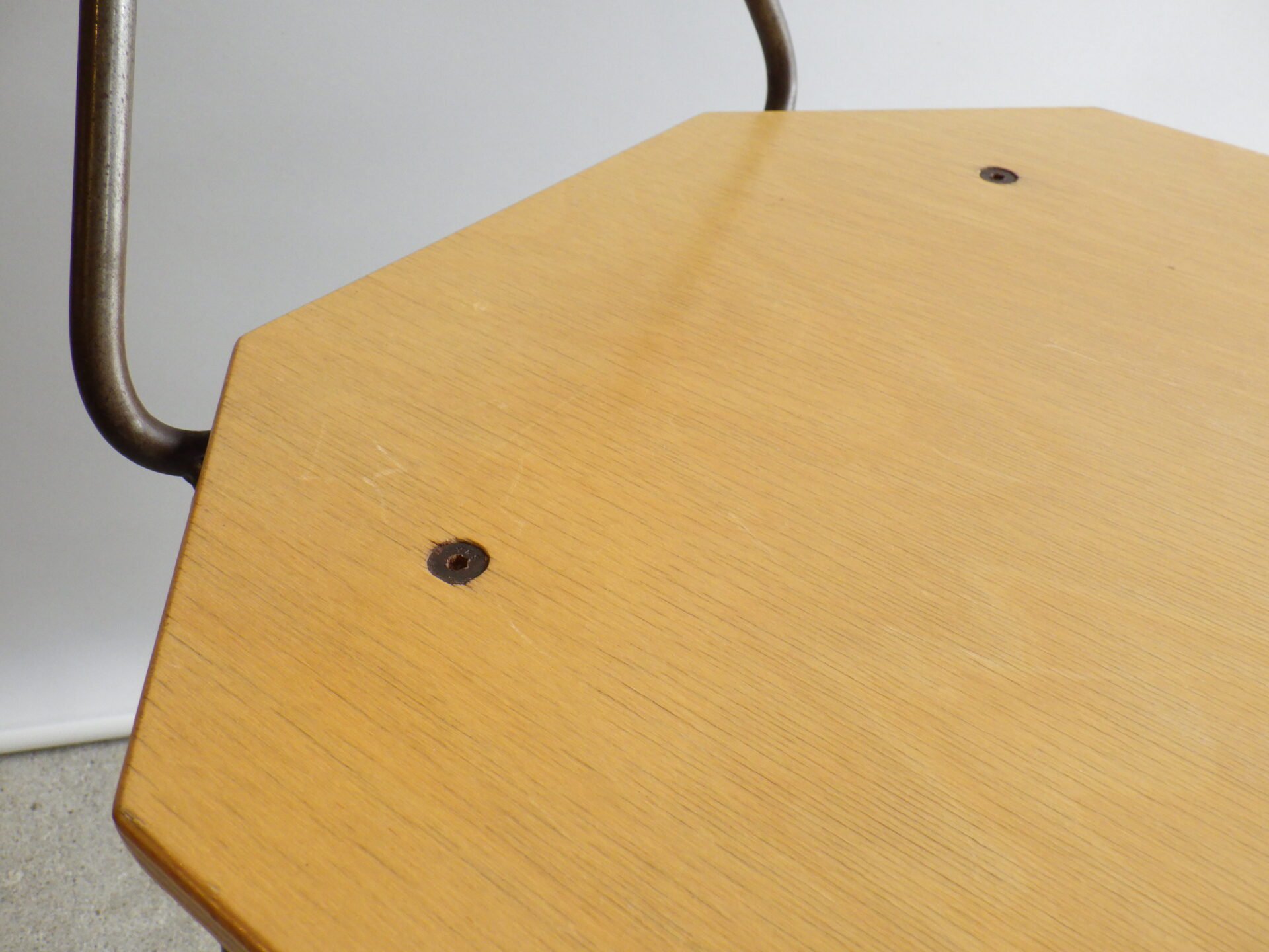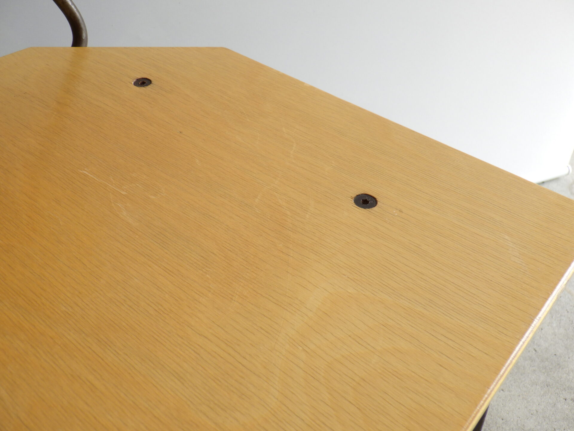 背もたれのエンボスや持ち手があることから、元は飲食店などで使用されていたと推測されますが、詳細は不明。
