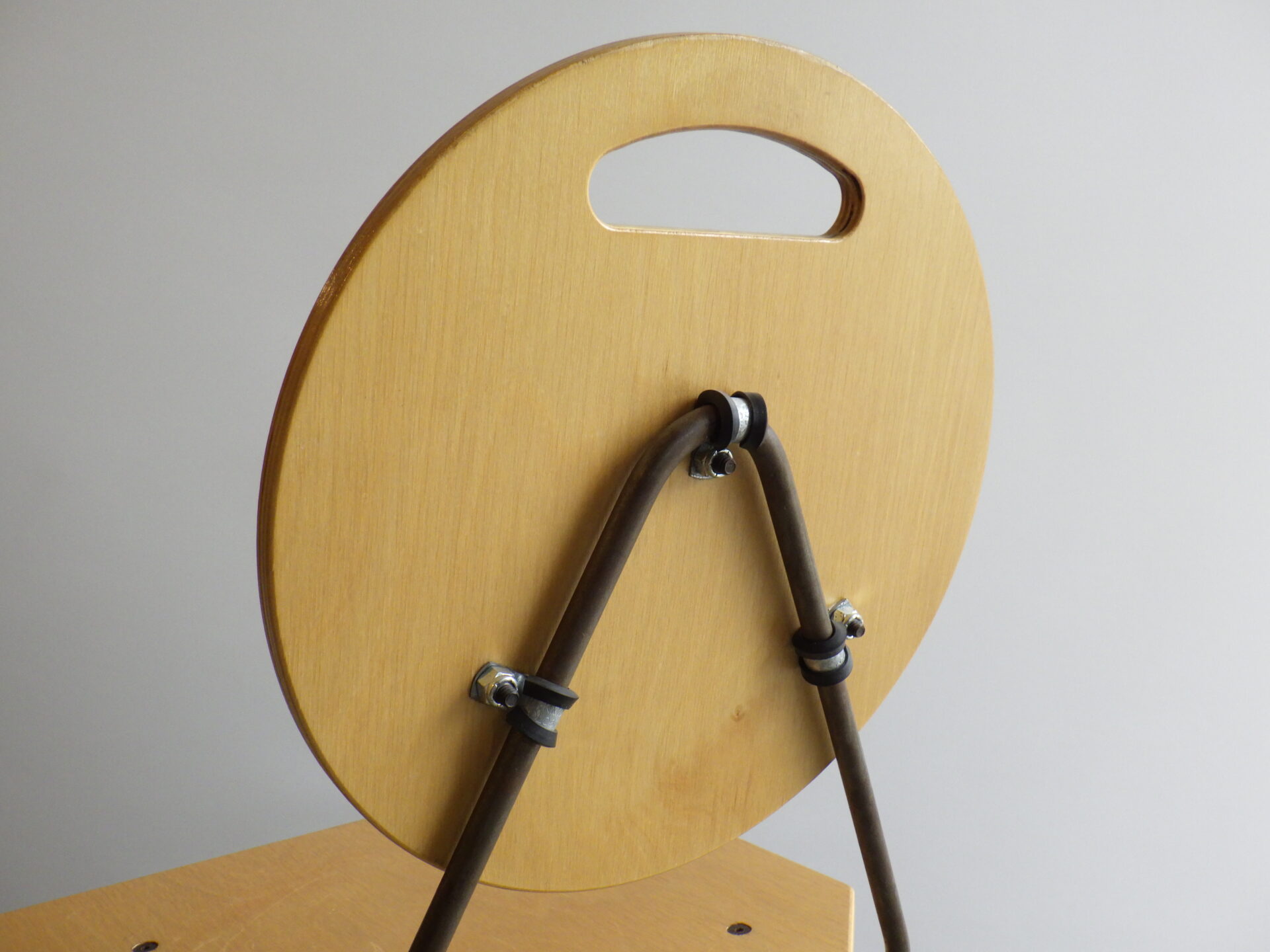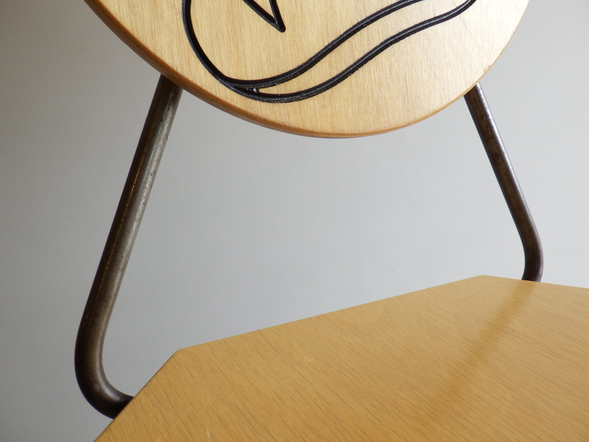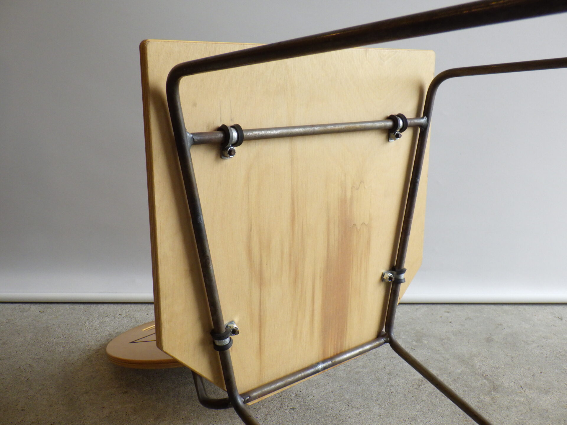 背もたれのエンボスや持ち手があることから、元は飲食店などで使用されていたと推測されますが、詳細は不明。