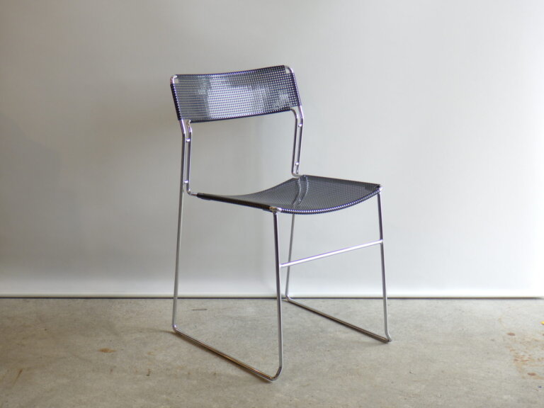 | ヨーロッパで買い付けました。 1969年創業、イタリアのArrben社製、ダイニングチェアです。 クロームメッキの細身のフレーム、ブラックメッシュの座面と背もたれが、スタイリッシュでモダンな印象を与えてくれます。 ご自宅でダイニングチェアとしてのご使用の他、ワークスペースなどに置いたり、店舗什器としてお使いいただくのも良さそう。 また、スタッキング出来るため、二脚以上揃えてのご購入もおすすめです。 |
