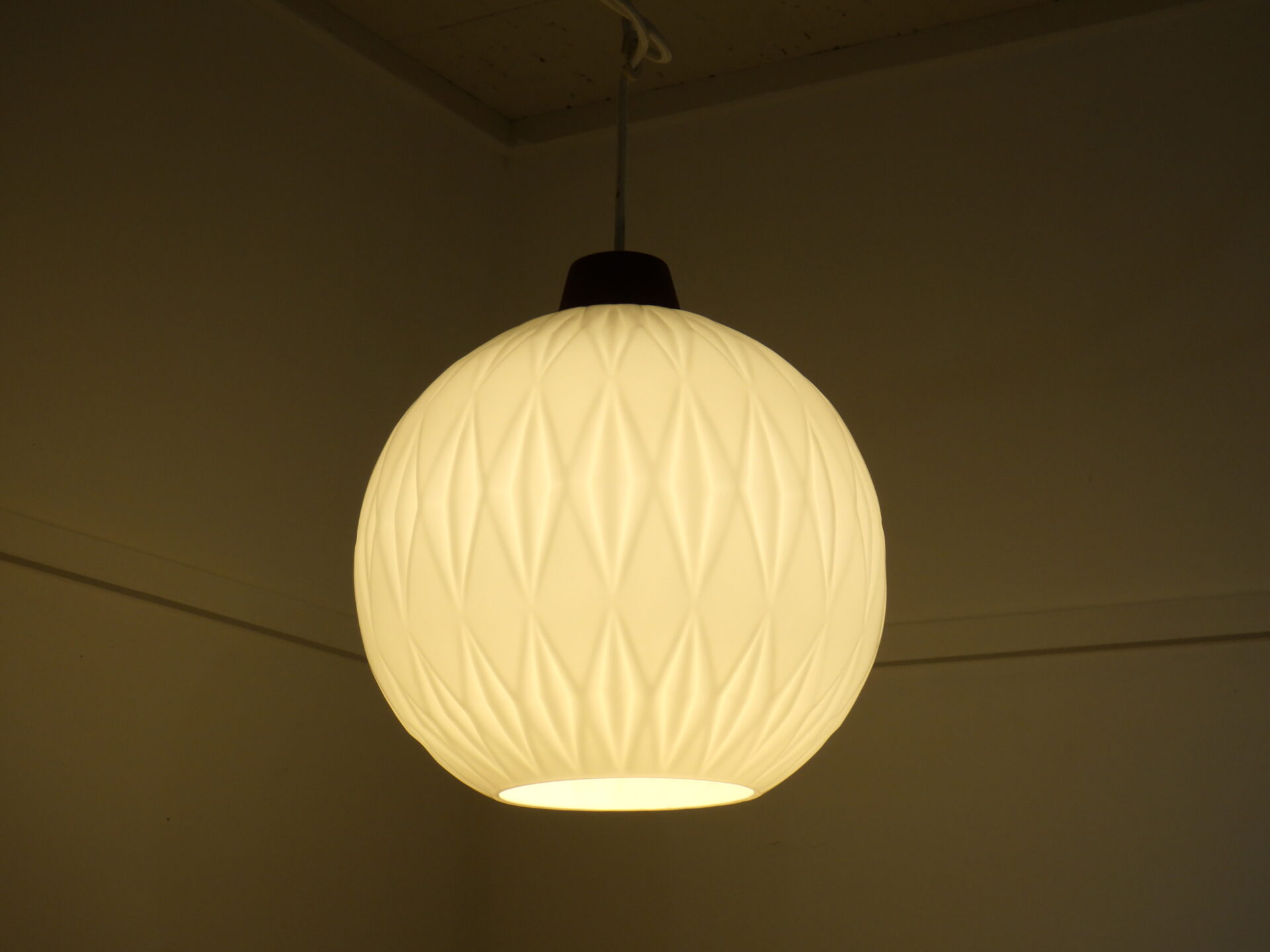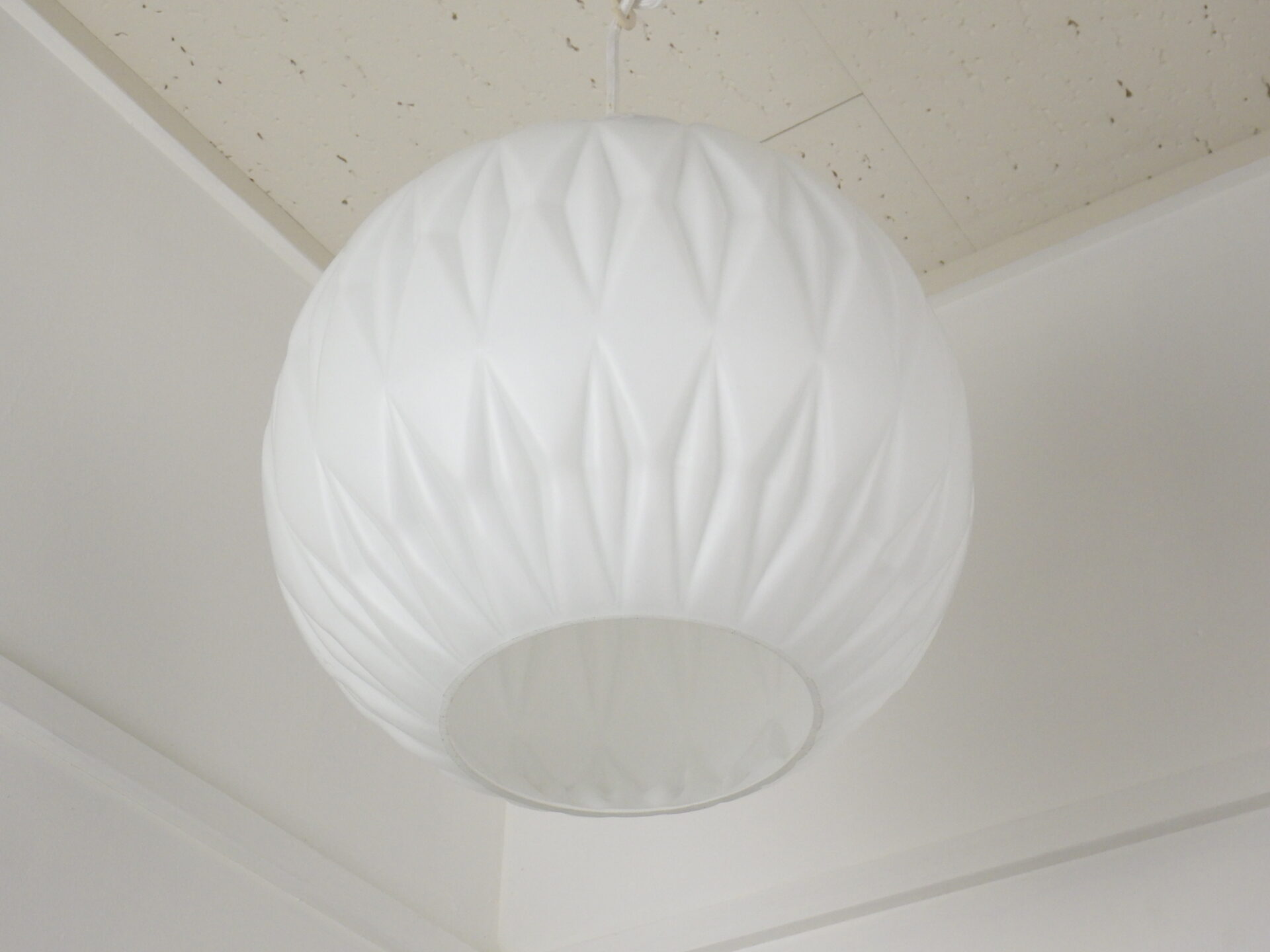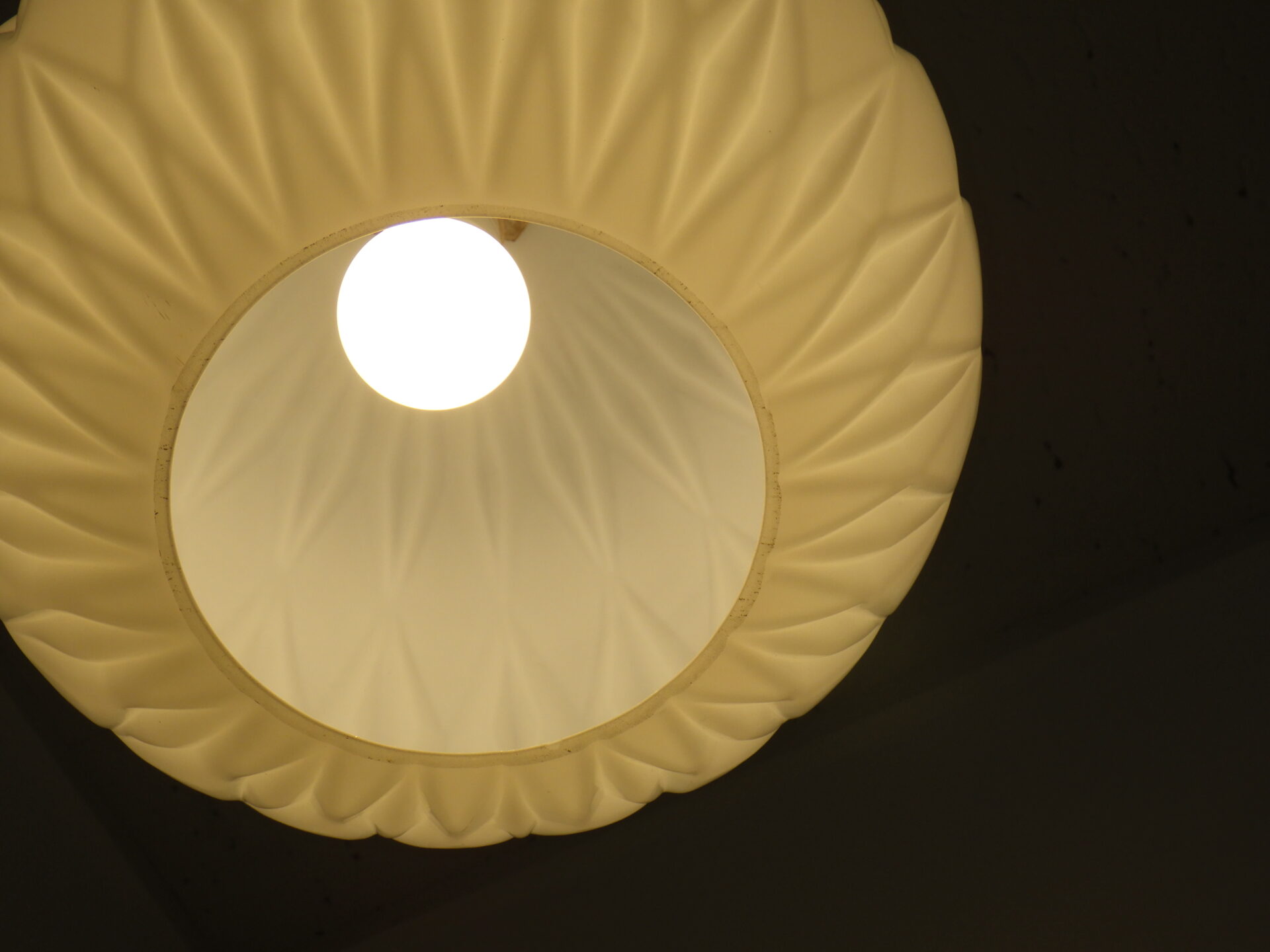 | アメリカで買い付けました。 ビンテージのガラスシェードペンダントランプです。 まん丸のガラスシェードには切子のようなエンボスが入っており、灯りをつけた時に美しい濃淡が生まれます。 また、フロストガラスなので、温かく柔らかな光が広がるため、目にも優しいです。 ミッドセンチュリー、北欧モダンや和モダン、ジャパンディスタイルなど、様々なスタイルに合わせてご使用いただけるアイテムですね。 |