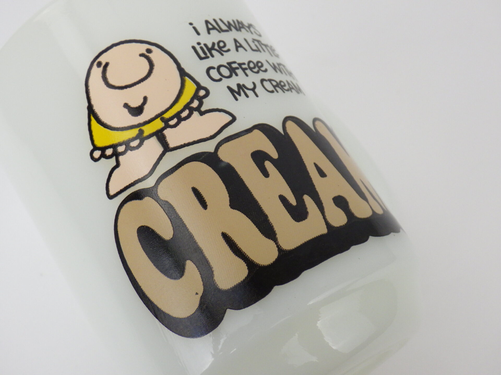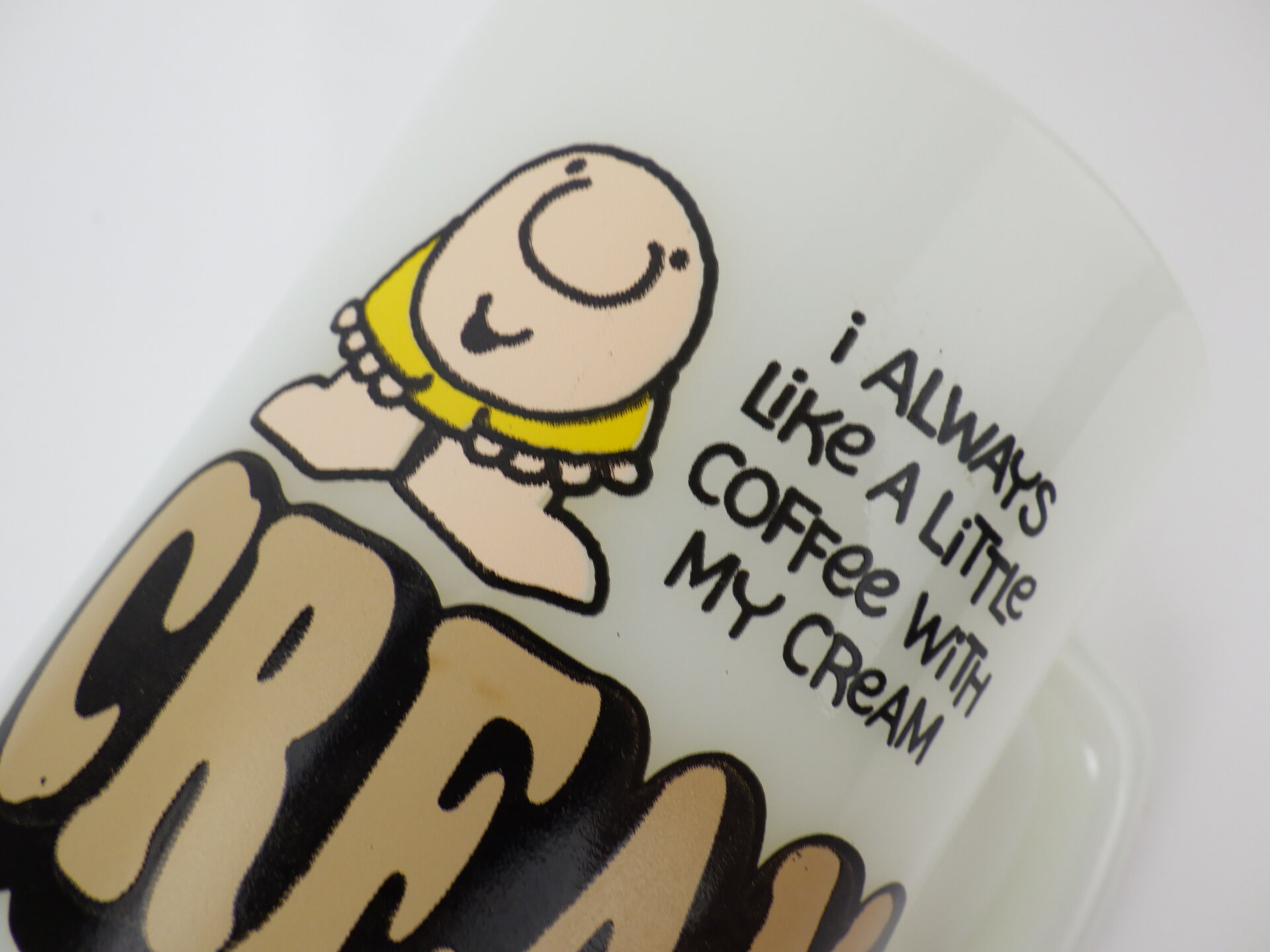 | アメリカで買い付けました。 1970年代に流行した、トム・ウィルソン作のアメリカの漫画のキャラクター「Ziggy」のマグです。 ファイヤーキングからは1979年に製造されました。 こちらのクリームの他に、ブラック、シュガー、クリーム&シュガーの全四種類があります。 お好みに合わせて選ぶのも良し、全部揃えるのも良しな可愛いマグです。 |