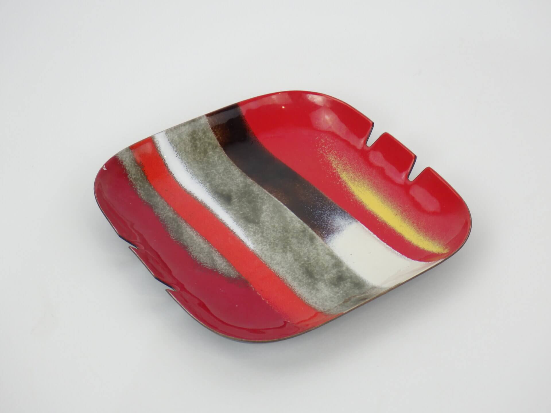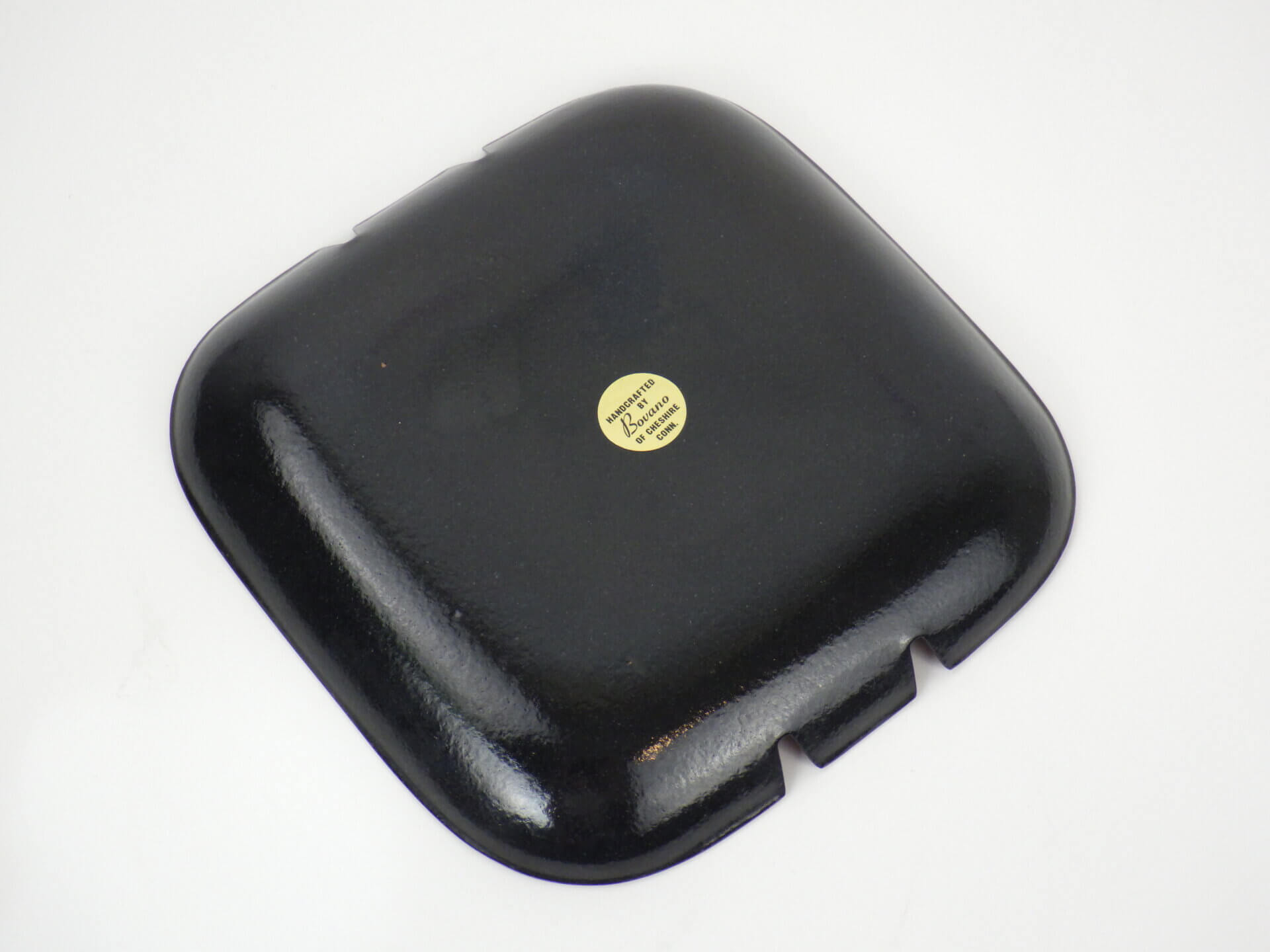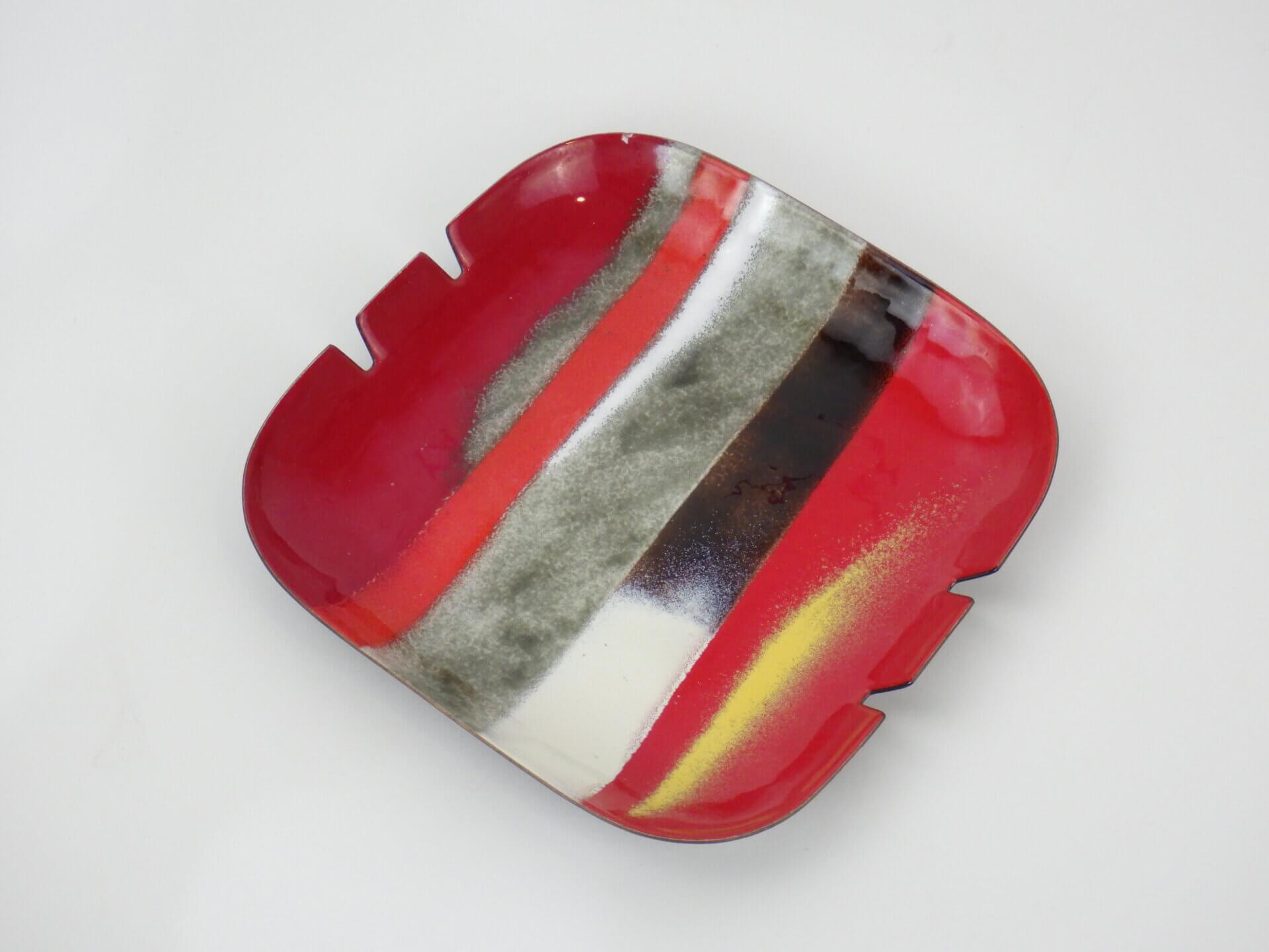 | アメリカで買い付けました。 Bovano of Cheshire社製、ビンテージのエナメル灰皿です。 1952年、芸術家Jim Bowerによって創業され、粉末ガラスを銅に焼き付けるという独自のエナメリング技法を用いて一点一点ハンドクラフトで丁寧に仕上げられた作品を多く生み出しています。 こちらの灰皿もエナメル独自の光沢と色彩が美しく、アート作品の一つとして空間のアクセントにいかがですか? また、灰皿としてはもちろん、アクセサリーや小物入れとしてご使用いただくのもおすすめです。 |