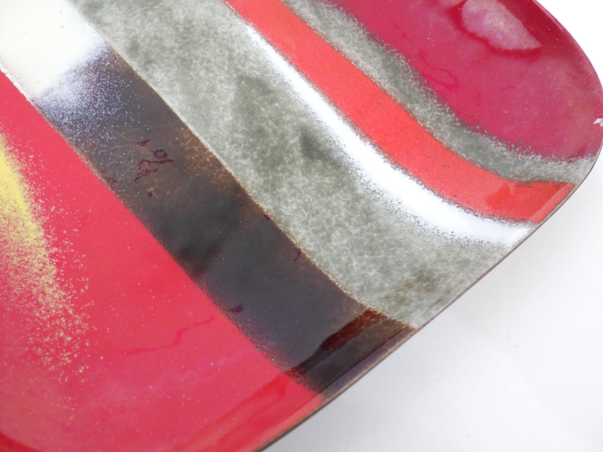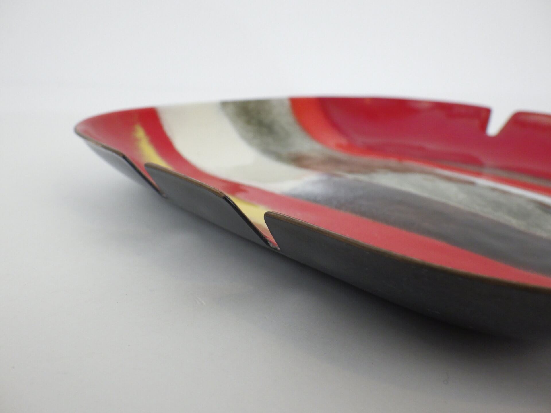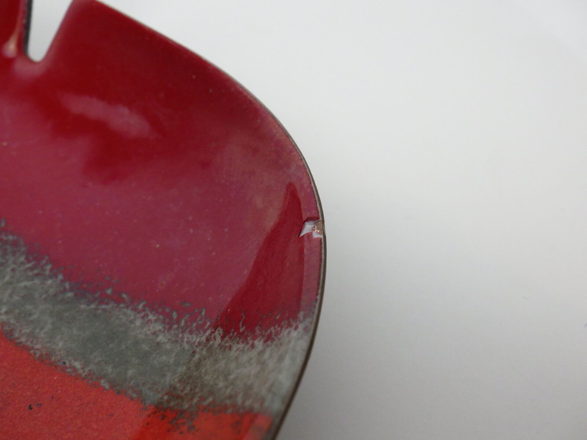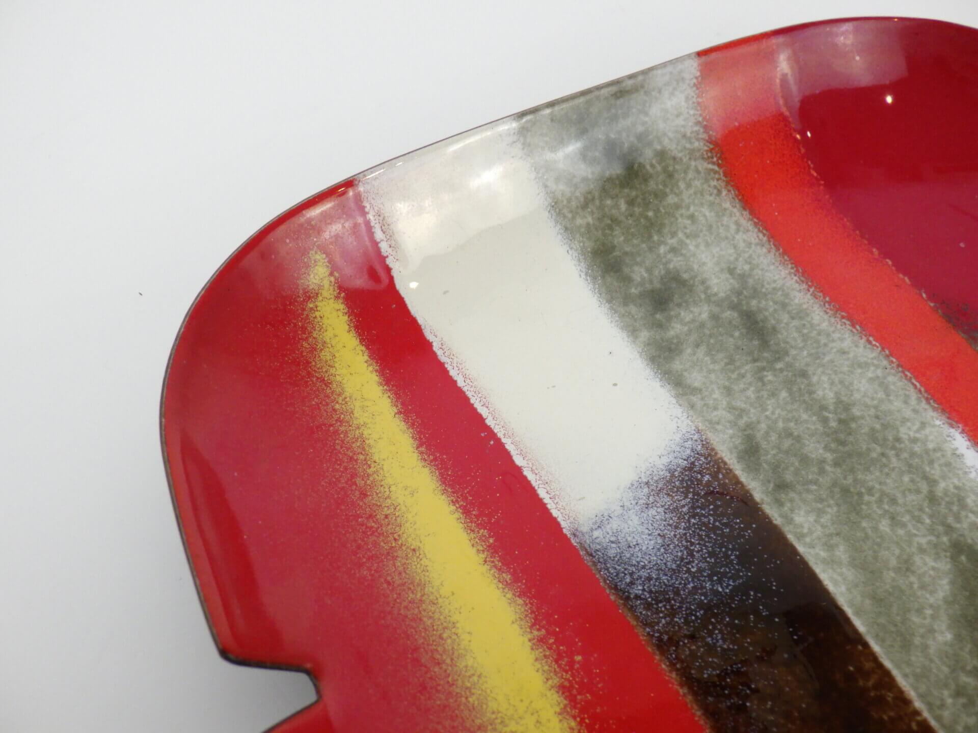 | アメリカで買い付けました。 Bovano of Cheshire社製、ビンテージのエナメル灰皿です。 1952年、芸術家Jim Bowerによって創業され、粉末ガラスを銅に焼き付けるという独自のエナメリング技法を用いて一点一点ハンドクラフトで丁寧に仕上げられた作品を多く生み出しています。 こちらの灰皿もエナメル独自の光沢と色彩が美しく、アート作品の一つとして空間のアクセントにいかがですか? また、灰皿としてはもちろん、アクセサリーや小物入れとしてご使用いただくのもおすすめです。 |