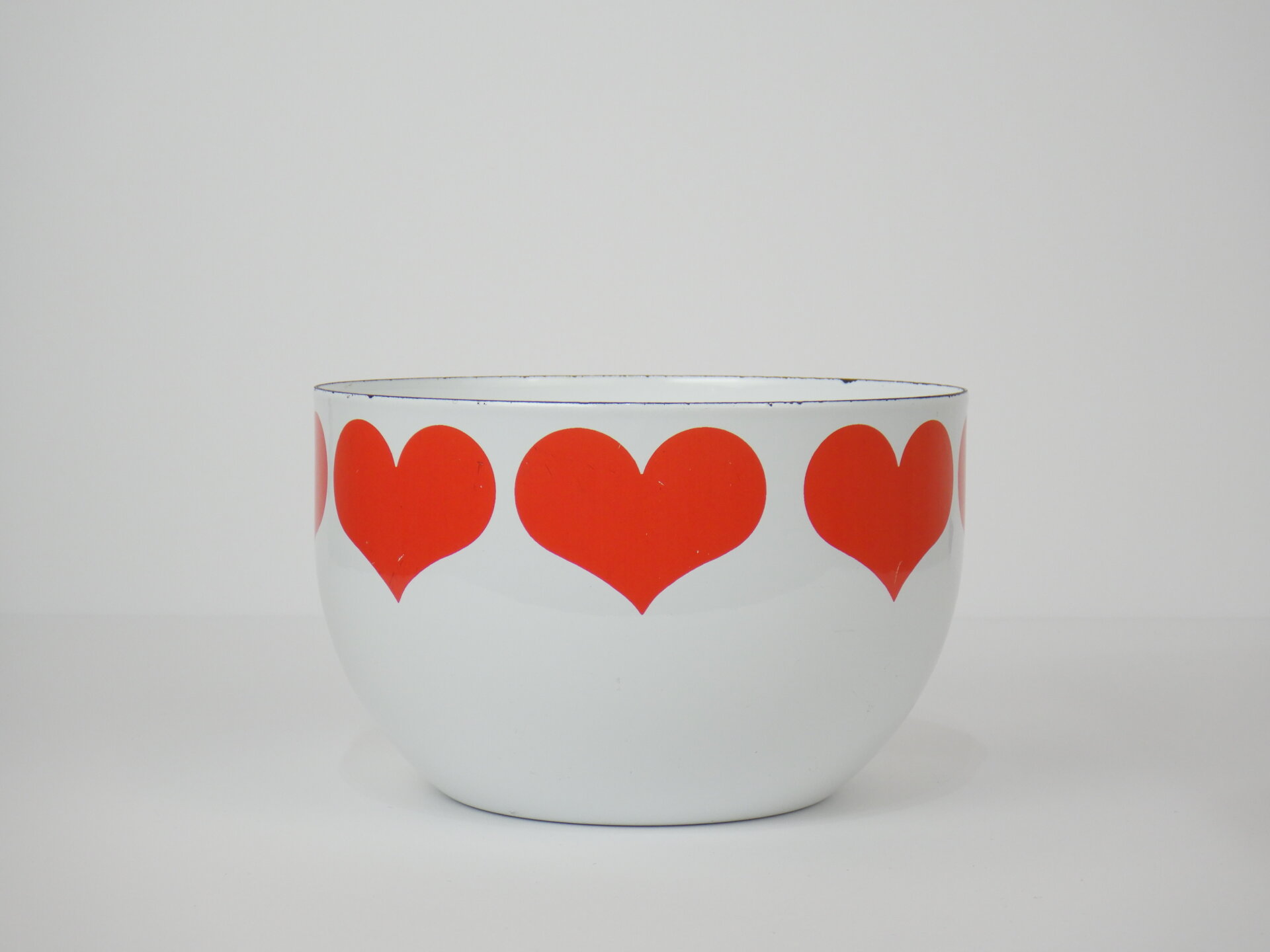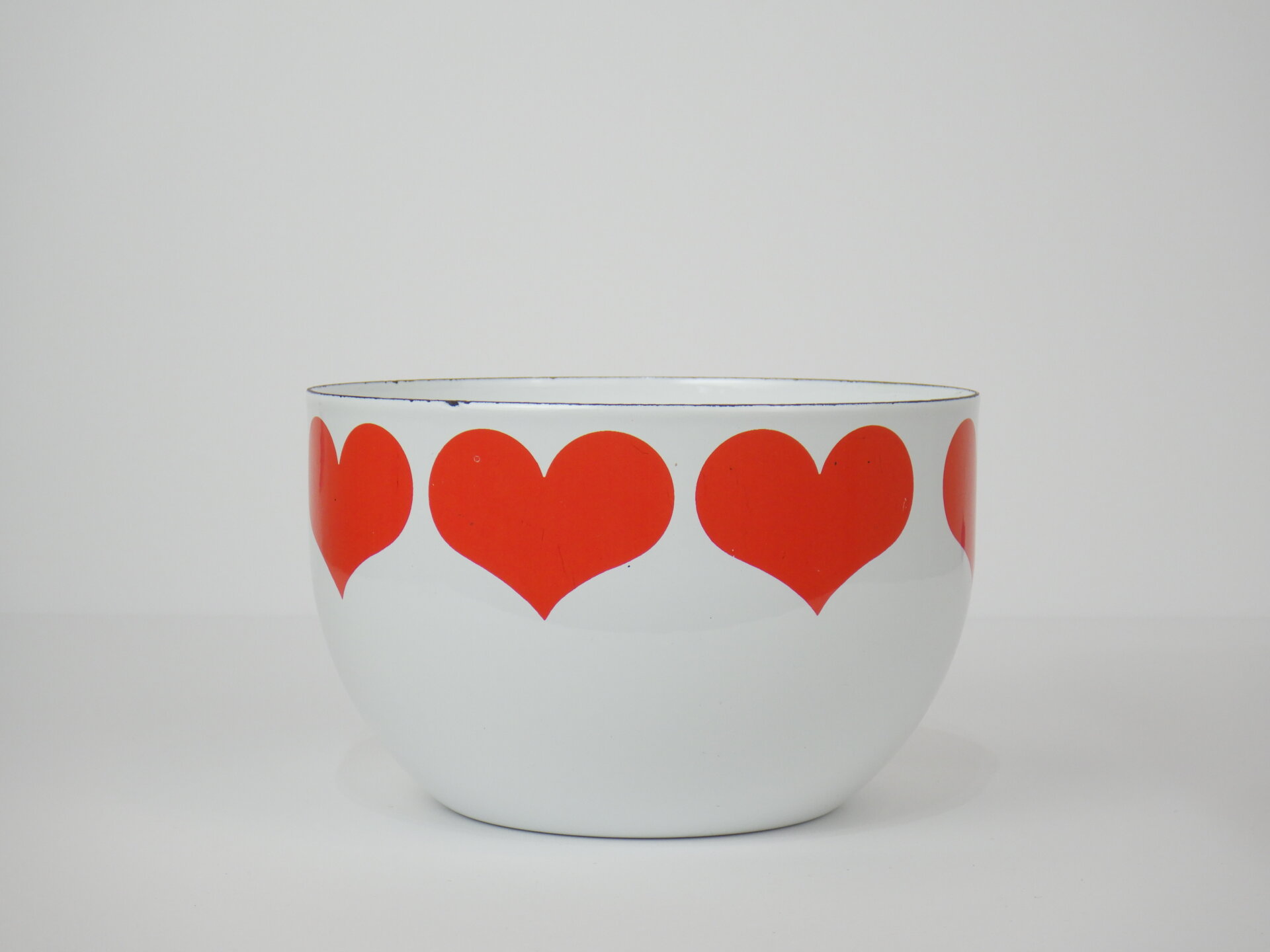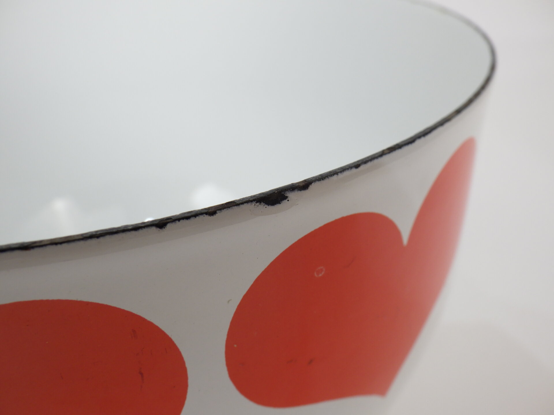 | ARABIA社のエナメル製品の部門として1950年代に誕生したFINEL。 調理器具としての耐久性や機能美に加え、インテリアとしても成立するデザイン性の高さから、北欧モダンを代表するプロダクトとして、世界的に評価を受けています。 エナメルボウルは、フィネルのアートディレクター的存在にして、「フィンランドデザインの良心」と呼ばれたKaj Franck(カイ・フランク)がフォルムデザインを担当し、様々な装飾デザイナーとコレボして生み出された名作シリーズです。 その中でも特に人気の高い、こちらのハート(Love)シリーズ。 白地に大きなハートが一周プリントされており、シンプルで大胆な北欧らしいポップなデザインですね。 フィネルのボウルは深さがしっかりあり、安定性も抜群なため、ミキシングボウルやサラダボウルとして実用するのにとても使いやすく、おすすめしています。 |
