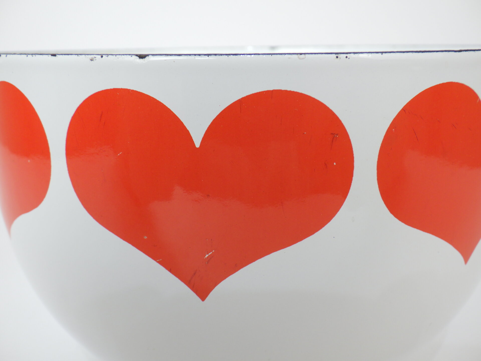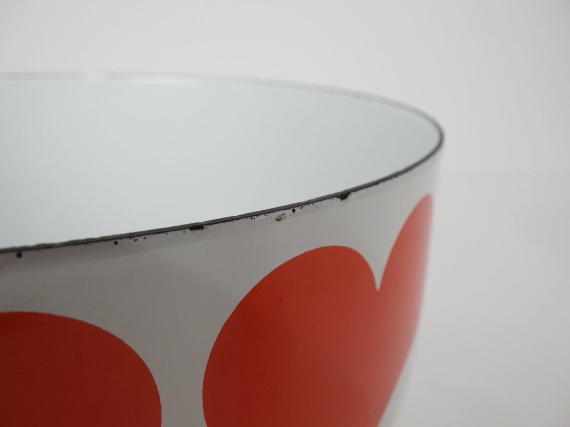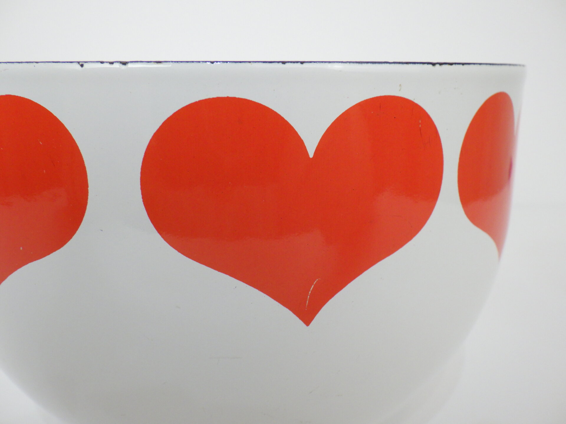 | ARABIA社のエナメル製品の部門として1950年代に誕生したFINEL。 調理器具としての耐久性や機能美に加え、インテリアとしても成立するデザイン性の高さから、北欧モダンを代表するプロダクトとして、世界的に評価を受けています。 エナメルボウルは、フィネルのアートディレクター的存在にして、「フィンランドデザインの良心」と呼ばれたKaj Franck(カイ・フランク)がフォルムデザインを担当し、様々な装飾デザイナーとコレボして生み出された名作シリーズです。 その中でも特に人気の高い、こちらのハート(Love)シリーズ。 白地に大きなハートが一周プリントされており、シンプルで大胆な北欧らしいポップなデザインですね。 フィネルのボウルは深さがしっかりあり、安定性も抜群なため、ミキシングボウルやサラダボウルとして実用するのにとても使いやすく、おすすめしています。 |