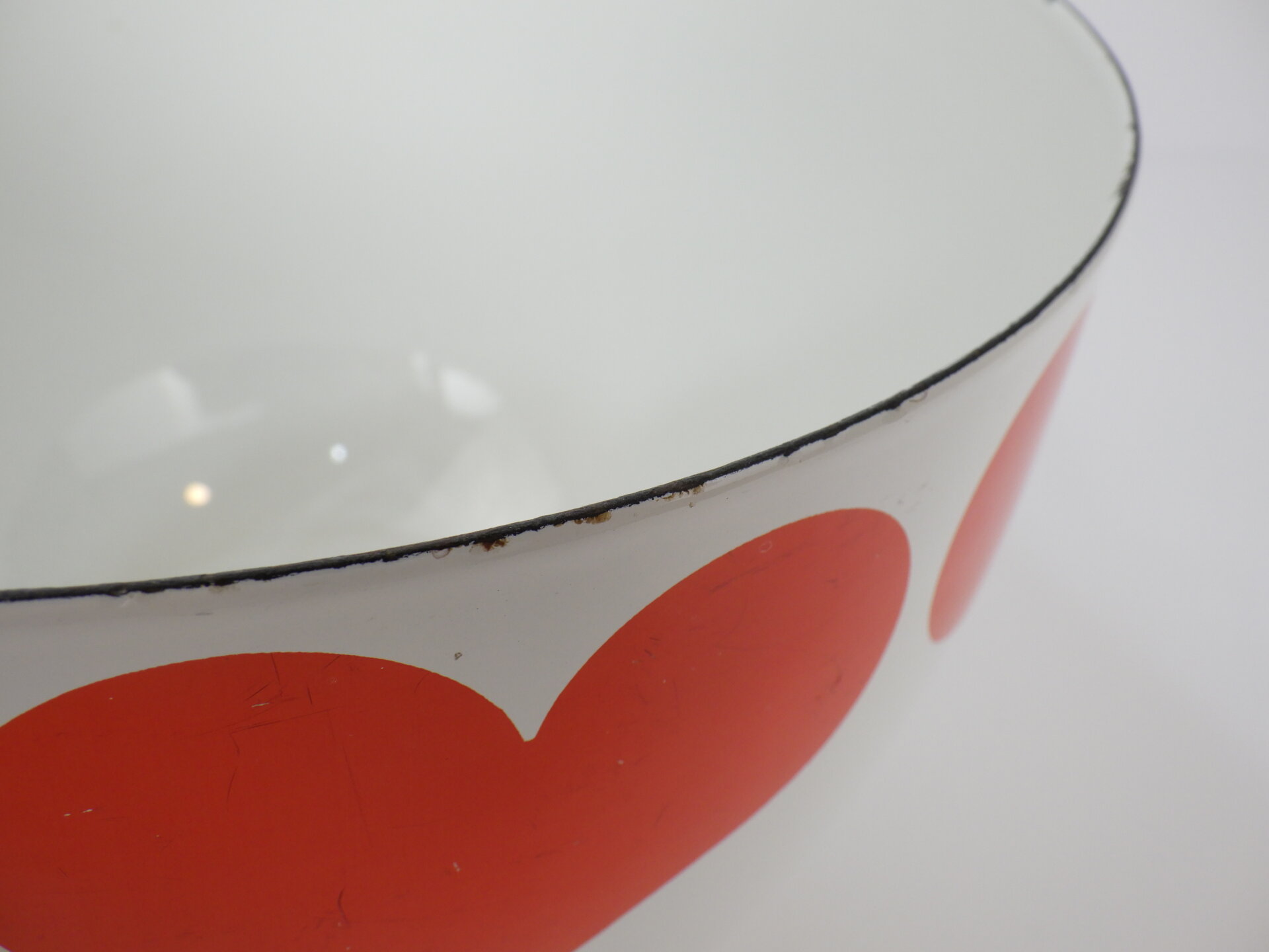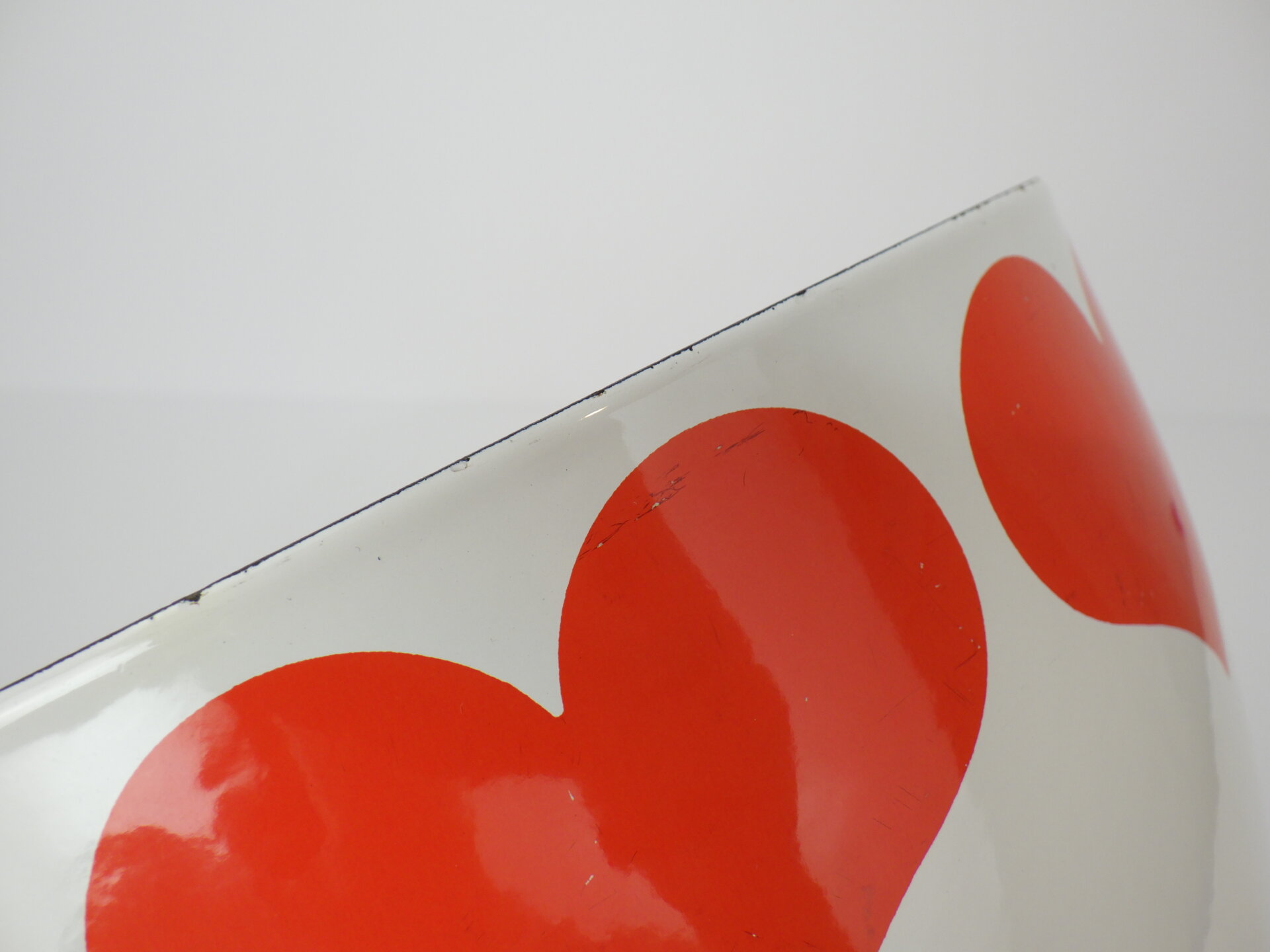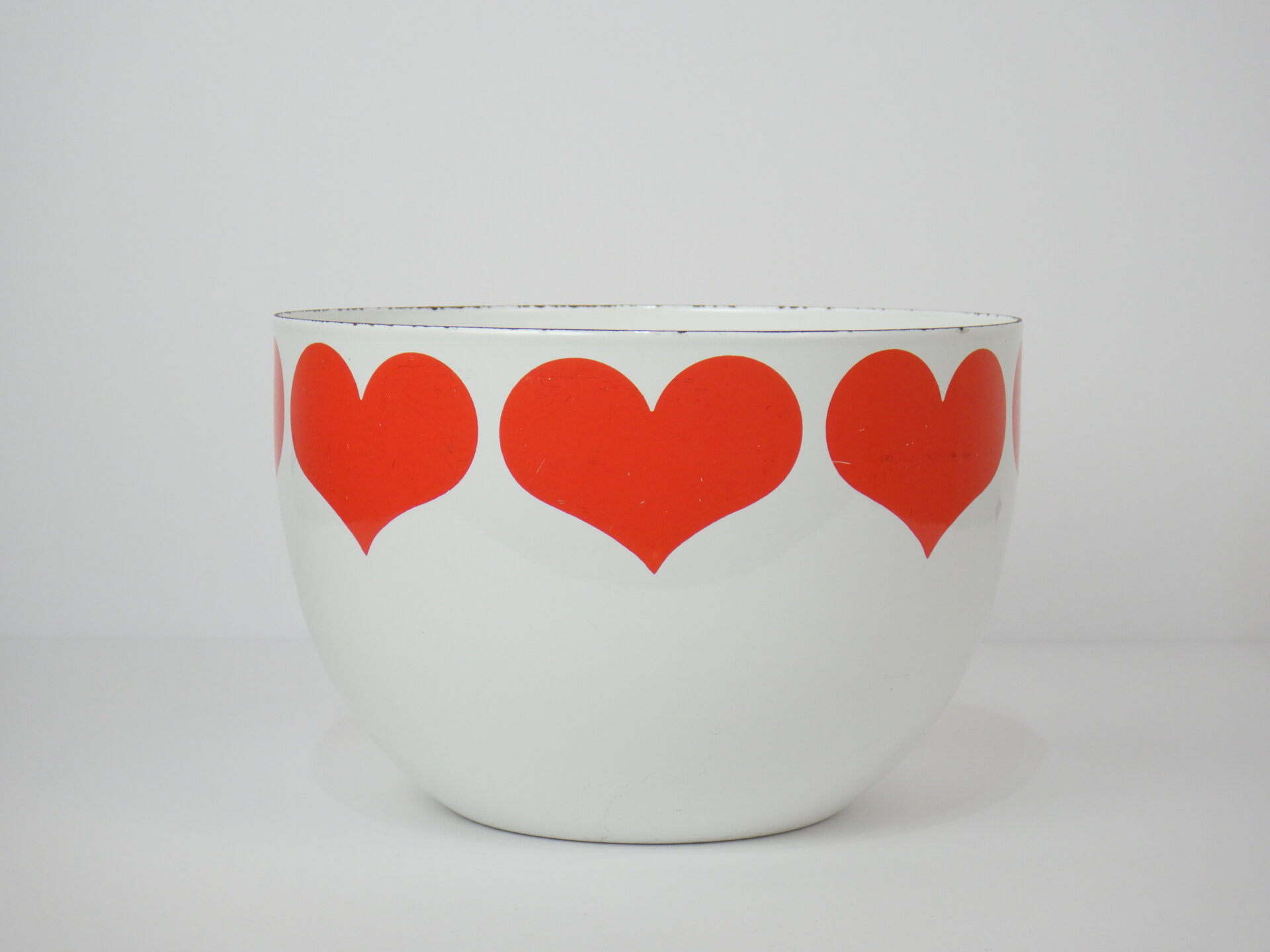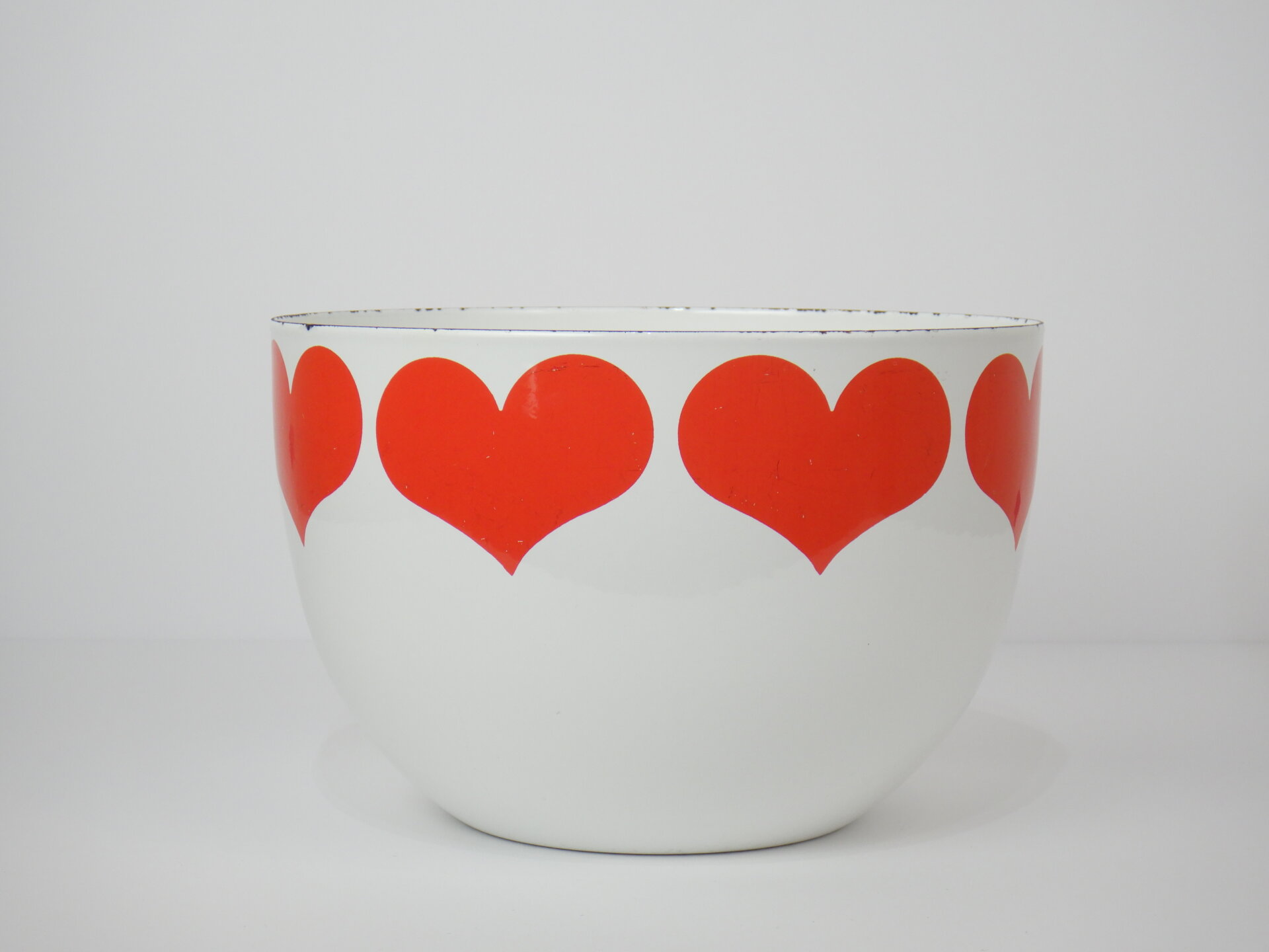 | ARABIA社のエナメル製品の部門として1950年代に誕生したFINEL。 調理器具としての耐久性や機能美に加え、インテリアとしても成立するデザイン性の高さから、北欧モダンを代表するプロダクトとして、世界的に評価を受けています。 エナメルボウルは、フィネルのアートディレクター的存在にして、「フィンランドデザインの良心」と呼ばれたKaj Franck(カイ・フランク)がフォルムデザインを担当し、様々な装飾デザイナーとコレボして生み出された名作シリーズです。 その中でも特に人気の高い、こちらのハート(Love)シリーズ。 白地に大きなハートが一周プリントされており、シンプルで大胆な北欧らしいポップなデザインですね。 フィネルのボウルは深さがしっかりあり、安定性も抜群なため、ミキシングボウルやサラダボウルとして実用するのにとても使いやすく、おすすめしています。 |