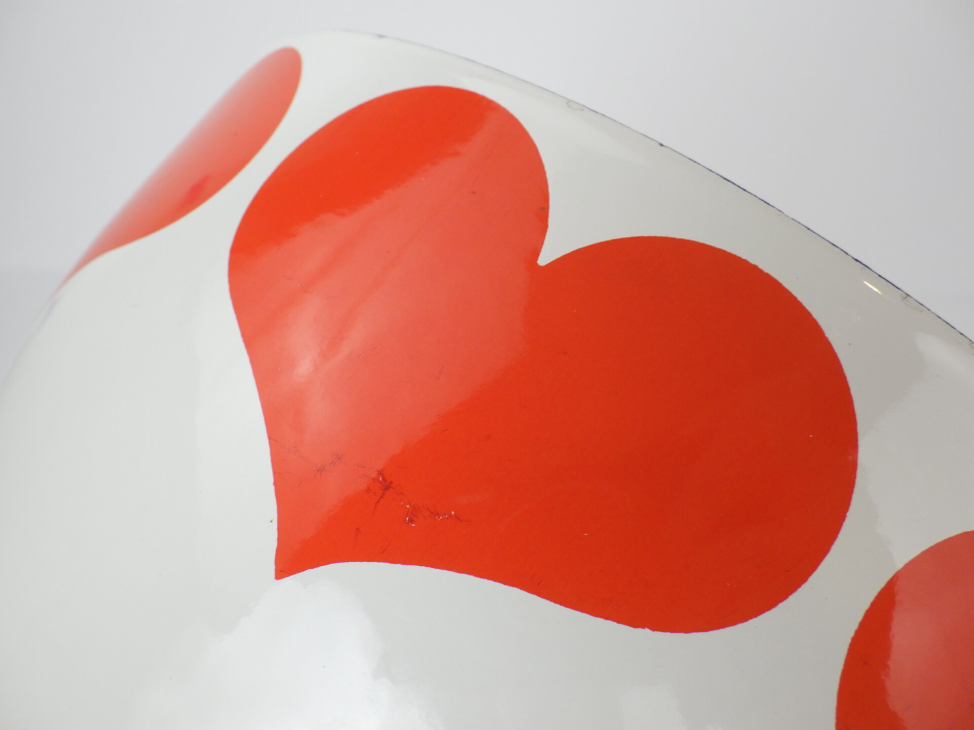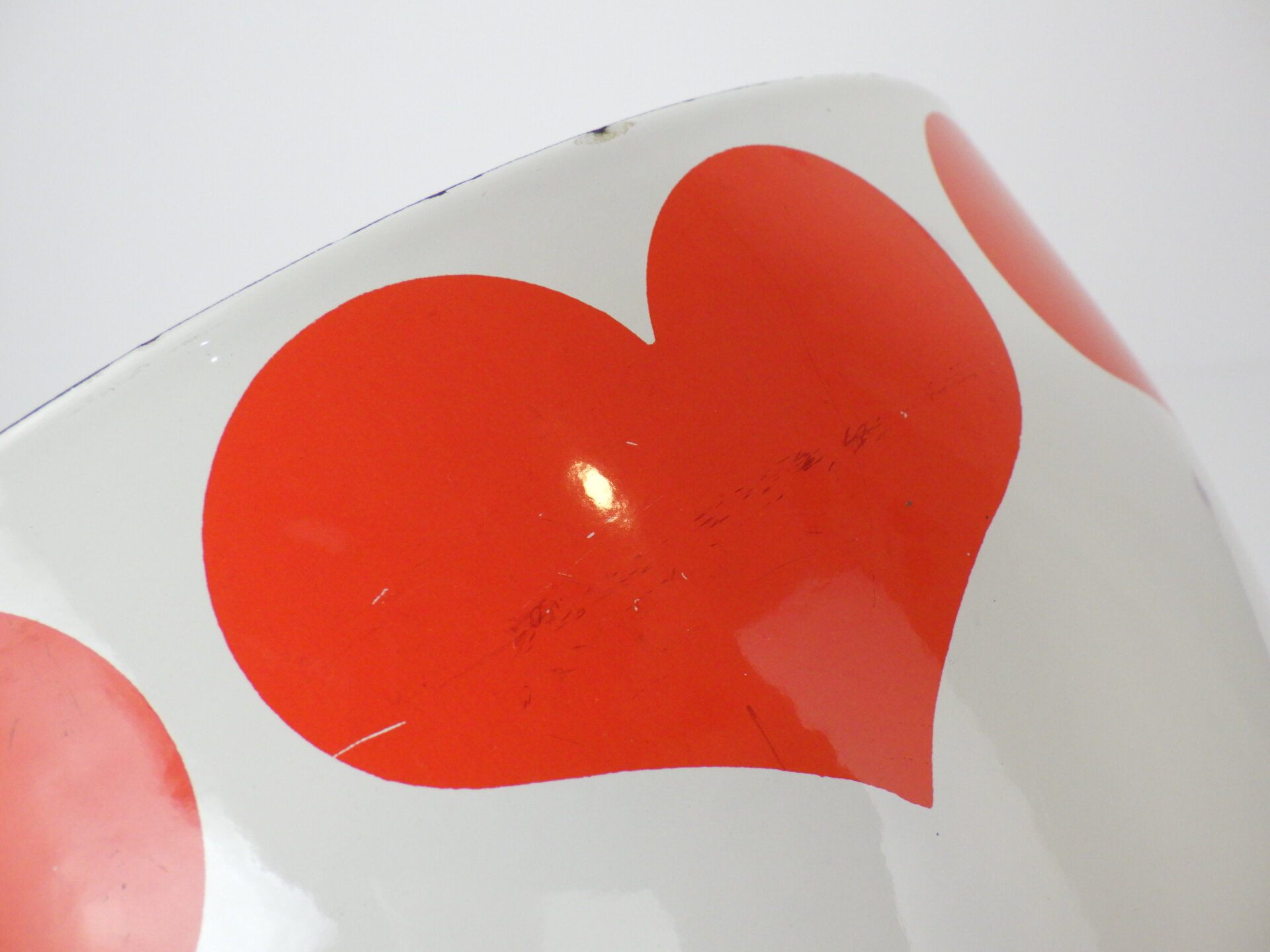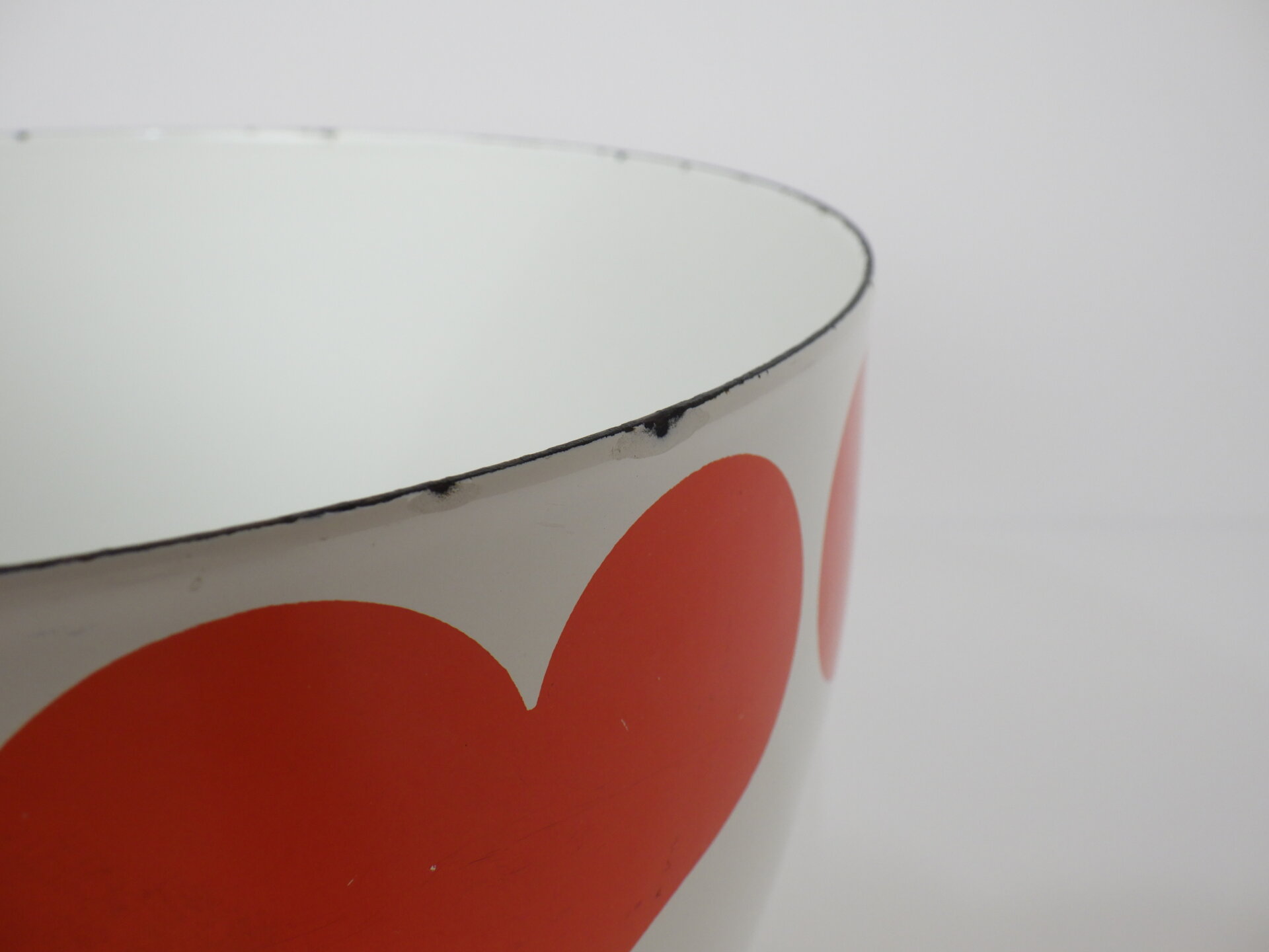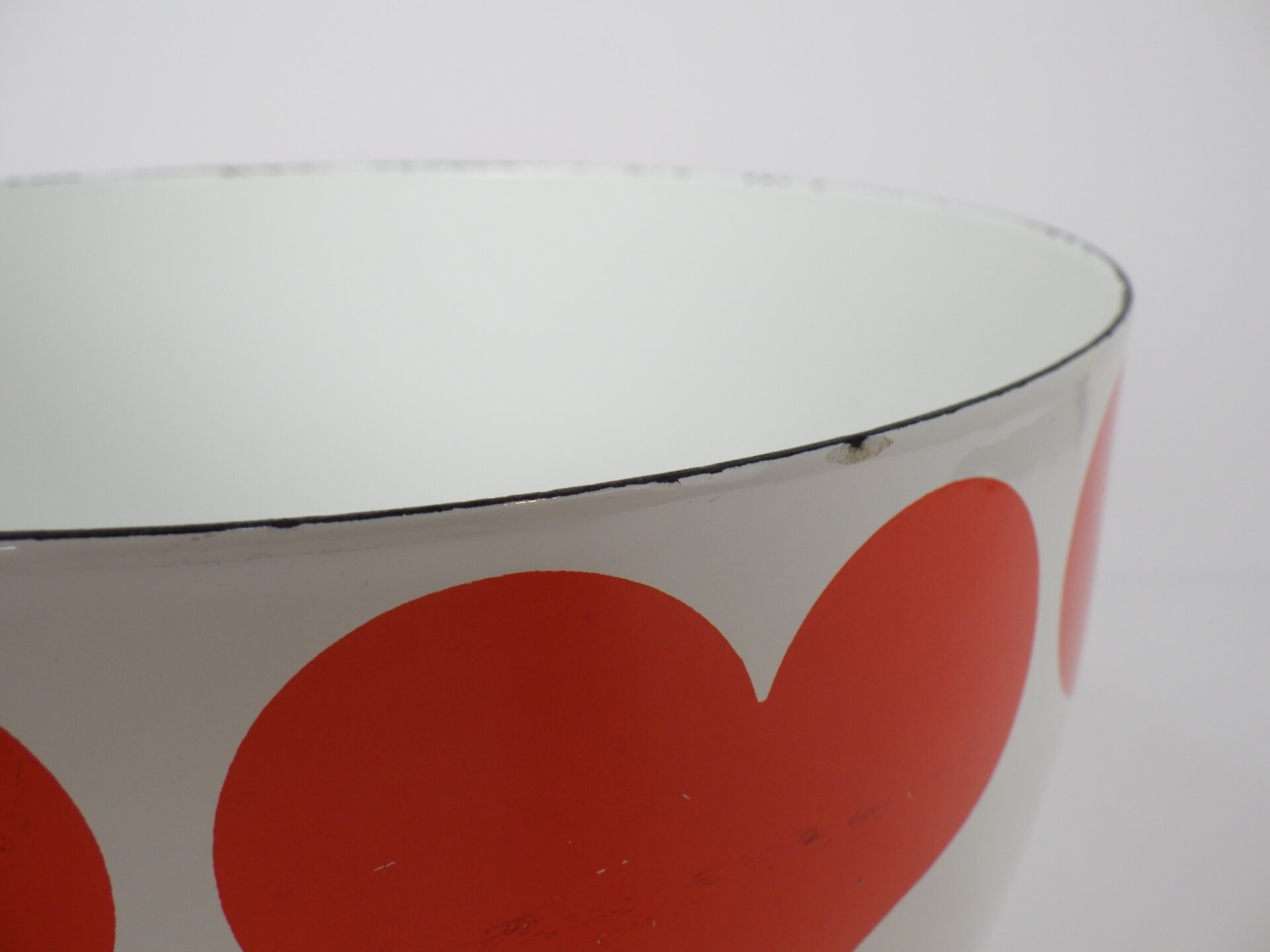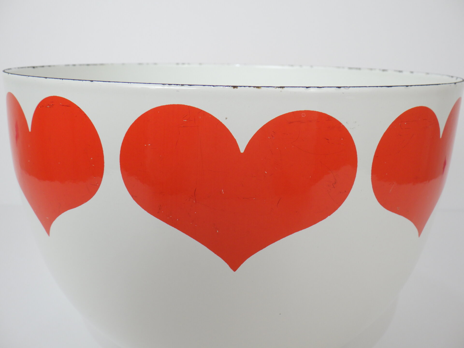 | ARABIA社のエナメル製品の部門として1950年代に誕生したFINEL。 調理器具としての耐久性や機能美に加え、インテリアとしても成立するデザイン性の高さから、北欧モダンを代表するプロダクトとして、世界的に評価を受けています。 エナメルボウルは、フィネルのアートディレクター的存在にして、「フィンランドデザインの良心」と呼ばれたKaj Franck(カイ・フランク)がフォルムデザインを担当し、様々な装飾デザイナーとコレボして生み出された名作シリーズです。 その中でも特に人気の高い、こちらのハート(Love)シリーズ。 白地に大きなハートが一周プリントされており、シンプルで大胆な北欧らしいポップなデザインですね。 フィネルのボウルは深さがしっかりあり、安定性も抜群なため、ミキシングボウルやサラダボウルとして実用するのにとても使いやすく、おすすめしています。 |