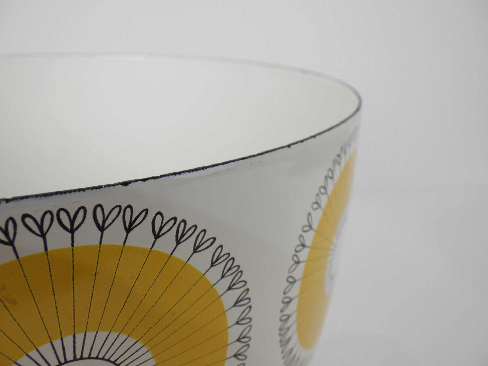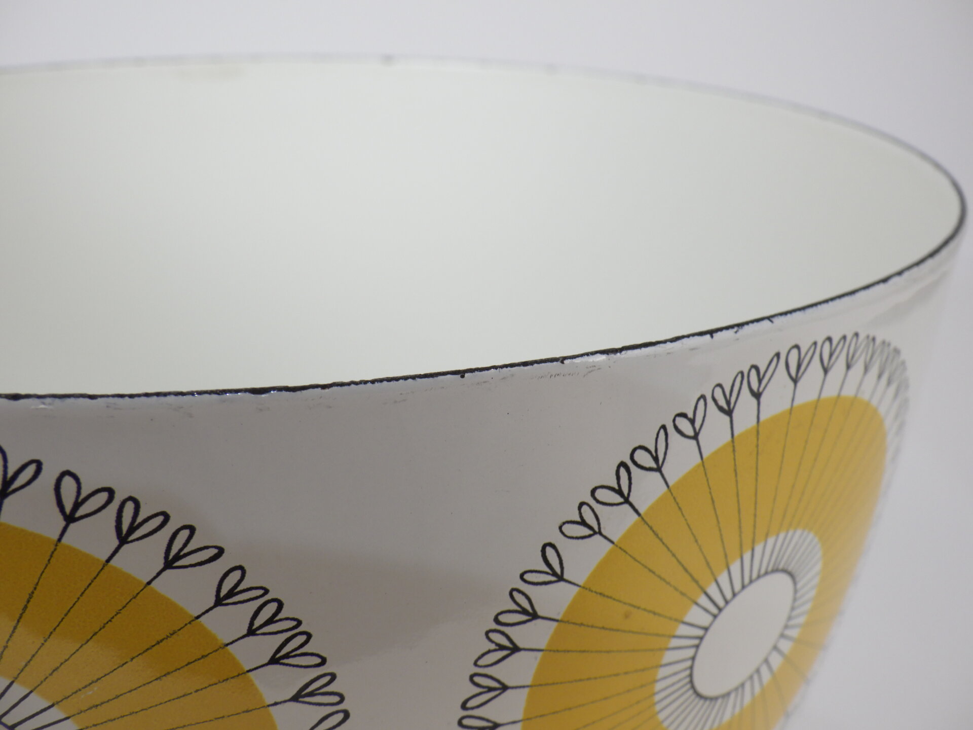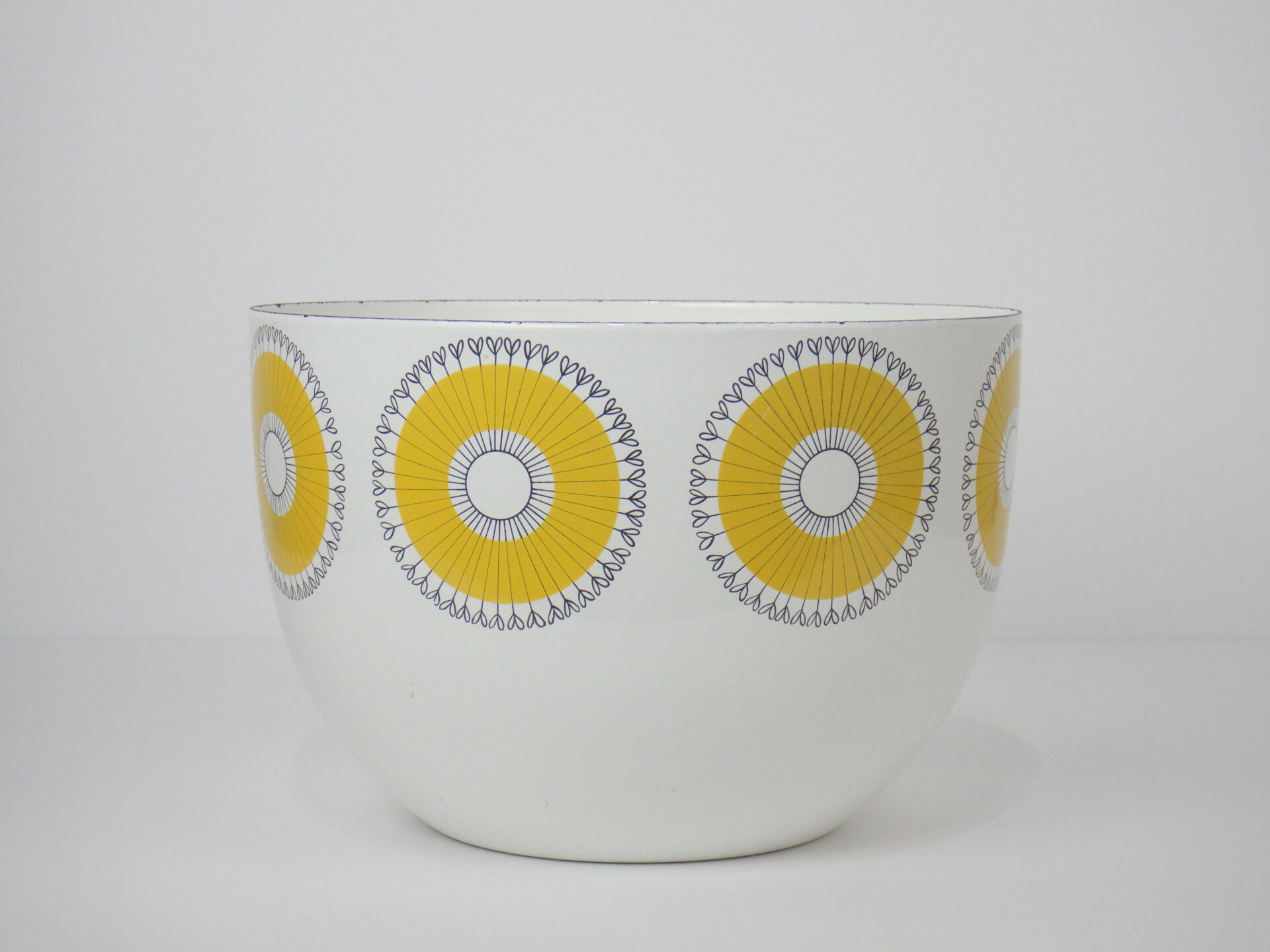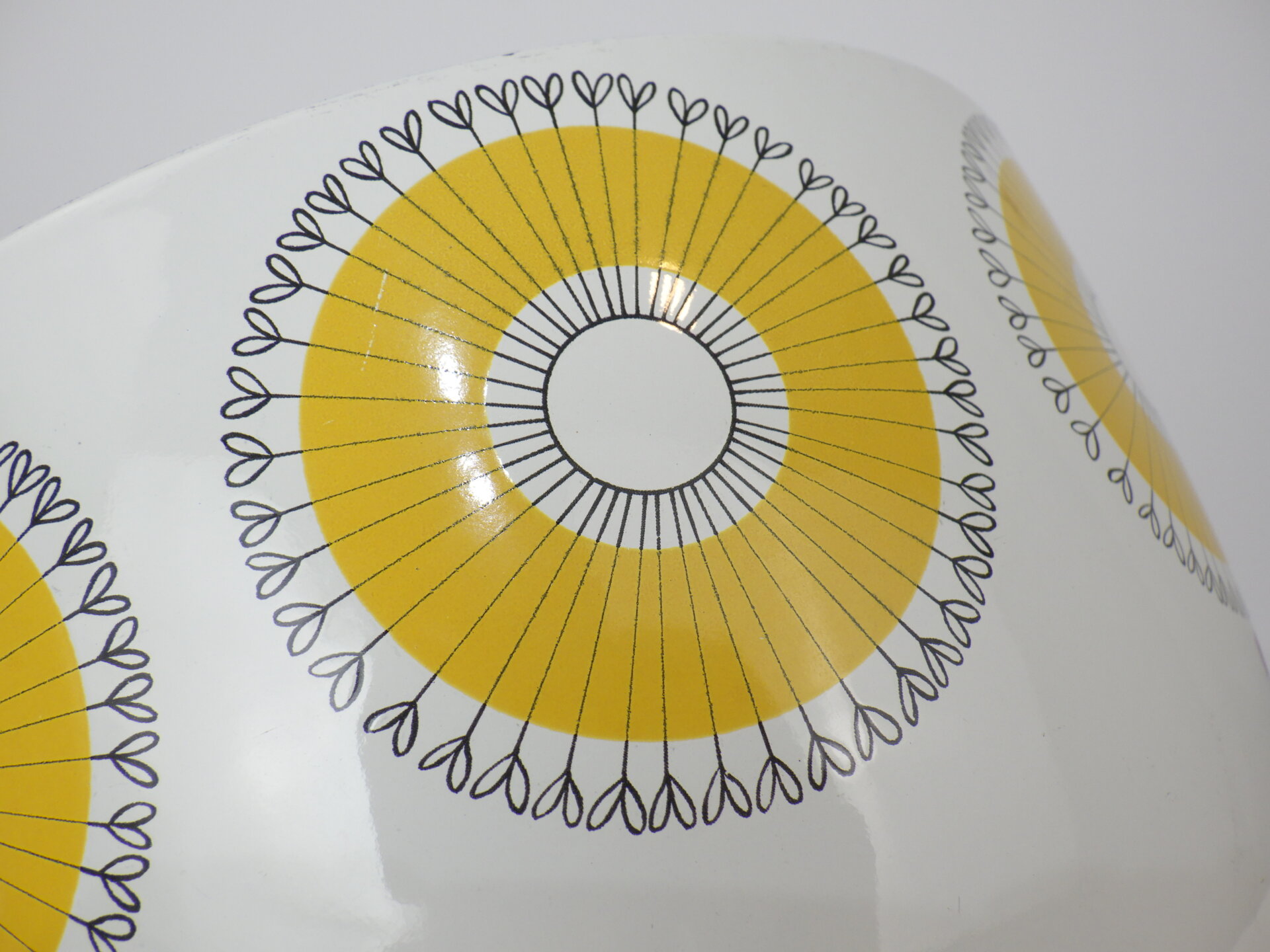 | ARABIA社のエナメル製品の部門として1950年代に誕生したFINEL。 調理器具としての耐久性や機能美に加え、インテリアとしても成立するデザイン性の高さから、北欧モダンを代表するプロダクトとして、世界的に評価を受けています。 エナメルボウルは、フィネルのアートディレクター的存在にして、「フィンランドデザインの良心」と呼ばれたKaj Franck(カイ・フランク)がフォルムデザインを担当し、様々な装飾デザイナーとコレボして生み出された名作シリーズです。 こちらのSunflowerは大胆な黄色の円形モチーフに、黒い繊細なラインと小さなハート上の模様が放射線状に描かれたシリーズ。 北欧モダンらしい、明快な配色と図案で、空間を華やかにしてくれますね。 フィネルのボウルは深さがしっかりあり、安定性も抜群なため、ミキシングボウルやサラダボウルとして実用するのにとても使いやすく、おすすめしています。 |