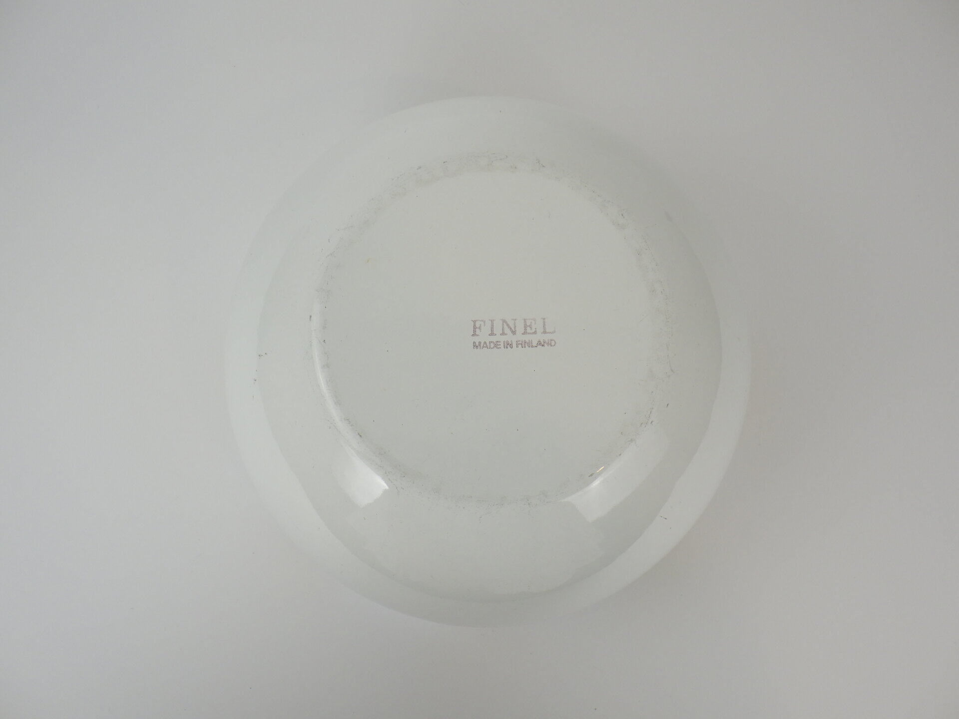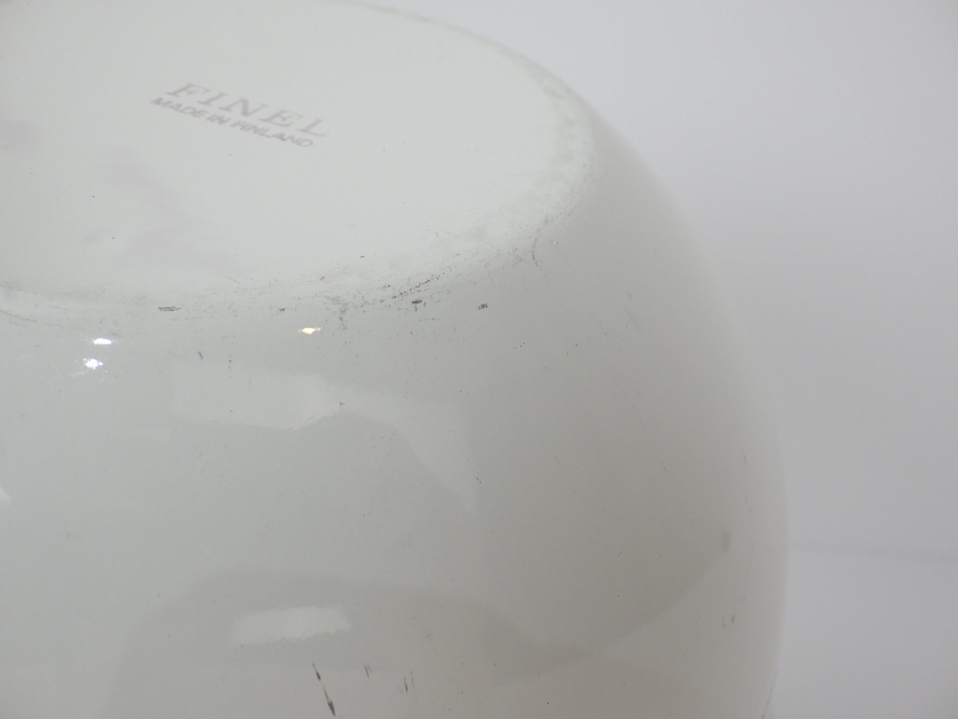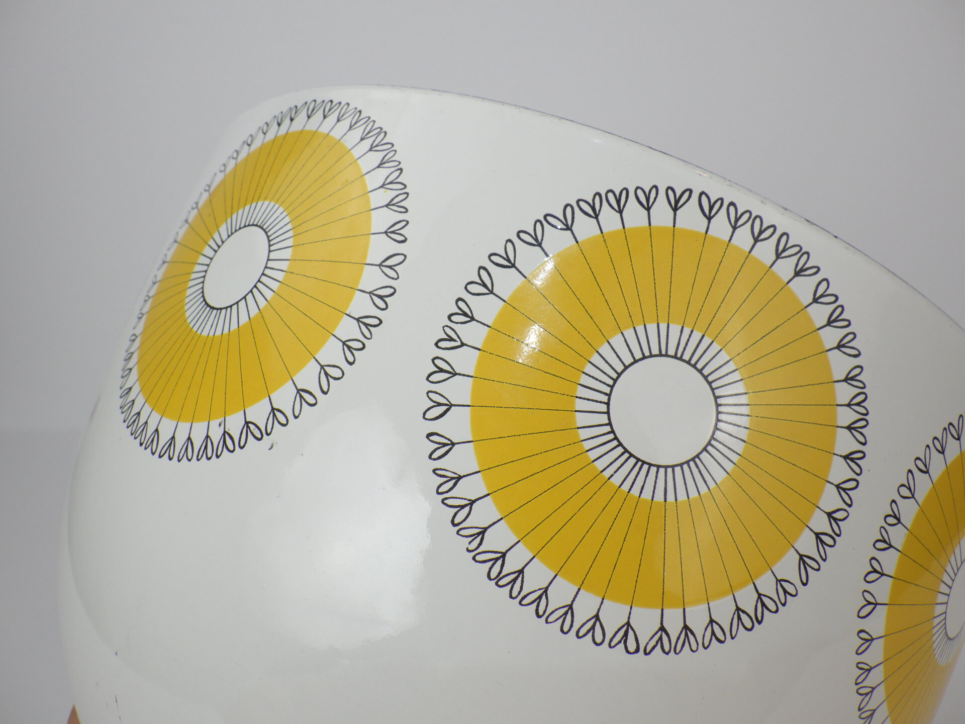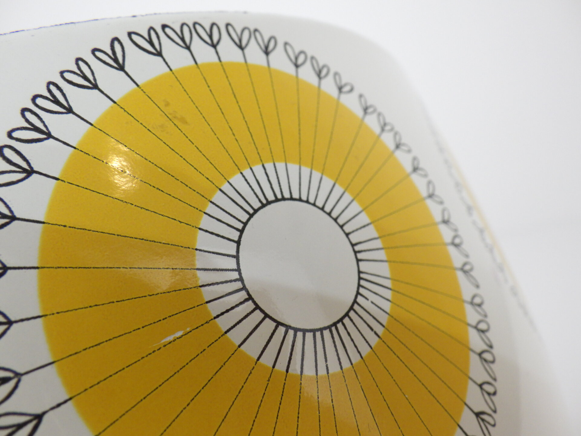 | ARABIA社のエナメル製品の部門として1950年代に誕生したFINEL。 調理器具としての耐久性や機能美に加え、インテリアとしても成立するデザイン性の高さから、北欧モダンを代表するプロダクトとして、世界的に評価を受けています。 エナメルボウルは、フィネルのアートディレクター的存在にして、「フィンランドデザインの良心」と呼ばれたKaj Franck(カイ・フランク)がフォルムデザインを担当し、様々な装飾デザイナーとコレボして生み出された名作シリーズです。 こちらのSunflowerは大胆な黄色の円形モチーフに、黒い繊細なラインと小さなハート上の模様が放射線状に描かれたシリーズ。 北欧モダンらしい、明快な配色と図案で、空間を華やかにしてくれますね。 フィネルのボウルは深さがしっかりあり、安定性も抜群なため、ミキシングボウルやサラダボウルとして実用するのにとても使いやすく、おすすめしています。 |