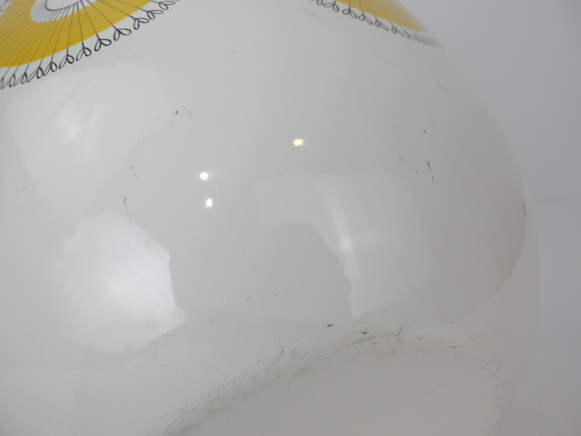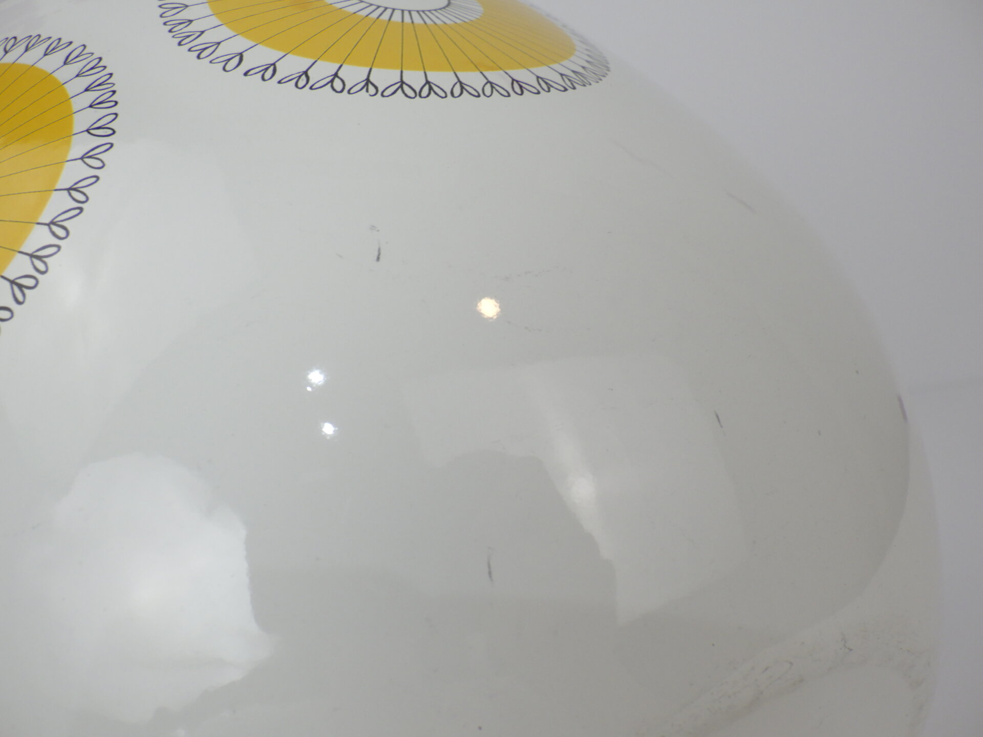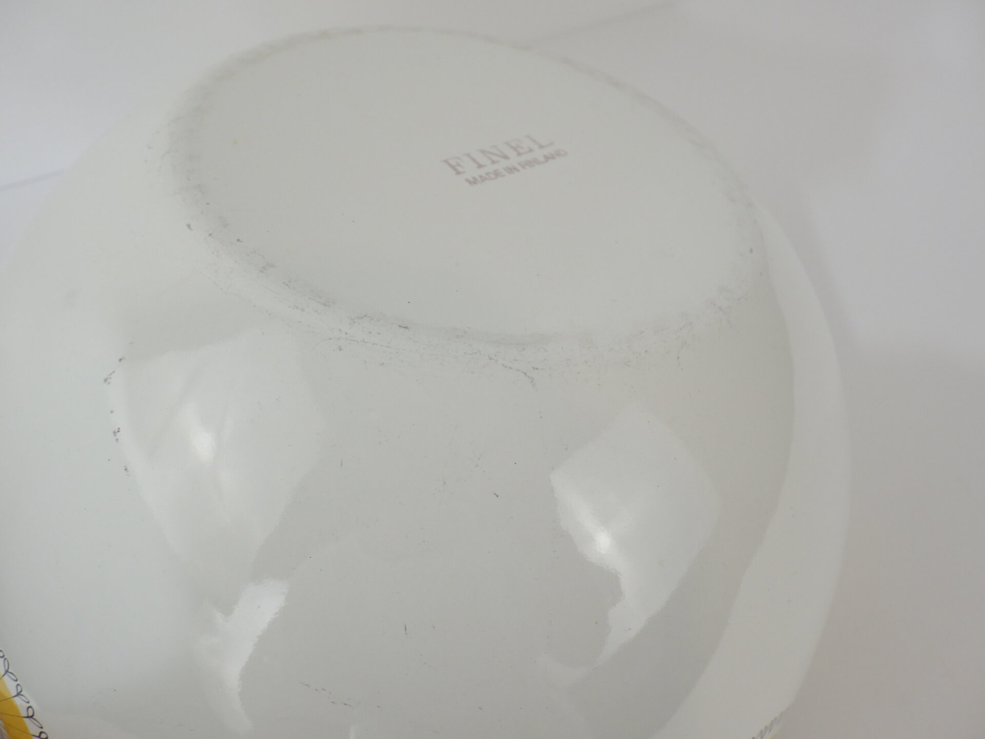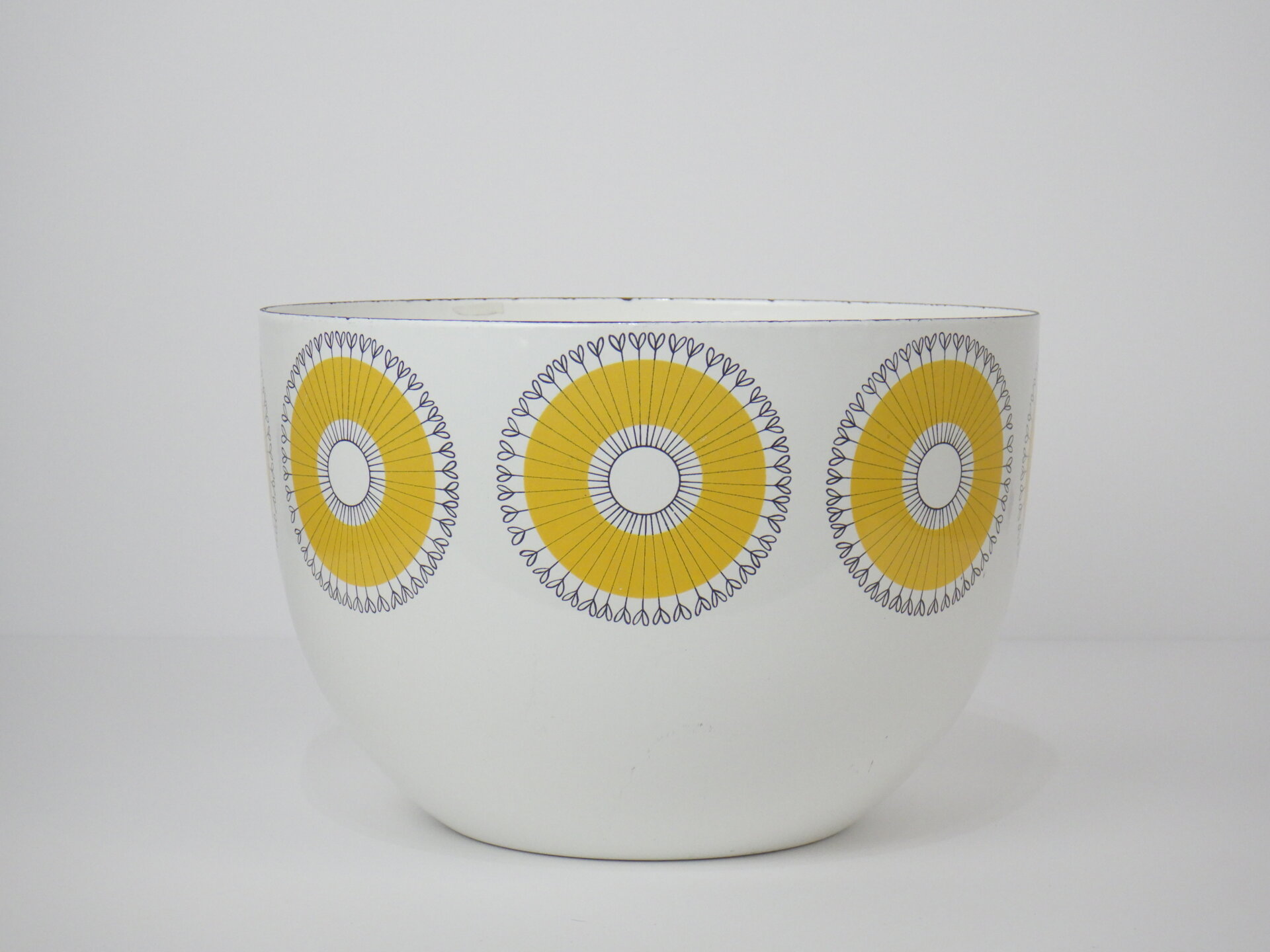| ARABIA社のエナメル製品の部門として1950年代に誕生したFINEL。 調理器具としての耐久性や機能美に加え、インテリアとしても成立するデザイン性の高さから、北欧モダンを代表するプロダクトとして、世界的に評価を受けています。 エナメルボウルは、フィネルのアートディレクター的存在にして、「フィンランドデザインの良心」と呼ばれたKaj Franck(カイ・フランク)がフォルムデザインを担当し、様々な装飾デザイナーとコレボして生み出された名作シリーズです。 こちらのSunflowerは大胆な黄色の円形モチーフに、黒い繊細なラインと小さなハート上の模様が放射線状に描かれたシリーズ。 北欧モダンらしい、明快な配色と図案で、空間を華やかにしてくれますね。 フィネルのボウルは深さがしっかりあり、安定性も抜群なため、ミキシングボウルやサラダボウルとして実用するのにとても使いやすく、おすすめしています。 |