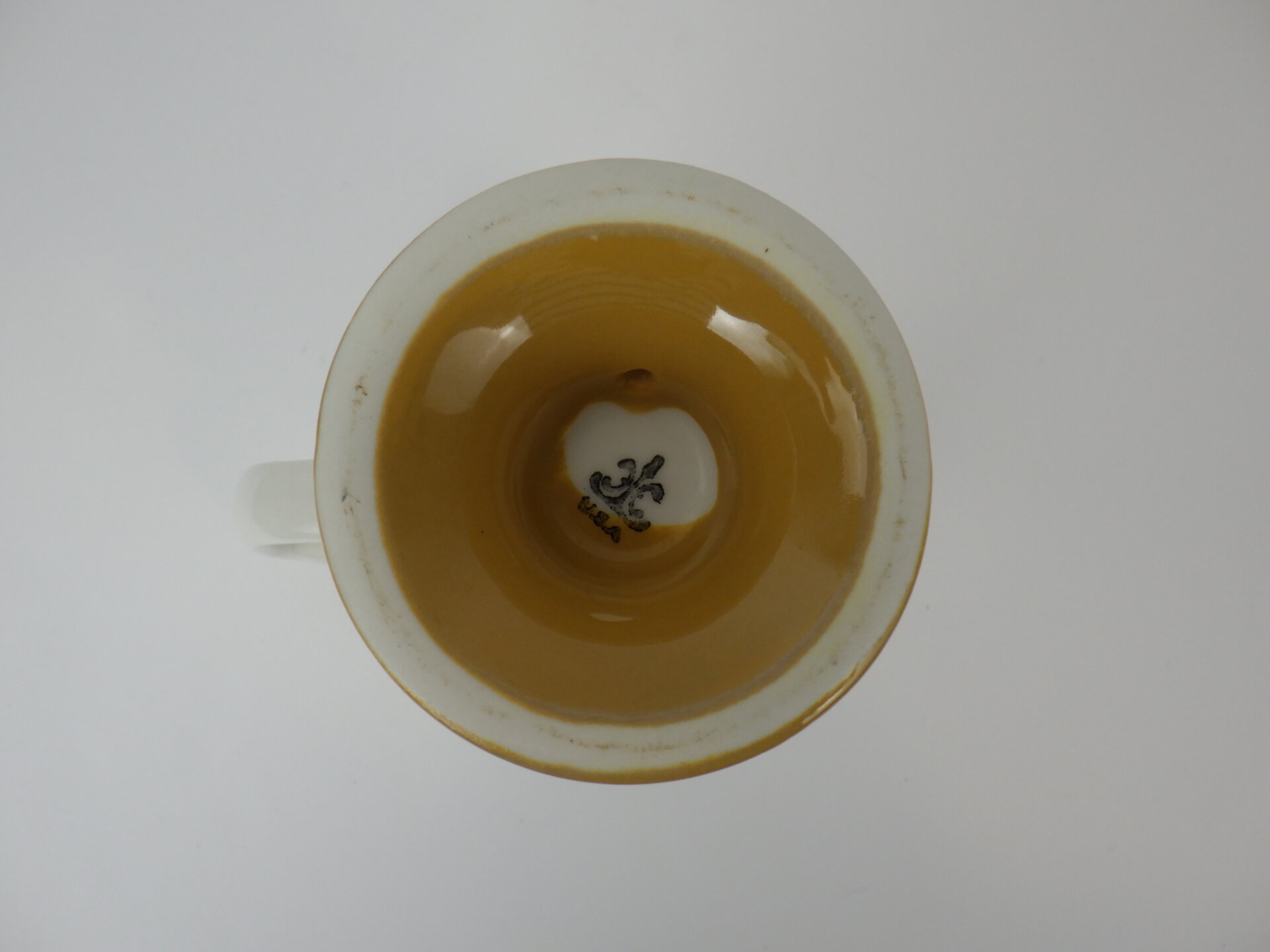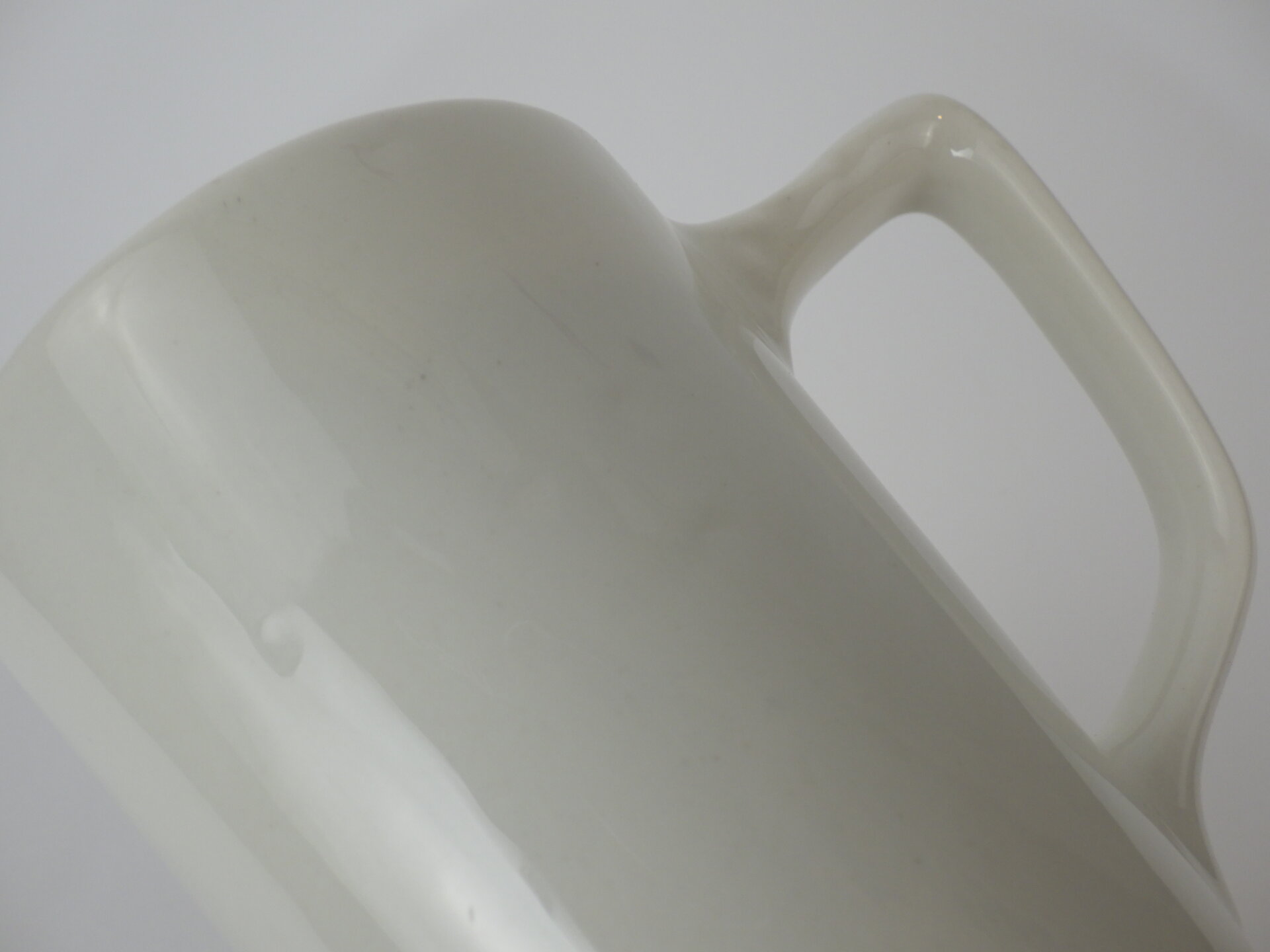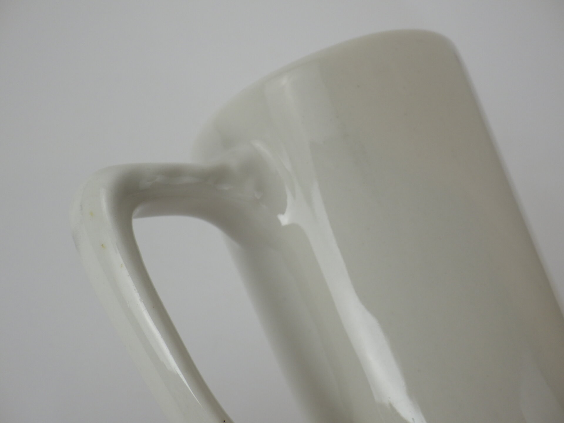| アメリカで買い付けました。 ビンテージの台座付き陶器マグです。 アメリカでは良く見られるタイプのホテル、ダイナー、食堂などで業務用として使用されていたシリーズで、厚手で保温性が高く、日常使いに強いタフさを持っています。 こちらのマグは一見シンプルな作りですが、ハンドルを上から見ると、波なみラインになっています・・・! ちょっとした嬉しいアクセントです。 アイリッシュコーヒーやホットワイン、カフェラテなど、温かい飲み物にぴったりですし、ペンホルダーやフラワーベースのような使い方をするのも可愛くておすすめです。 |