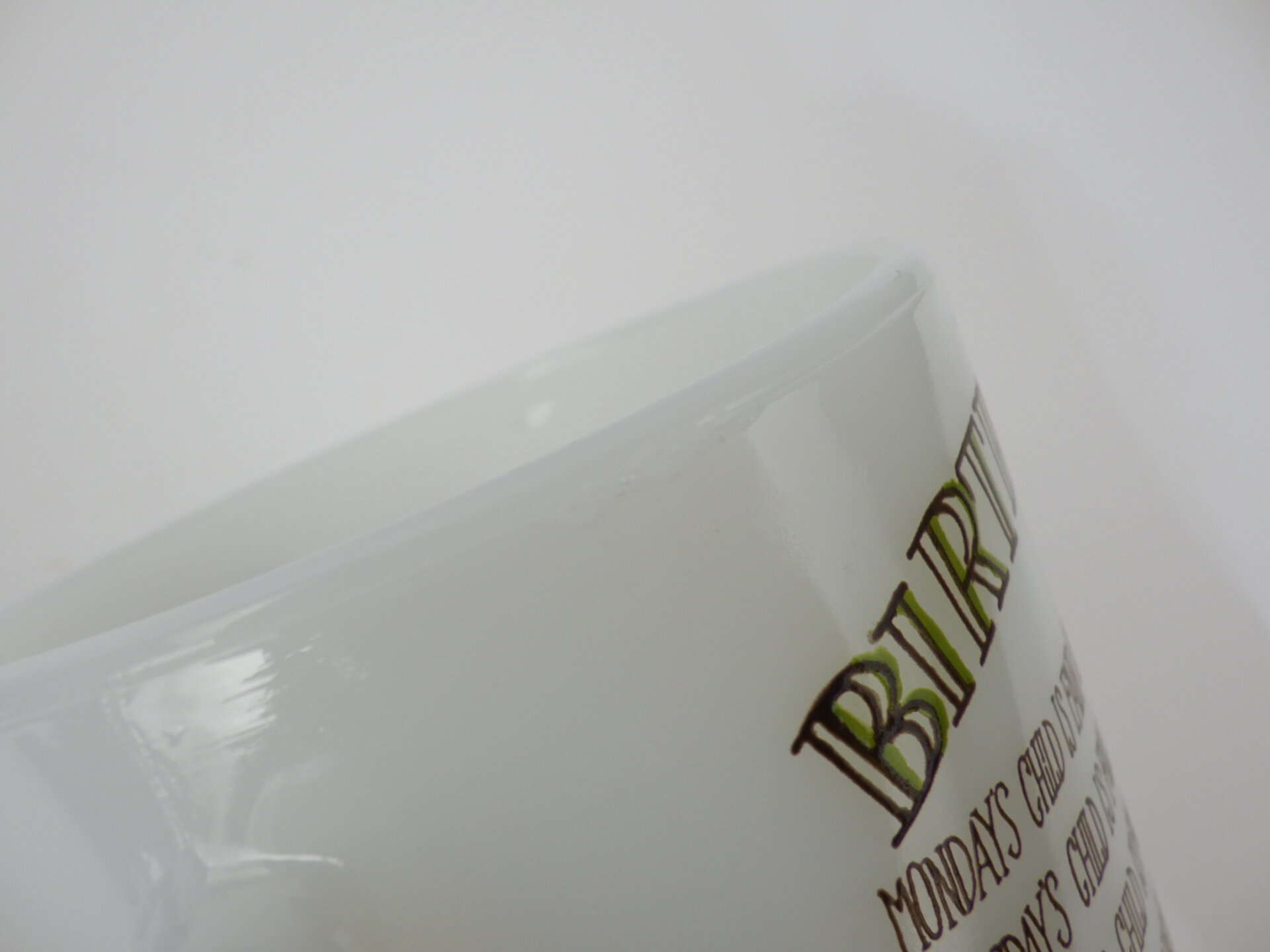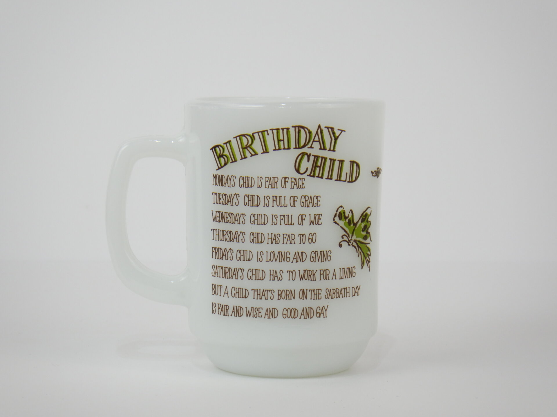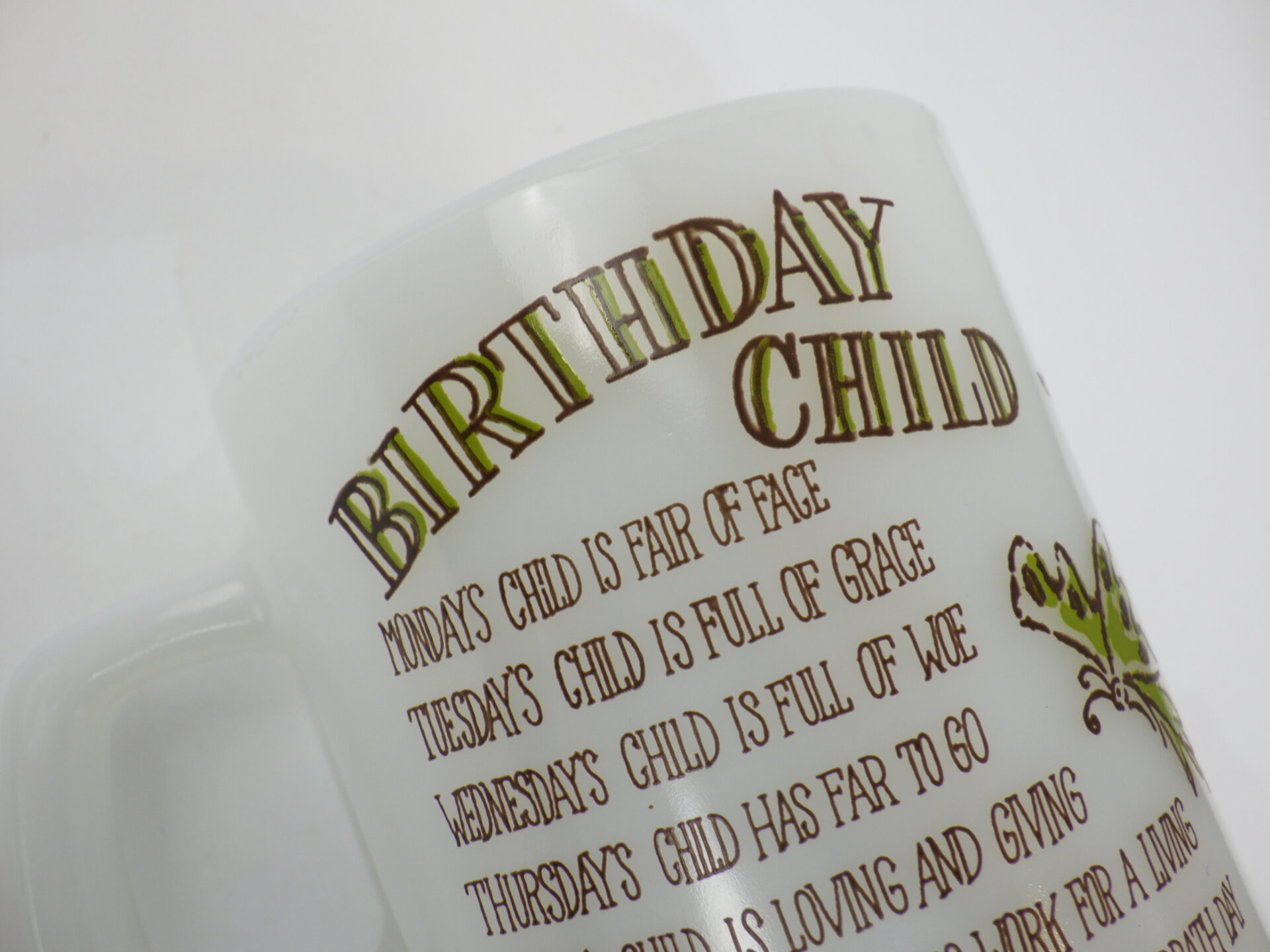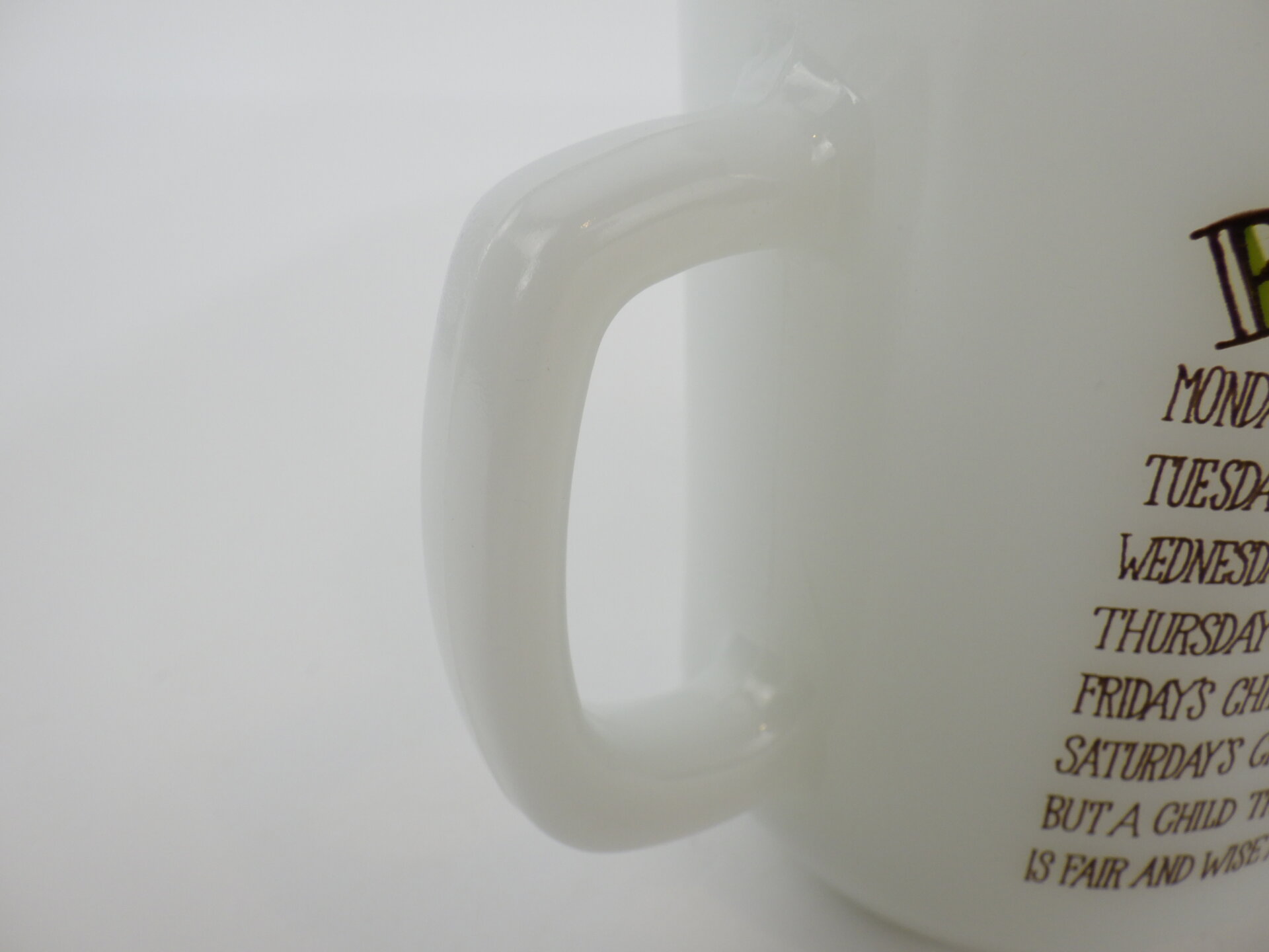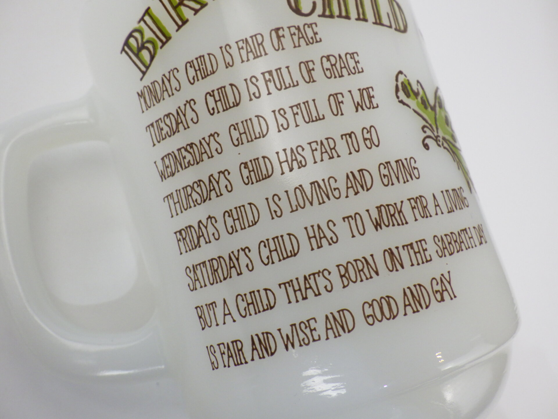 | アメリカで買い付けました。 ファイヤーキング、ウィークリー・チャイルド・シリーズ「ハッピー・バースデー」のマグです。 マザーグースの「曜日の歌」がモチーフになっており、月~土、日(サバスデイ)、バースデイの、全8種が存在します。 曜日ごとに「この曜日生まれの子は〇〇な子」と歌われています。(裏面プリント) 自分の生まれの曜日を調べて、当たっているか確かめてみて下さい。 マグの他にボウルもシリーズとして存在しますので、是非揃えてみて下さい。 |