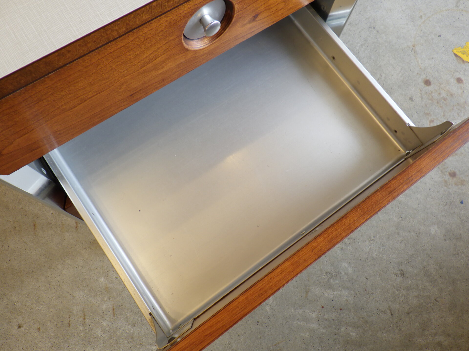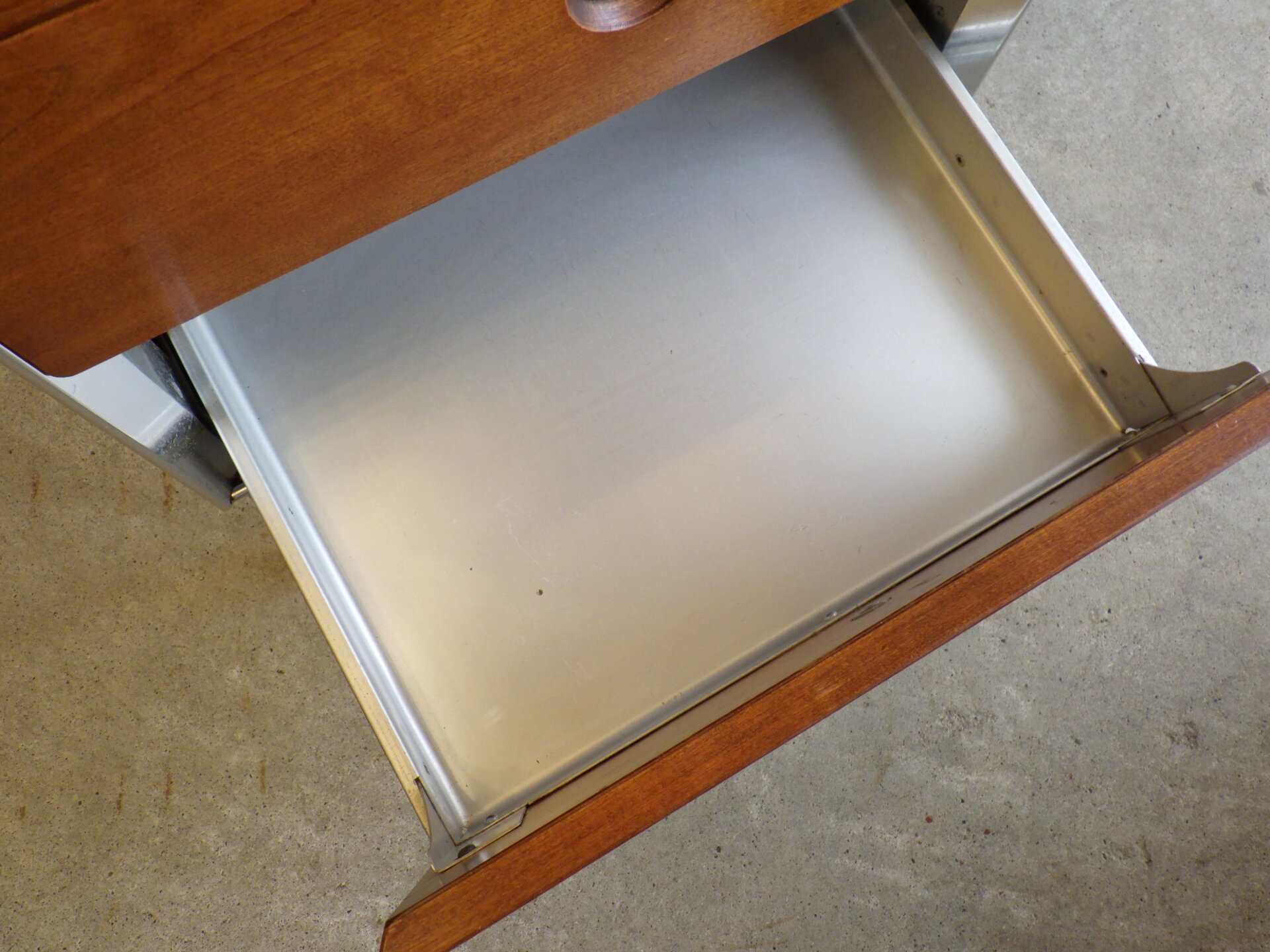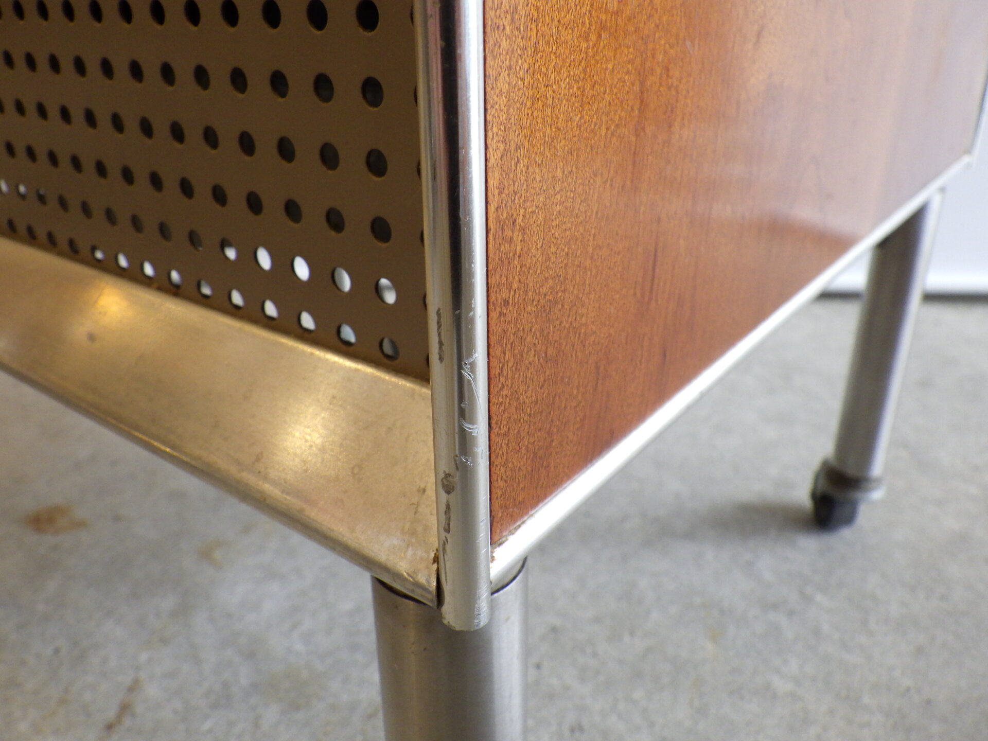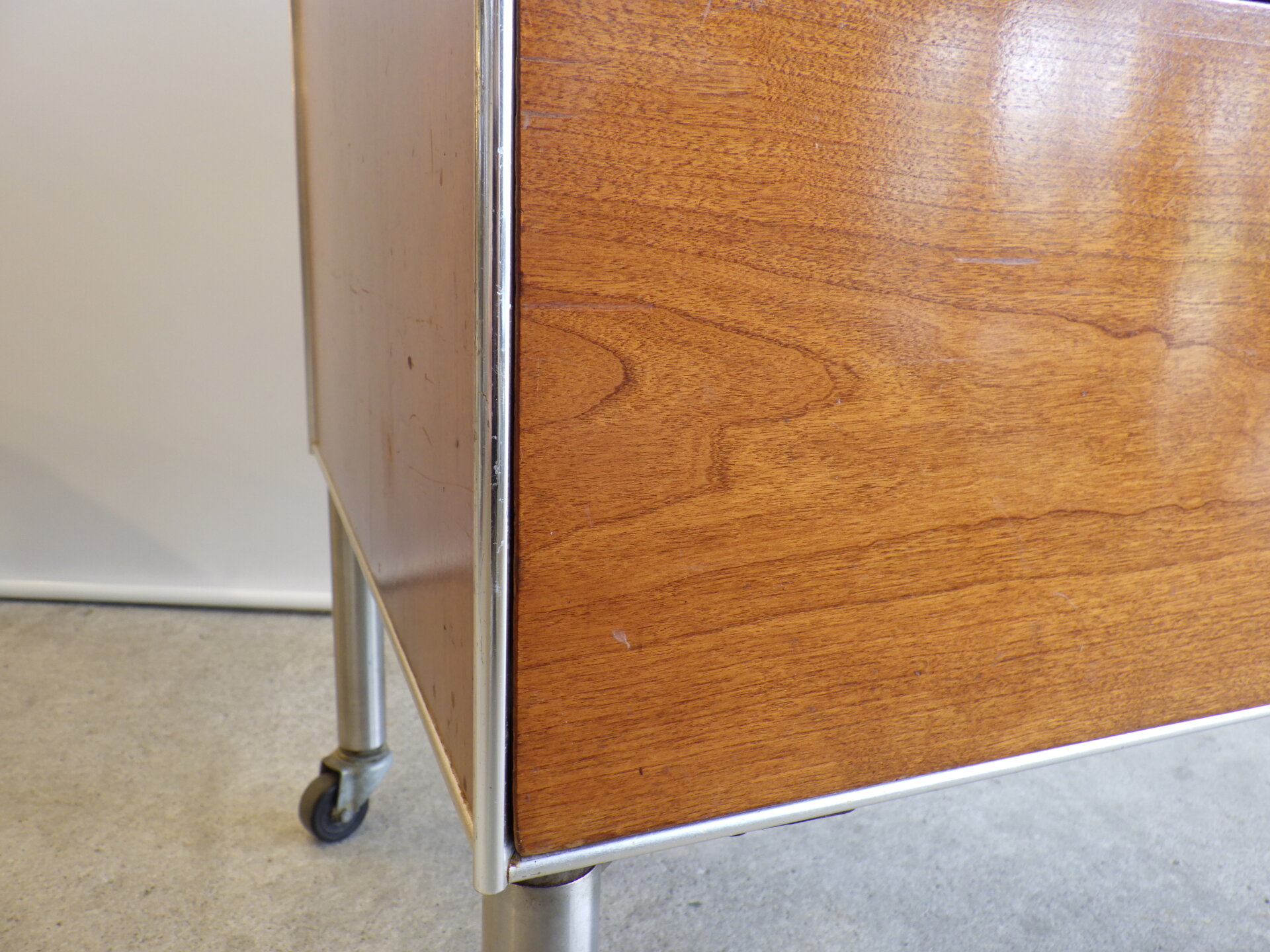 | アメリカで買い付けました。 工業デザイナー「Raymond Loewy」が医療用としてデザインした、Hill-Rom社製の三段キャビネットです。 コカ・コーラ瓶やラッキーストライクのパッケージなどのデザインで知られ、「インダストリアル・デザインの父」と呼ばれるRaymond Loewyは、二十世紀を代表するデザイナーの一人です。 こちらのキャスター付きキャビネットは、フレームはアルミ製、側面と前面はウォルナットの突板が施されています。 天板はメラミン製なので、汚れ等も拭きやすく、実用性に長けています。 デザイン性も高く、日本の住まいでも使用しやすいサイズ感ですので、寝室のベッドサイドに置くのはもちろんのこと、リビングなどのちょっとしたスペースに置いて、照明やオブジェなどを飾ってお楽しみいただくのにも良さそうです。 |