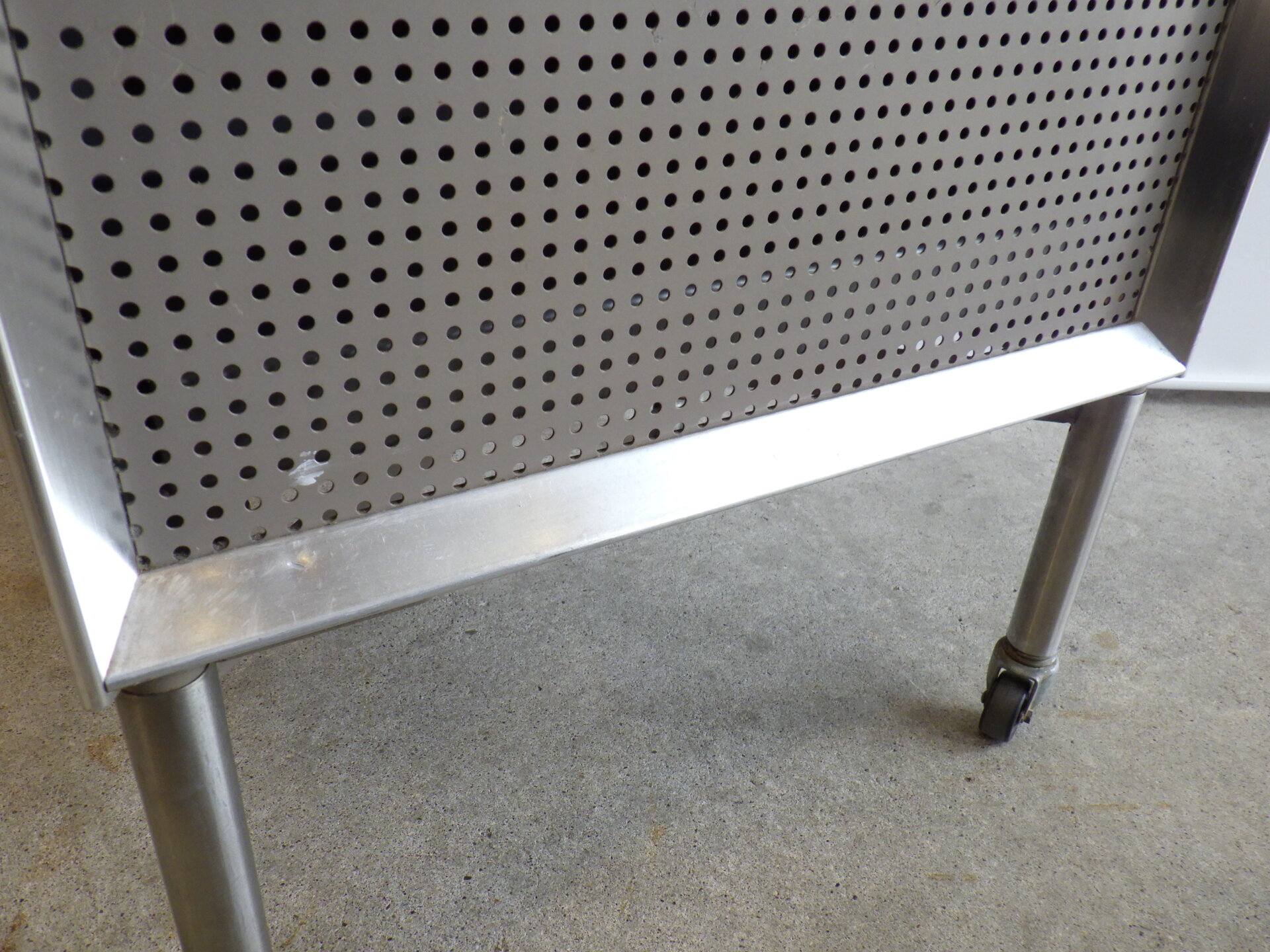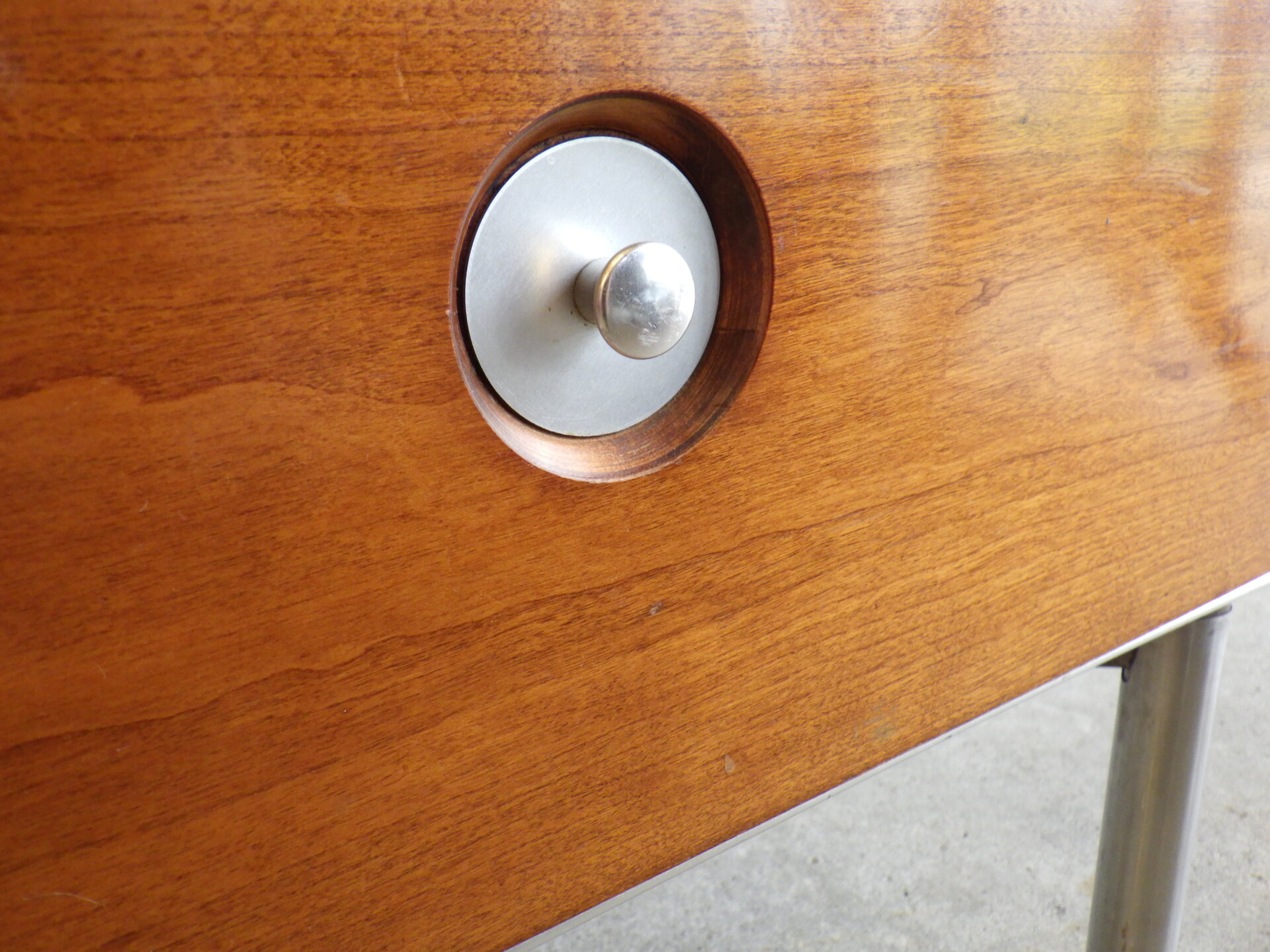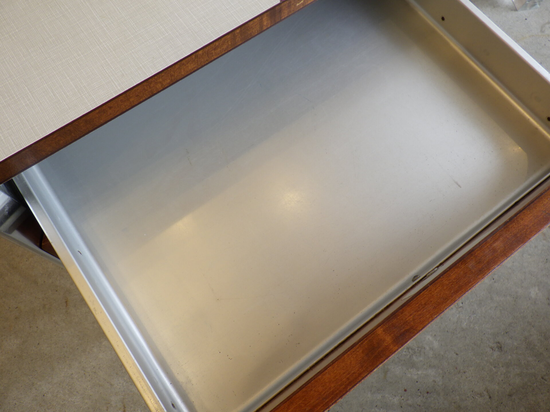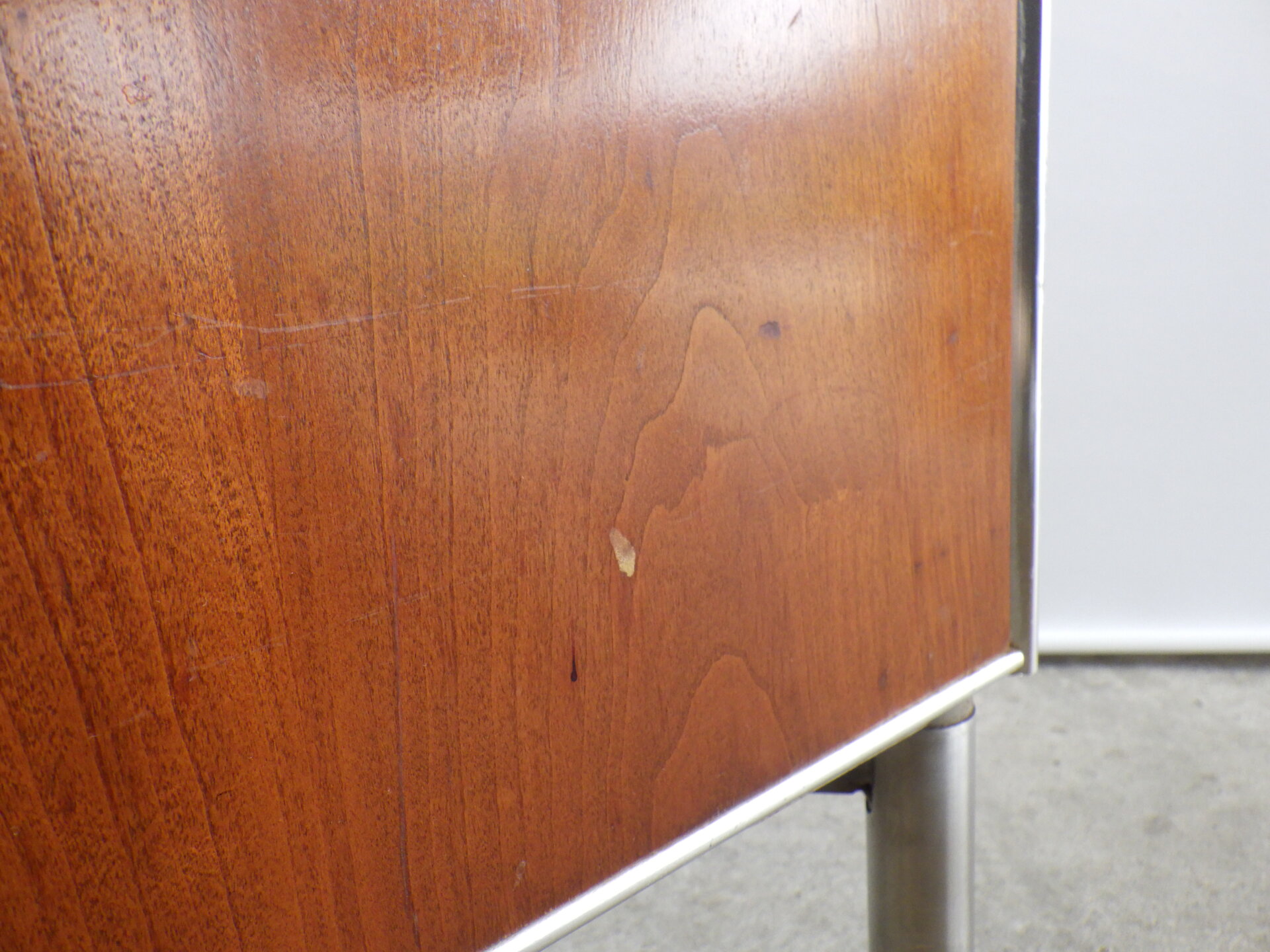 | アメリカで買い付けました。 工業デザイナー「Raymond Loewy」が医療用としてデザインした、Hill-Rom社製の三段キャビネットです。 コカ・コーラ瓶やラッキーストライクのパッケージなどのデザインで知られ、「インダストリアル・デザインの父」と呼ばれるRaymond Loewyは、二十世紀を代表するデザイナーの一人です。 こちらのキャスター付きキャビネットは、フレームはアルミ製、側面と前面はウォルナットの突板が施されています。 天板はメラミン製なので、汚れ等も拭きやすく、実用性に長けています。 デザイン性も高く、日本の住まいでも使用しやすいサイズ感ですので、寝室のベッドサイドに置くのはもちろんのこと、リビングなどのちょっとしたスペースに置いて、照明やオブジェなどを飾ってお楽しみいただくのにも良さそうです。 |