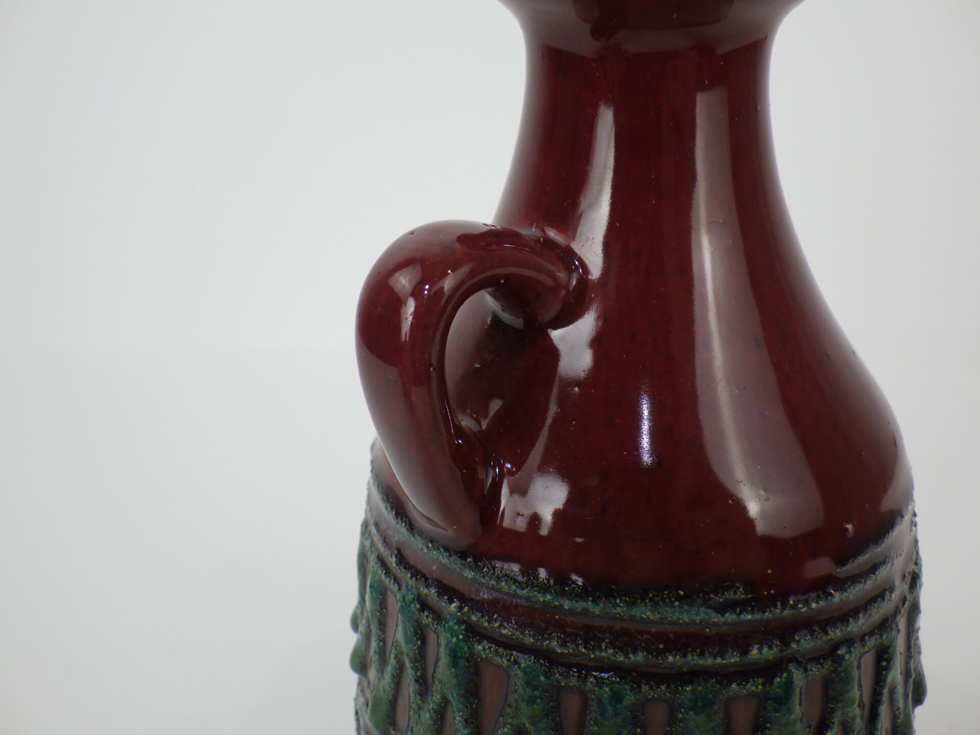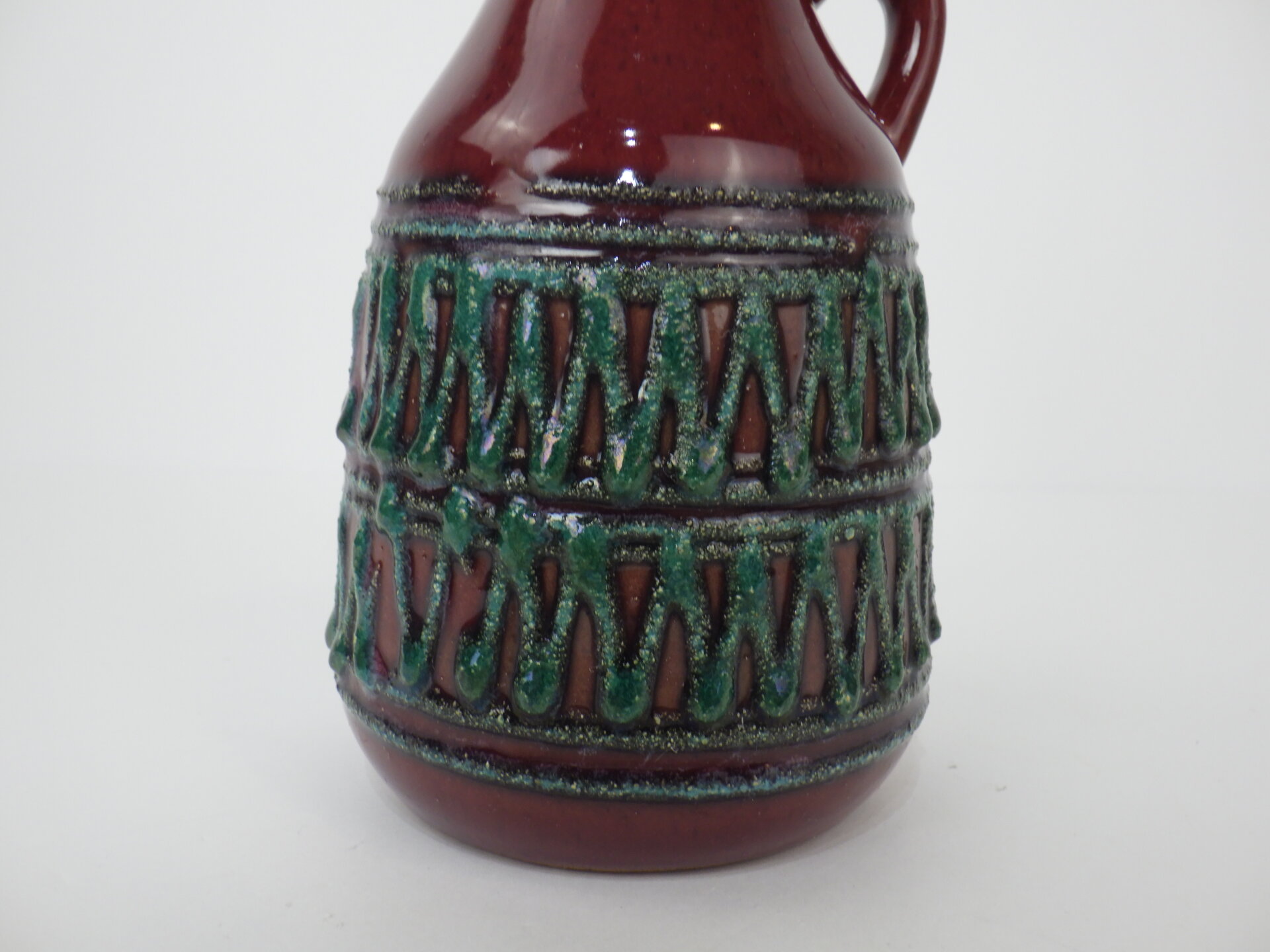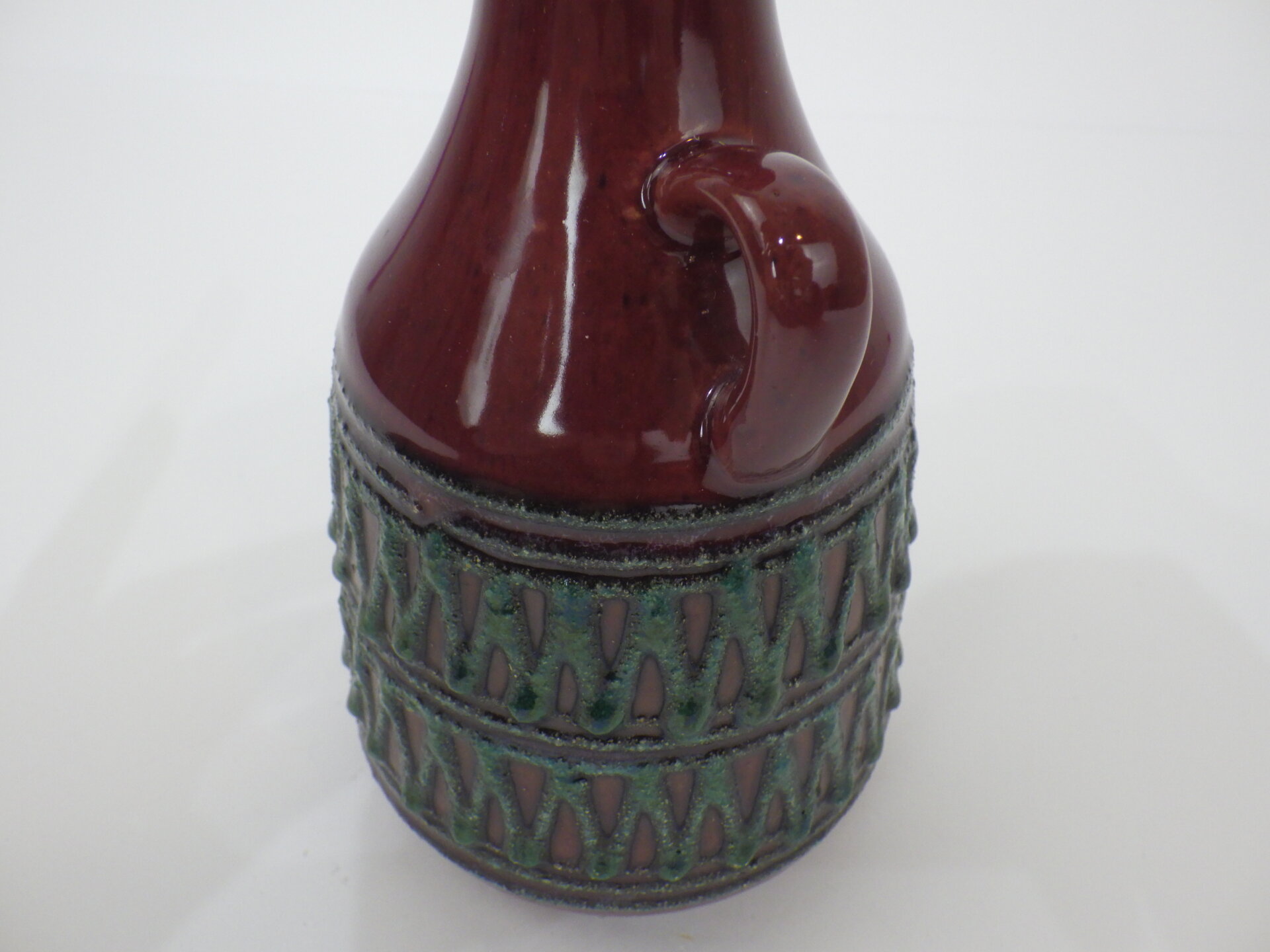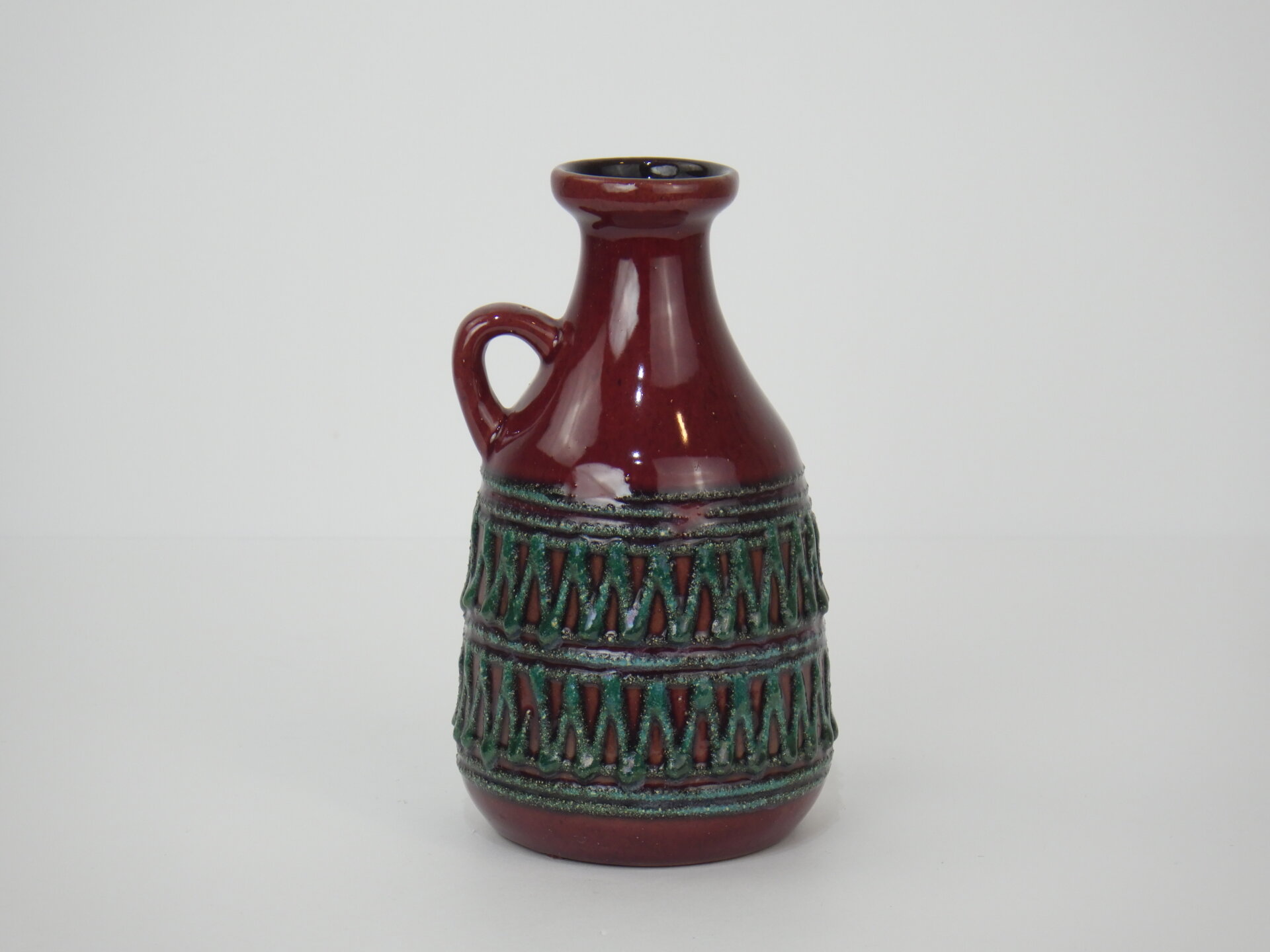 | ヨーロッパで買い付けました。 東ドイツ製、「Strehla」のフラワーベースです。 「Fat Lava」「German Art Pottery」と呼ばれるこの時代のドイツの陶器は、多くが職人による手作業で製作されており、同じシリーズでも一つとして同じ表情の物が存在しません。 深みのあるボルドーレッドの釉薬に、エメラルドグリーンの装飾が際立つ美しい一品です。 胴部をぐるりと囲む幾何学的なレリーフは、リズミカルでありながらも手作業の温もりを感じさせるデザイン。 輸出向けに作られた製品が多いようで、西ドイツ製のFat Lavaよりドイツ国内で見つけることが難しいです。 北欧モダンやUSミッドセンチュリー家具との相性も抜群で、花を活けずともオブジェの様に飾って楽しむのもおすすめしています。 |