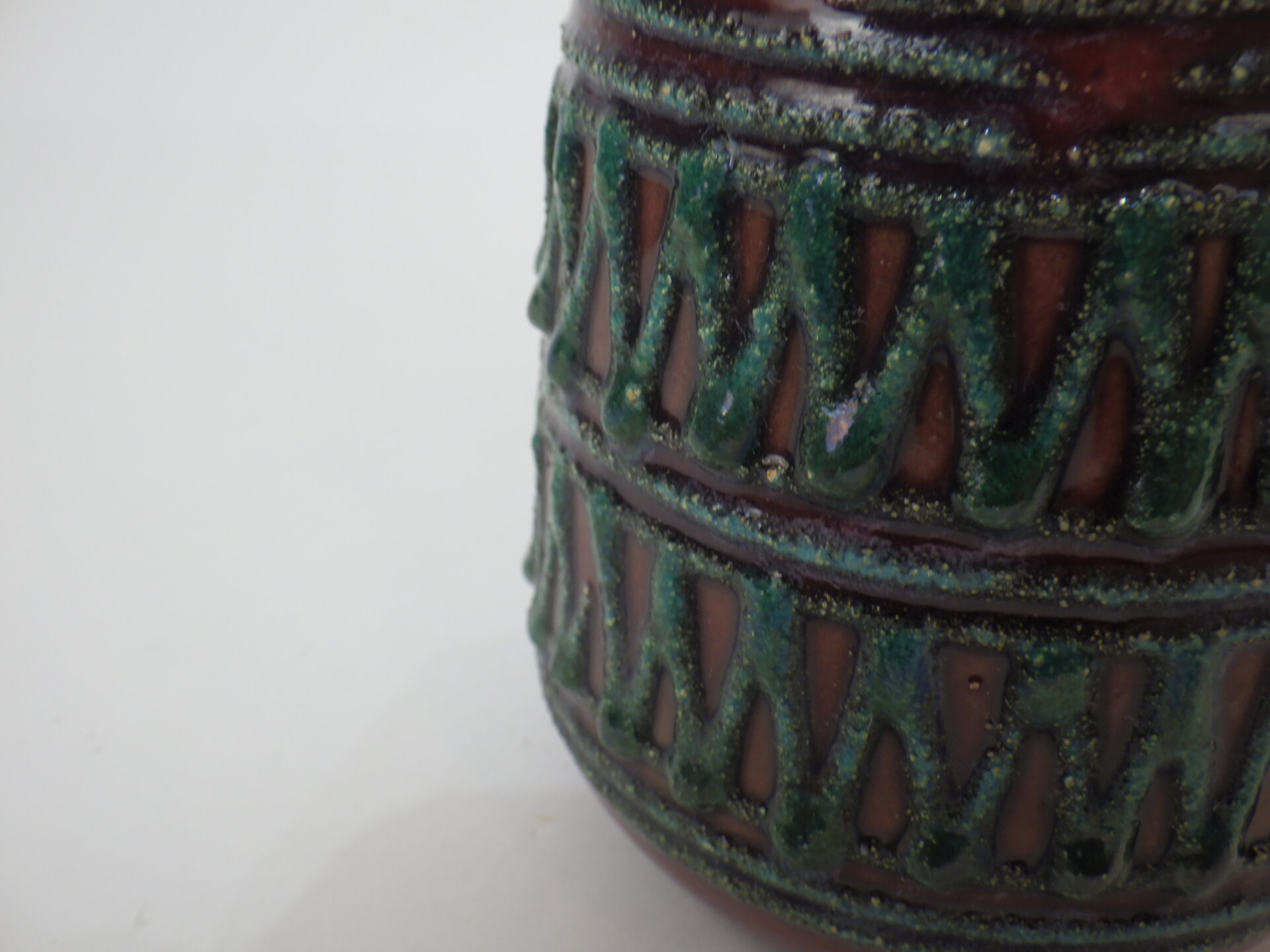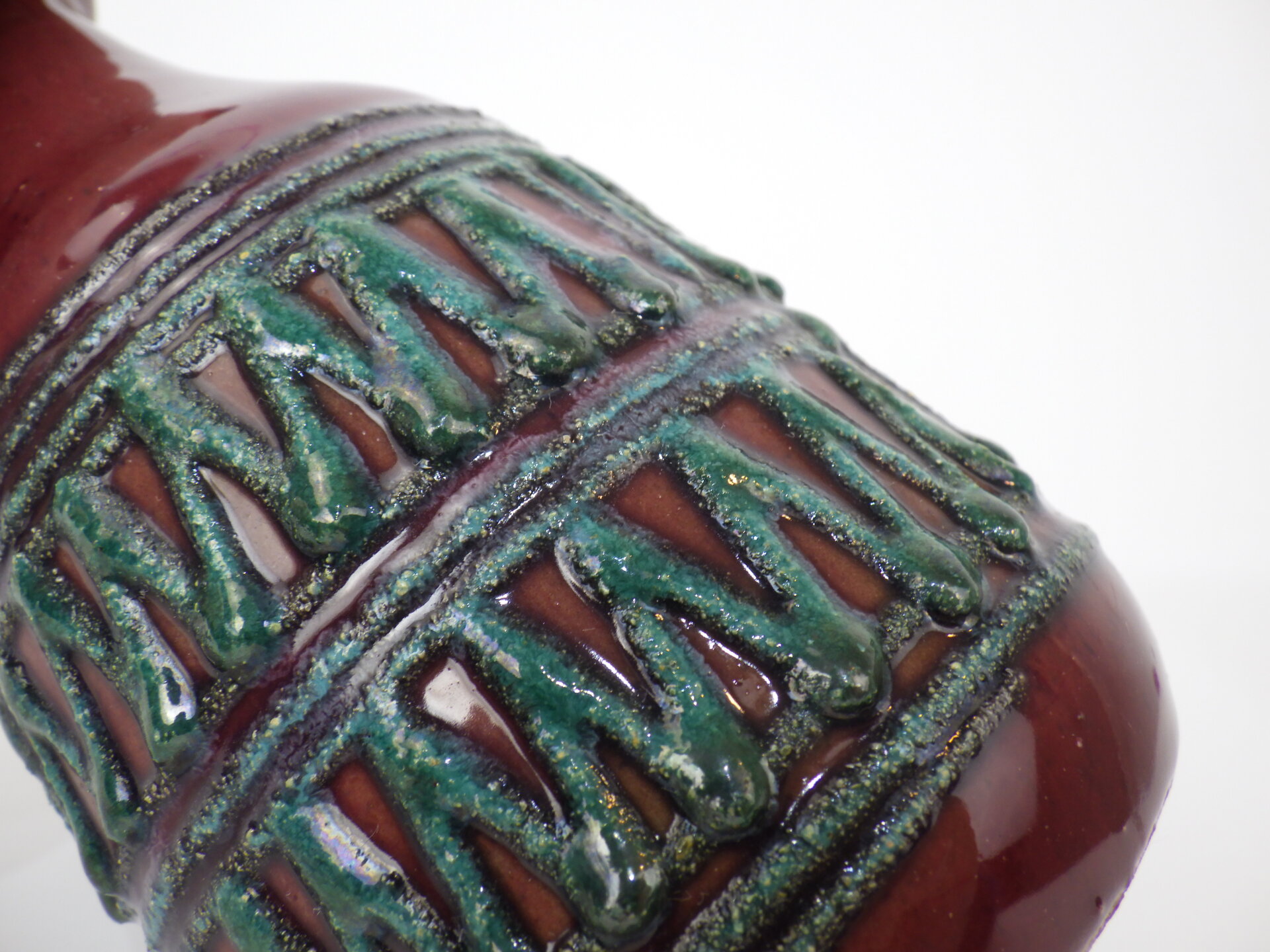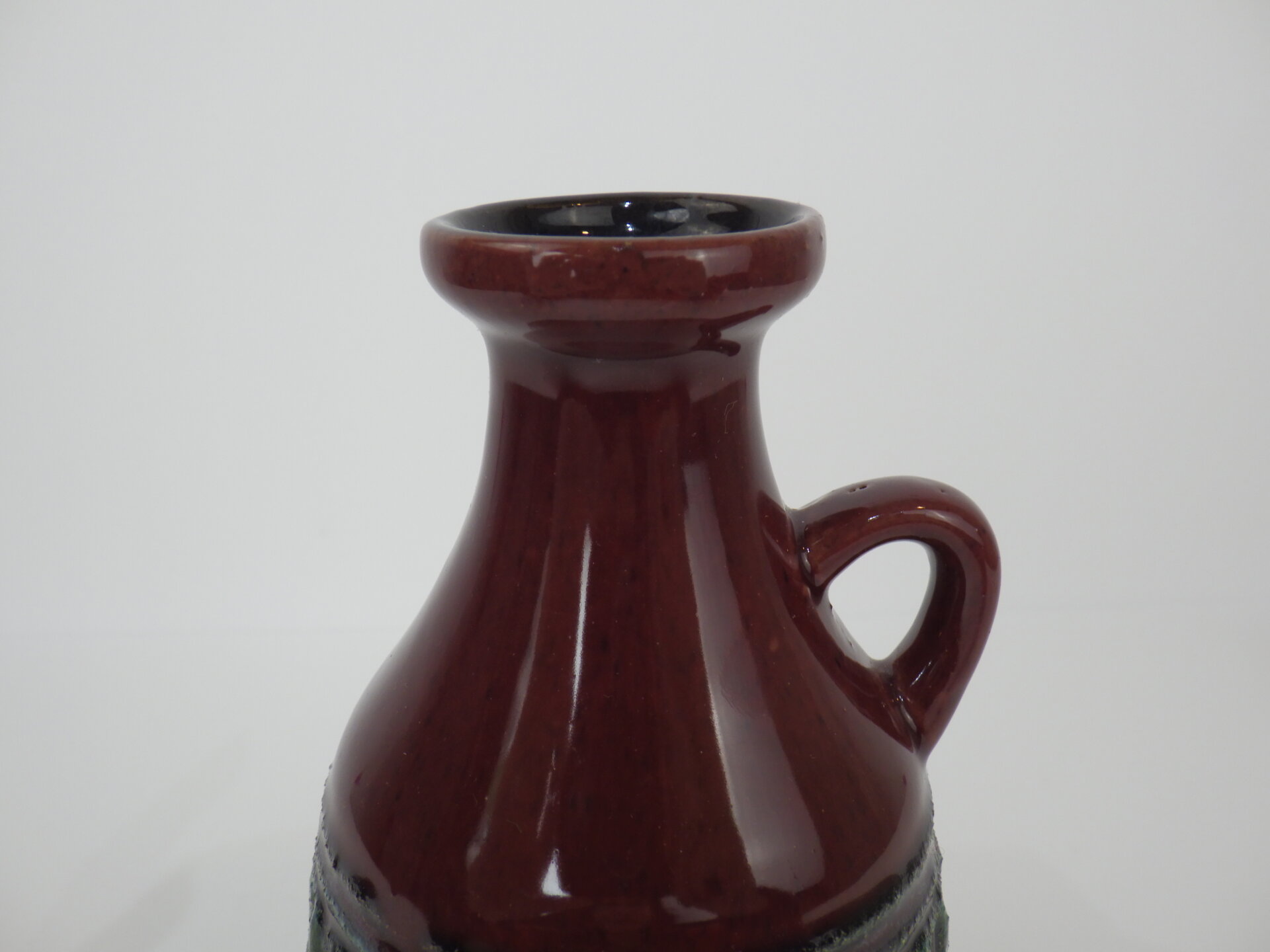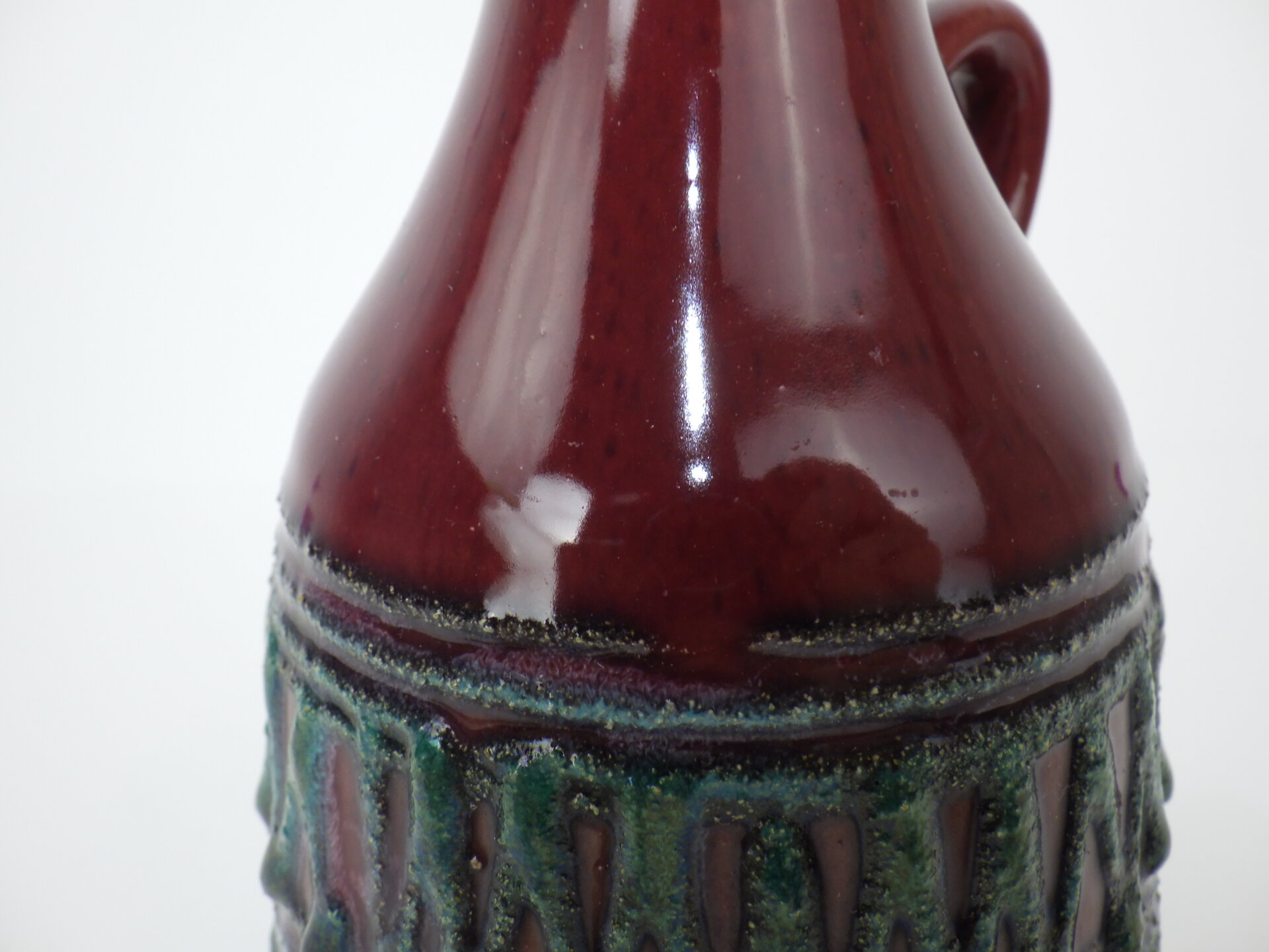| ヨーロッパで買い付けました。 東ドイツ製、「Strehla」のフラワーベースです。 「Fat Lava」「German Art Pottery」と呼ばれるこの時代のドイツの陶器は、多くが職人による手作業で製作されており、同じシリーズでも一つとして同じ表情の物が存在しません。 深みのあるボルドーレッドの釉薬に、エメラルドグリーンの装飾が際立つ美しい一品です。 胴部をぐるりと囲む幾何学的なレリーフは、リズミカルでありながらも手作業の温もりを感じさせるデザイン。 輸出向けに作られた製品が多いようで、西ドイツ製のFat Lavaよりドイツ国内で見つけることが難しいです。 北欧モダンやUSミッドセンチュリー家具との相性も抜群で、花を活けずともオブジェの様に飾って楽しむのもおすすめしています。 |